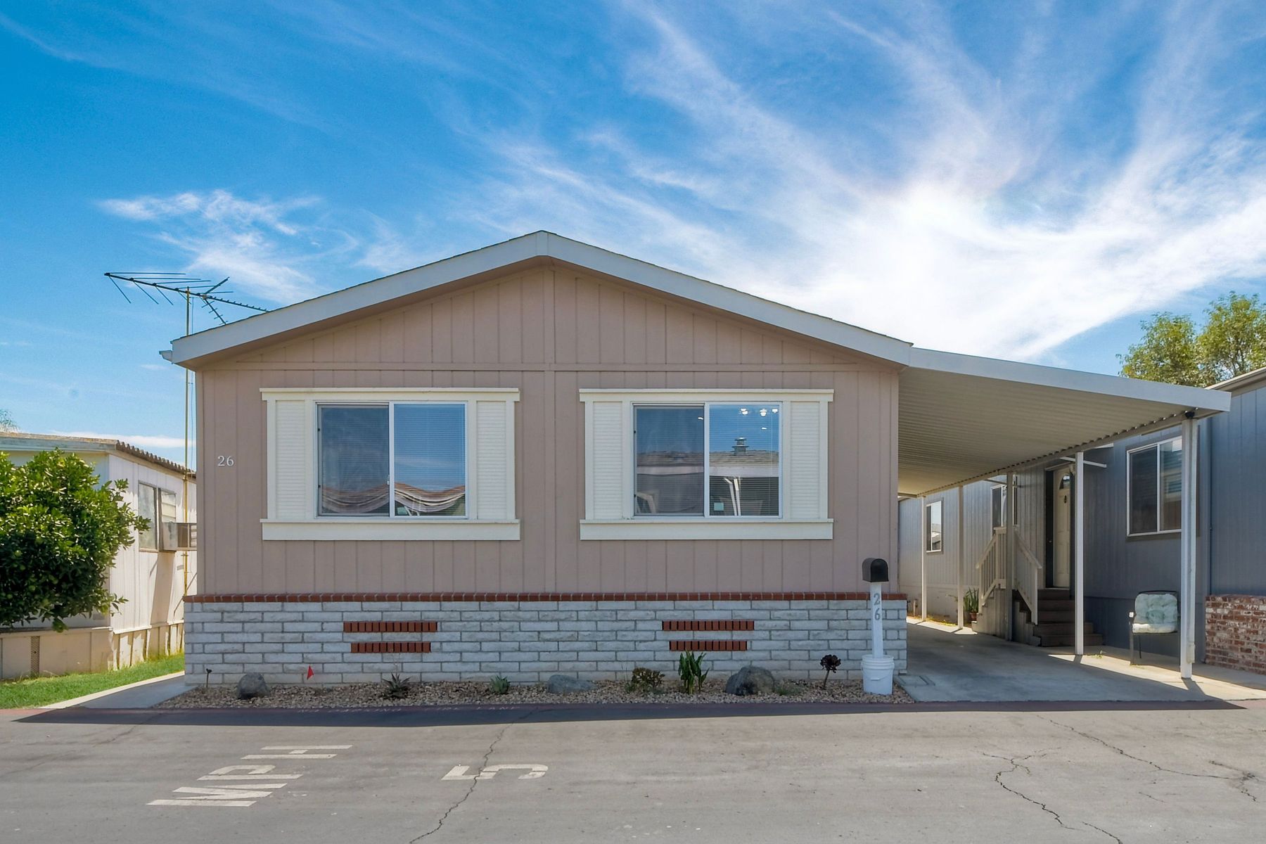 Move-in ready home in Westwinds Mobile Home Park! Step into this beautifully maintained Hallmark Charleston with an open-concept living room, kitchen, and dining area. The upgraded kitchen features new cabinets, granite countertops, Samsung oven, recessed lighting, and tasteful marble flooring. Enjoy year-round comfort with dual-pane windows, newer A/C, and freshly painted interior and exterior. Built with quality in mind, this home includes 2x6 exterior walls for enhanced insulation and durability. Covered carport and shed for storage. Conveniently located near schools, shopping, downtown Escondido, and with easy access to I-15. Westwinds is a family-friendly park offering great amenities, including a swimming pool, clubhouse, laundry facilities, and bathrooms with showers.