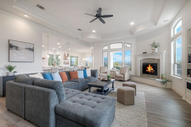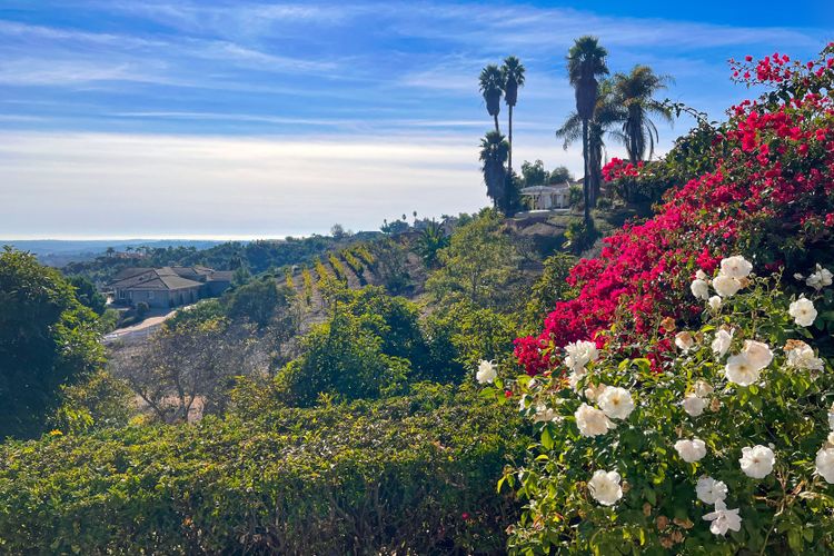 Nestled inside the exclusive gated Champagne Crest community, this exquisite single-story estate with a detached casita offers 180° panoramic views stretching to the northeast and southwest—capturing rolling hills, vineyards, and spectacular sunsets. This stunning updated 4BR/5.5 Bath home is perched on 1.58 acres featuring multiple resort-style outdoor living areas, beach entry pool, three waterfalls, hot tub, fire pit, built-in BBQ, courtyard and a covered veranda ideal for entertaining. The modern Spanish Mediterranean inspired design offers all bedrooms with ensuite bathrooms, high ceilings, arched entry's, expansive windows and a spacious chef’s kitchen that opens to the family room. The primary suite includes direct patio and pool access, a spa-style bath and sweeping southwest and sunset views. The detached casita with a full bath is ideal for use as a work space, gym or flex space for all your hobbies. The property is an entertainers delight and a horticulturists dream with over 26 species of tree's (non certified organically treated). A rare opportunity to enjoy privacy, elegance and panoramic Fallbrook scenery in a premier gated community. Fallbrook Winery and Monserate Winery adjacent.