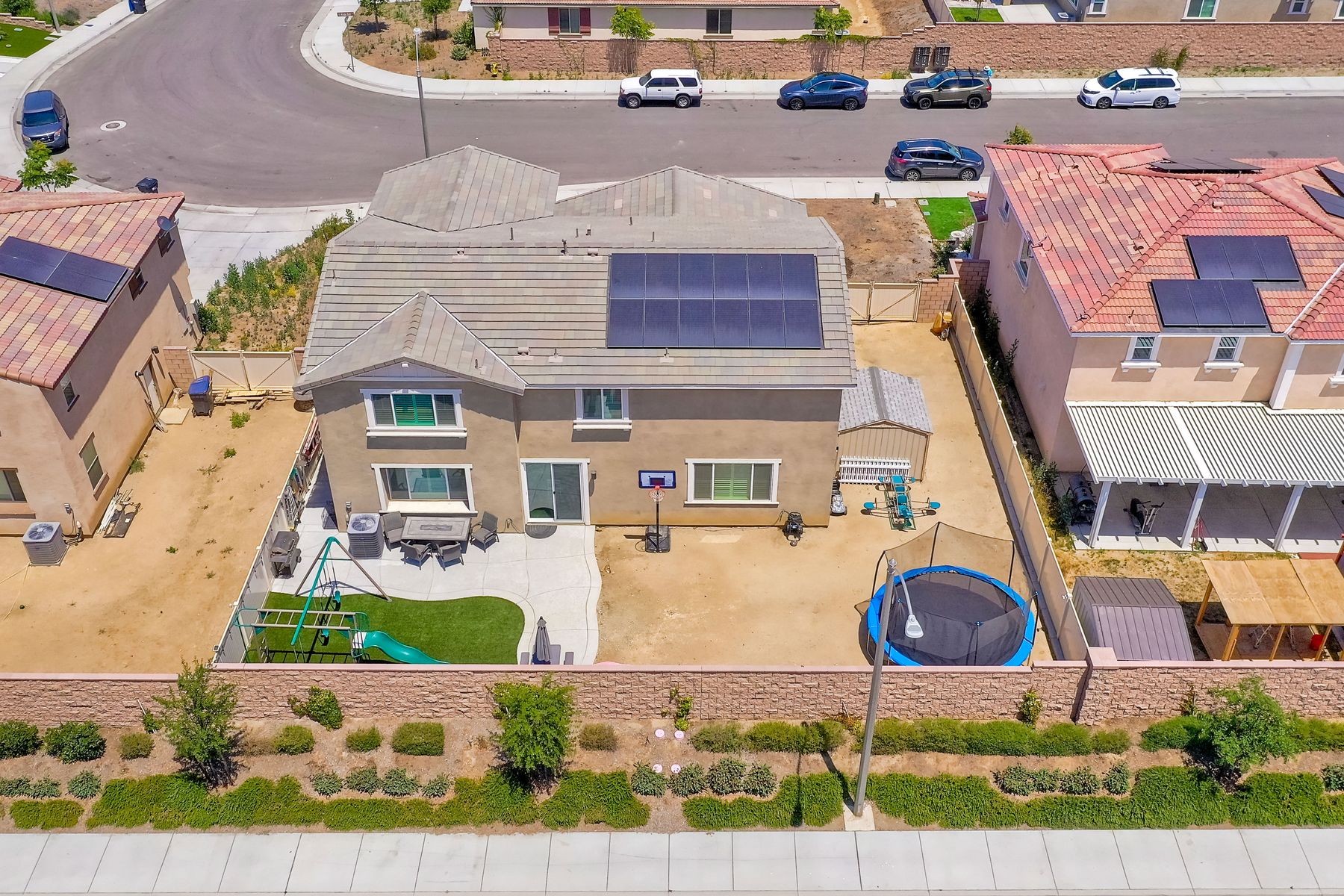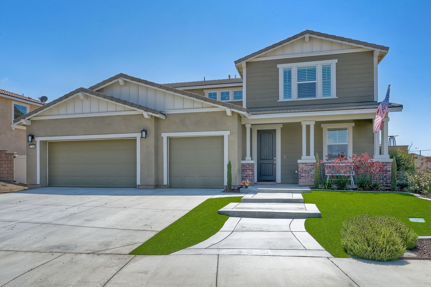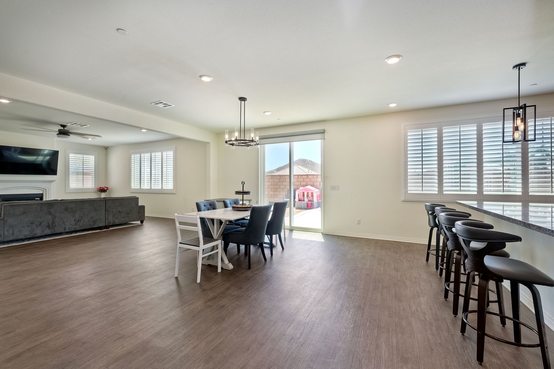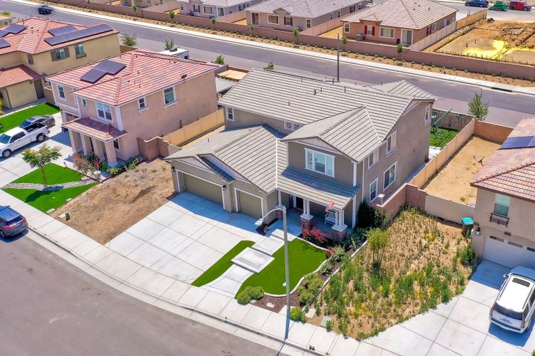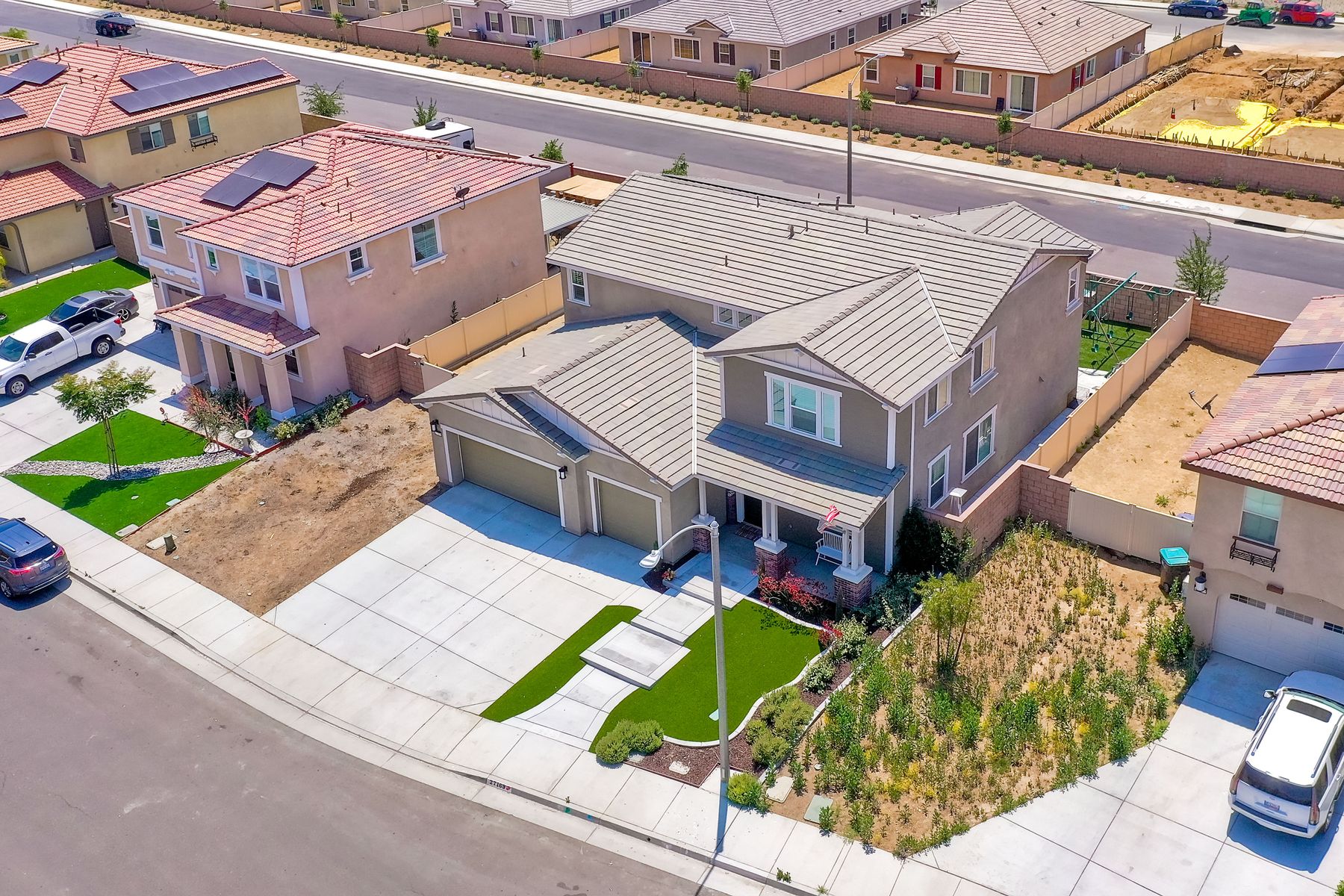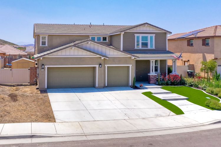 With terrific curb appeal, luxury vinyl flooring, vaulted ceilings, and plantation shutters, this stunning residence offers a bedroom and full bath on the 1st floor, formal dining room, a private office, and loft. The great room delights with a beautiful kitchen, granite countertops, upgraded stainless steel appliances, double ovens, and a large walk-in pantry. The backyard beckons with cement hardscape and turf, ready for BBQs and potential to build out your dream pool. No HOA, solar panels, 3-car garage, room for RV, and close proximity to Remington Park, Boulder Ridge Elementary School, and 215 freeway, this is truly a remarkable home.