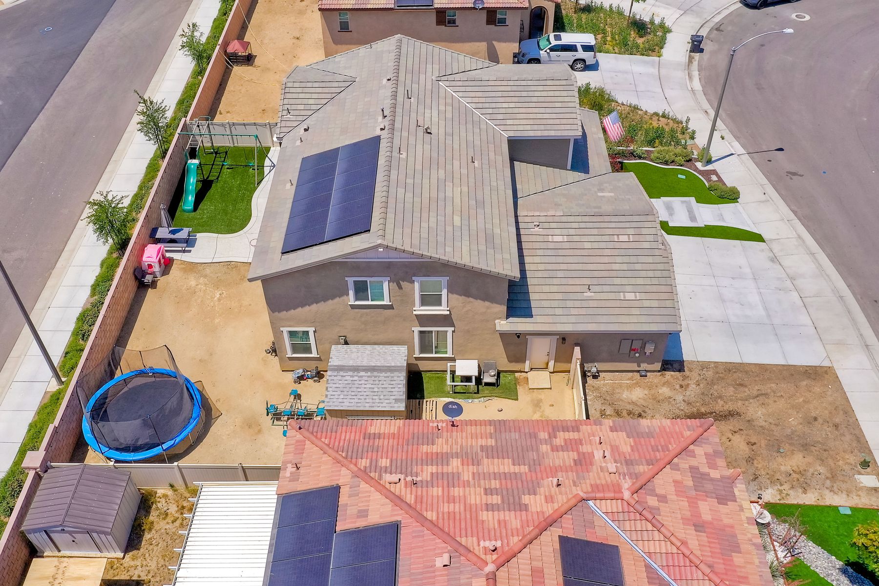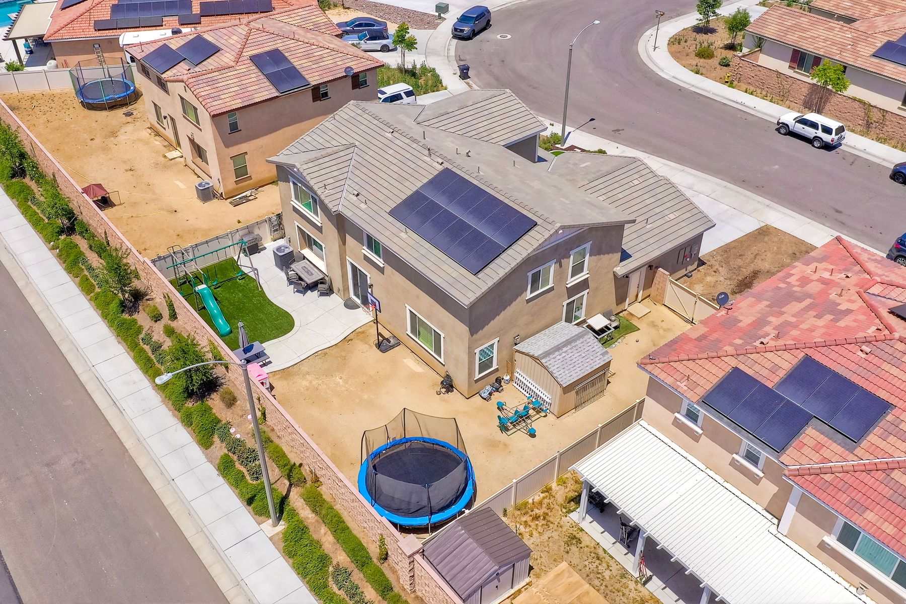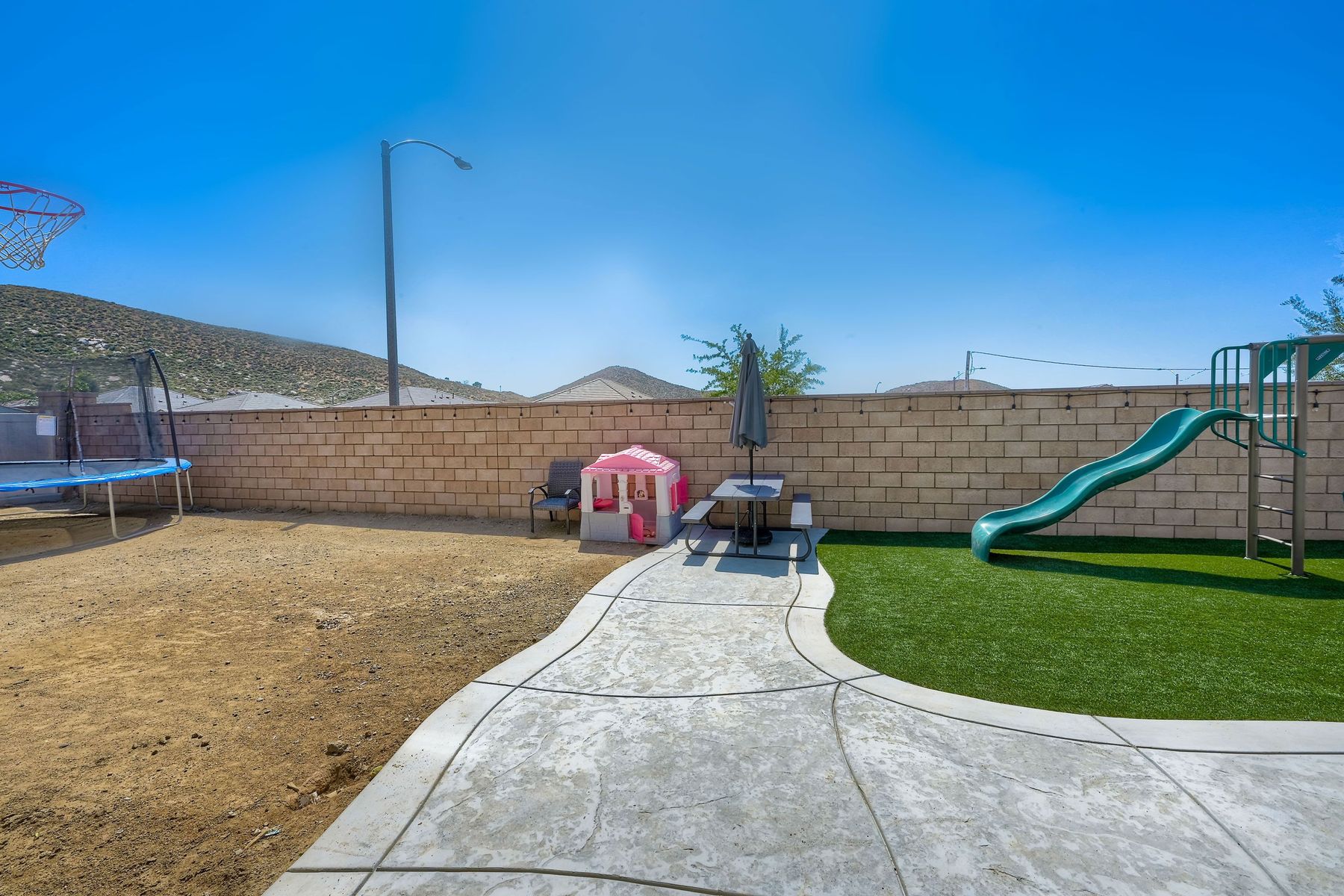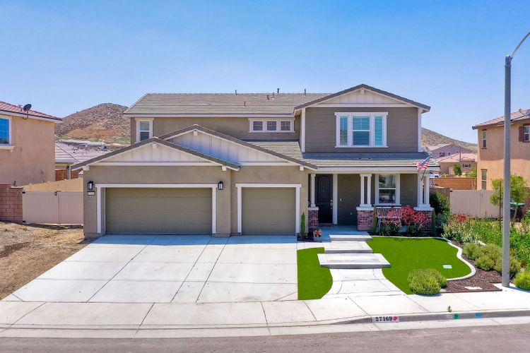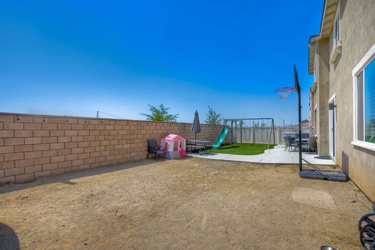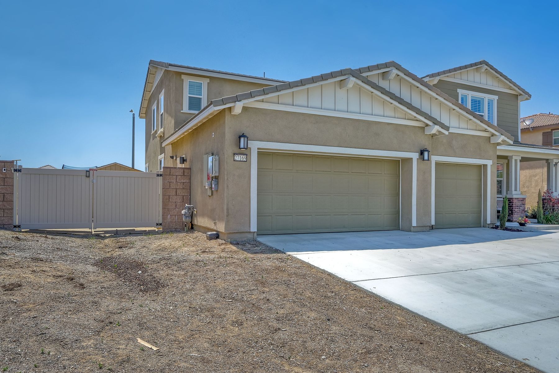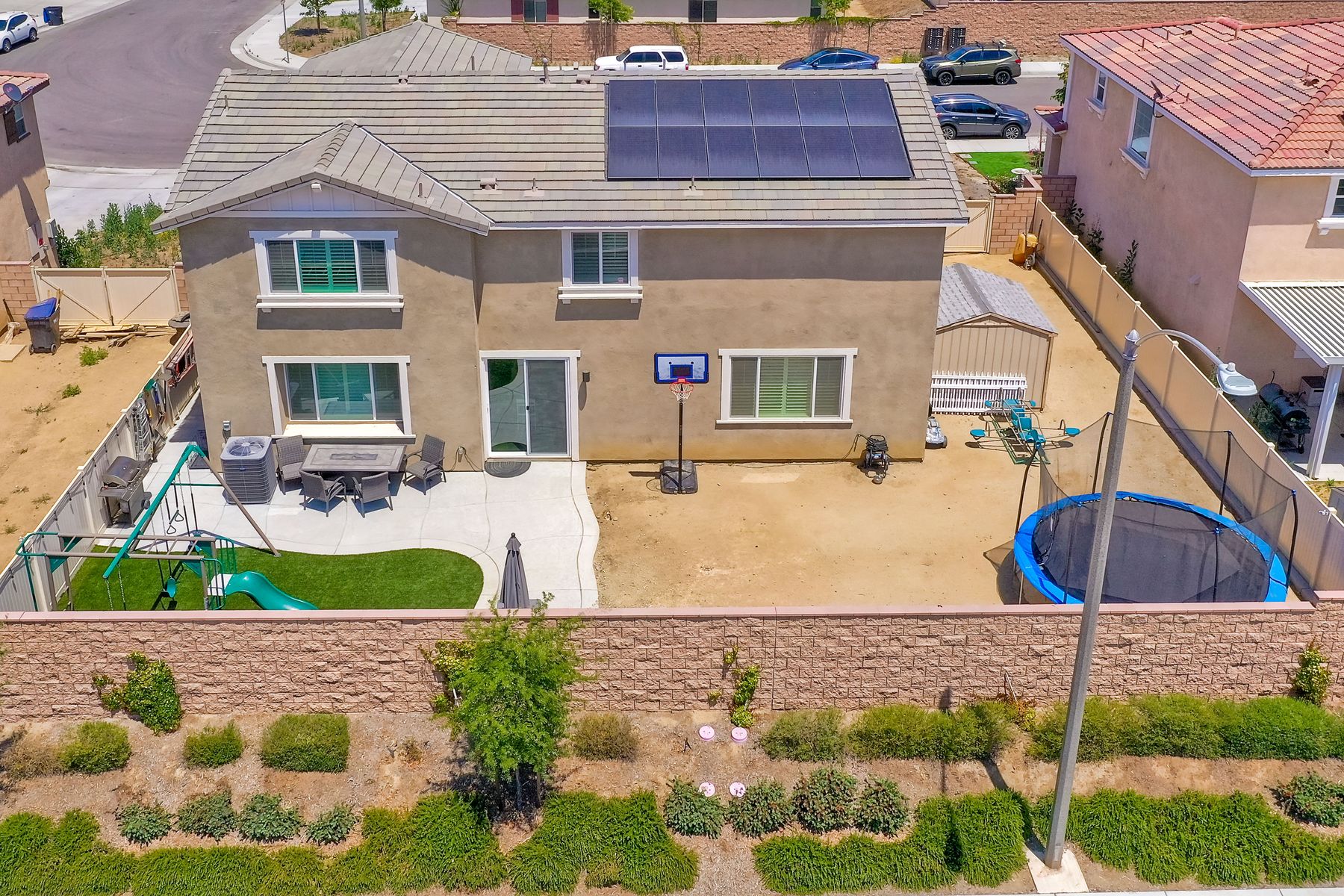 With terrific curb appeal, luxury vinyl flooring, vaulted ceilings, and plantation shutters, this stunning residence offers a bedroom and full bath on the 1st floor, formal dining room, a private office, and loft. The great room delights with a beautiful kitchen, granite countertops, upgraded stainless steel appliances, double ovens, and a large walk-in pantry. The backyard beckons with cement hardscape and turf, ready for BBQs and potential to build out your dream pool. No HOA, solar panels, 3-car garage, room for RV, and close proximity to Remington Park, Boulder Ridge Elementary School, and 215 freeway, this is truly a remarkable home.