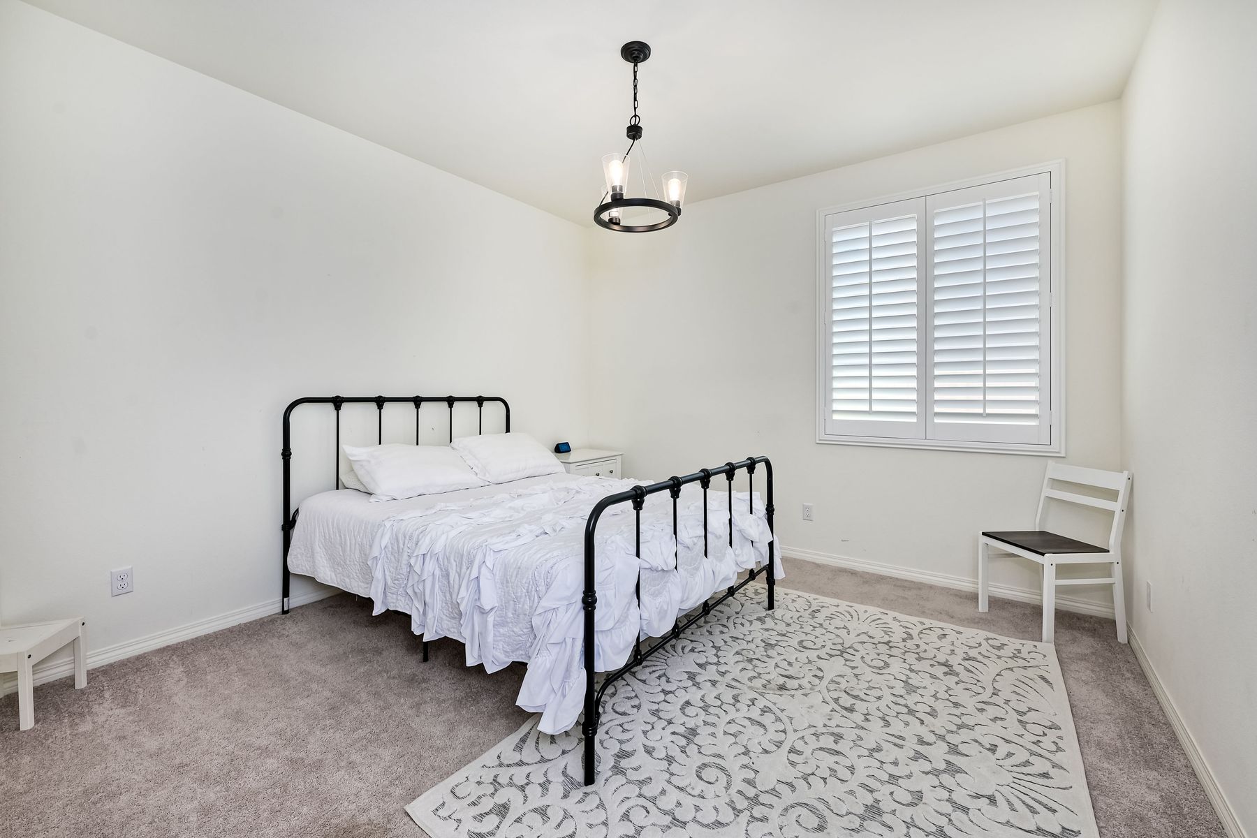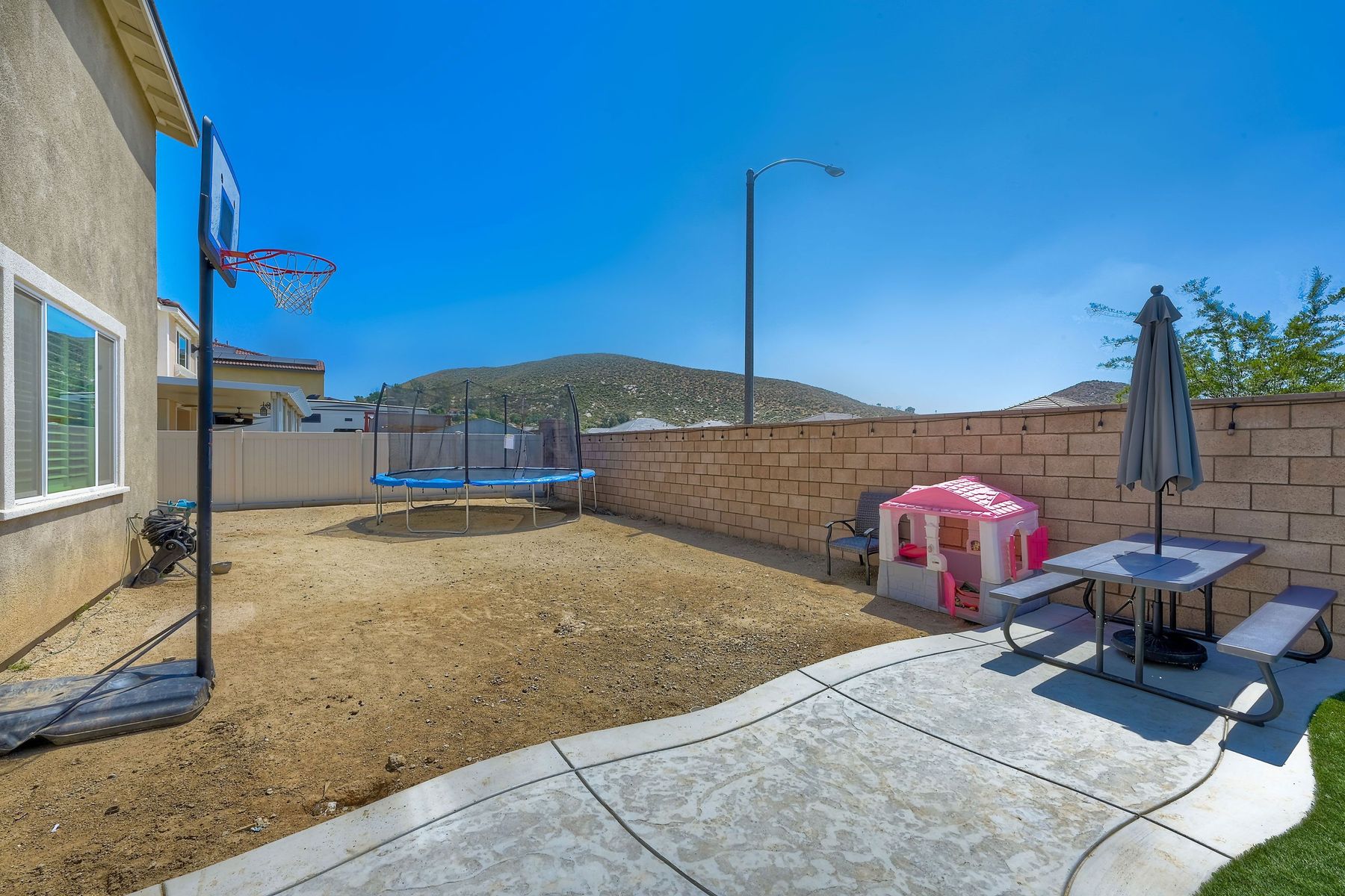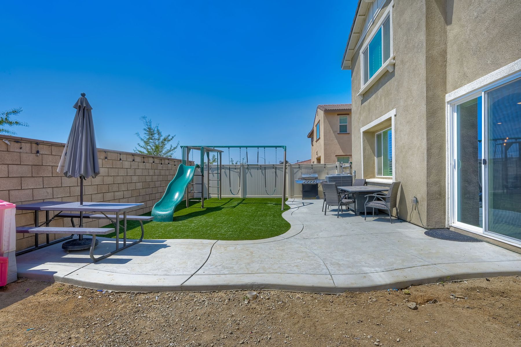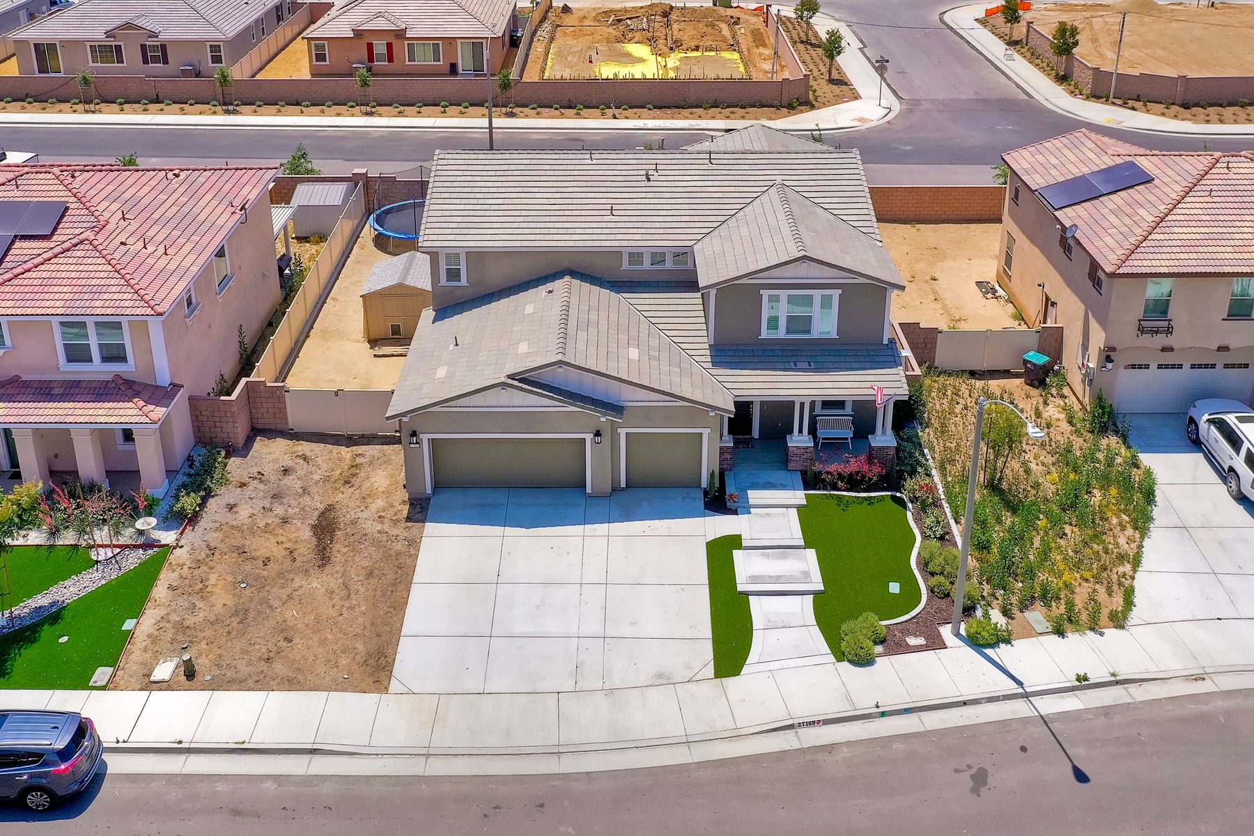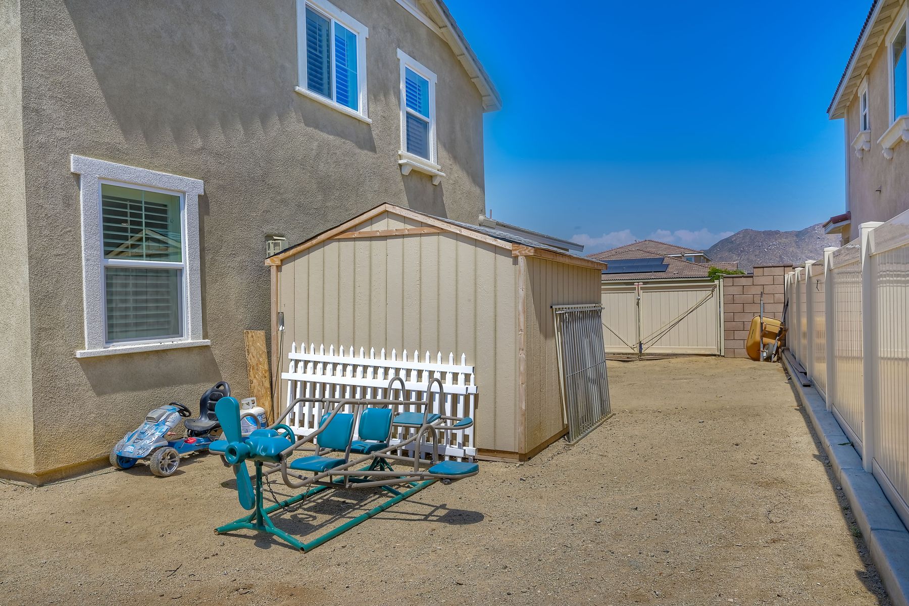With terrific curb appeal, luxury vinyl flooring, vaulted ceilings, and plantation shutters, this stunning residence offers a bedroom and full bath on the 1st floor, formal dining room, a private office, and loft. The great room delights with a beautiful kitchen, granite countertops, upgraded stainless steel appliances, double ovens, and a large walk-in pantry. The backyard beckons with cement hardscape and turf, ready for BBQs and potential to build out your dream pool. No HOA, solar panels, 3-car garage, room for RV, and close proximity to Remington Park, Boulder Ridge Elementary School, and 215 freeway, this is truly a remarkable home.