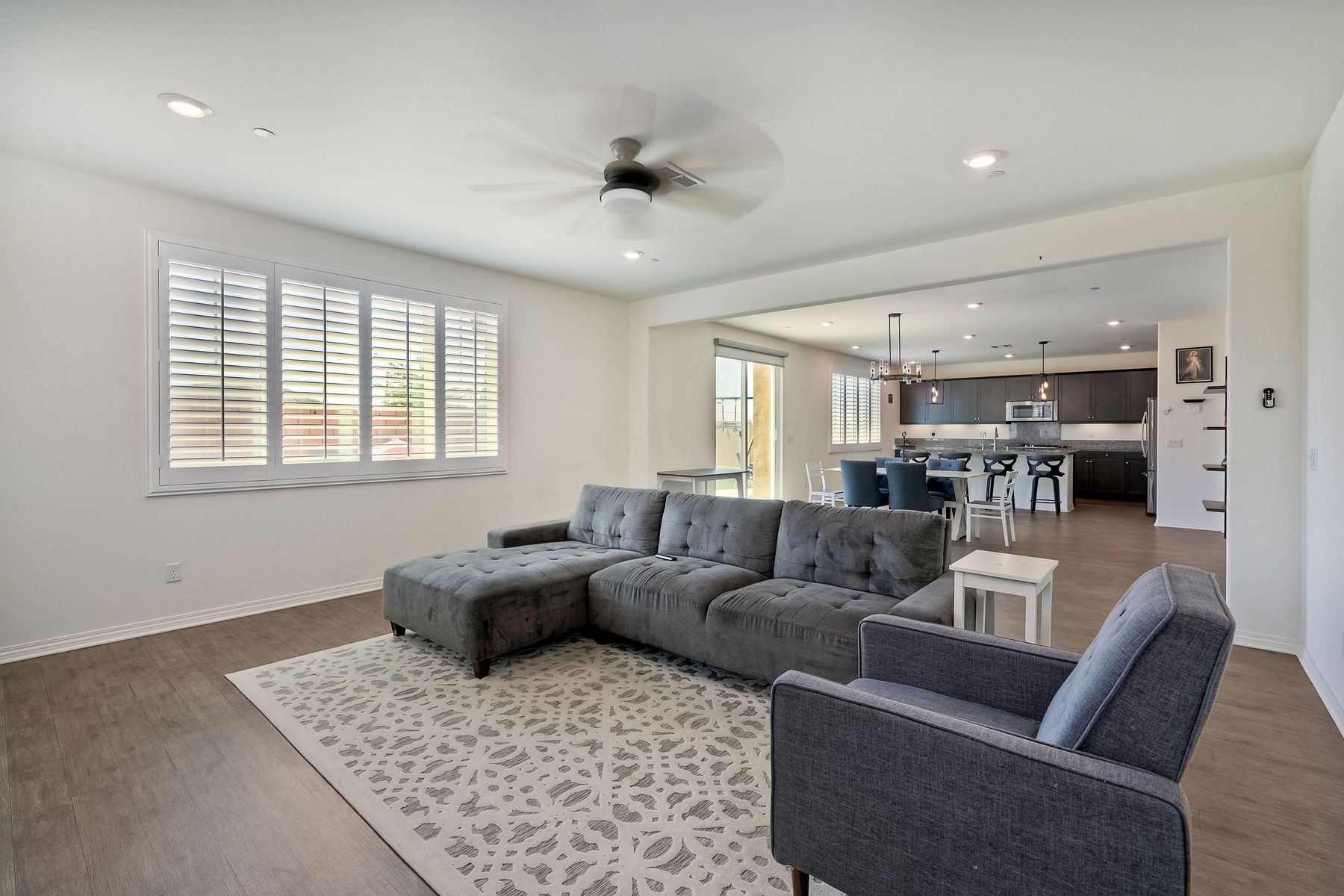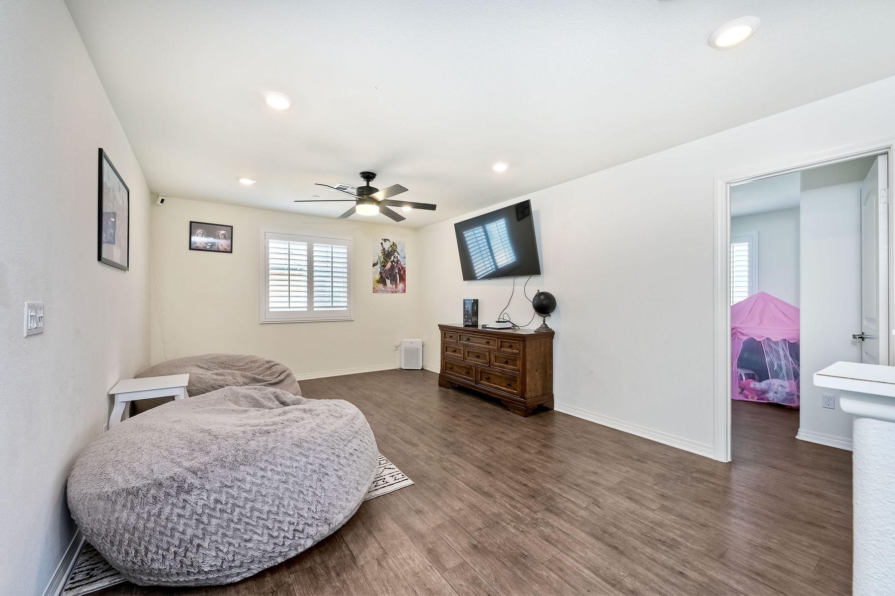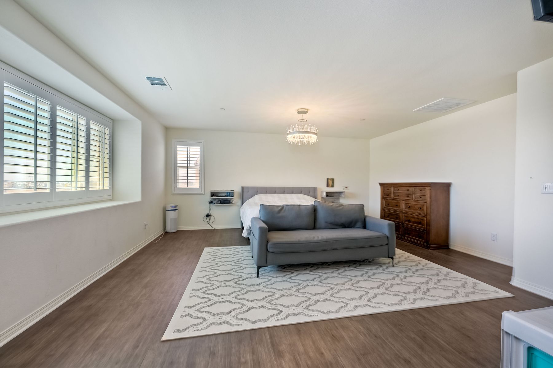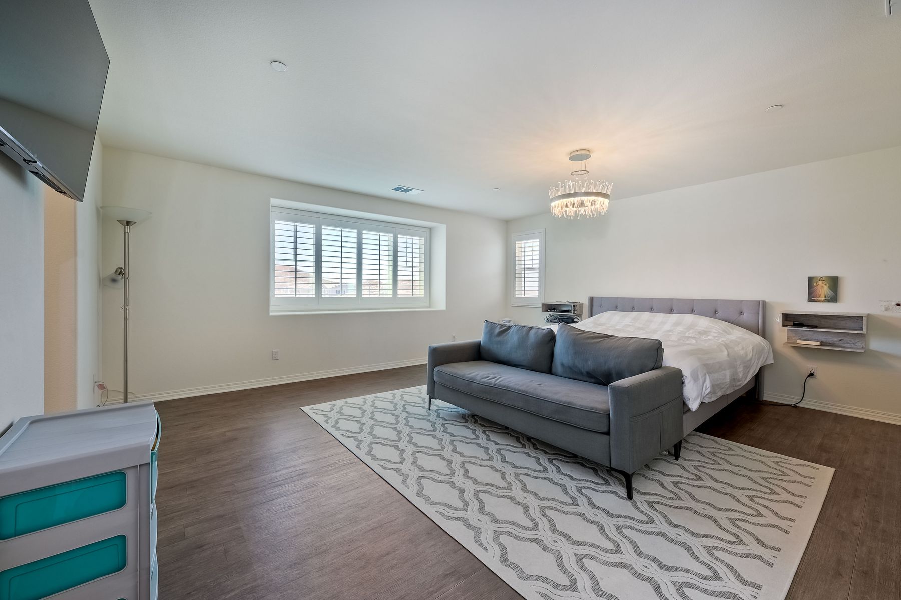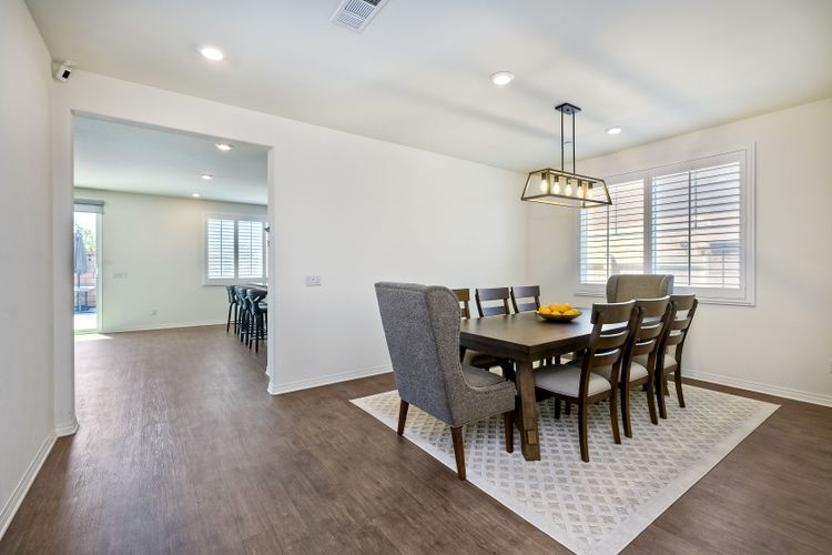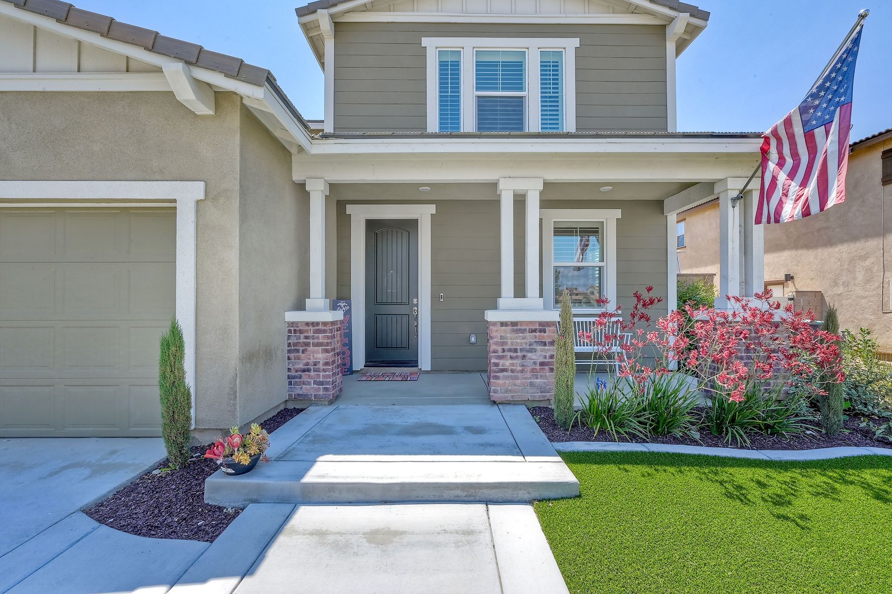 With terrific curb appeal, luxury vinyl flooring, vaulted ceilings, and plantation shutters, this stunning residence offers a bedroom and full bath on the 1st floor, formal dining room, a private office, and loft. The great room delights with a beautiful kitchen, granite countertops, upgraded stainless steel appliances, double ovens, and a large walk-in pantry. The backyard beckons with cement hardscape and turf, ready for BBQs and potential to build out your dream pool. No HOA, solar panels, 3-car garage, room for RV, and close proximity to Remington Park, Boulder Ridge Elementary School, and 215 freeway, this is truly a remarkable home.