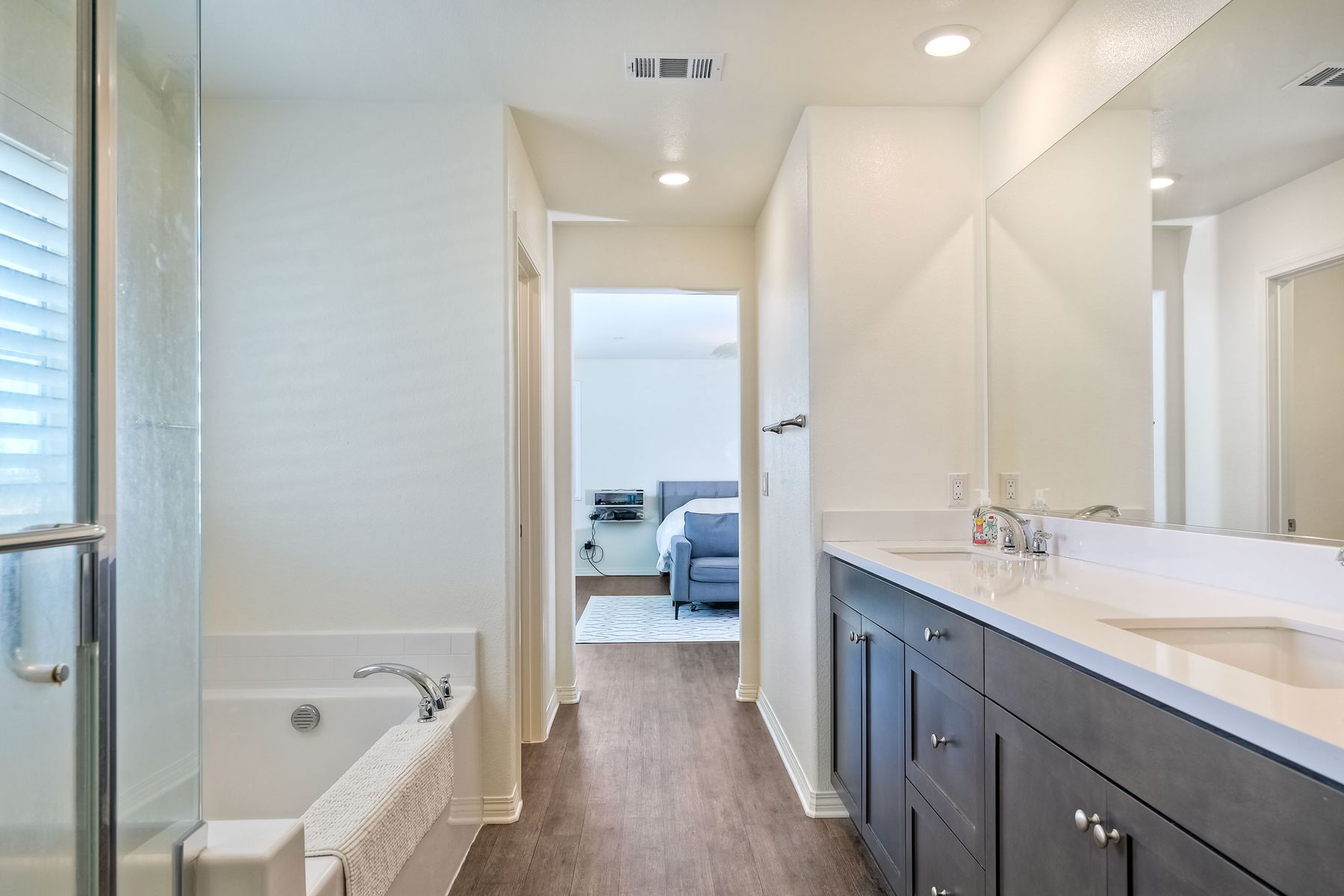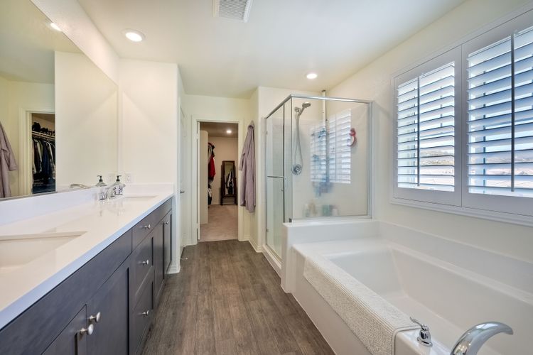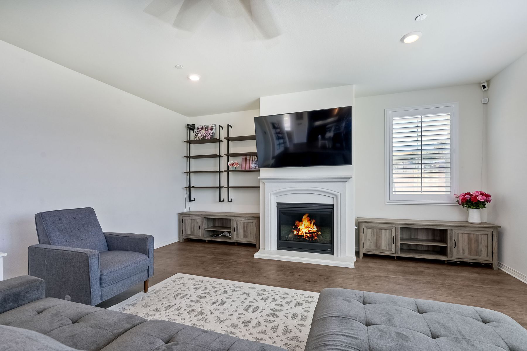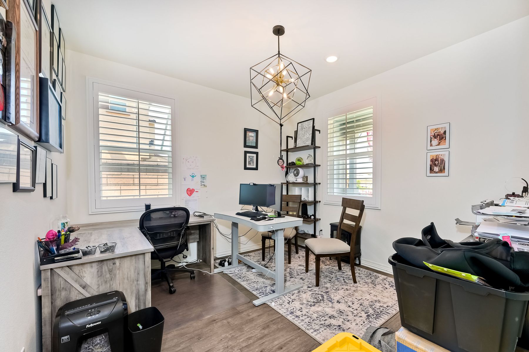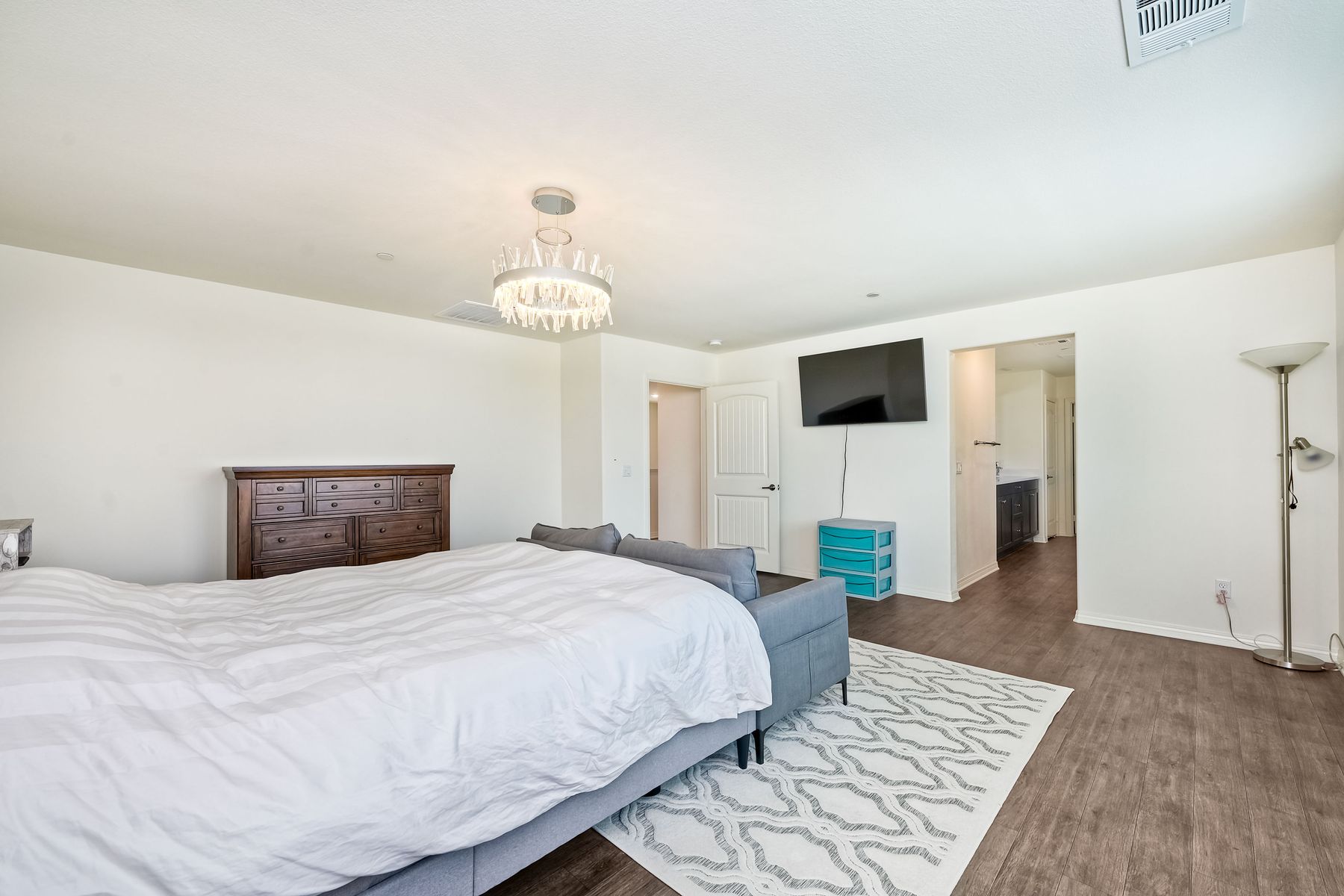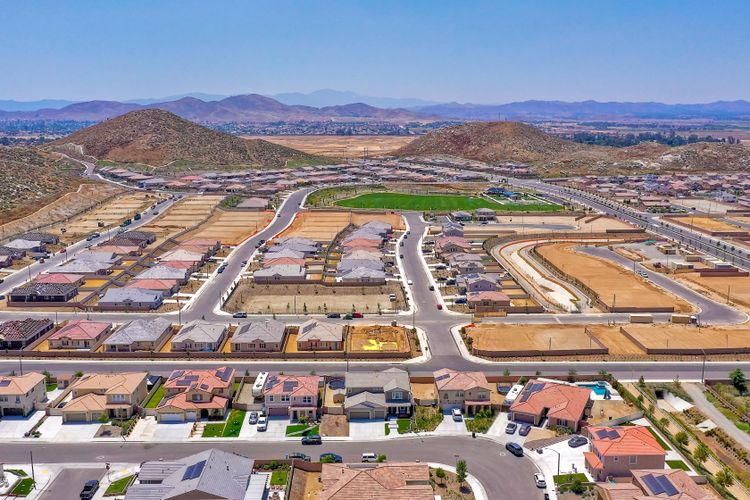 With terrific curb appeal, luxury vinyl flooring, vaulted ceilings, and plantation shutters, this stunning residence offers a bedroom and full bath on the 1st floor, formal dining room, a private office, and loft. The great room delights with a beautiful kitchen, granite countertops, upgraded stainless steel appliances, double ovens, and a large walk-in pantry. The backyard beckons with cement hardscape and turf, ready for BBQs and potential to build out your dream pool. No HOA, solar panels, 3-car garage, room for RV, and close proximity to Remington Park, Boulder Ridge Elementary School, and 215 freeway, this is truly a remarkable home.