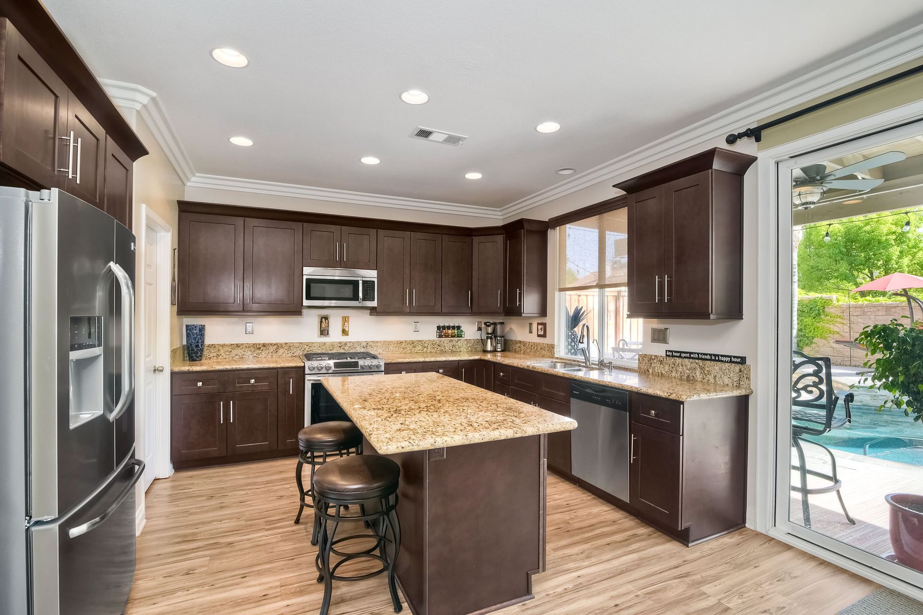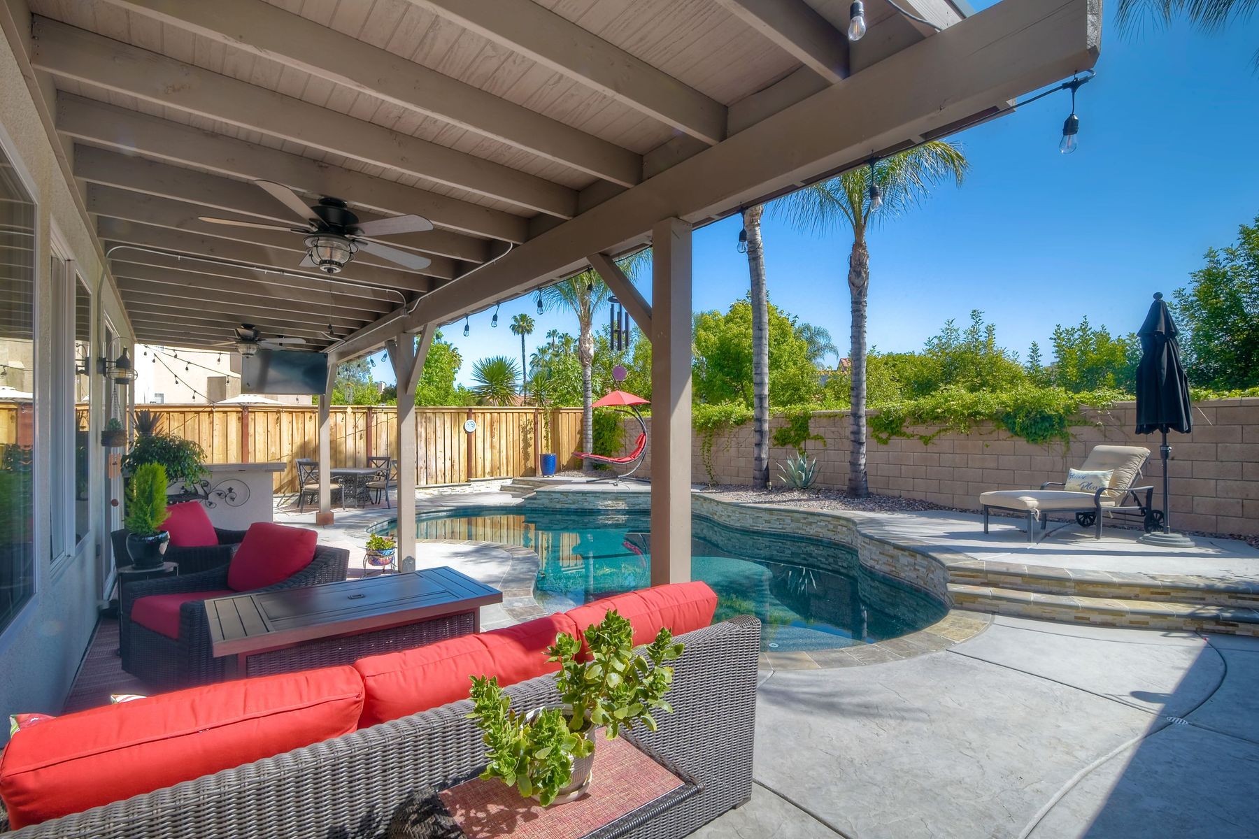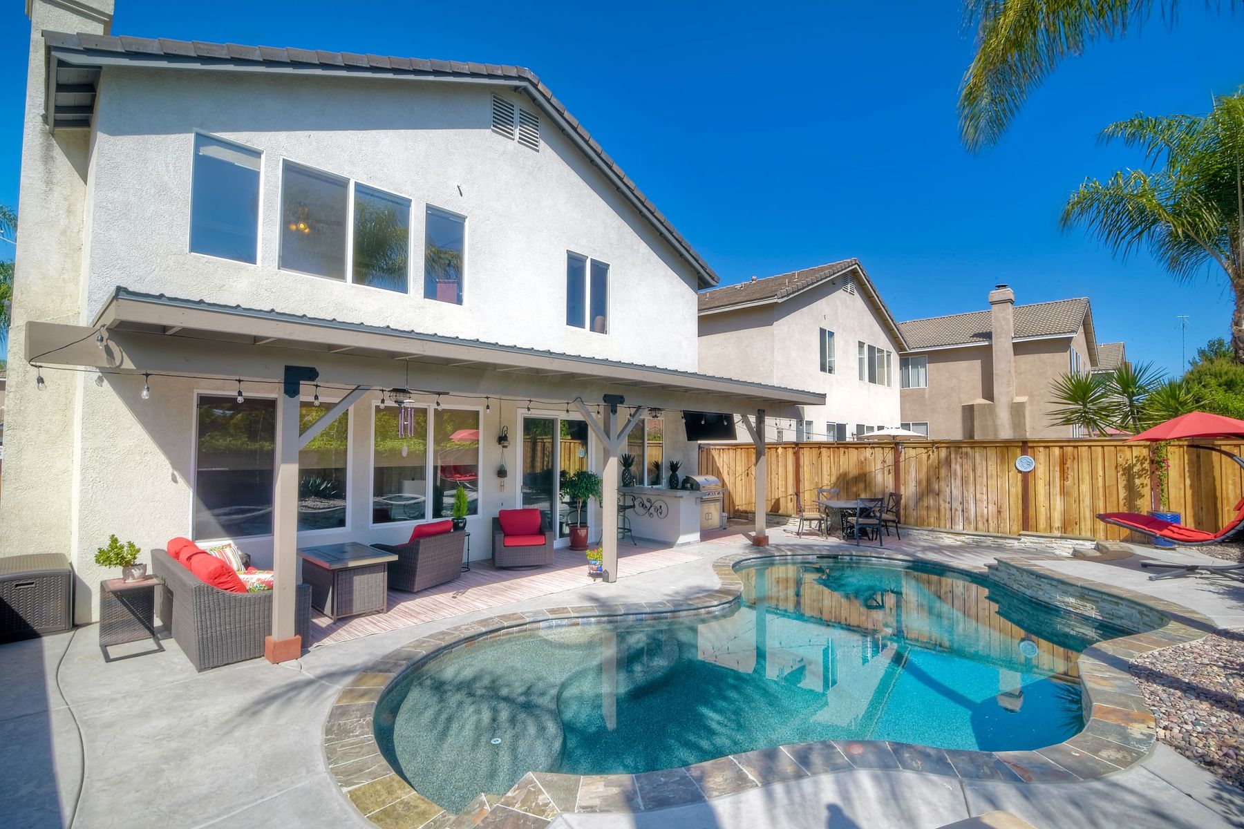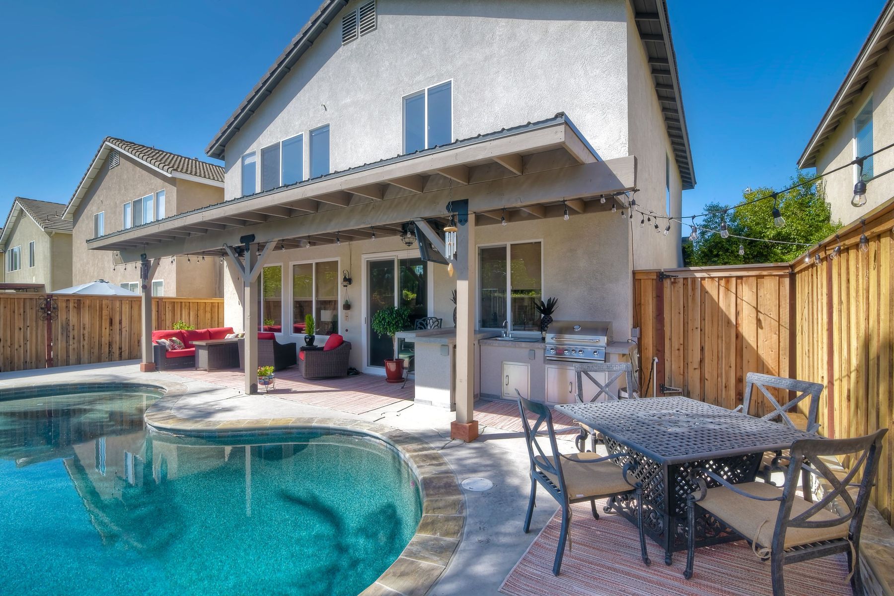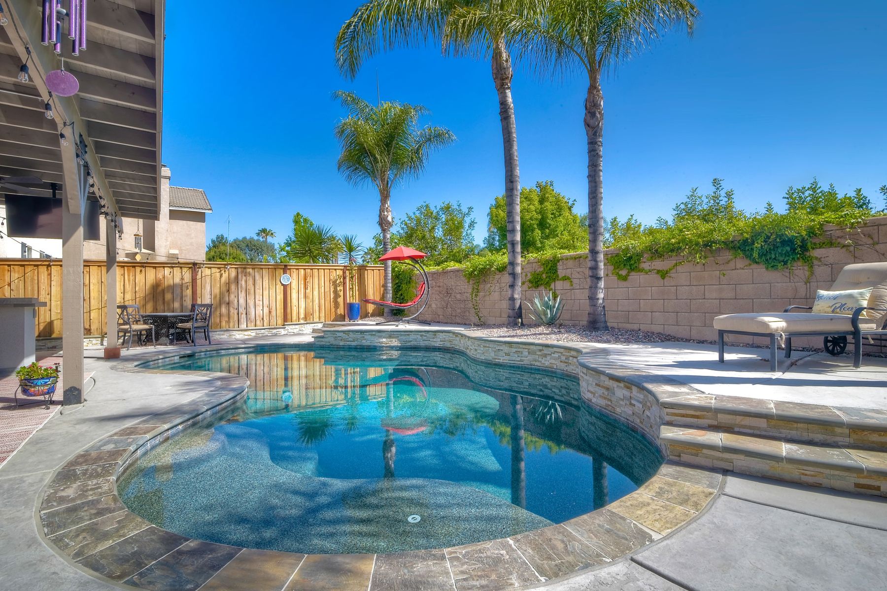 WELCOME to this turn-key POOL HOME that shows pride of ownership, attention to detail, and is well maintained. Enjoy your own personal OASIS with a completely remodeled pool area that includes new textured concrete, coping, stacked stone, heating system, pool pump, filtered water, and Pebble Tec. The outdoor kitchen with barbecue is custom made and the flat-screen television is included. The open floor plan includes a living room with a gas fireplace, dining area, kitchen with stainless steel appliances (refrigerator included), granite countertops, soft close cabinets/drawers, and a center island. The master bedroom has an ensuite with dual sinks, a soaking tub, a separate shower, and a walk-in closet. The indoor laundry room with a sink is located upstairs and the washer & dryer are included. Ceiling fans in all rooms except the front room. There is plenty of natural light throughout the home. The sliding patio door has UV-protected glass. The fence and garage door were replaced 2 years ago. The NUVIA whole house water purification system is paid in full. You are within walking distance of great shopping, dining, theatre, entertainment attractions, and top-ranked schools. Seller is providing disclosures, reports, termite clearance, and completed home inspection so a buyer can be confident and comfortable in their decision to purchase this home. JUST IN TIME FOR SUMMER!