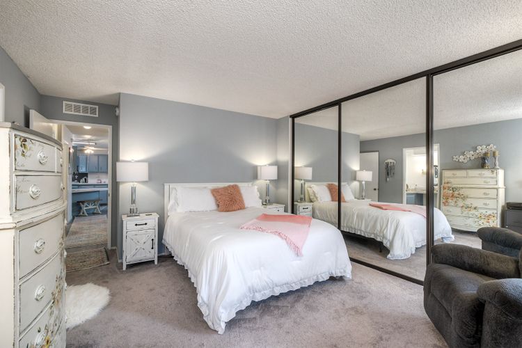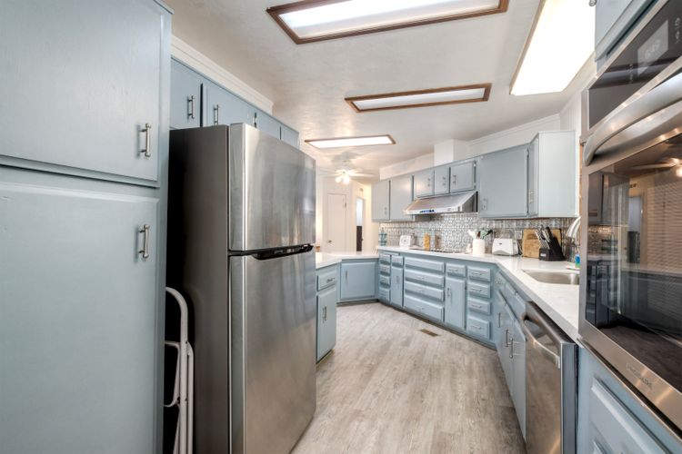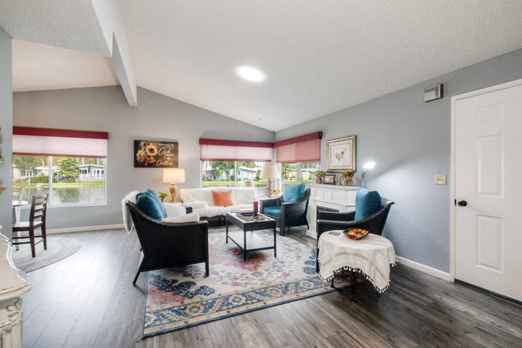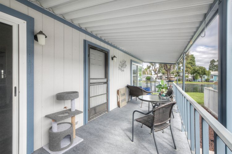 Home has a stunning lake and green belt view. There is a Large deck for relaxing with water view. Features an open floor plan that entertains a feeling that you are in a resort. Large picture windows. Kitchen opens to a dining room that leads to a large living space. Bathrooms have been updated and home throughout is same, with convenience and peaceful living space. Updated paint and wonderful decor thru out. One year old washer and dryer This is a must see in a senior park called Laguna Vista Mobile Home Estates where nature abounds . A gated community located close to freeway, shopping. Beach is to the west by freeway. The complex has a parklike setting with lakes thruout. Shed in Carport and pleasant sitting arrangement.