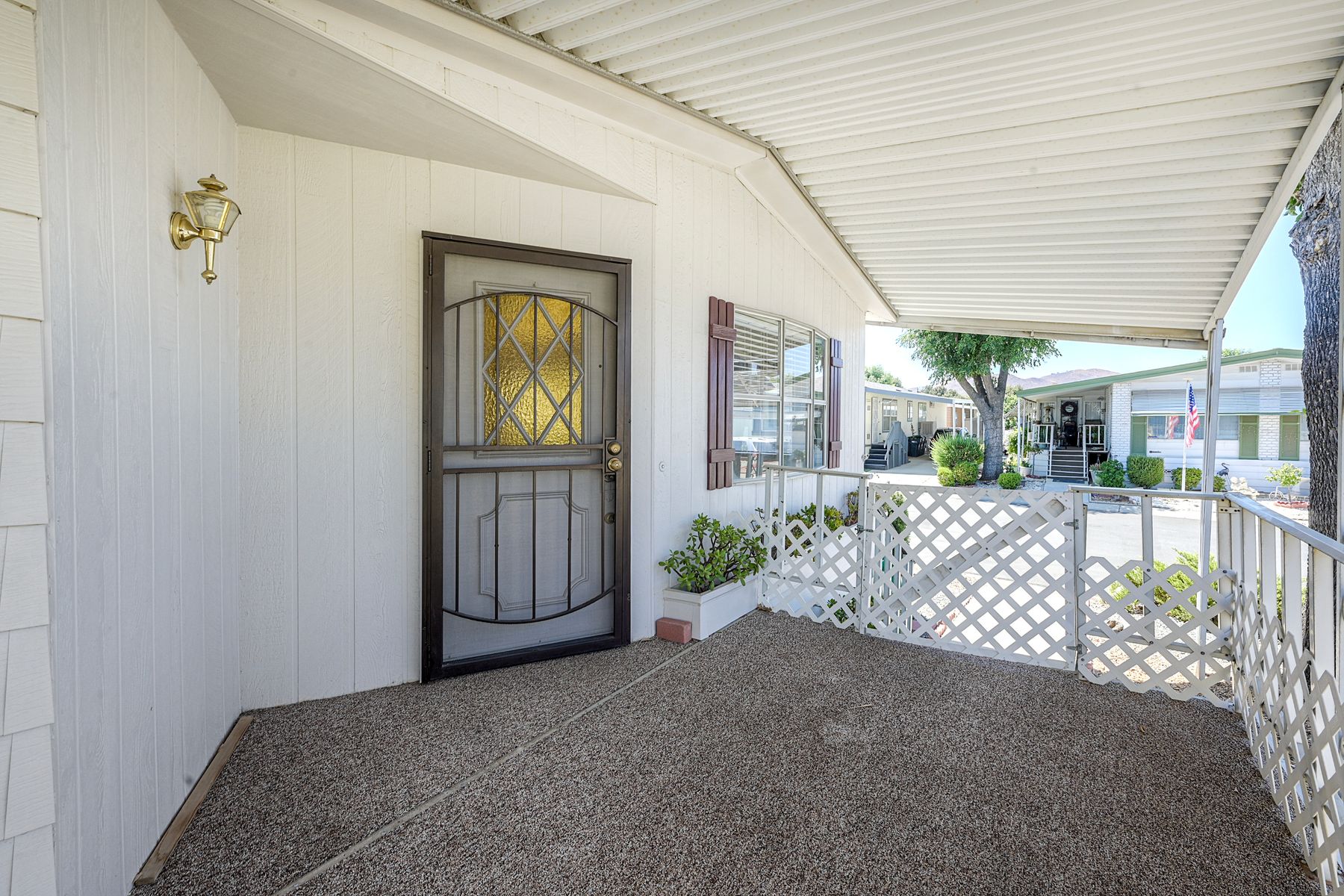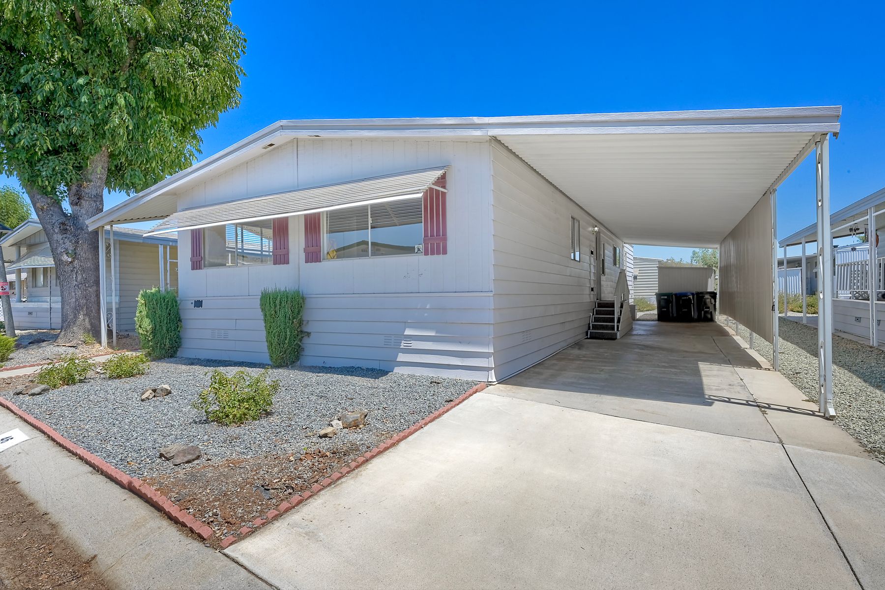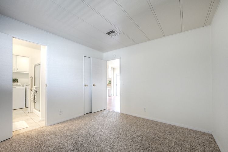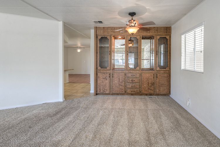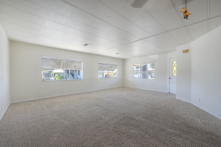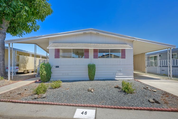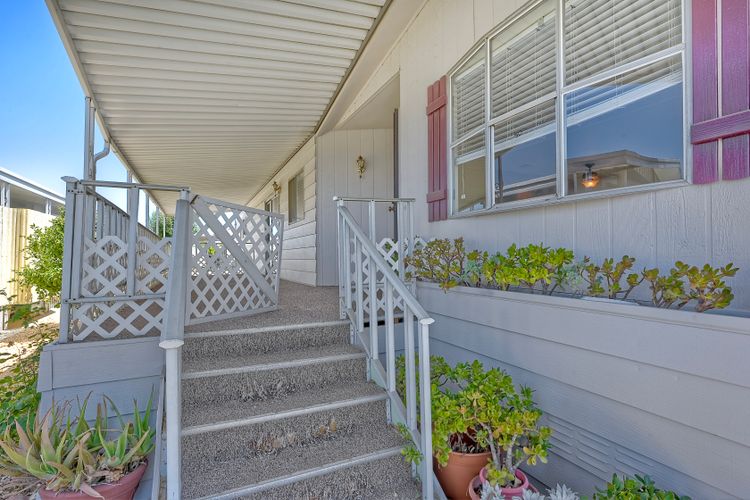 Desirable Sun City Mobile Home Estates, a 55+ gated community, this double-wide mobile home features 2 bedrooms, 2 bathrooms, one of the bathrooms is a Jack and Jill bathroom, and approximately 1,440 sq. ft. of living space. Highlights include lots of natural light, a spacious primary suite with large closet space, soaking tub, walk-in shower, a formal living room and dining area with a built-in cabinet, and a great kitchen equipped with a gas cooktop and walk-in pantry with plenty of storage. Additional features include ceiling fans, a covered porch, a dog ramp and dog play area, and a nice covered carport with two large storage sheds. Enjoy the community amenities: a clubhouse, heated pool, and many social activities to give you lots of opportunities to get involved. Conveniently located near shopping, a hospital, and the 215 freeway. Great opportunity to live a simple life in beautiful Sun City Mobile Home Estates.