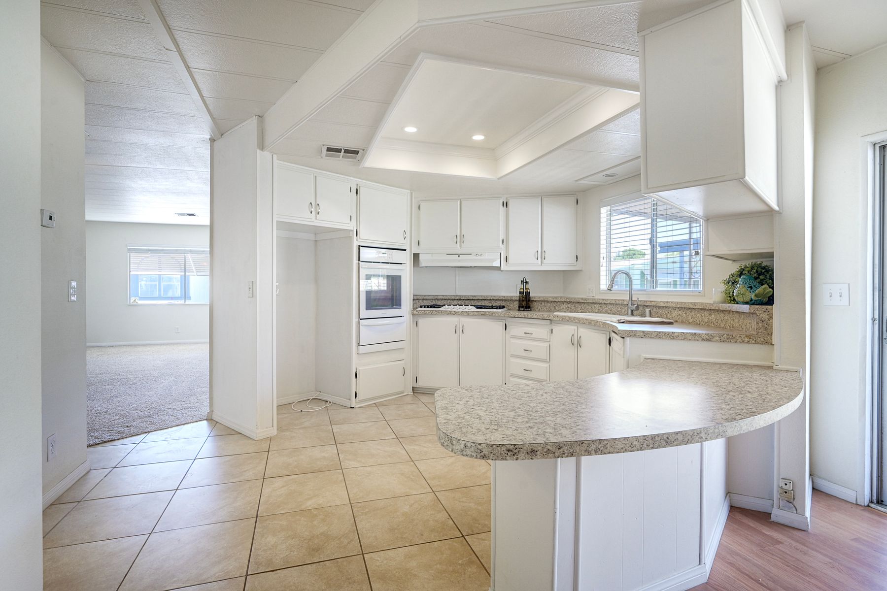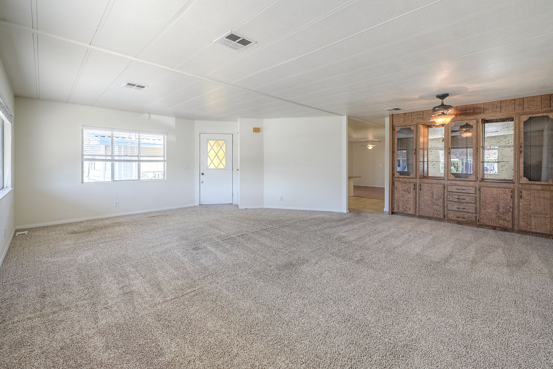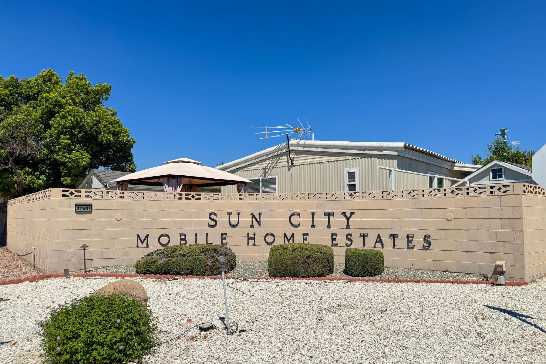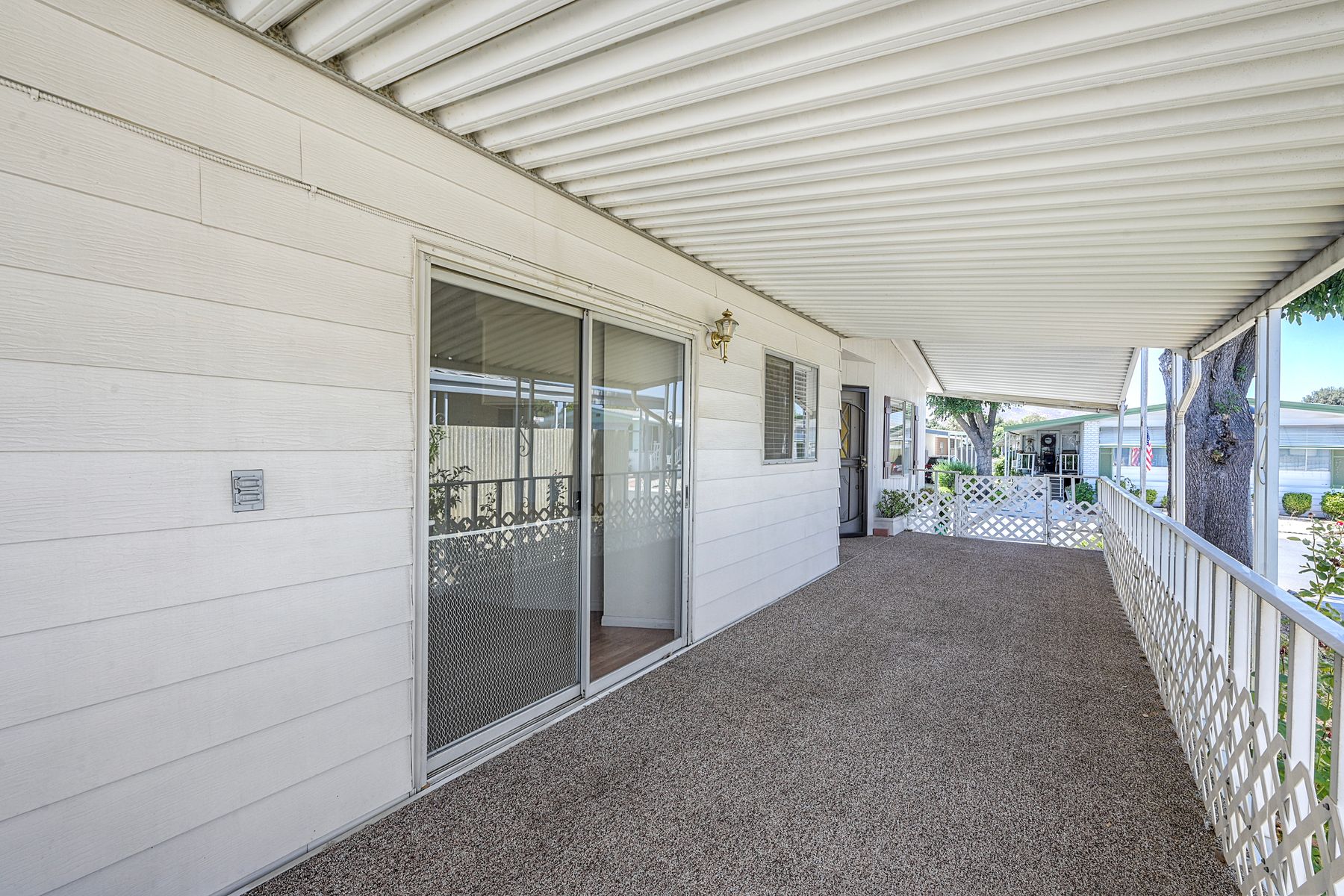 Desirable Sun City Mobile Home Estates, a 55+ gated community, this double-wide mobile home features 2 bedrooms, 2 bathrooms, one of the bathrooms is a Jack and Jill bathroom, and approximately 1,440 sq. ft. of living space. Highlights include lots of natural light, a spacious primary suite with large closet space, soaking tub, walk-in shower, a formal living room and dining area with a built-in cabinet, and a great kitchen equipped with a gas cooktop and walk-in pantry with plenty of storage. Additional features include ceiling fans, a covered porch, a dog ramp and dog play area, and a nice covered carport with two large storage sheds. Enjoy the community amenities: a clubhouse, heated pool, and many social activities to give you lots of opportunities to get involved. Conveniently located near shopping, a hospital, and the 215 freeway. Great opportunity to live a simple life in beautiful Sun City Mobile Home Estates.