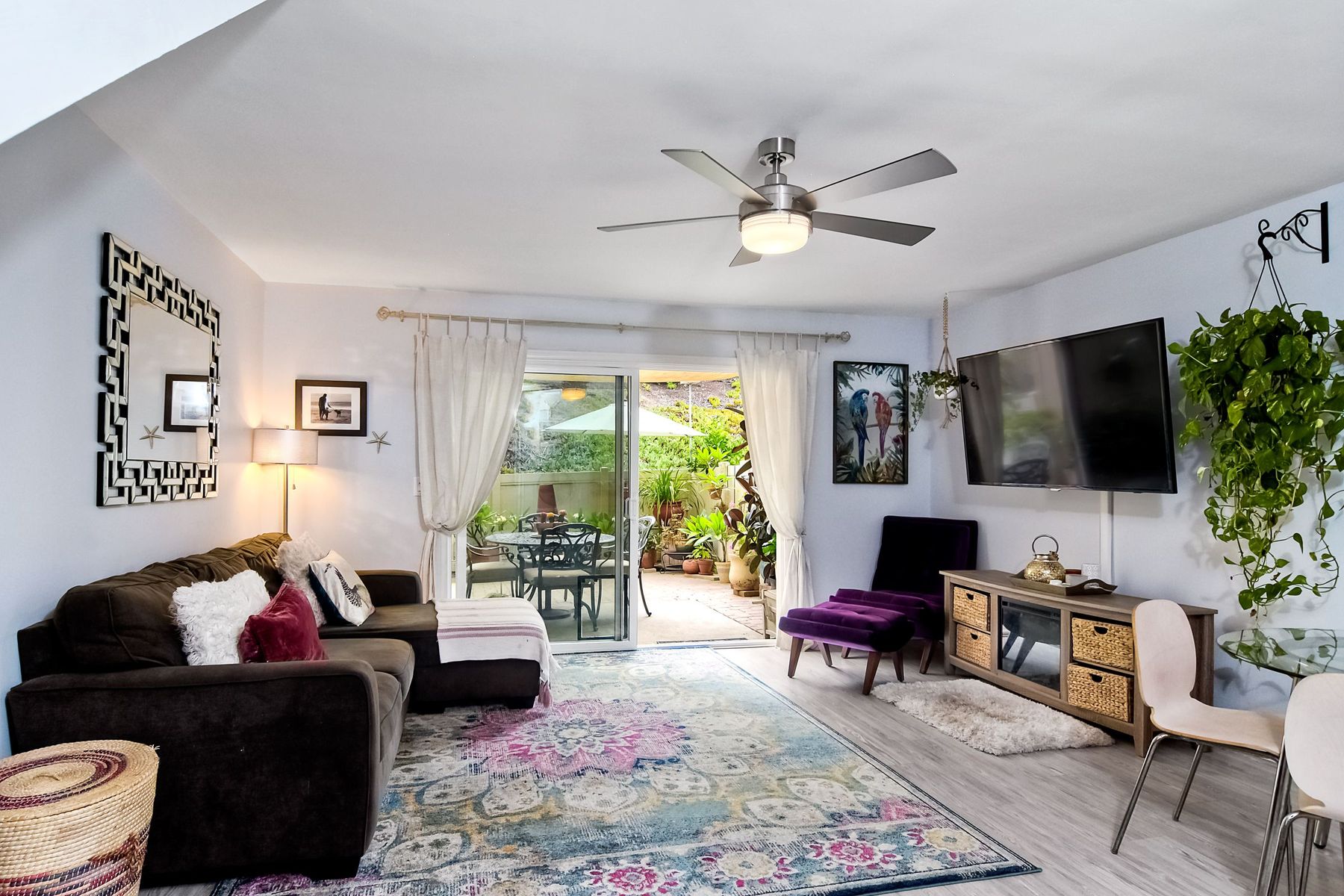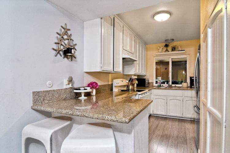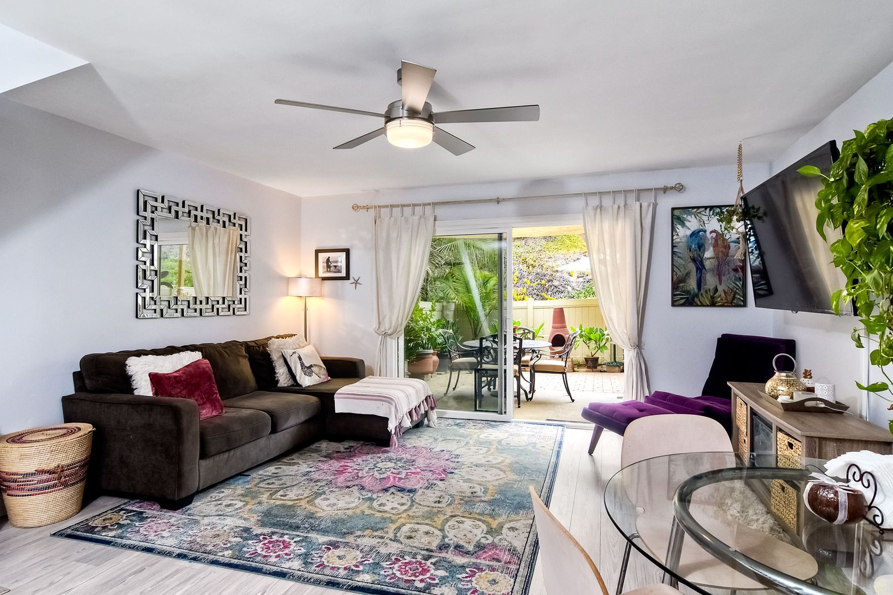 Nicely updated town-home in the desirable community of Village Park. Large private patio perfect for indoor/outdoor living. Granite counters, vinyl windows, laminate floors, mirrored wardrobes, ceiling fans, & updated baths. Short distance to the community amenities (rec-room, pool/spa, tennis courts, tot-lot, sports court, huge greenbelts/parks)...all this with a low $215 HOA fee. Excellent schools! Close to it all: shopping, restaurants, and the beach!