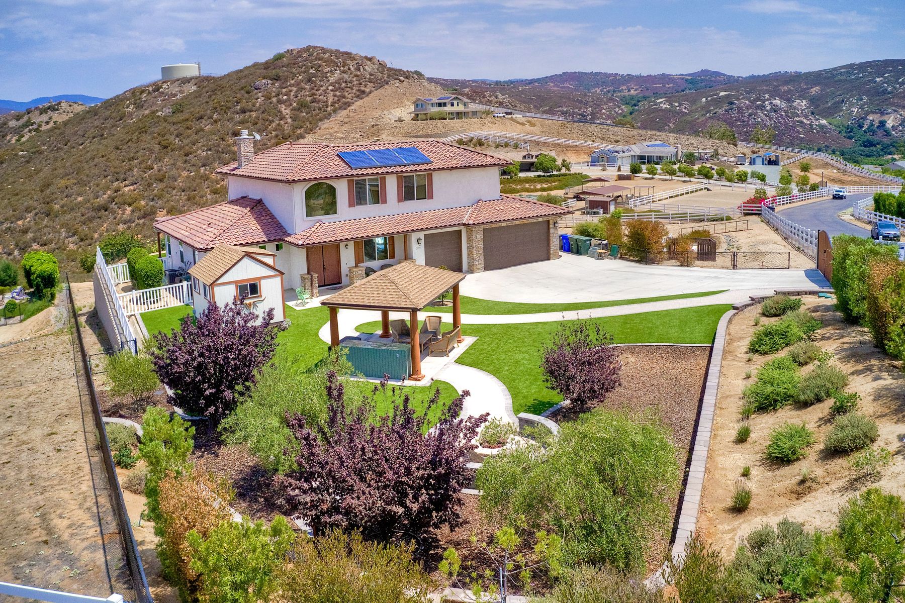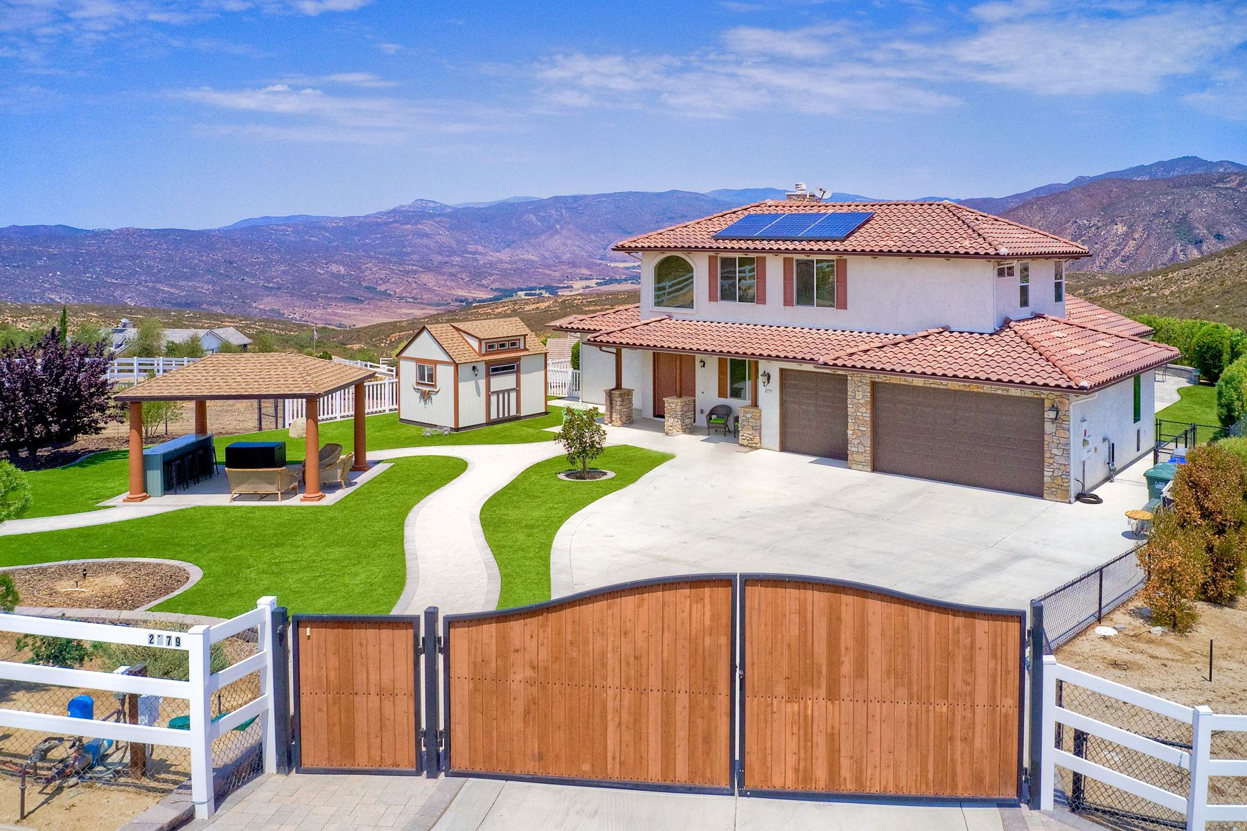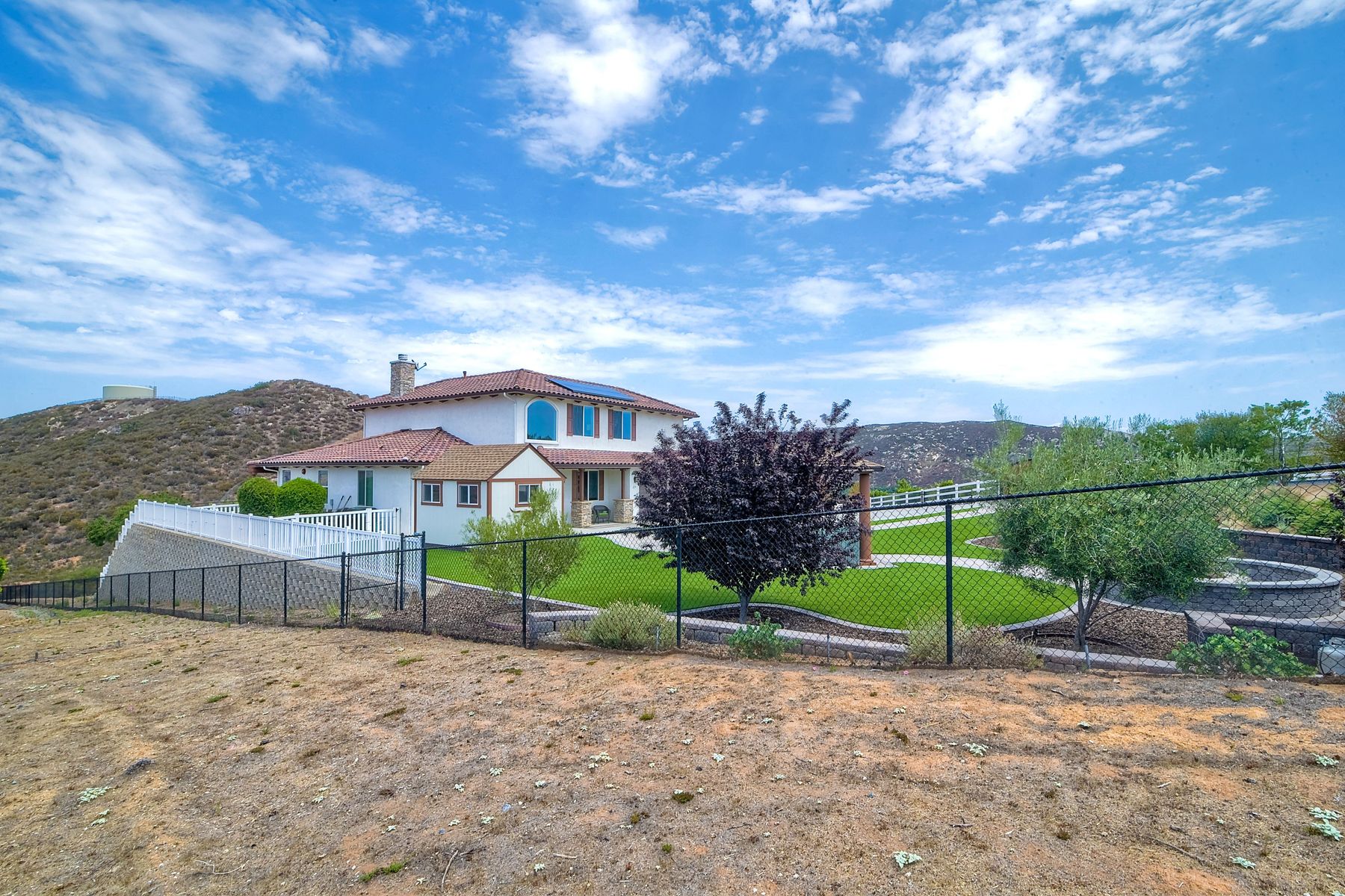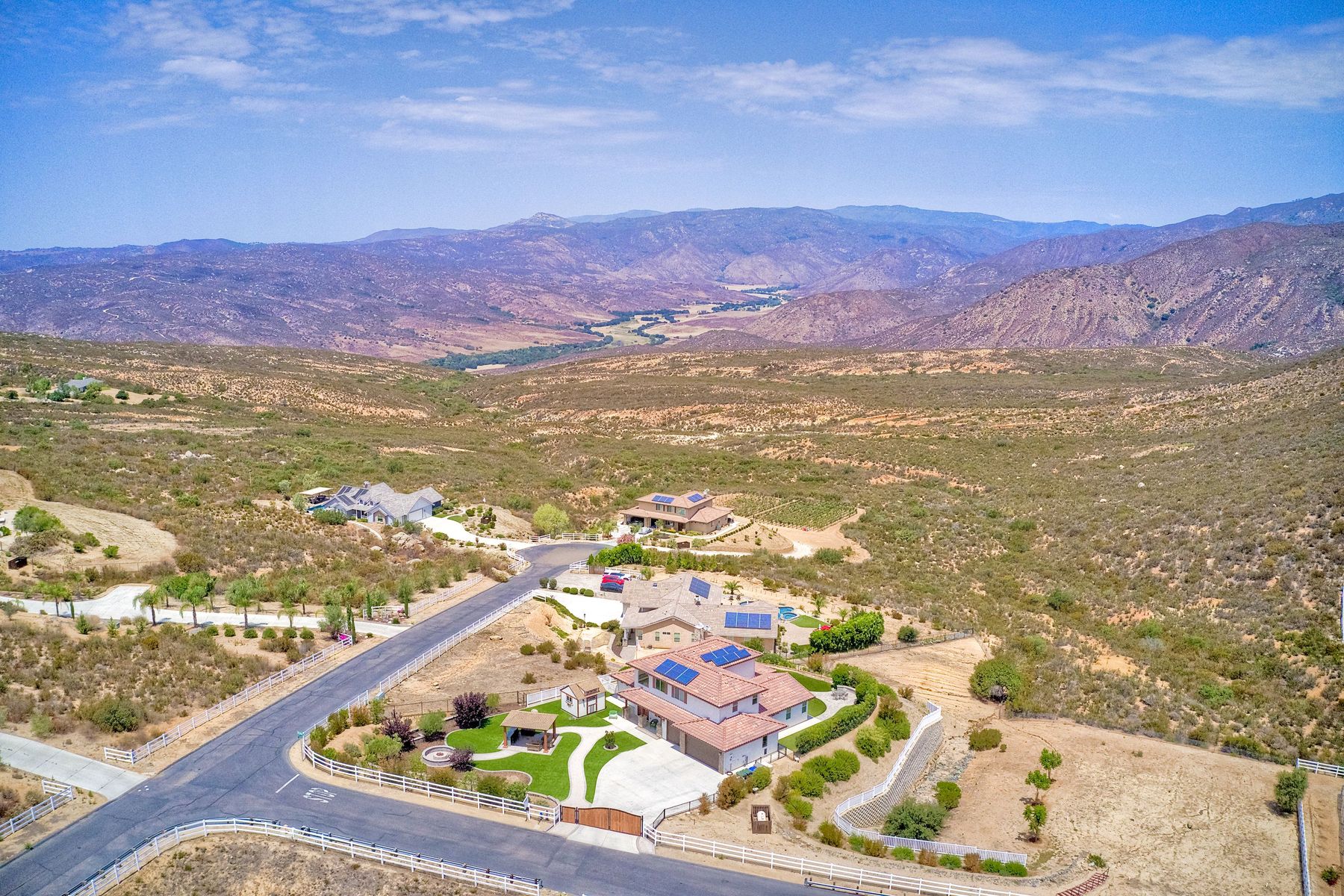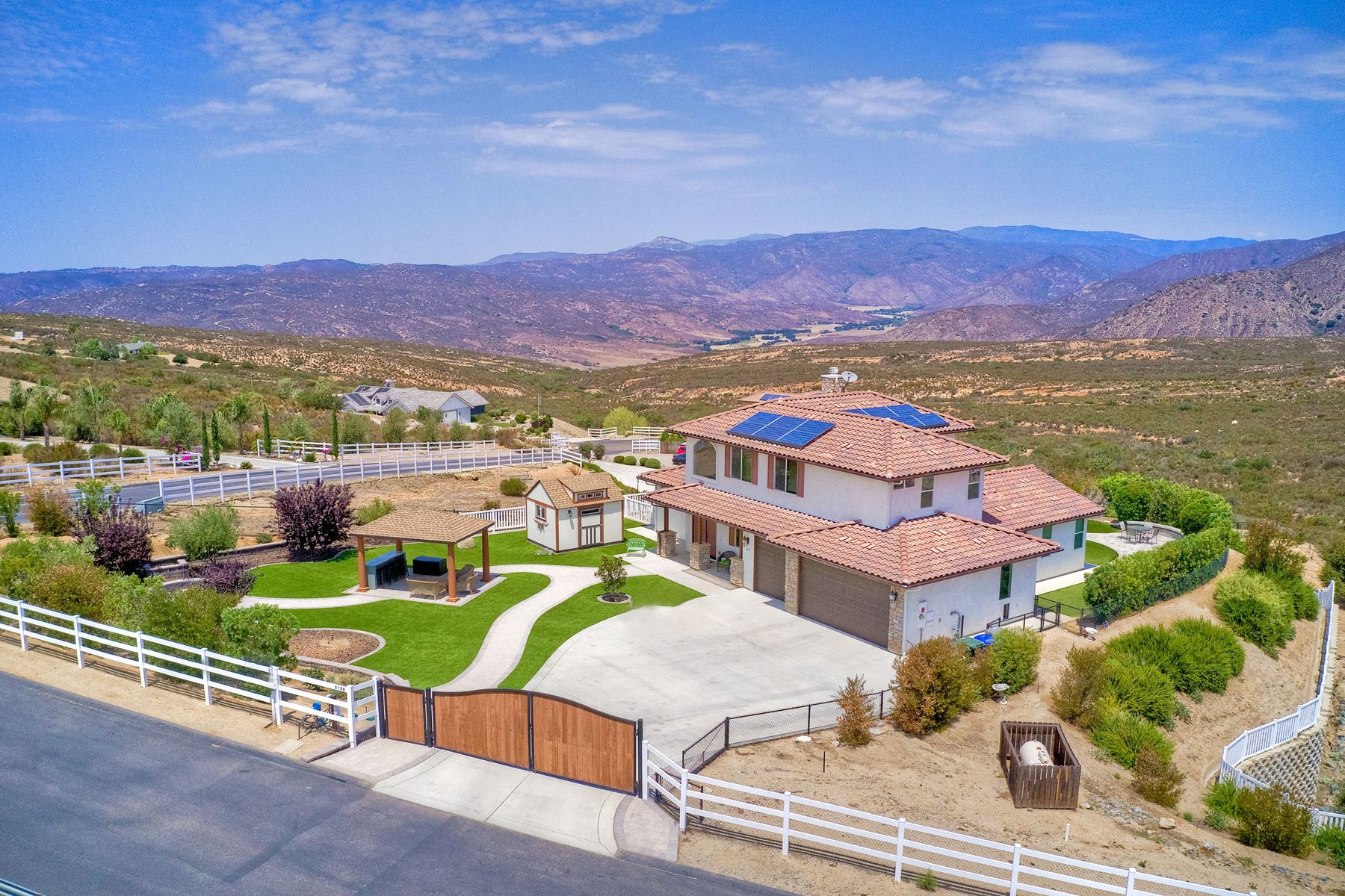 Magnificent 2 Story home on 2 usable acres with panoramic views of the mountains and valleys in every direction. Large master bedroom downstairs, with an additional bedroom/ bath downstairs and two jack and Jill bedrooms up with loft. Like new, this craftsman estate home, is located in exclusive Black Canyon Estates within quick and easy access to hiking and backpacking into the Cleveland National Forest or Black Canyon Falls. Attractive 3 rail white vinyl fencing surrounds the entire property with chain-link attached on the inside to keep pets in and other animals out. Ideal for the horse/animal enthusiast. This lot is one of the best lots for the views. With over 200K in upgrades this home has dramatic vaulted 20 foot ceilings in family room, with 10 foot ceilings in bedroom, crafted beautiful molding, and enhanced energy efficient dual glazed white vinyl windows, 3.0 KW solar system, tankless water system, fire resistant tile roofing, fire sprinklers with alarm. First time on the market, original seller, has beautiful interior details includes inviting tile entry, interior laundry rooms, large walk-in closets, large pantry, butler station, prewired for TV data and cable in living room, Master bedroom and secondary bedrooms. Includes a 3 car garage with tons of parking and room for an RV. An additional 10X10 storage shed conveys built on property that is prewired, and well insulated. Light Pecan stained kitchen cabinetry, granite counters includes 6" backsplash. Stainless Steel appliances, 30" gas range (Frigidaire) with built in micro/hood. Designer selected faucets, stainless steel dual sinks, with large island with counter seating for casual meals and elegant dining off the main entrance. Covered back patio off kitchen and master bedroom, which runs the length from family room to master bedroom. Designed pavers, with gas firepit and pergola in front yard, featured Led lighting through-out, sprinkler systems throughout front and back yard. There is no grass, but all turf. Garage has wall to wall built-in storage which includes closet space. Also your own generator! Peace and serenity all around.