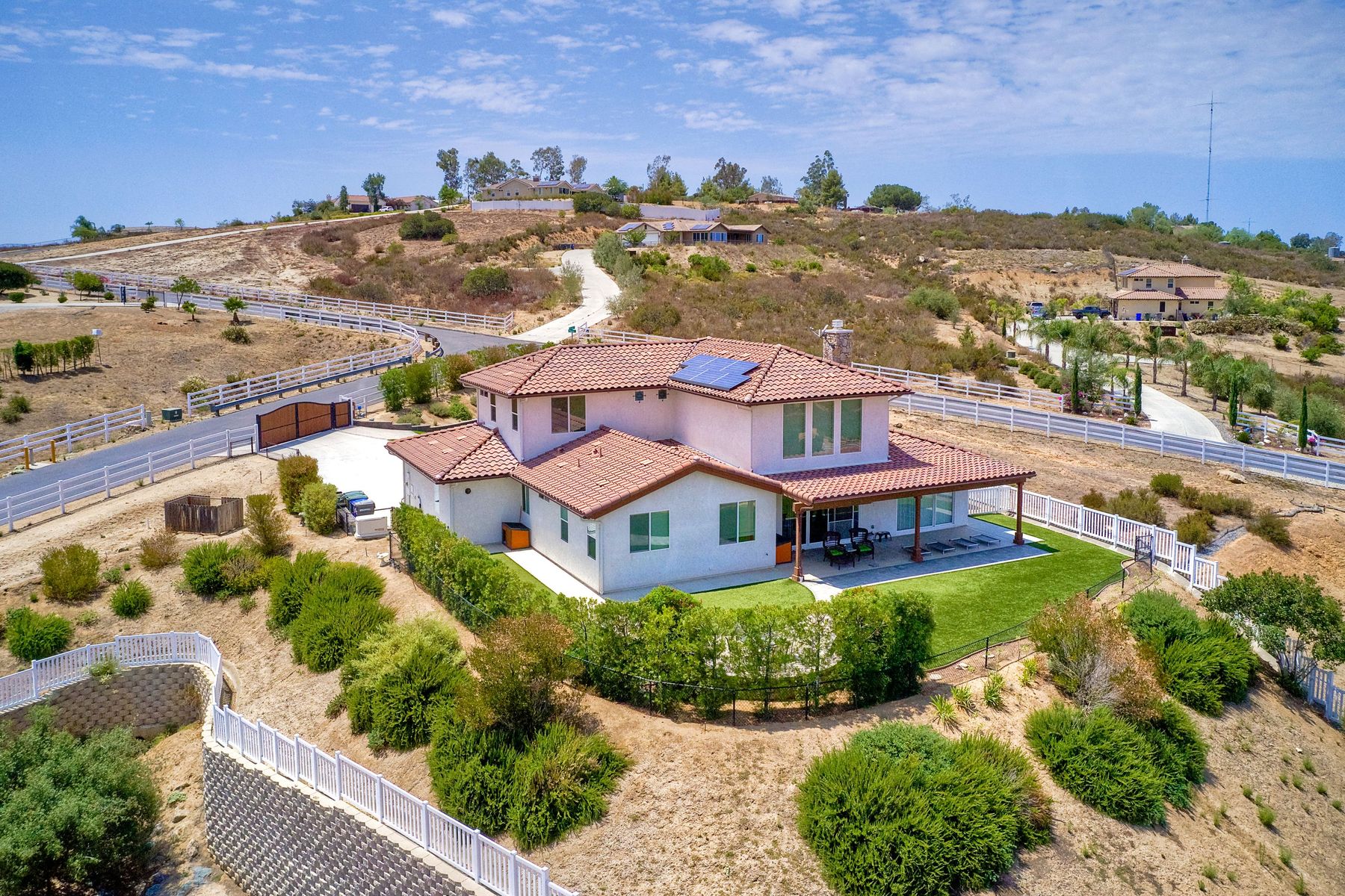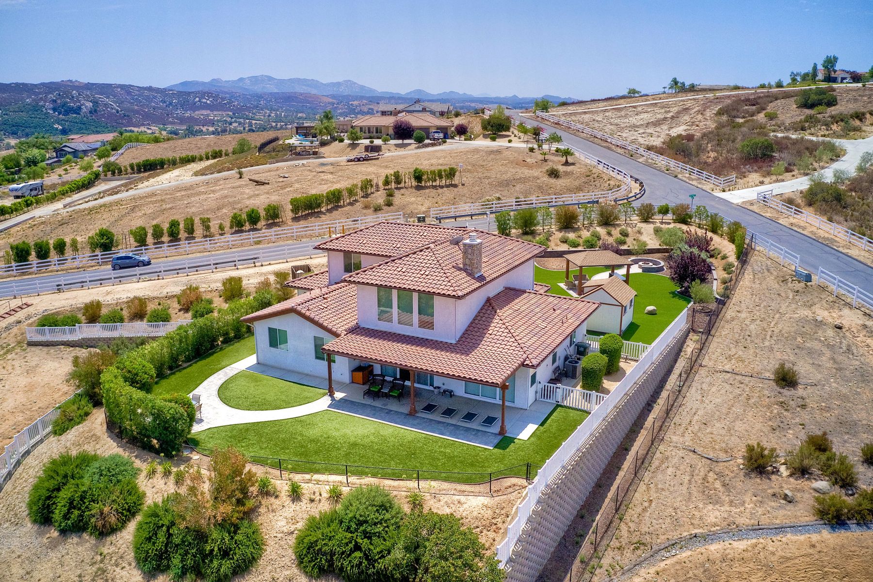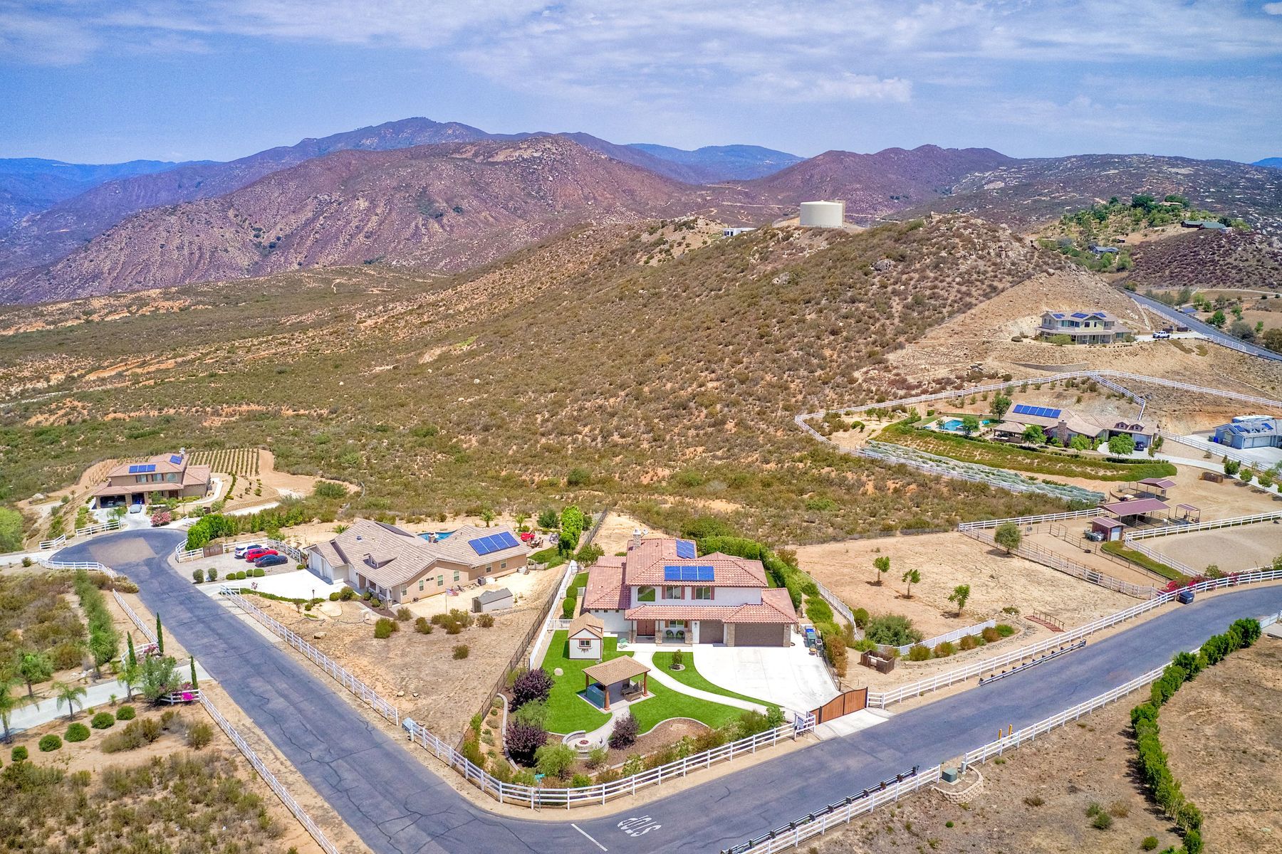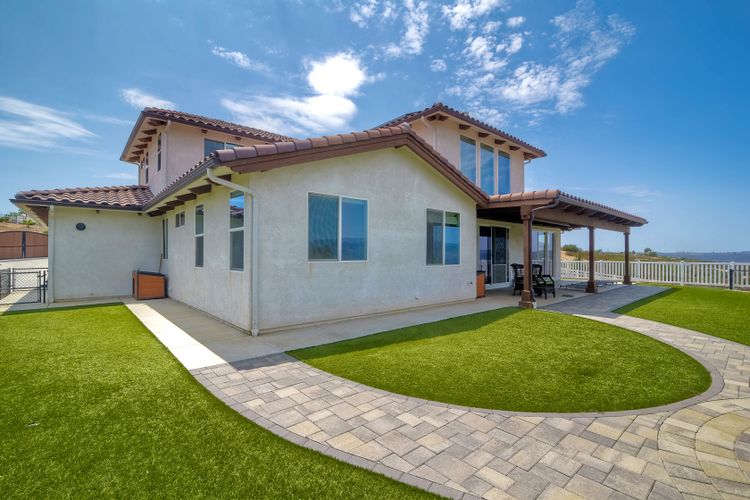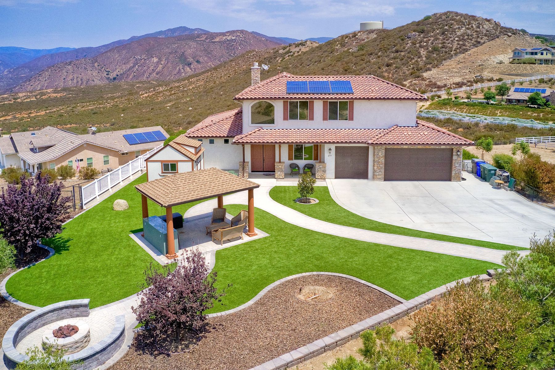 Magnificent 2 Story home on 2 usable acres with panoramic views of the mountains and valleys in every direction. Large master bedroom downstairs, with an additional bedroom/ bath downstairs and two jack and Jill bedrooms up with loft. Like new, this craftsman estate home, is located in exclusive Black Canyon Estates within quick and easy access to hiking and backpacking into the Cleveland National Forest or Black Canyon Falls. Attractive 3 rail white vinyl fencing surrounds the entire property with chain-link attached on the inside to keep pets in and other animals out. Ideal for the horse/animal enthusiast. This lot is one of the best lots for the views. With over 200K in upgrades this home has dramatic vaulted 20 foot ceilings in family room, with 10 foot ceilings in bedroom, crafted beautiful molding, and enhanced energy efficient dual glazed white vinyl windows, 3.0 KW solar system, tankless water system, fire resistant tile roofing, fire sprinklers with alarm. First time on the market, original seller, has beautiful interior details includes inviting tile entry, interior laundry rooms, large walk-in closets, large pantry, butler station, prewired for TV data and cable in living room, Master bedroom and secondary bedrooms. Includes a 3 car garage with tons of parking and room for an RV. An additional 10X10 storage shed conveys built on property that is prewired, and well insulated. Light Pecan stained kitchen cabinetry, granite counters includes 6" backsplash. Stainless Steel appliances, 30" gas range (Frigidaire) with built in micro/hood. Designer selected faucets, stainless steel dual sinks, with large island with counter seating for casual meals and elegant dining off the main entrance. Covered back patio off kitchen and master bedroom, which runs the length from family room to master bedroom. Designed pavers, with gas firepit and pergola in front yard, featured Led lighting through-out, sprinkler systems throughout front and back yard. There is no grass, but all turf. Garage has wall to wall built-in storage which includes closet space. Also your own generator! Peace and serenity all around.