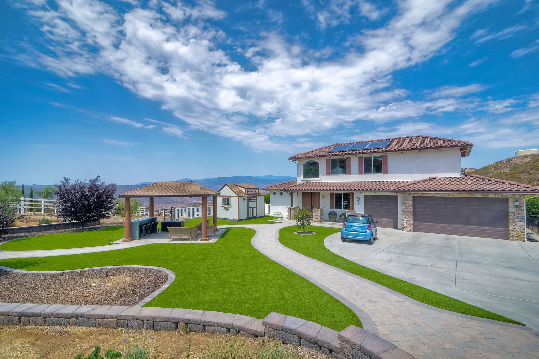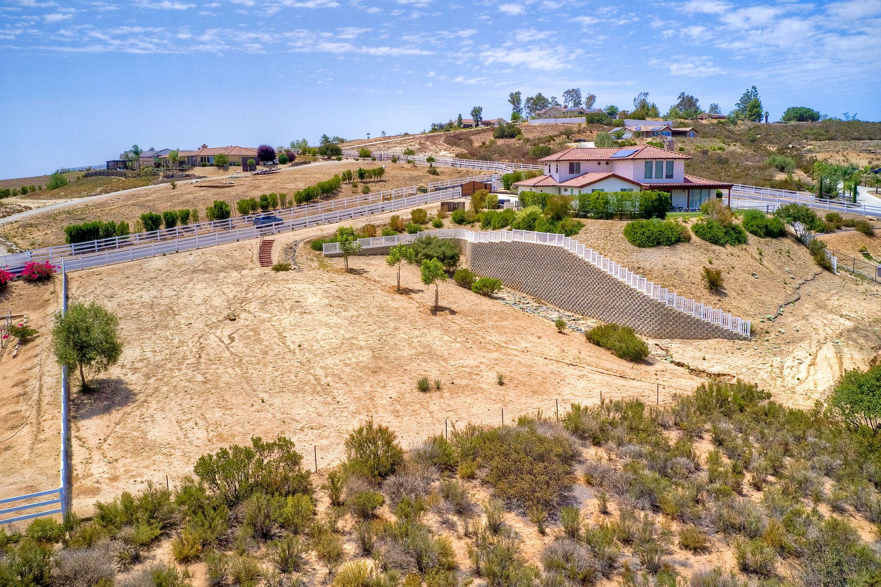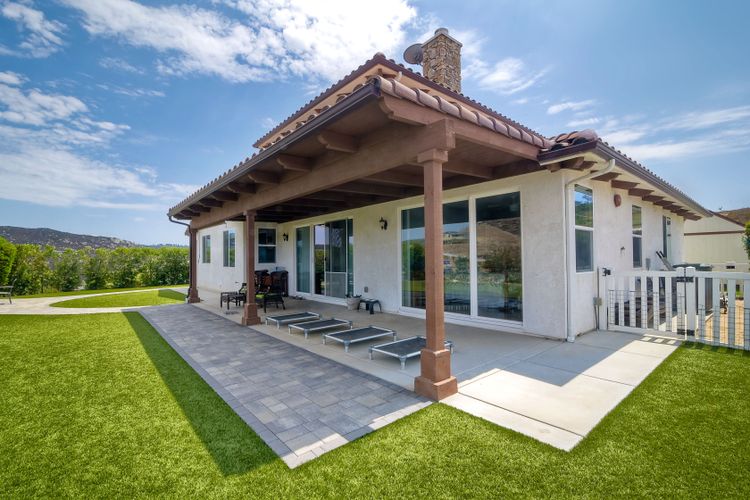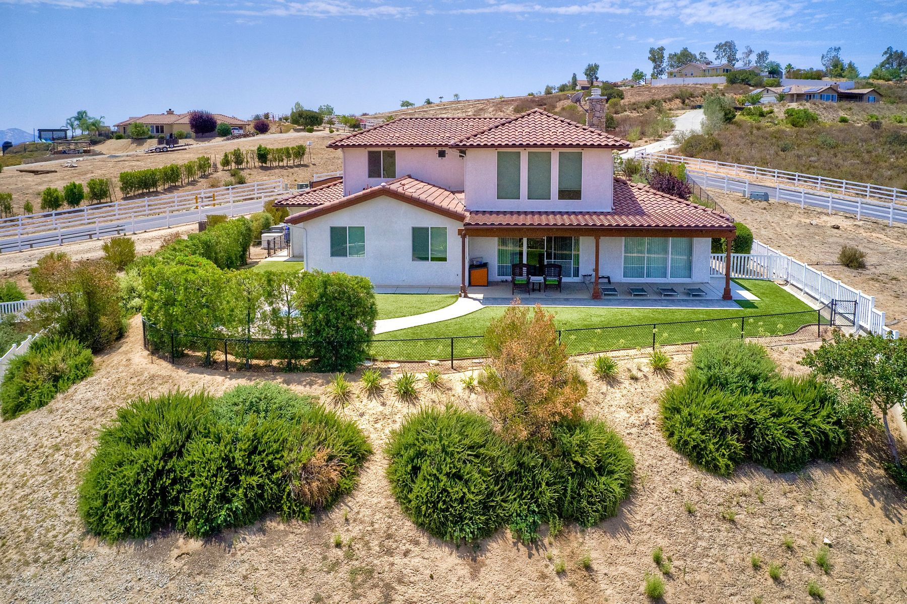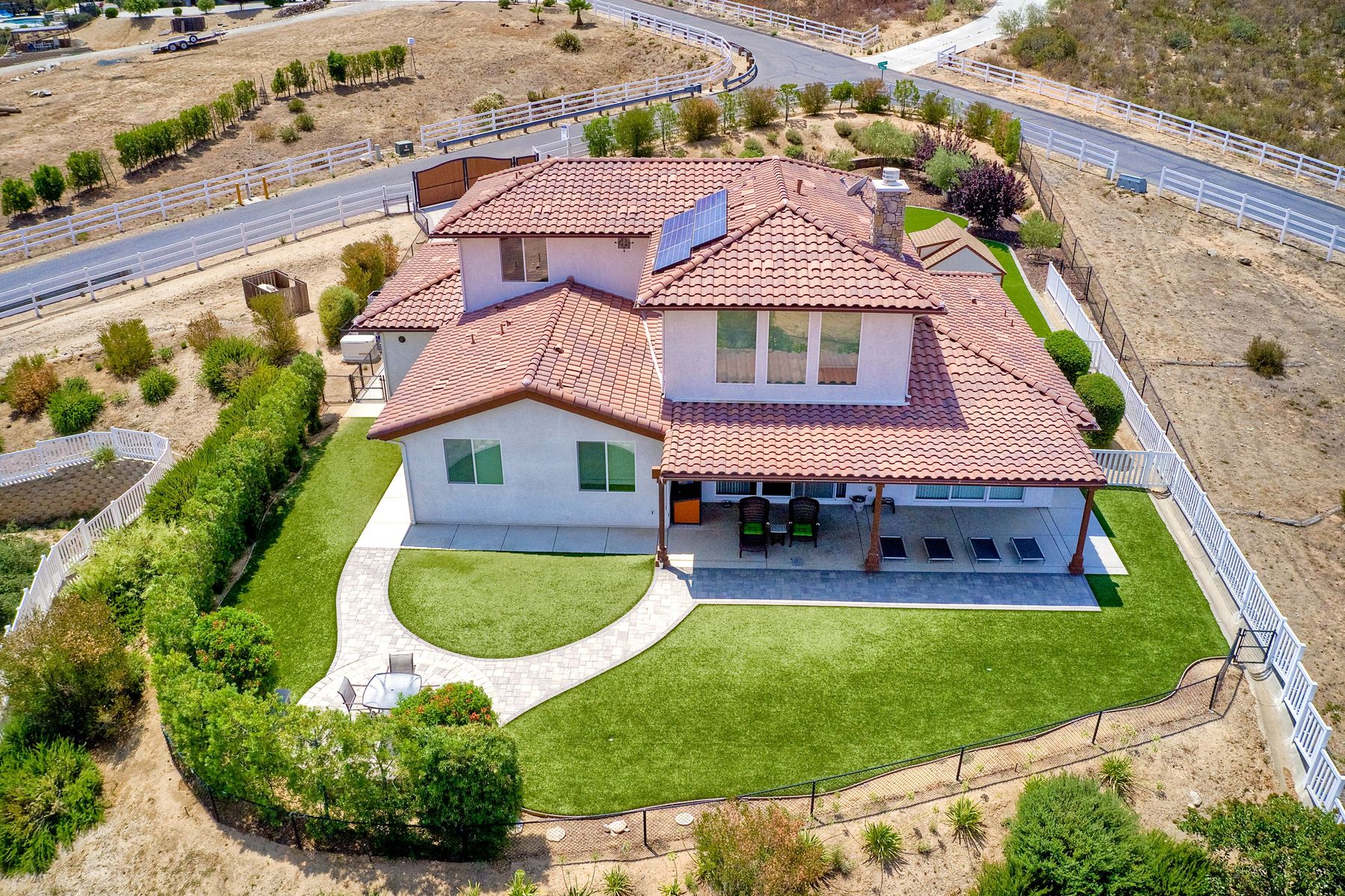 Magnificent 2 Story home on 2 usable acres with panoramic views of the mountains and valleys in every direction. Large master bedroom downstairs, with an additional bedroom/ bath downstairs and two jack and Jill bedrooms up with loft. Like new, this craftsman estate home, is located in exclusive Black Canyon Estates within quick and easy access to hiking and backpacking into the Cleveland National Forest or Black Canyon Falls. Attractive 3 rail white vinyl fencing surrounds the entire property with chain-link attached on the inside to keep pets in and other animals out. Ideal for the horse/animal enthusiast. This lot is one of the best lots for the views. With over 200K in upgrades this home has dramatic vaulted 20 foot ceilings in family room, with 10 foot ceilings in bedroom, crafted beautiful molding, and enhanced energy efficient dual glazed white vinyl windows, 3.0 KW solar system, tankless water system, fire resistant tile roofing, fire sprinklers with alarm. First time on the market, original seller, has beautiful interior details includes inviting tile entry, interior laundry rooms, large walk-in closets, large pantry, butler station, prewired for TV data and cable in living room, Master bedroom and secondary bedrooms. Includes a 3 car garage with tons of parking and room for an RV. An additional 10X10 storage shed conveys built on property that is prewired, and well insulated. Light Pecan stained kitchen cabinetry, granite counters includes 6" backsplash. Stainless Steel appliances, 30" gas range (Frigidaire) with built in micro/hood. Designer selected faucets, stainless steel dual sinks, with large island with counter seating for casual meals and elegant dining off the main entrance. Covered back patio off kitchen and master bedroom, which runs the length from family room to master bedroom. Designed pavers, with gas firepit and pergola in front yard, featured Led lighting through-out, sprinkler systems throughout front and back yard. There is no grass, but all turf. Garage has wall to wall built-in storage which includes closet space. Also your own generator! Peace and serenity all around.