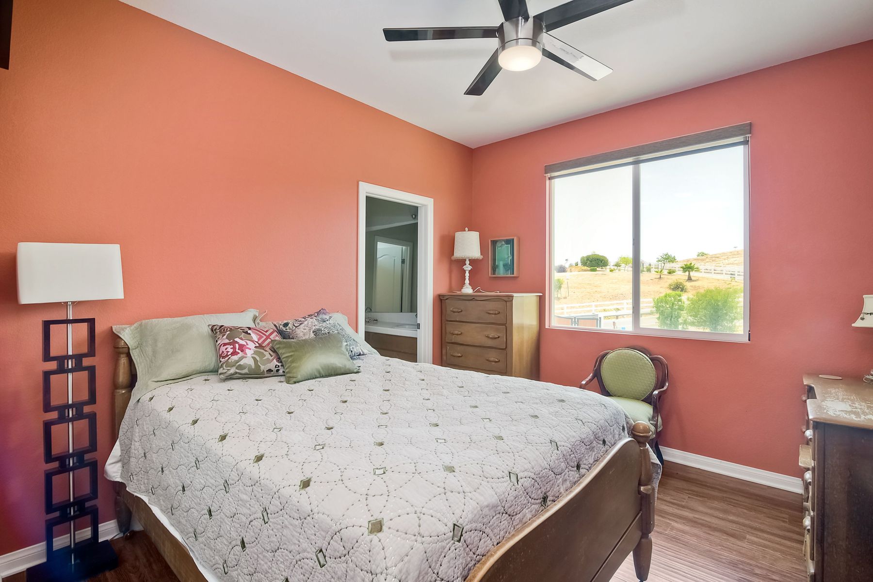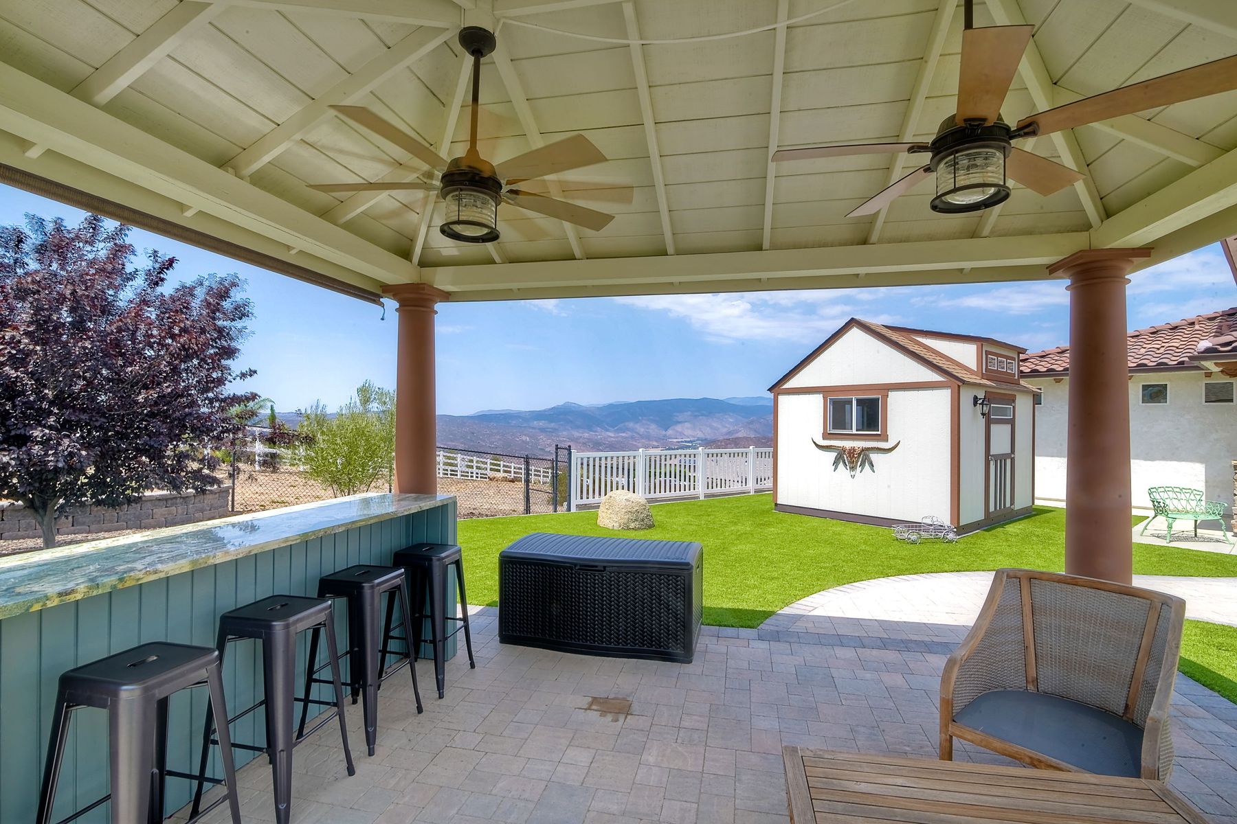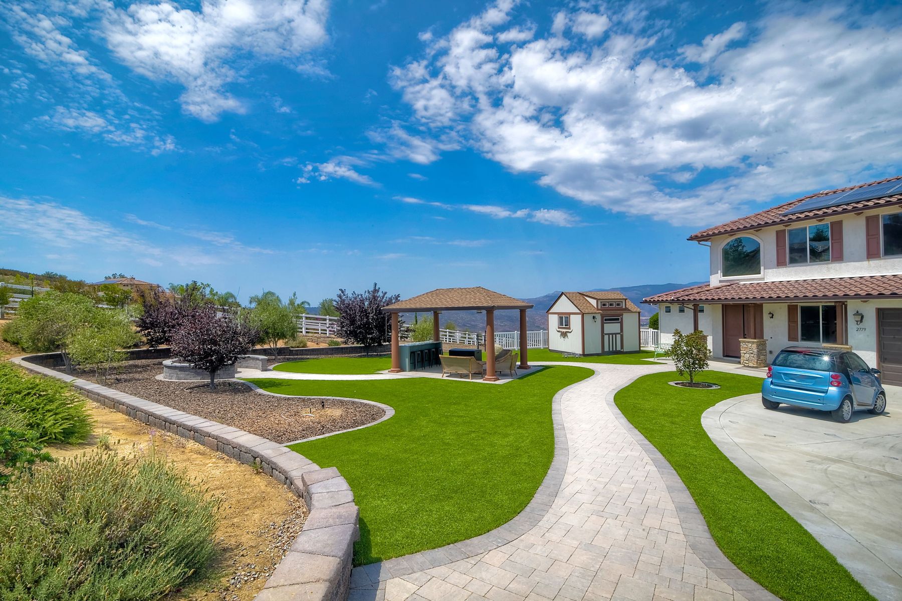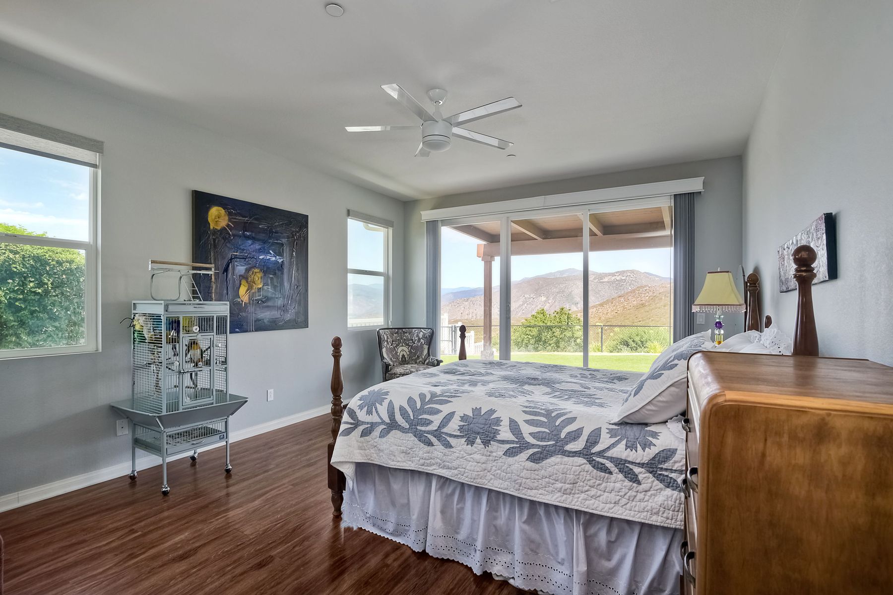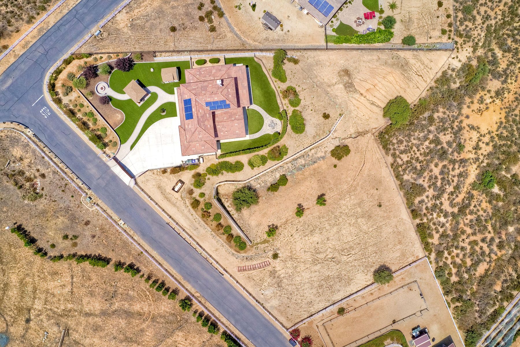 Magnificent 2 Story home on 2 usable acres with panoramic views of the mountains and valleys in every direction. Large master bedroom downstairs, with an additional bedroom/ bath downstairs and two jack and Jill bedrooms up with loft. Like new, this craftsman estate home, is located in exclusive Black Canyon Estates within quick and easy access to hiking and backpacking into the Cleveland National Forest or Black Canyon Falls. Attractive 3 rail white vinyl fencing surrounds the entire property with chain-link attached on the inside to keep pets in and other animals out. Ideal for the horse/animal enthusiast. This lot is one of the best lots for the views. With over 200K in upgrades this home has dramatic vaulted 20 foot ceilings in family room, with 10 foot ceilings in bedroom, crafted beautiful molding, and enhanced energy efficient dual glazed white vinyl windows, 3.0 KW solar system, tankless water system, fire resistant tile roofing, fire sprinklers with alarm. First time on the market, original seller, has beautiful interior details includes inviting tile entry, interior laundry rooms, large walk-in closets, large pantry, butler station, prewired for TV data and cable in living room, Master bedroom and secondary bedrooms. Includes a 3 car garage with tons of parking and room for an RV. An additional 10X10 storage shed conveys built on property that is prewired, and well insulated. Light Pecan stained kitchen cabinetry, granite counters includes 6" backsplash. Stainless Steel appliances, 30" gas range (Frigidaire) with built in micro/hood. Designer selected faucets, stainless steel dual sinks, with large island with counter seating for casual meals and elegant dining off the main entrance. Covered back patio off kitchen and master bedroom, which runs the length from family room to master bedroom. Designed pavers, with gas firepit and pergola in front yard, featured Led lighting through-out, sprinkler systems throughout front and back yard. There is no grass, but all turf. Garage has wall to wall built-in storage which includes closet space. Also your own generator! Peace and serenity all around.