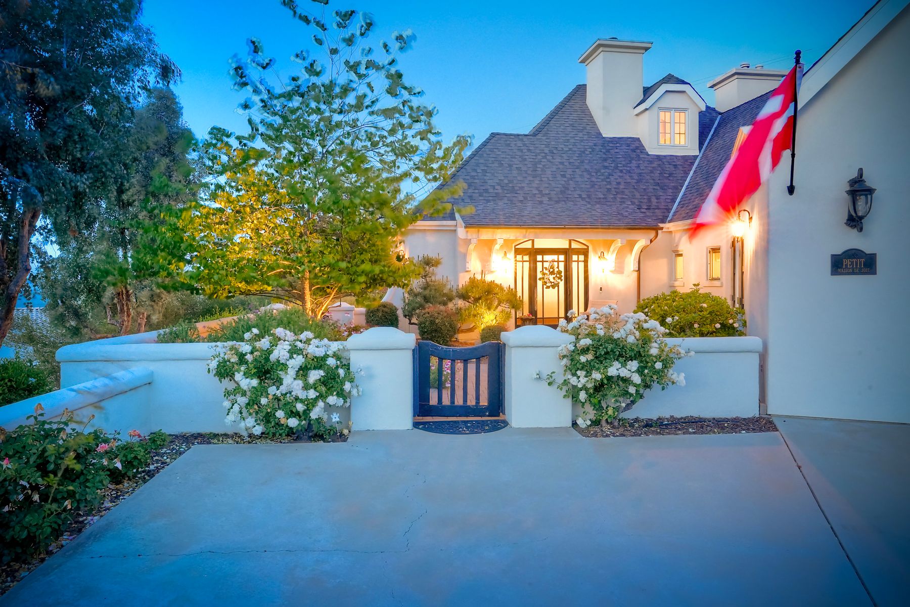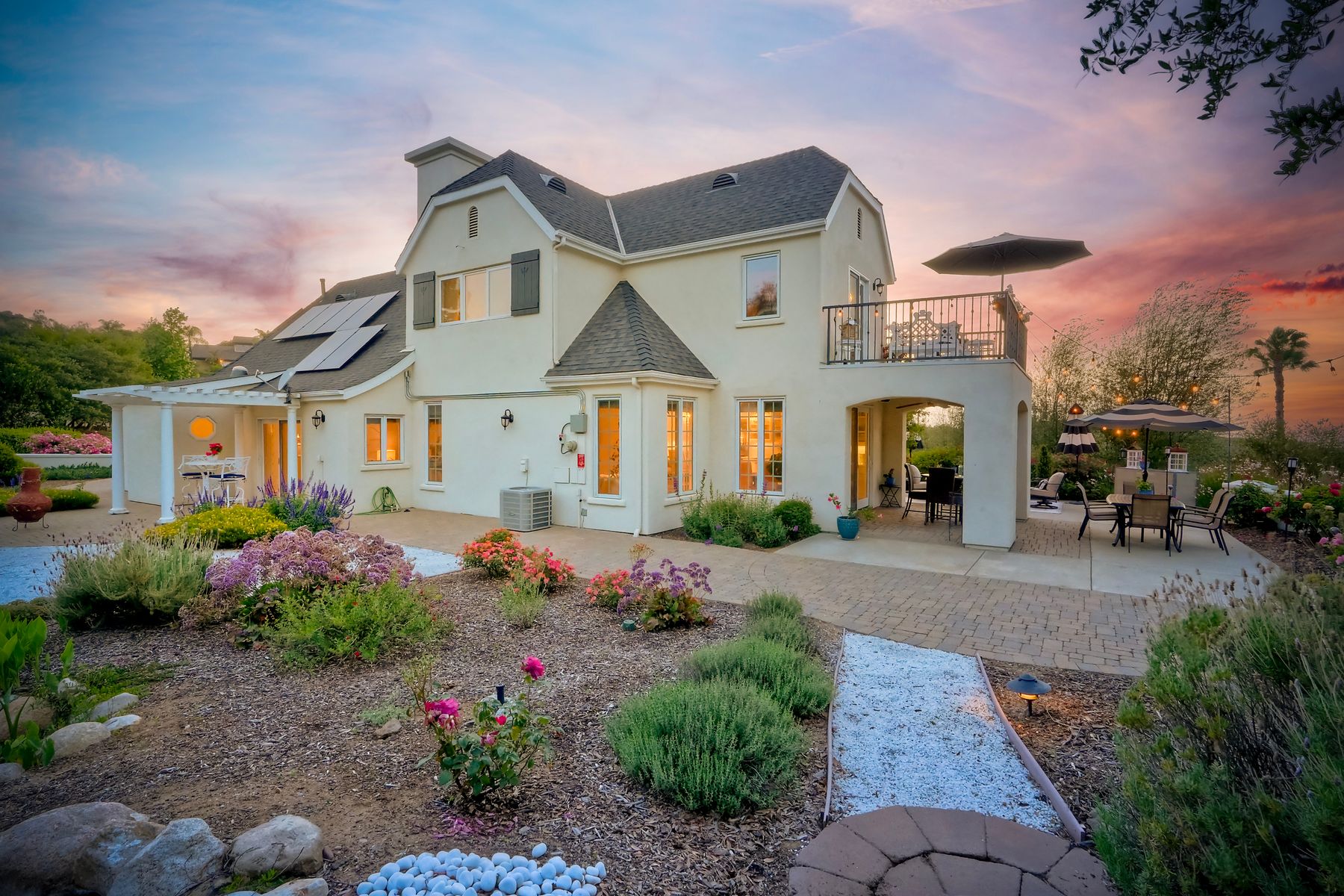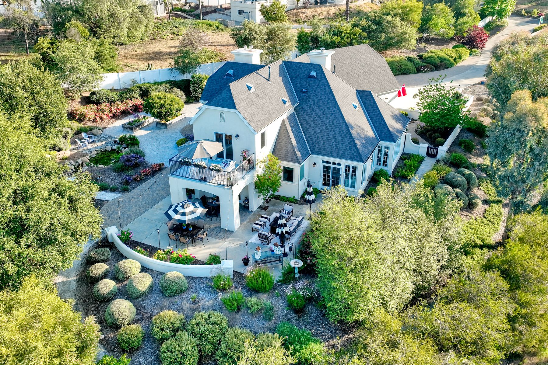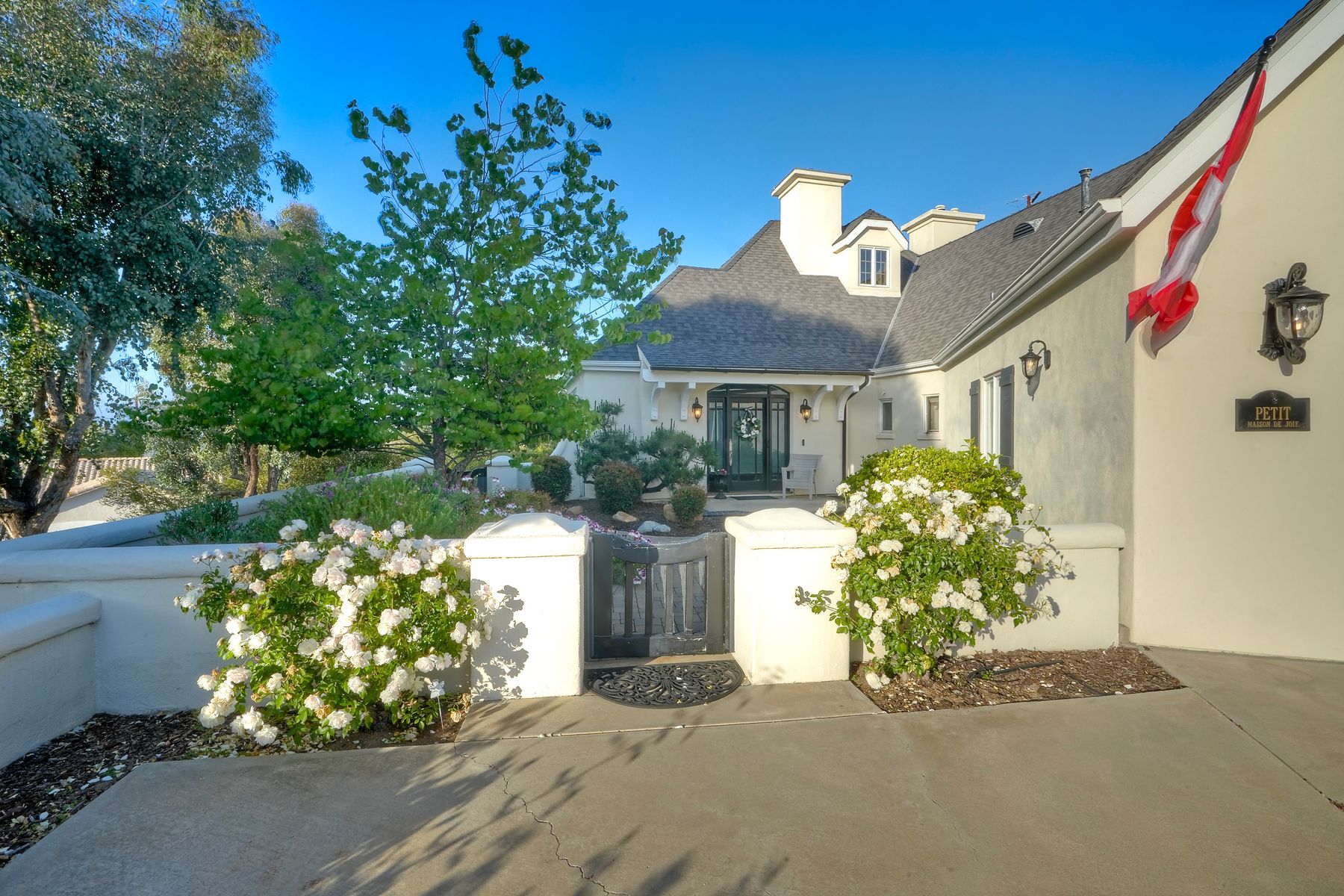 Meet "Petit Maison De Joie", a gorgeous estate where storybook charm meets serene luxury in this 3-bedroom, 2.5 bath French chateau-style home. Tucked away at the end of a quiet cul-de-sac on over an acre of land, this home has NO HOA! Plenty of space to store your Boat or RV! From the long, private driveway to the fairy tale exterior, this home offers beauty, privacy, and everyday comfort in equal measure. The spacious primary MASTER SUITE is located on the FIRST FLOOR and features a clawfoot tub, a large MARBLE walk-in shower, and even remote-controlled toilets with auto-lift lids, a thoughtful touch of modern convenience. There are gorgeous wood floors throughout. Two additional bedrooms and a full bath are upstairs, with access to a private balcony overlooking the backyard. Home has transferable SOLAR, Built-in stainless steel newer appliances in kitchen with lovely crystal chandelier and many other RECENT UPGRADES! Outdoors, unwind in a tranquil setting complete with a waterfall, ROSE GARDENS, a gentle stream, and a charming chicken coop on this gorgeous 1.06 ACRE LOT! Whether you're sipping your morning coffee or enjoying a glass of wine at sunset, this peaceful setting makes it hard to believe you're only 35 minutes from the Beach! This is more than a home—it's a retreat you’ll never want to leave.