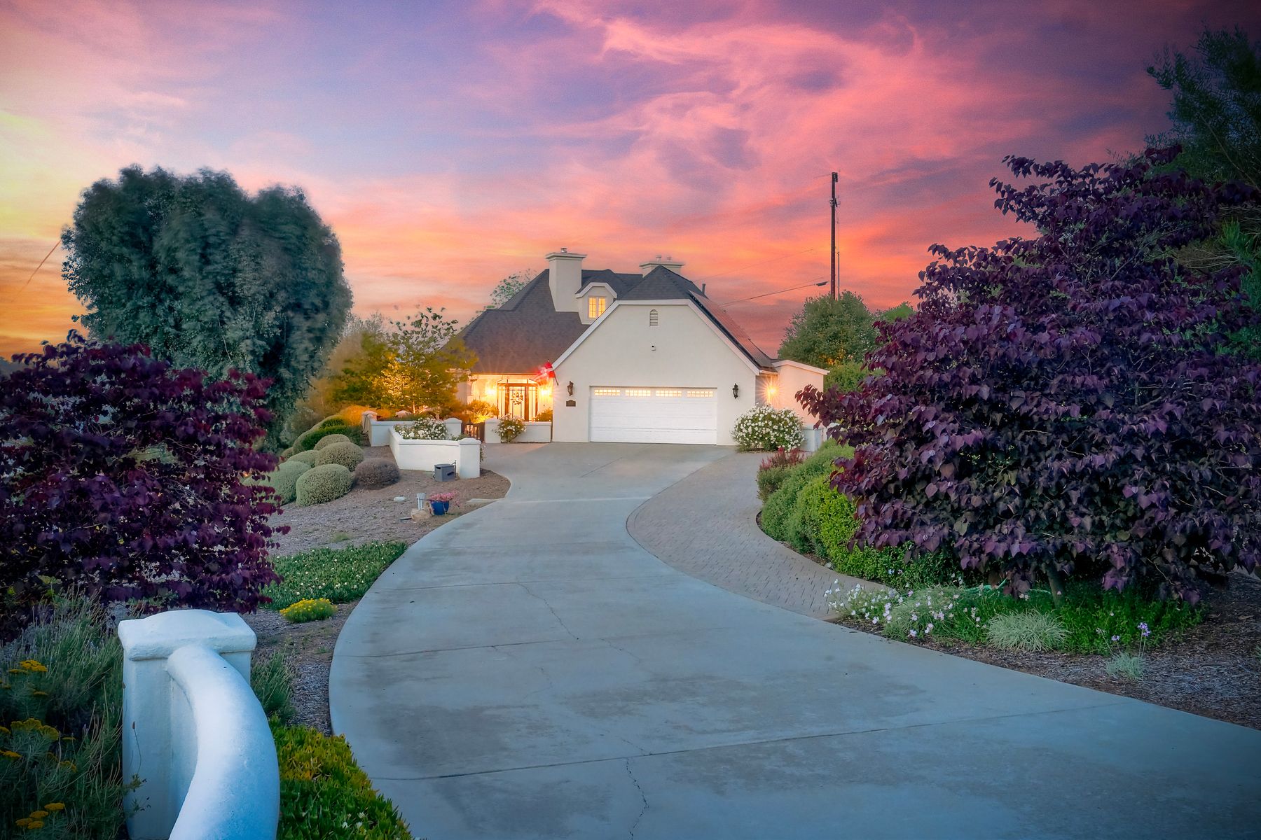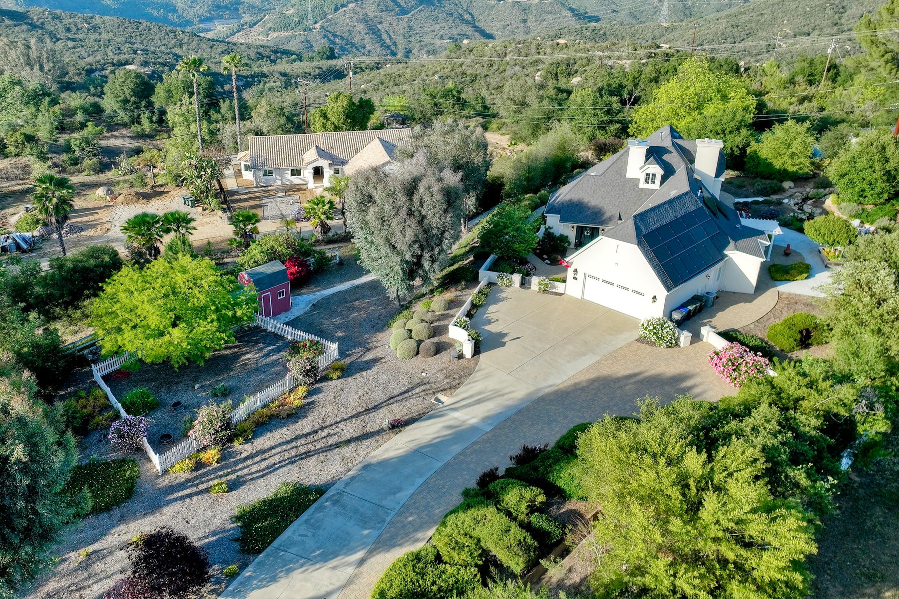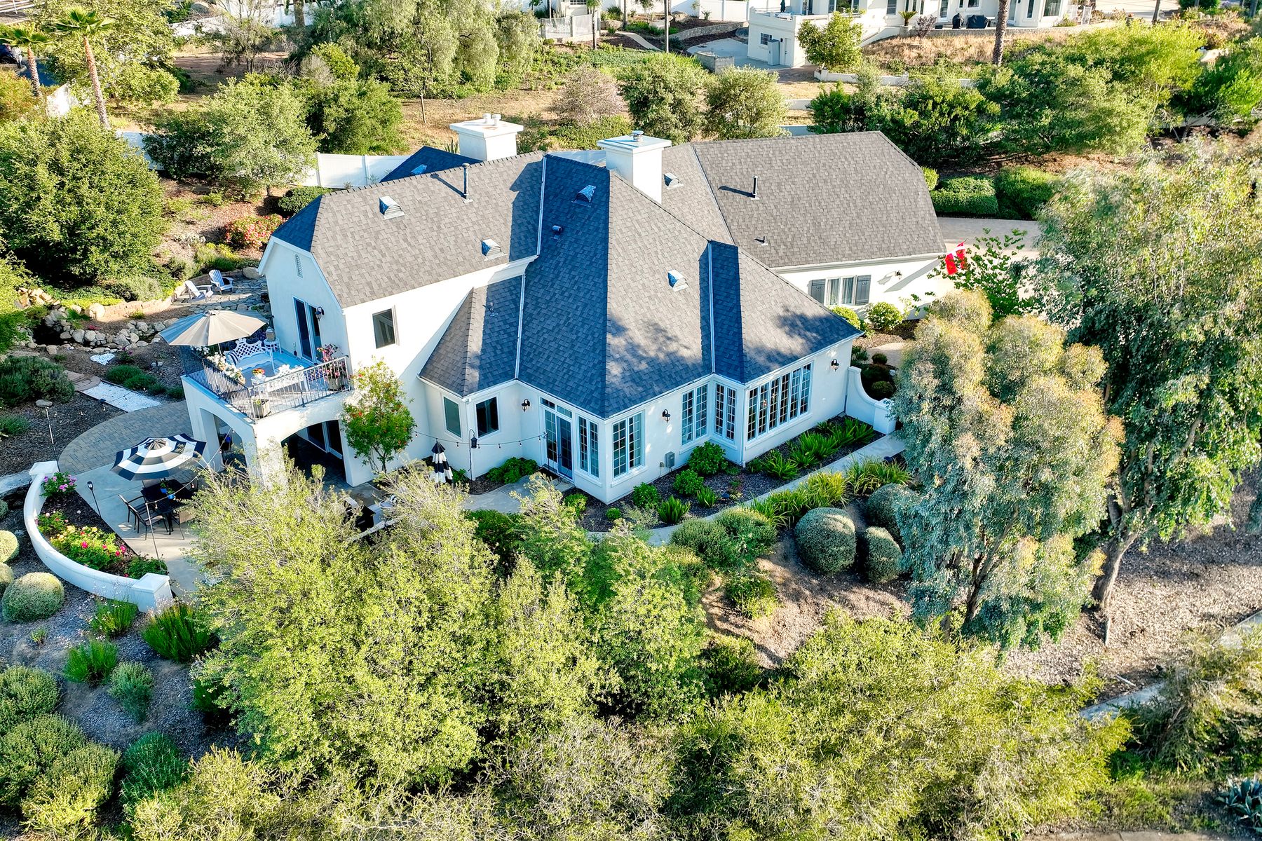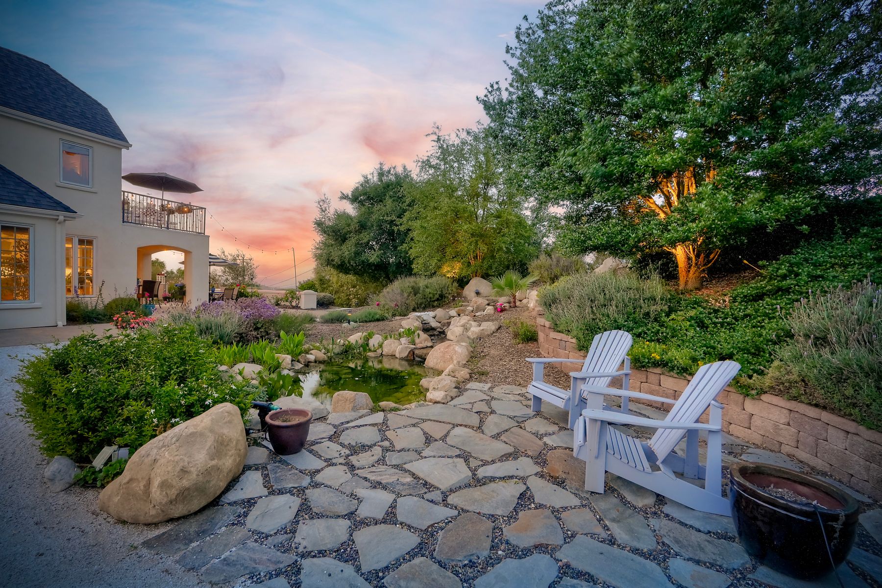 Meet "Petit Maison De Joie", a gorgeous estate where storybook charm meets serene luxury in this 3-bedroom, 2.5 bath French chateau-style home. Tucked away at the end of a quiet cul-de-sac on over an acre of land, this home has NO HOA! Plenty of space to store your Boat or RV! From the long, private driveway to the fairy tale exterior, this home offers beauty, privacy, and everyday comfort in equal measure. The spacious primary MASTER SUITE is located on the FIRST FLOOR and features a clawfoot tub, a large MARBLE walk-in shower, and even remote-controlled toilets with auto-lift lids, a thoughtful touch of modern convenience. There are gorgeous wood floors throughout. Two additional bedrooms and a full bath are upstairs, with access to a private balcony overlooking the backyard. Home has transferable SOLAR, Built-in stainless steel newer appliances in kitchen with lovely crystal chandelier and many other RECENT UPGRADES! Outdoors, unwind in a tranquil setting complete with a waterfall, ROSE GARDENS, a gentle stream, and a charming chicken coop on this gorgeous 1.06 ACRE LOT! Whether you're sipping your morning coffee or enjoying a glass of wine at sunset, this peaceful setting makes it hard to believe you're only 35 minutes from the Beach! This is more than a home—it's a retreat you’ll never want to leave.
