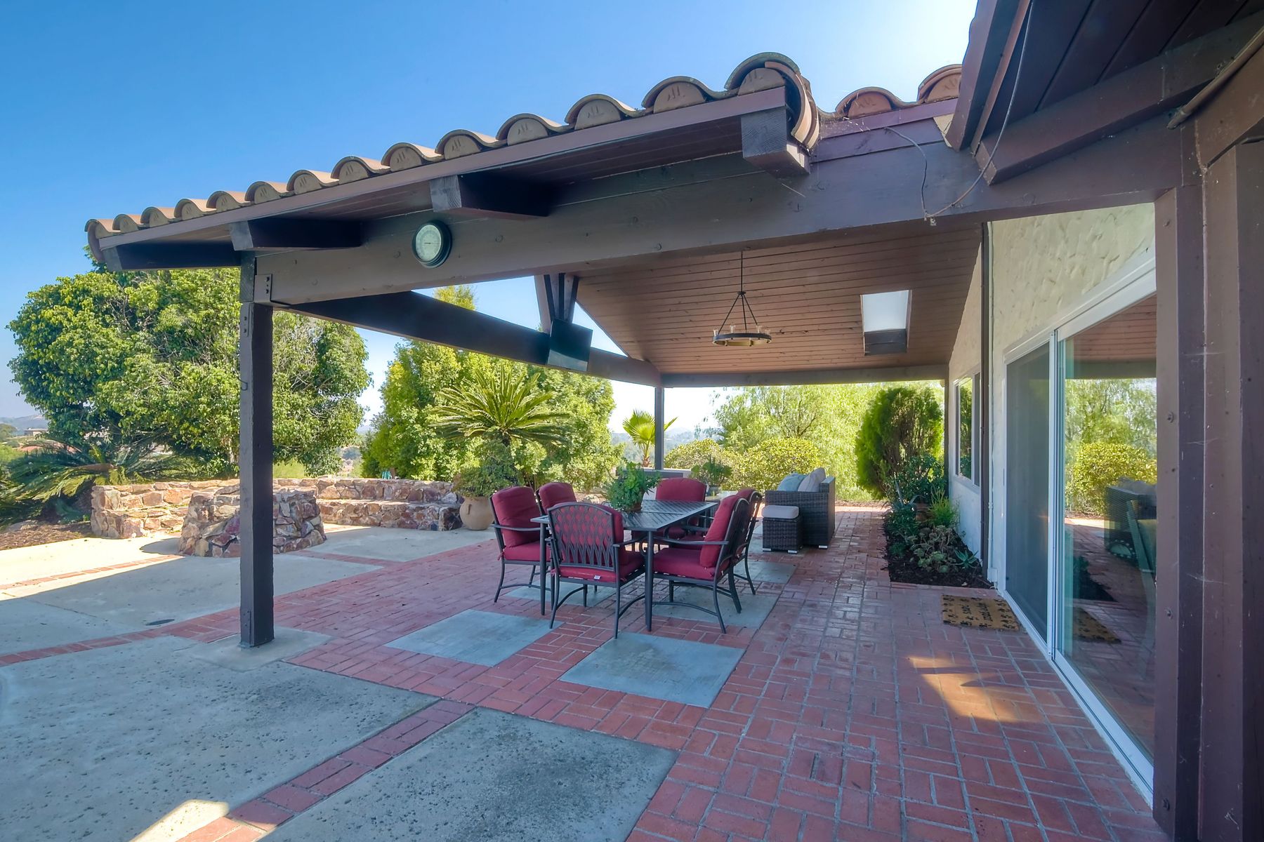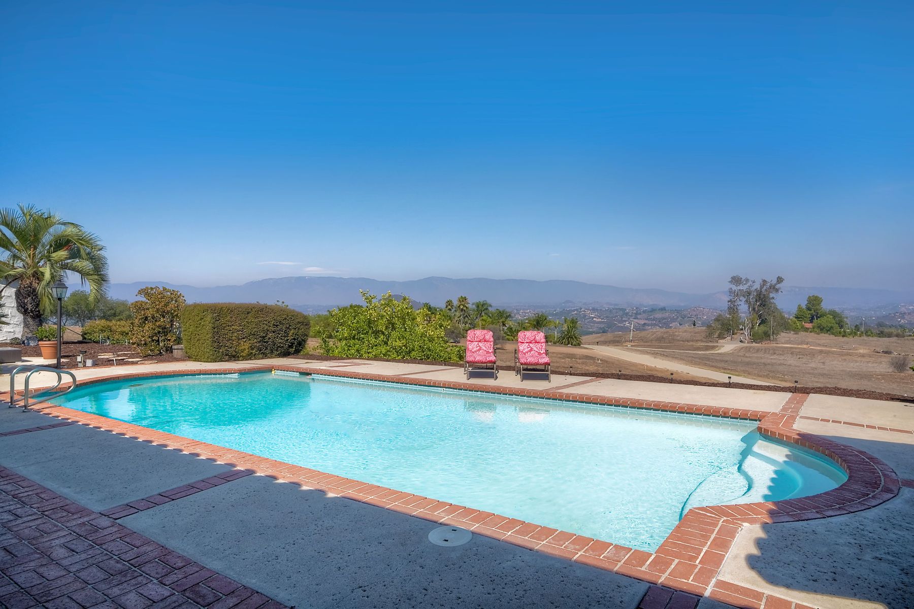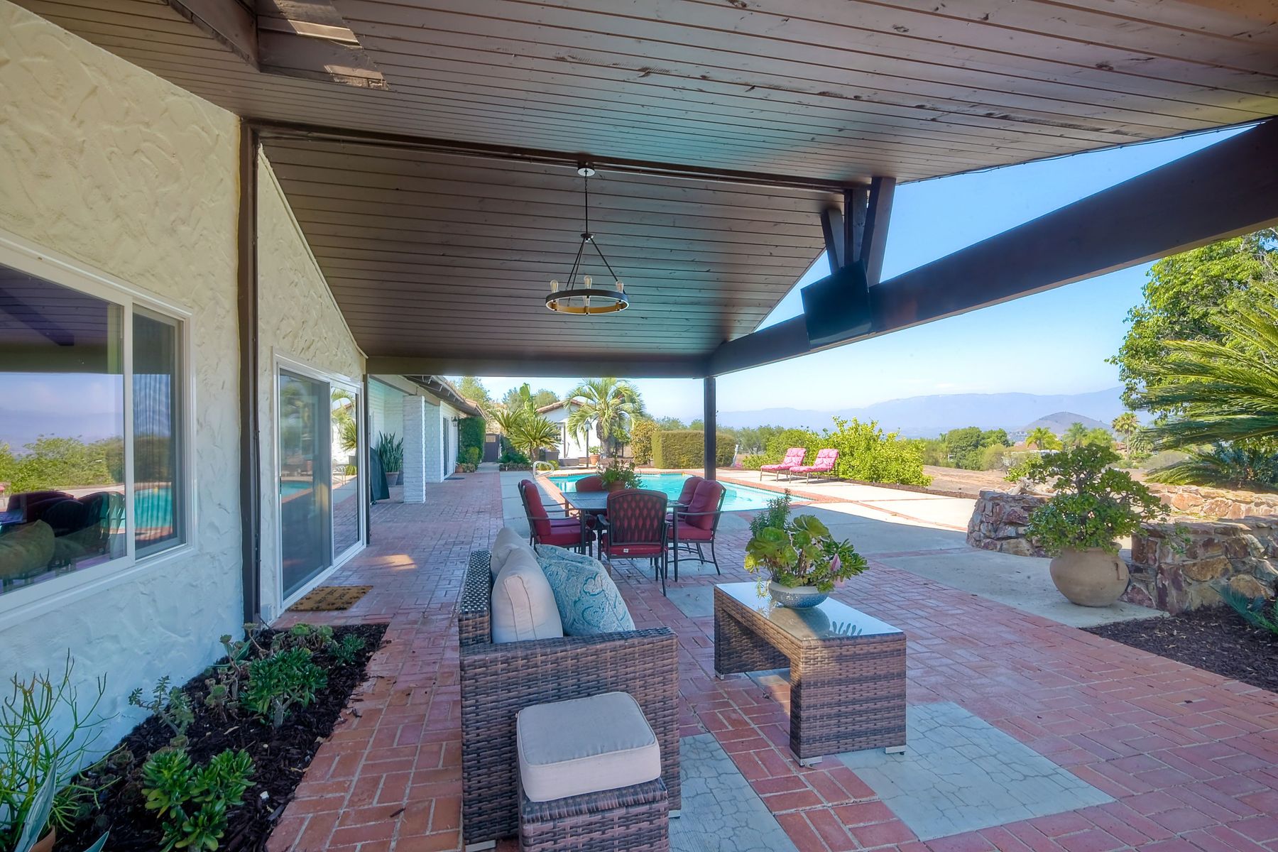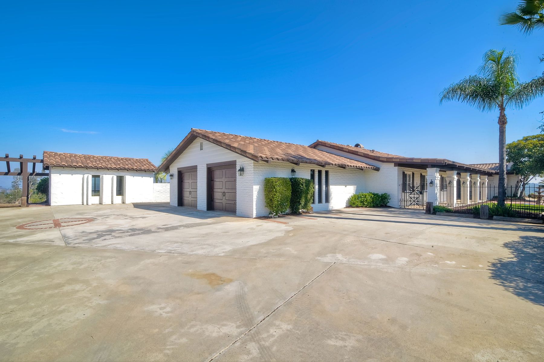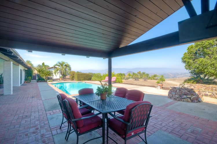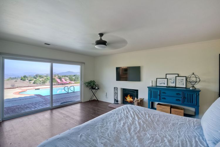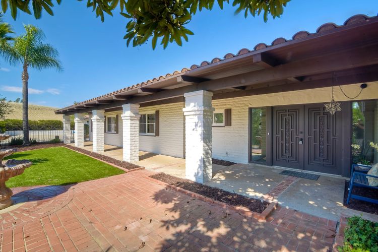 Driving up the private drive you realize you're about to experience something exceptional. This classic Hacienda style hilltop home in the coveted Hidden Meadows community of north Escondido has been beautifully renovated. The covered porch entry leads to decorative wood double doors and is surrounded by a brick courtyard, lovely fountain, artificial turf and low maintenance landscaping. The dramatic foyer is full of light, accented with a rich tile floor and leads to a custom wine room with glass doors. The adjacent living room has a dark beam vaulted ceiling, painted brick walls, a Spanish style fireplace and rich dark vinyl plank flooring which runs throughout the living space. See Supplement . . . Move into a cozy family room with beamed ceilings, multiple windows and casual dining area with back patio and kitchen access.The chef's kitchen is stunning with architectural features, stainless steel appliances, 6 burner gas stove, expansive white cabinets with quartz countertops, beautiful tile backsplash, dark wood island with seating for 4, pendant lighting and a large window open to the sparkling pool and wonderful view.The kitchen opens to the formal dining room with its dramatic beamed ceiling, elegant chandelier, inviting fireplace, built in wood cabinets and sliding glass door to the back patio creating a wonderful place to entertain. The main master suite is an oasis with calm colors, cozy carpet, an oversized fan and an expansive sliding glass door to the backyard. The attached bath is spacious and beautifully finished. A second master at the opposite end of the house is perfect for an in-law suite or guest room offering lots of space and beautiful finishes in the bathroom. An optional bedroom is being used as an office with dark barn doors being utilized as closet doors which compliment the dark wood plank floors and wood accents. Another guest room, full hall bath, and full size laundry room complete the flow of this wonderful floorplan. Separate from the house is a large casita with tile floors, 2 sliding glass doors and a cooling fan, perfect for an office, workout room, project room, whatever accommodates your lifestyle. The backyard is an entertainers dream with a covered porch that runs almost the entire length of the home. The brick patio extends to multiple conversation areas, surrounds the sparkling pool and includes a rock firepit with a rock bench for seating. Access to a full bath and the breathtaking views of the Palomar Mounting range are the perfect combination for everyday relaxation or easy entertaining. This home sits on over an acre of land and includes a covered dog run, paid solar and a 3 car garage.