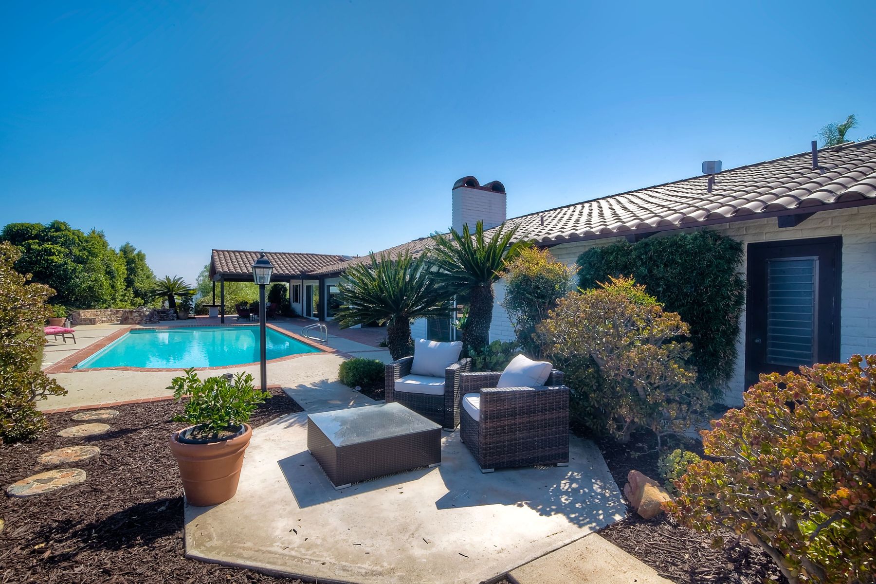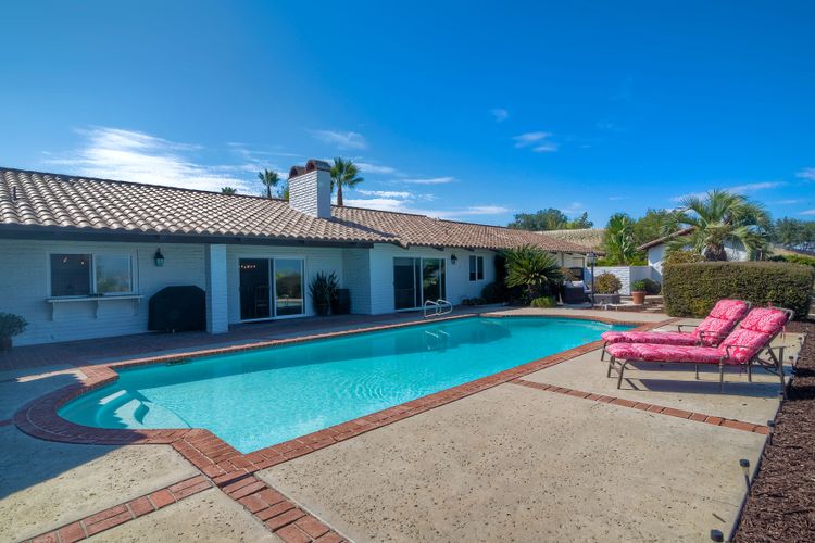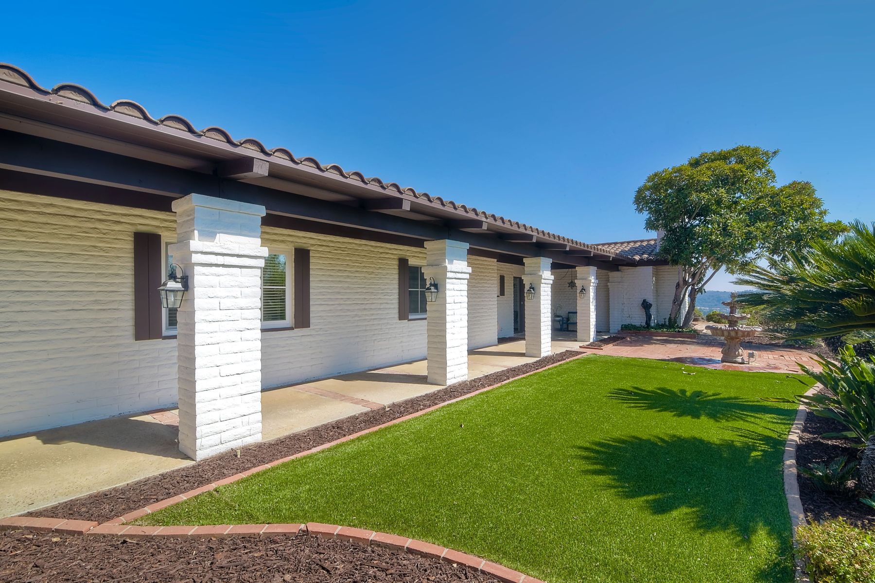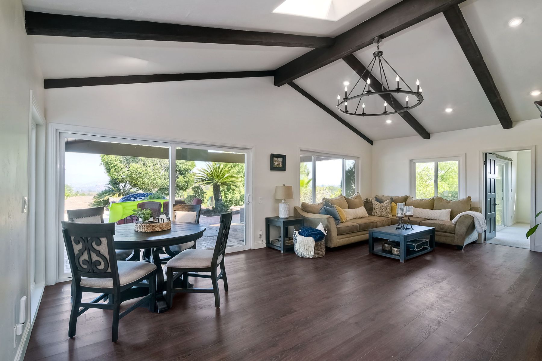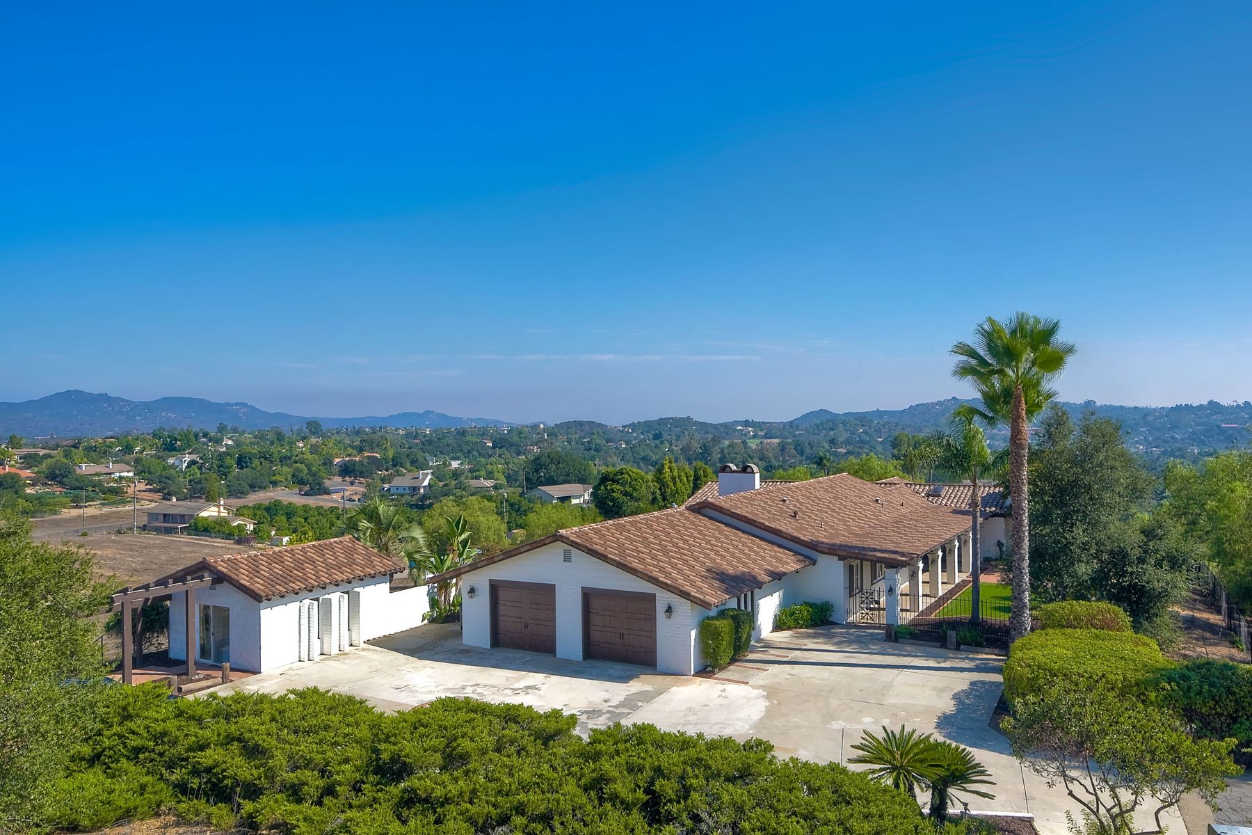 Driving up the private drive you realize you're about to experience something exceptional. This classic Hacienda style hilltop home in the coveted Hidden Meadows community of north Escondido has been beautifully renovated. The covered porch entry leads to decorative wood double doors and is surrounded by a brick courtyard, lovely fountain, artificial turf and low maintenance landscaping. The dramatic foyer is full of light, accented with a rich tile floor and leads to a custom wine room with glass doors. The adjacent living room has a dark beam vaulted ceiling, painted brick walls, a Spanish style fireplace and rich dark vinyl plank flooring which runs throughout the living space. See Supplement . . . Move into a cozy family room with beamed ceilings, multiple windows and casual dining area with back patio and kitchen access.The chef's kitchen is stunning with architectural features, stainless steel appliances, 6 burner gas stove, expansive white cabinets with quartz countertops, beautiful tile backsplash, dark wood island with seating for 4, pendant lighting and a large window open to the sparkling pool and wonderful view.The kitchen opens to the formal dining room with its dramatic beamed ceiling, elegant chandelier, inviting fireplace, built in wood cabinets and sliding glass door to the back patio creating a wonderful place to entertain. The main master suite is an oasis with calm colors, cozy carpet, an oversized fan and an expansive sliding glass door to the backyard. The attached bath is spacious and beautifully finished. A second master at the opposite end of the house is perfect for an in-law suite or guest room offering lots of space and beautiful finishes in the bathroom. An optional bedroom is being used as an office with dark barn doors being utilized as closet doors which compliment the dark wood plank floors and wood accents. Another guest room, full hall bath, and full size laundry room complete the flow of this wonderful floorplan. Separate from the house is a large casita with tile floors, 2 sliding glass doors and a cooling fan, perfect for an office, workout room, project room, whatever accommodates your lifestyle. The backyard is an entertainers dream with a covered porch that runs almost the entire length of the home. The brick patio extends to multiple conversation areas, surrounds the sparkling pool and includes a rock firepit with a rock bench for seating. Access to a full bath and the breathtaking views of the Palomar Mounting range are the perfect combination for everyday relaxation or easy entertaining. This home sits on over an acre of land and includes a covered dog run, paid solar and a 3 car garage.