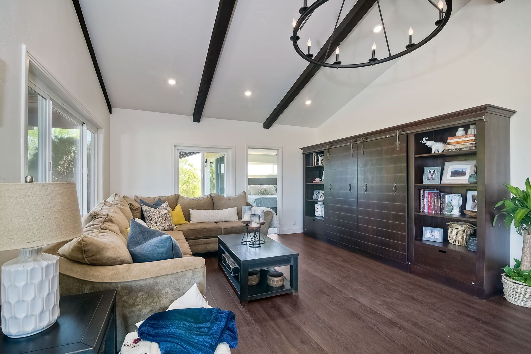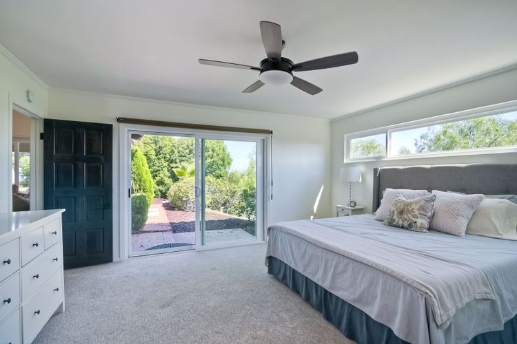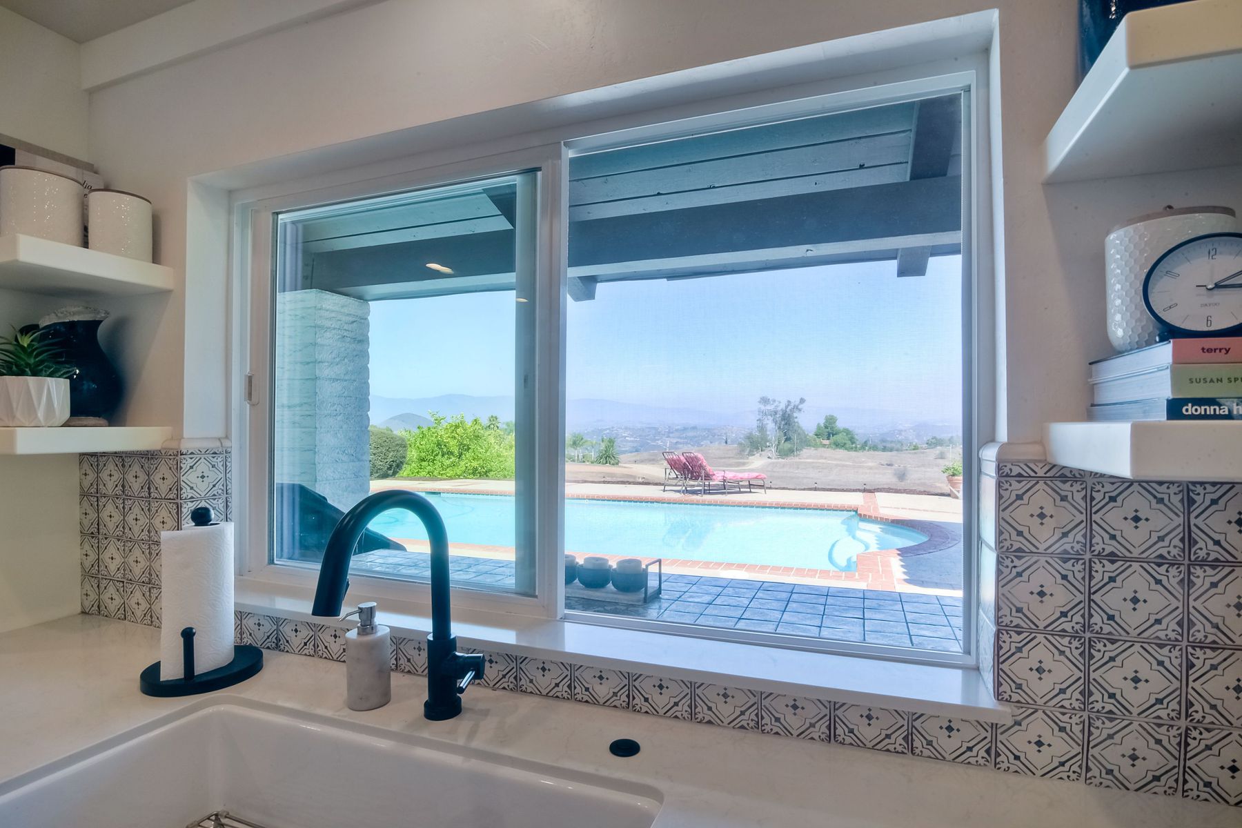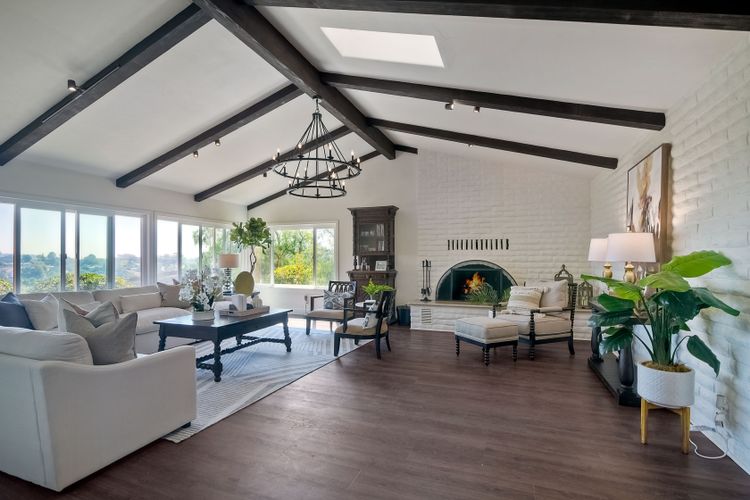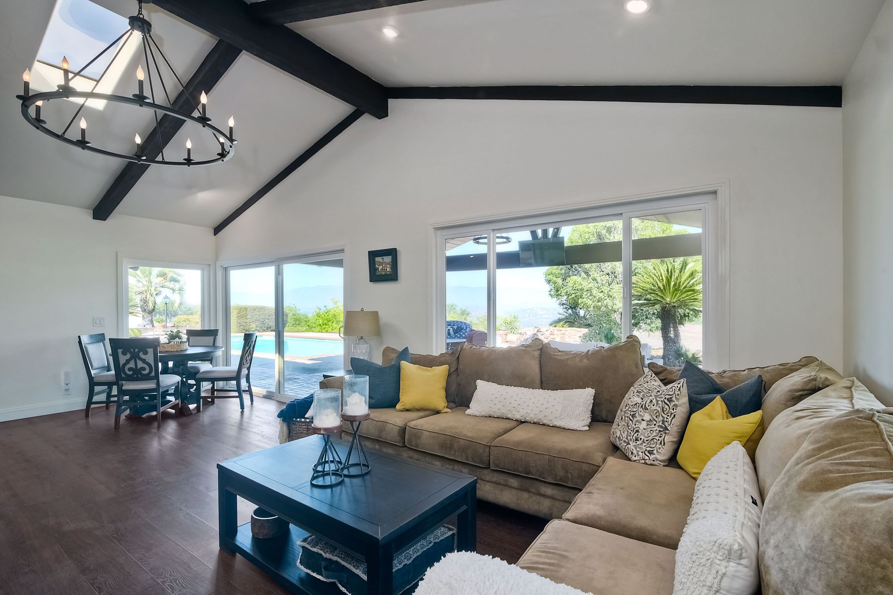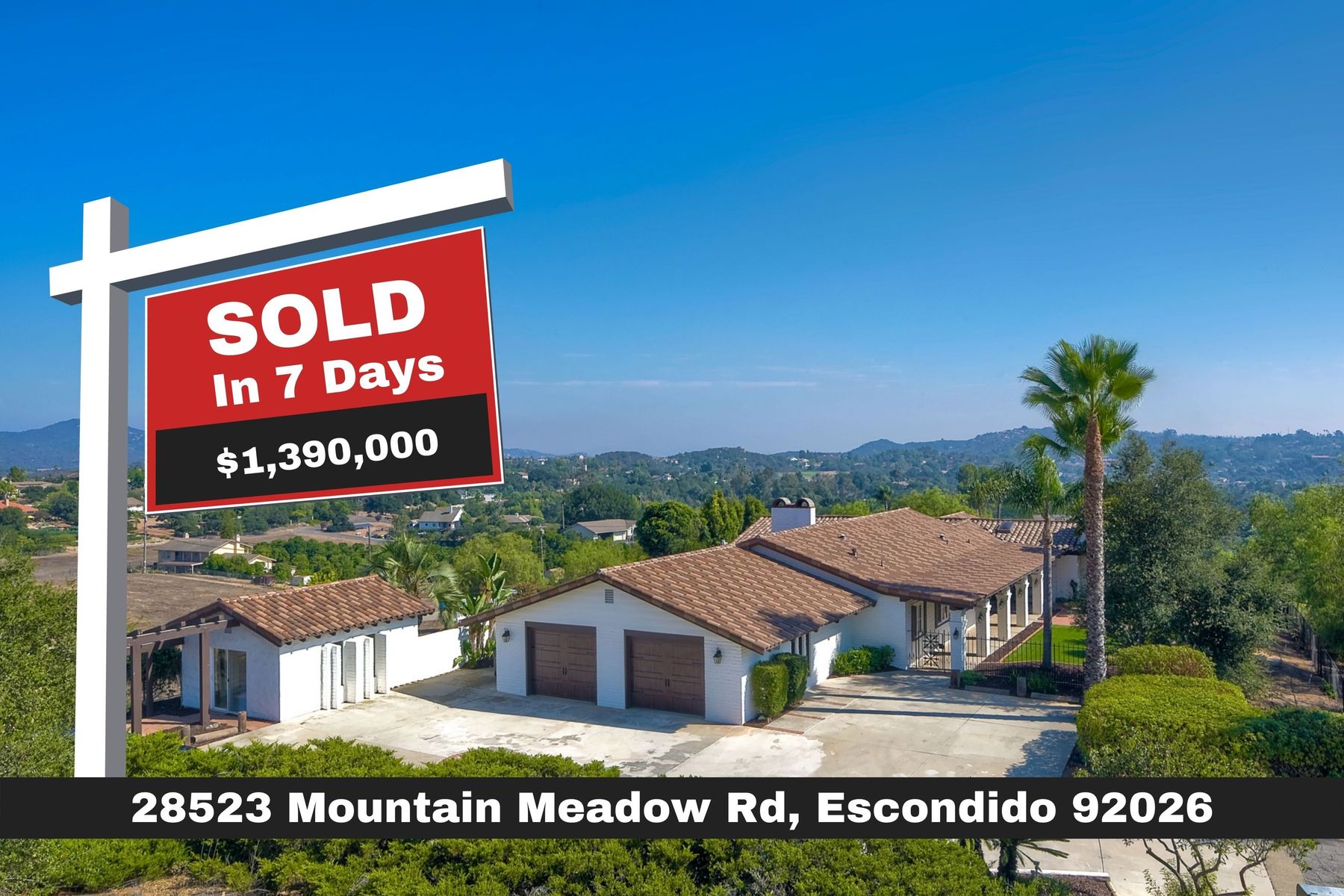 Driving up the private drive you realize you're about to experience something exceptional. This classic Hacienda style hilltop home in the coveted Hidden Meadows community of north Escondido has been beautifully renovated. The covered porch entry leads to decorative wood double doors and is surrounded by a brick courtyard, lovely fountain, artificial turf and low maintenance landscaping. The dramatic foyer is full of light, accented with a rich tile floor and leads to a custom wine room with glass doors. The adjacent living room has a dark beam vaulted ceiling, painted brick walls, a Spanish style fireplace and rich dark vinyl plank flooring which runs throughout the living space. See Supplement . . . Move into a cozy family room with beamed ceilings, multiple windows and casual dining area with back patio and kitchen access.The chef's kitchen is stunning with architectural features, stainless steel appliances, 6 burner gas stove, expansive white cabinets with quartz countertops, beautiful tile backsplash, dark wood island with seating for 4, pendant lighting and a large window open to the sparkling pool and wonderful view.The kitchen opens to the formal dining room with its dramatic beamed ceiling, elegant chandelier, inviting fireplace, built in wood cabinets and sliding glass door to the back patio creating a wonderful place to entertain. The main master suite is an oasis with calm colors, cozy carpet, an oversized fan and an expansive sliding glass door to the backyard. The attached bath is spacious and beautifully finished. A second master at the opposite end of the house is perfect for an in-law suite or guest room offering lots of space and beautiful finishes in the bathroom. An optional bedroom is being used as an office with dark barn doors being utilized as closet doors which compliment the dark wood plank floors and wood accents. Another guest room, full hall bath, and full size laundry room complete the flow of this wonderful floorplan. Separate from the house is a large casita with tile floors, 2 sliding glass doors and a cooling fan, perfect for an office, workout room, project room, whatever accommodates your lifestyle. The backyard is an entertainers dream with a covered porch that runs almost the entire length of the home. The brick patio extends to multiple conversation areas, surrounds the sparkling pool and includes a rock firepit with a rock bench for seating. Access to a full bath and the breathtaking views of the Palomar Mounting range are the perfect combination for everyday relaxation or easy entertaining. This home sits on over an acre of land and includes a covered dog run, paid solar and a 3 car garage.
