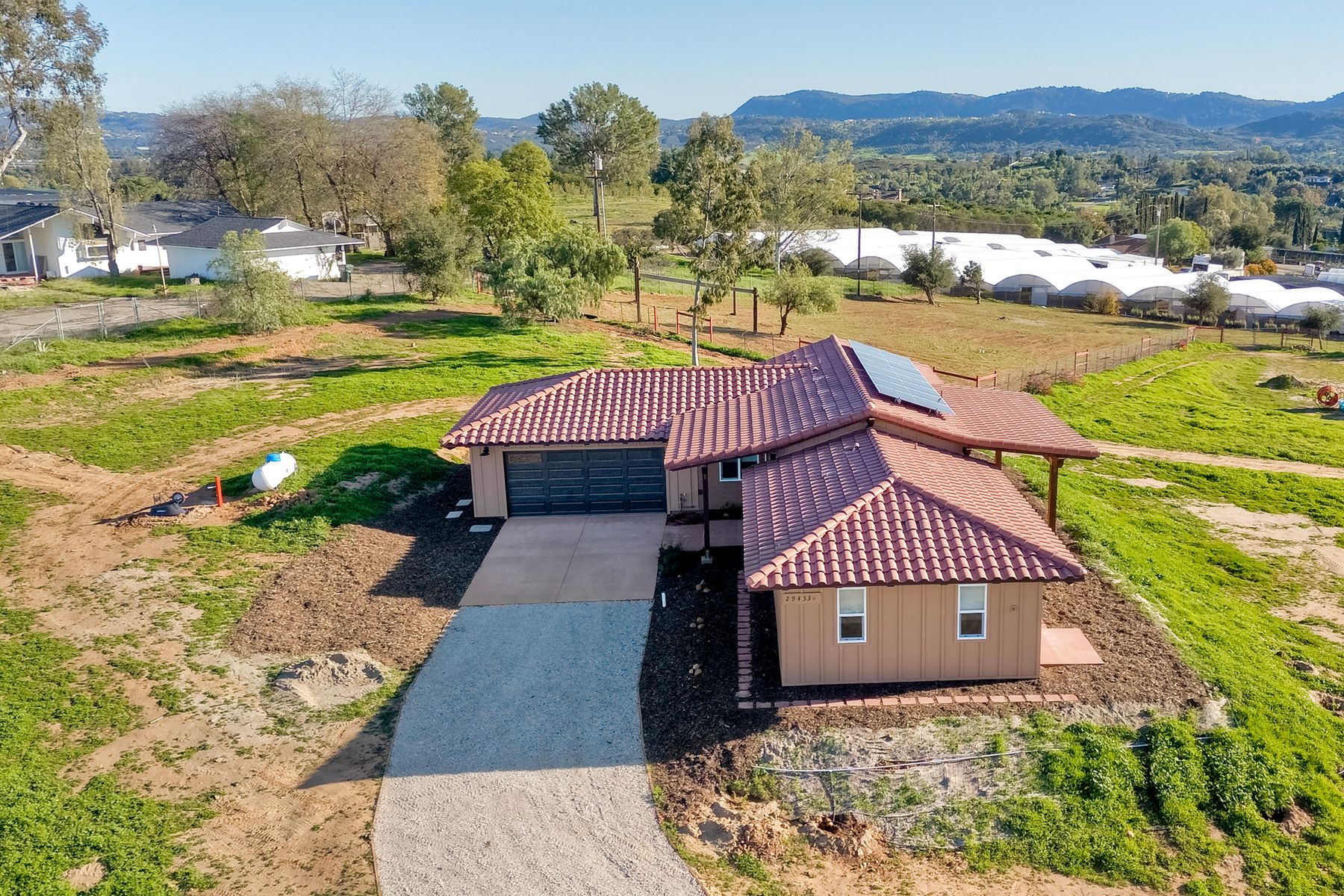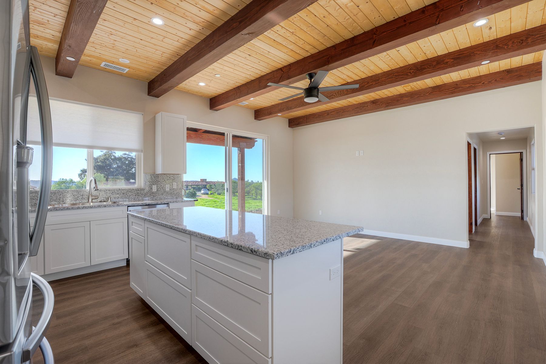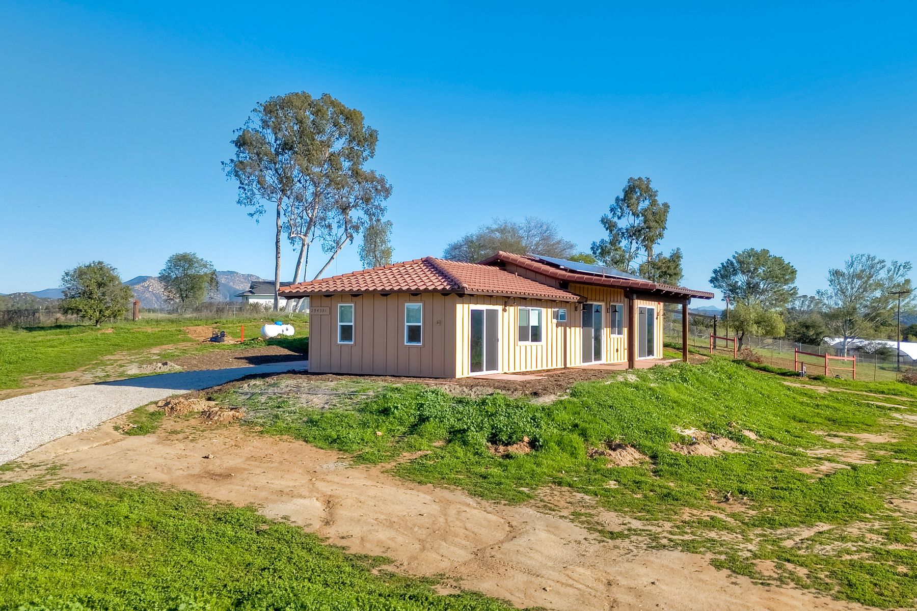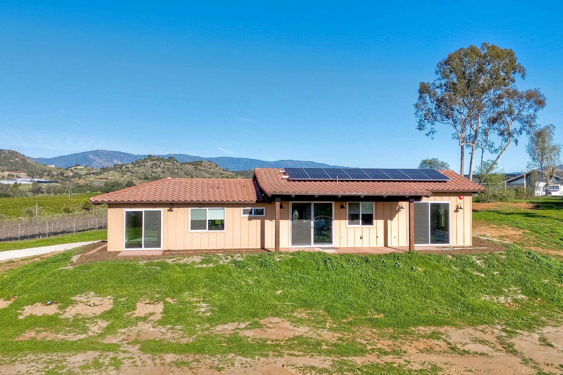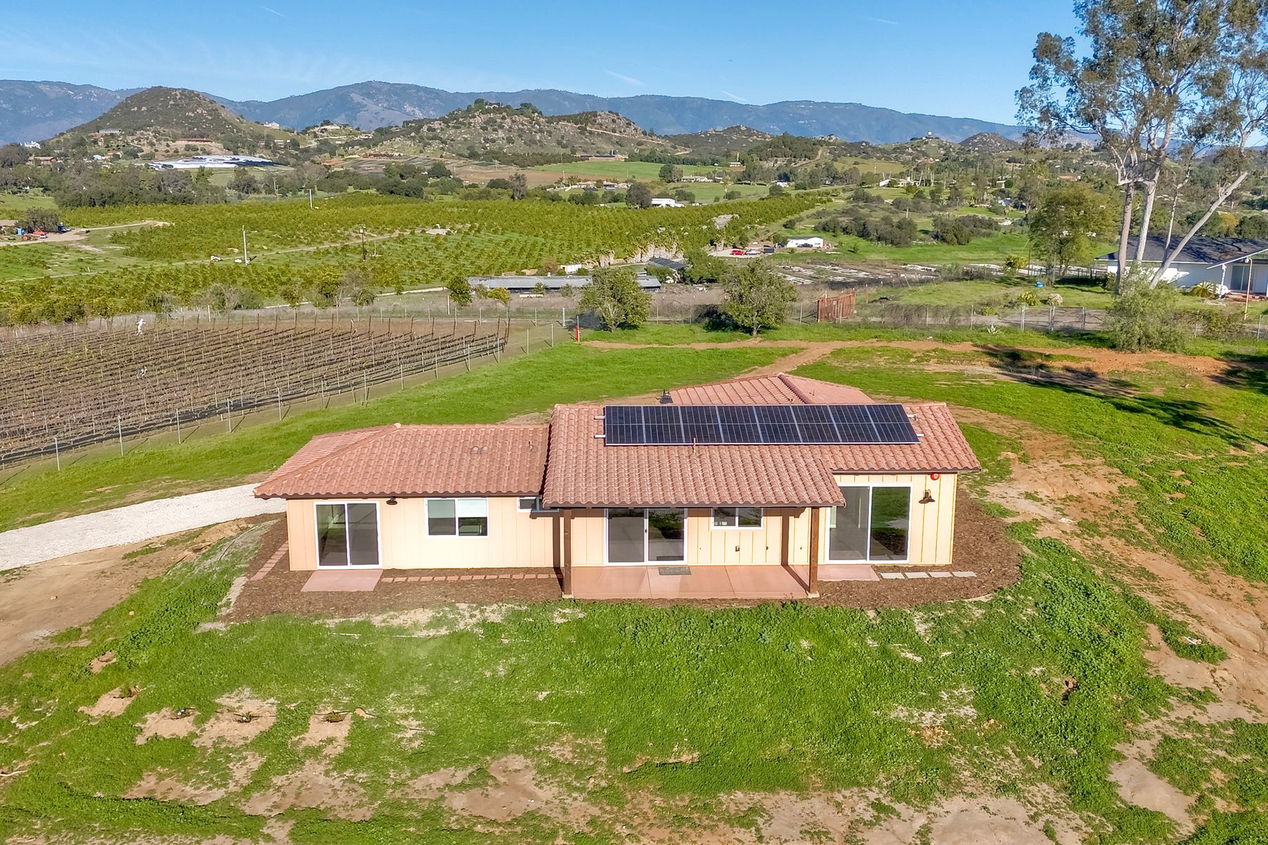 Newly constructed Luxury ADU for Lease Modern 3 Bedroom, 2 Bath with 2-Car Garage on Private 7-Acre Estate. Be the first to live in this stunning single-story ADU on a picturesque 7-acre gated property in Valley Center. This thoughtfully designed home combines modern luxury with peaceful country living and breathtaking mountain views. Inside, the bright open-concept living area features vaulted wood-beam ceilings and abundant natural light. The chef's kitchen boasts elegant white cabinetry, soft-close drawers, and stainless steel appliances, including a refrigerator with filtered water, gas stove, microwave, and dishwasher. The spacious primary suite includes sliding glass doors to a private patio with panoramic views. Its elegant ensuite bathroom offers dual vanities, a soaking tub/shower combo, and a large walk-in closet. Two additional bedrooms are positioned on the opposite side for privacy one has sliding doors to a patio. Additional highlights include an attached finished two-car garage with washer/dryer hookups, ample parking space for an RV or recreational vehicles, and plenty of room for pets, a garden, or even small livestock. Whether you're looking for open space to breathe, room for your hobbies, or simply a serene retreat surrounded by nature this property is a rare find.