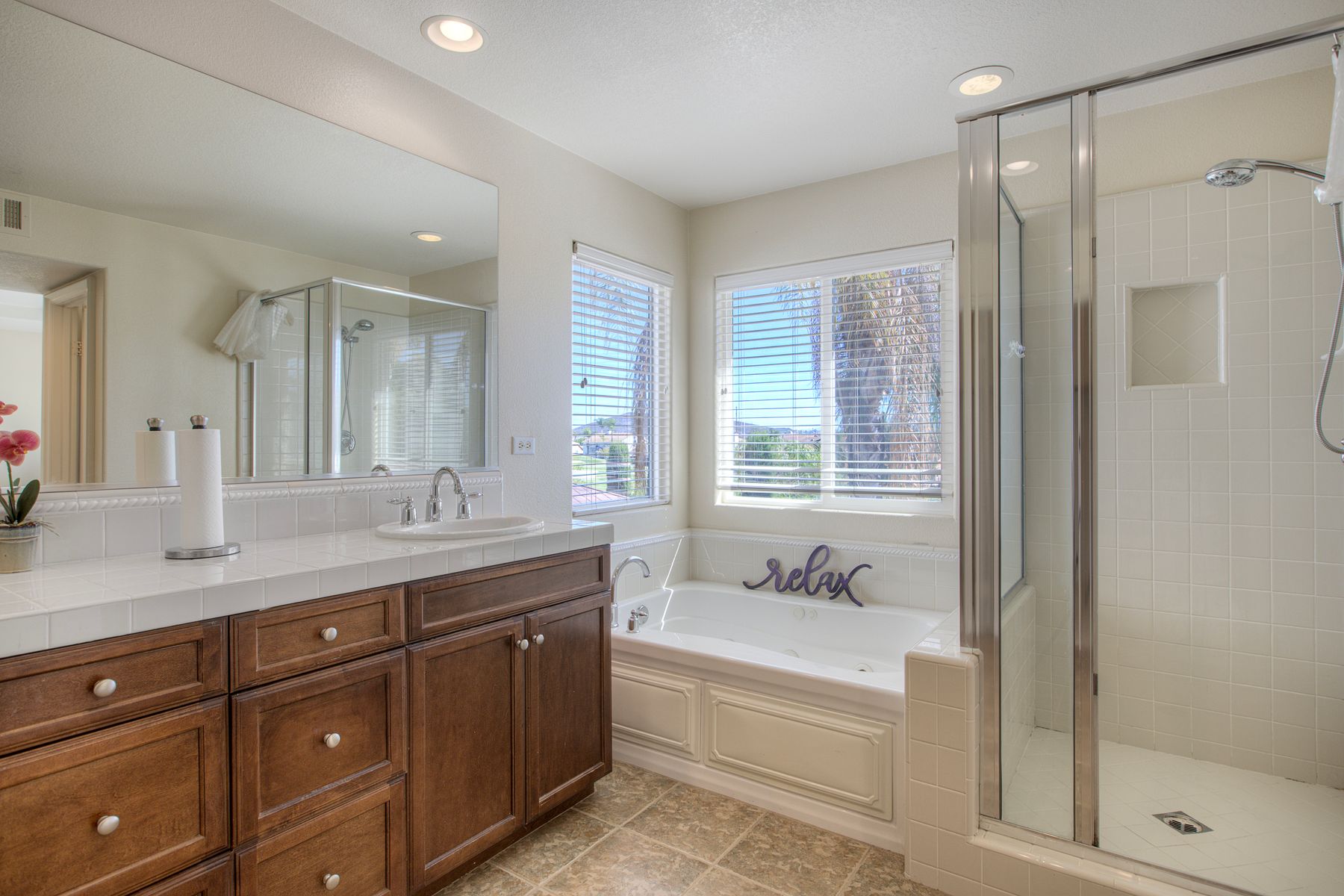Bathtub, Shower, Shower in Tub, Corian Counters, Double Sinks in Primary Bath, Separate tub and shower, Tile Counters, Walk-in shower