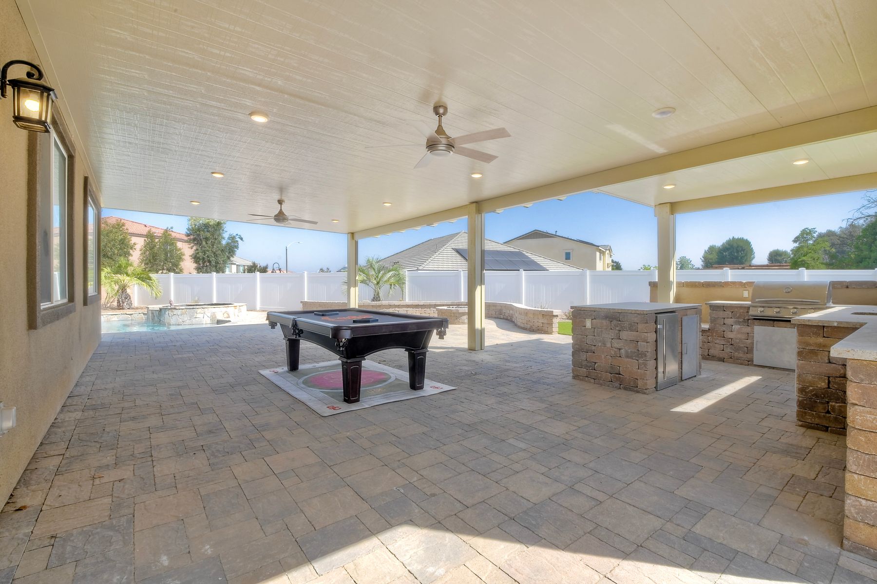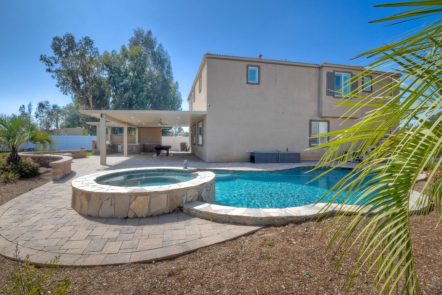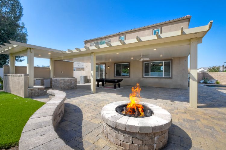 Beautifully Upgraded & Maintained Cul-de-Sac Home in Meadow Run with Private Pool & Solar! Welcome to this stunning 5-bedroom, 3-bathroom home located at the end of a quiet cul-de-sac in the highly sought-after Meadow Run community of Menifee. With approximately 2,872 sq ft of beautifully designed living space, this home offers style, functionality, and unmatched outdoor living—all in a prime location just blocks from award-winning Paloma High School and steps from the neighborhood park. Popular floorplan offers open-concept great room, where upgraded luxury vinyl plank flooring flows seamlessly throughout the main living areas. The heart of the home is the chef’s kitchen, featuring a massive center island, sleek quartz countertops, abundant cabinetry, pantry, and stainless steel appliances—a dream space for cooking, entertaining, or enjoying family dinners. The first floor includes a full bedroom and bathroom, ideal for guests or multi-generational living. See Supplement=> Upstairs, you'll find a spacious family room, full laundry room, and private primary suite boasting a large walk-in closet and a luxurious en suite bath with modern finishes and ample space to unwind. Designed for California living, the oversized backyard is an entertainer’s paradise—complete with a built-in outdoor kitchen, pergola with pool table, and a private pool and spa for endless summer fun. Enjoy the turf area, low-maintenance landscaping, and serene setting—all perfect for relaxing or hosting friends and family. Additional features include owned solar for energy efficiency, recessed lighting throughout, and a 2-car attached garage + driveway.