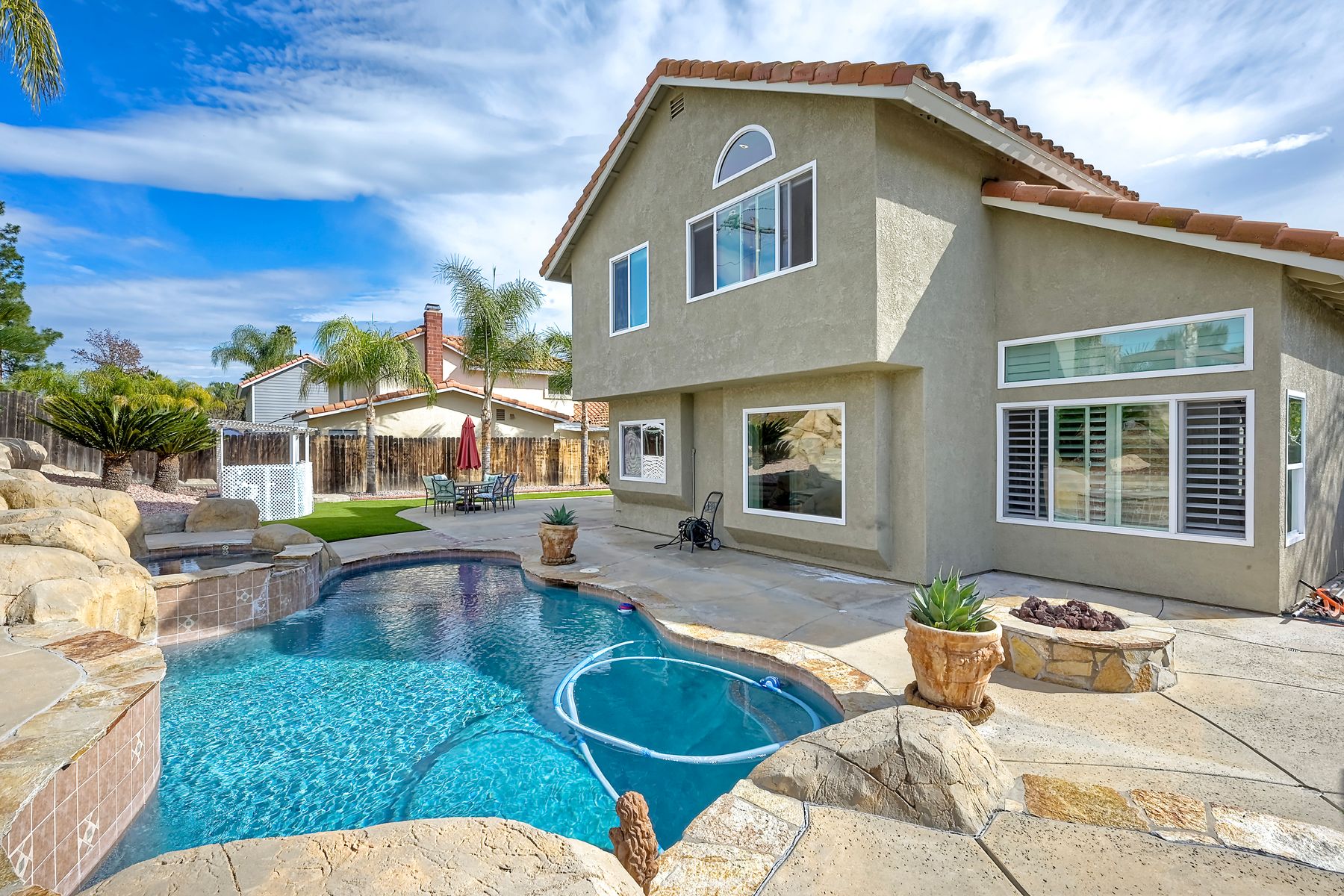 The perfect Valentine weekend present awaits you! Spectacular home with NO Mello Roos and NO HOA ~ on a well-manicured quarter acre corner lot, complete with Pebbletec saltwater pool, spa and soothing waterfall. This IS the entertaining home you’ve been seeking and homeowners made multiple “smart” improvements over the course of their ownership! 26 OWNED solar panels (2021), new roof AND underlayment (2021), newer dual paned Amco windows (2018), new furnace and AC (2023). Chimney and fireplace have just been revitalized and cleaned ($8,000). Pool and spa READY for you to enjoy: Heater replaced in 2020, primary pool pump & water filter & wireless automation installed 2022, water feature pump replaced Dec 2025, Salt cell replaced 2024, Salt cell motherboard replaced 2026. Pride of ownership abounds in this four BR PLUS BONUS room home, of which entry level BR and full bath are perfect for guests and/or an office. The “bonus” room could be converted back to a bedroom, but WHY? A great media room, exercise room, children’s play & study room ~ countless options. Interior just repainted in calm neutral tones. This serene location puts you onto the I-15 in less than 15 minutes, close to a plethora of restaurants and shopping options, not to mention countless opportunities to explore the vineyards of Temecula.