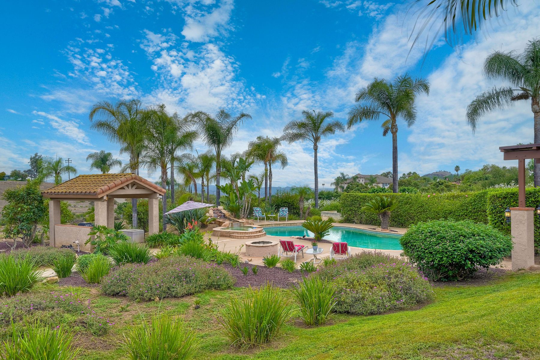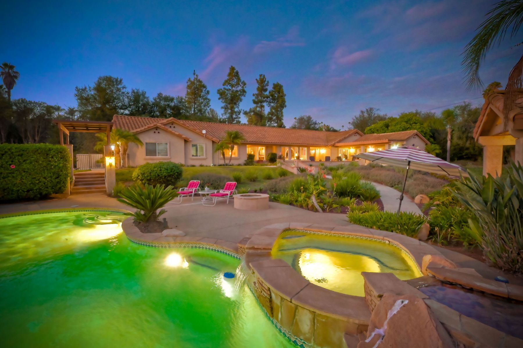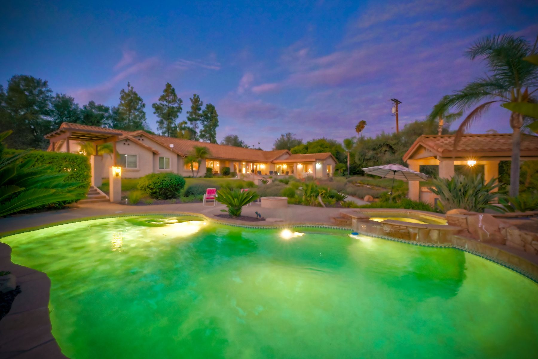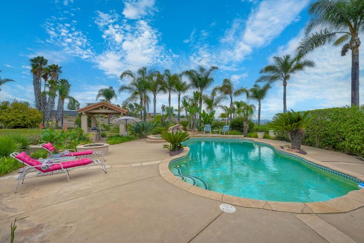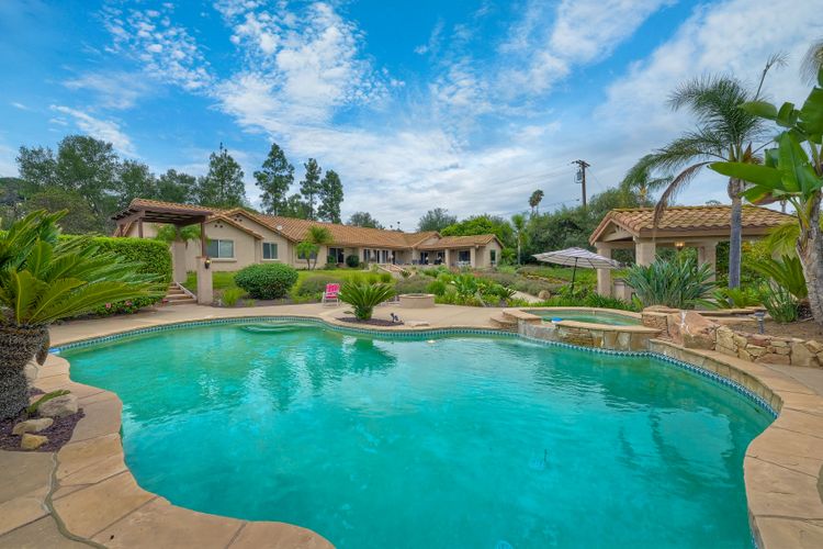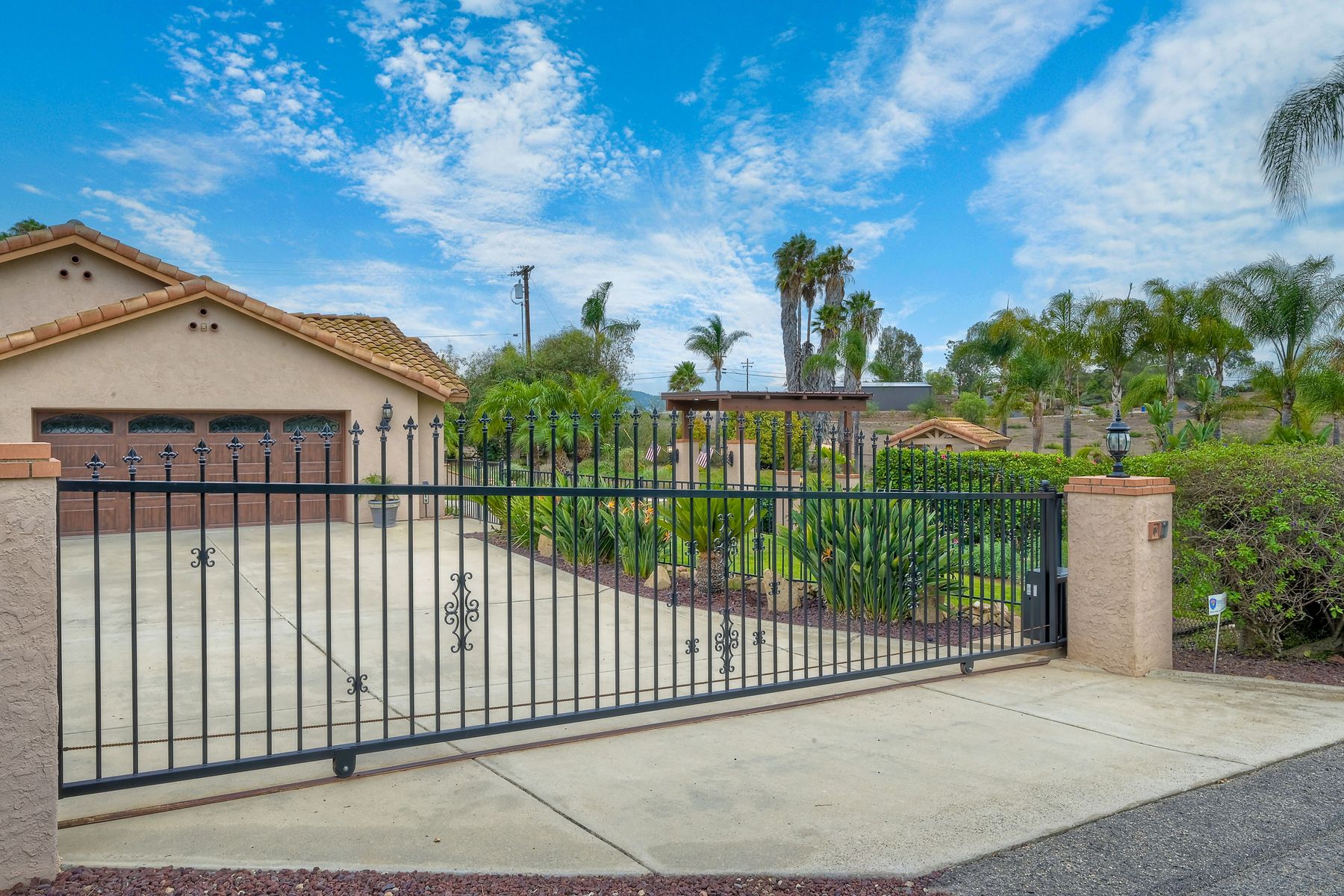 Amazing 3300 SqFt single story home tucked away behind private gates – this resort like oasis on 1.5 level acres awaits you! Close to all that the charming Fallbrook community offers yet less than 10 minutes from I-15/I-76 access (although as quiet as a sanctuary). TWO Master bedroom suites (perfect for multi-generational living) w/ two additional generously sized bedrooms ~ four full bathrooms. Renovated kitchen opens to spacious family room with elegant fireplace. Living room & dining room overlook luxuriously landscaped front yard, pool & spa area. Additional renovations include plank style tile flooring in all main living areas and BR’s, stainless steel appliances, dual pane windows & doors throughout, new garage doors and newer AC units (yes – the primary Master has its own HVAC and tankless water heater). With CA living in mind – this estate offers a plethora of outdoor living! Sliding glass doors off both Master suites and the family room invite you to dine al dente, sip coffee while enjoying your views and entertain to your hearts delight. Abundant fruit producing trees include: avocado, macadamia nut, orange, lemon, fig, nectarine, peach, apricot and apple. Veggie garden: tomatoes, eggplant, zucchini, chilies and cukes!! This home and all that it has to offer – beyond delightful!