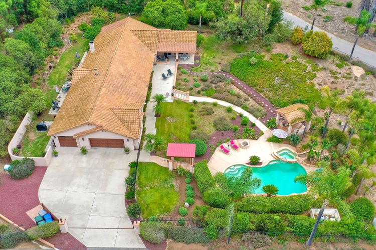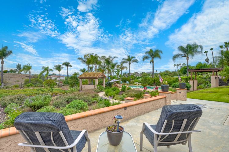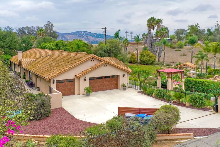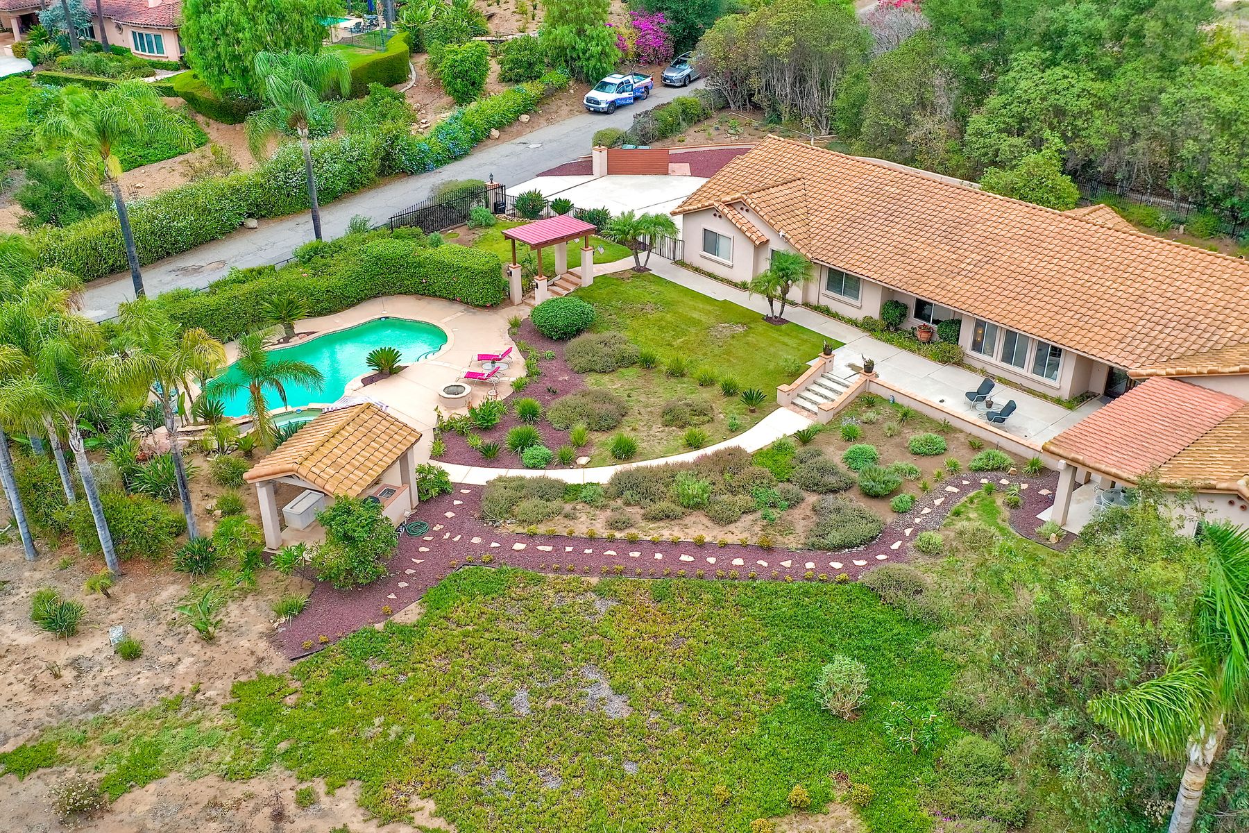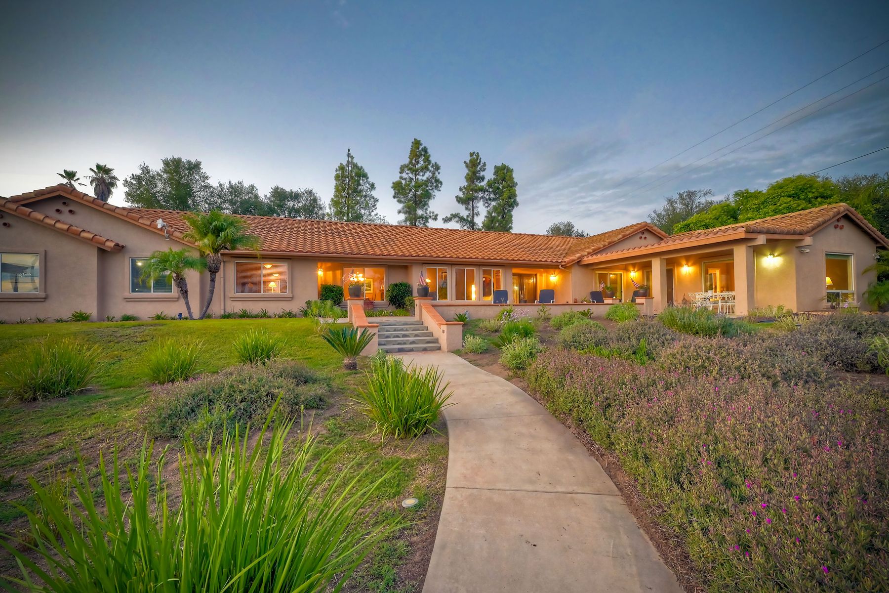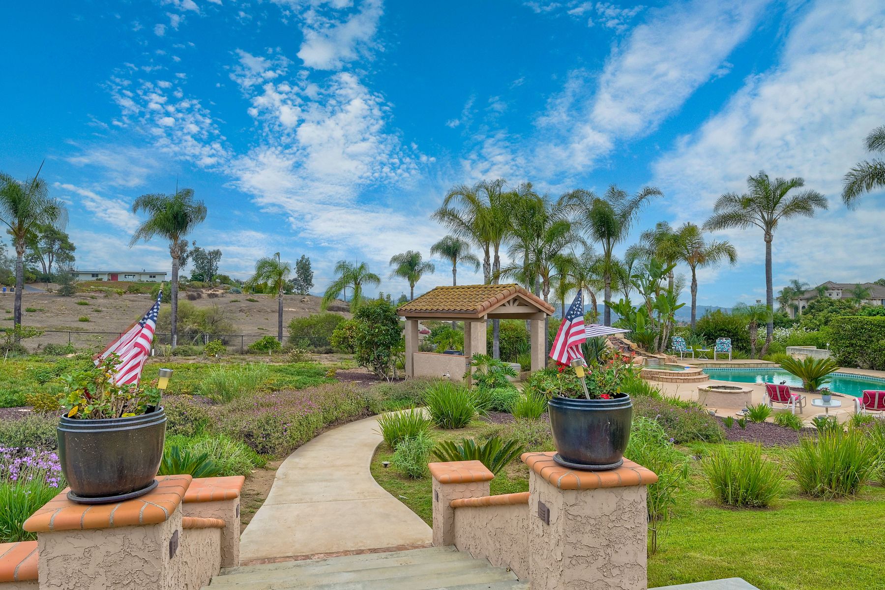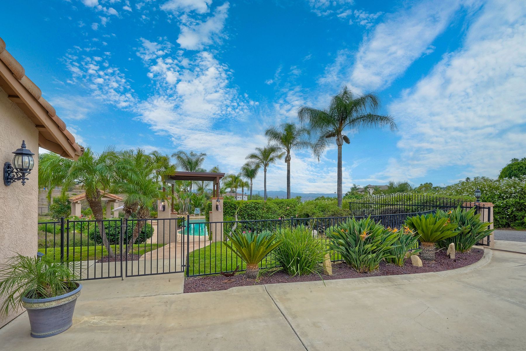 Amazing 3300 SqFt single story home tucked away behind private gates – this resort like oasis on 1.5 level acres awaits you! Close to all that the charming Fallbrook community offers yet less than 10 minutes from I-15/I-76 access (although as quiet as a sanctuary). TWO Master bedroom suites (perfect for multi-generational living) w/ two additional generously sized bedrooms ~ four full bathrooms. Renovated kitchen opens to spacious family room with elegant fireplace. Living room & dining room overlook luxuriously landscaped front yard, pool & spa area. Additional renovations include plank style tile flooring in all main living areas and BR’s, stainless steel appliances, dual pane windows & doors throughout, new garage doors and newer AC units (yes – the primary Master has its own HVAC and tankless water heater). With CA living in mind – this estate offers a plethora of outdoor living! Sliding glass doors off both Master suites and the family room invite you to dine al dente, sip coffee while enjoying your views and entertain to your hearts delight. Abundant fruit producing trees include: avocado, macadamia nut, orange, lemon, fig, nectarine, peach, apricot and apple. Veggie garden: tomatoes, eggplant, zucchini, chilies and cukes!! This home and all that it has to offer – beyond delightful!