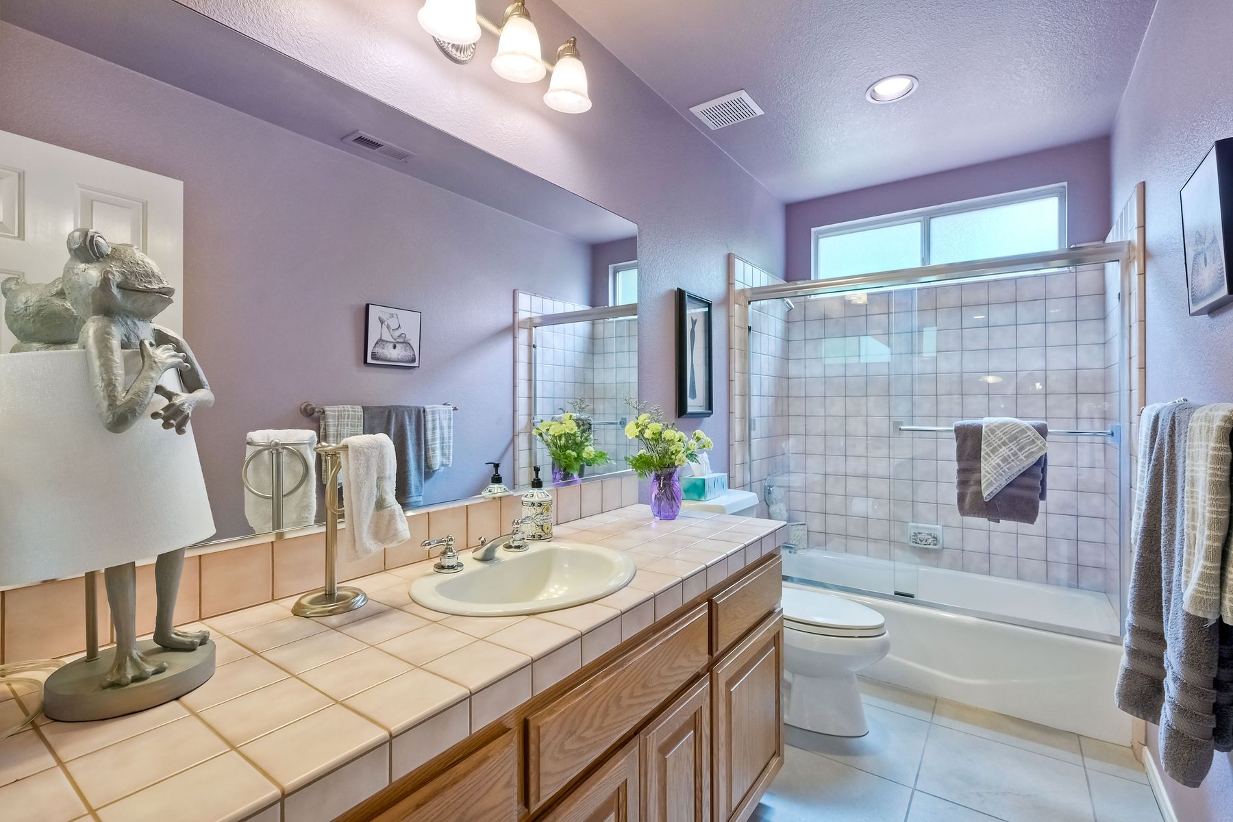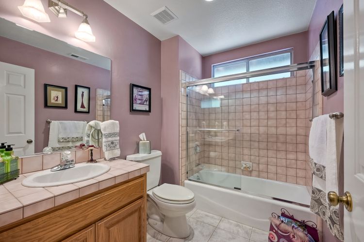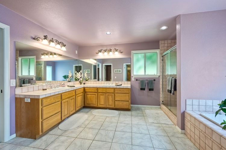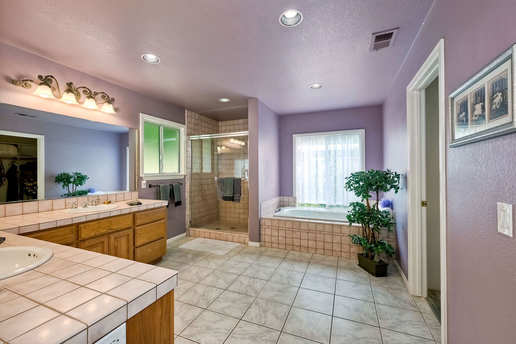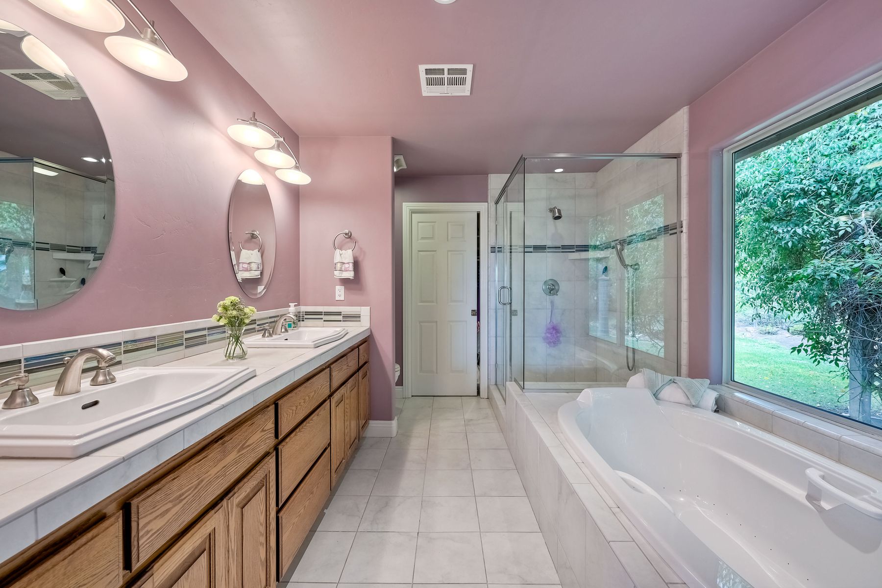 Double sinks in bath(s), Double Sinks In Master Bath, Exhaust fan(s), Privacy toilet door, Separate tub and shower, Soaking Tub, Tile Counters, Shower, Bathtub