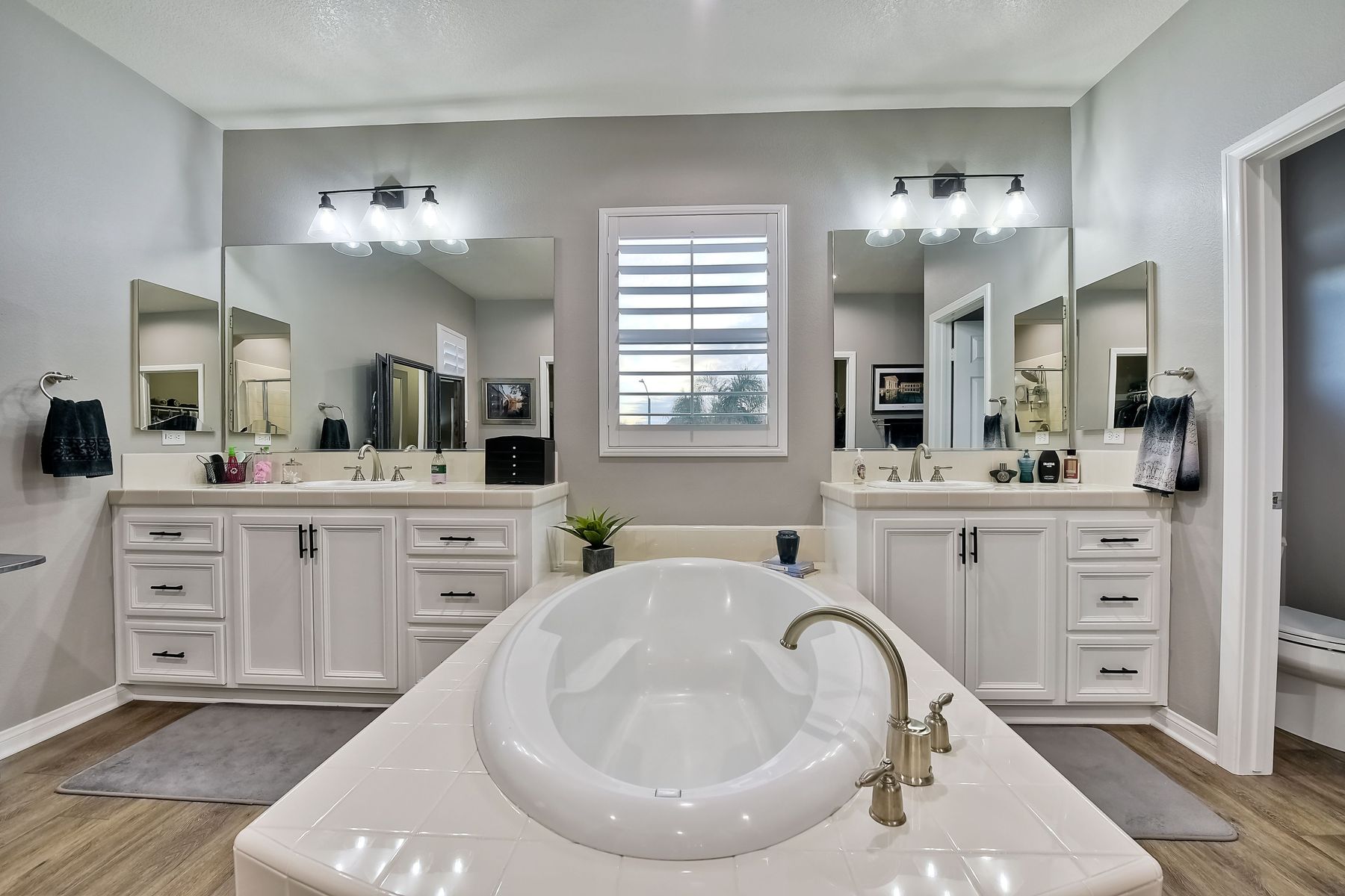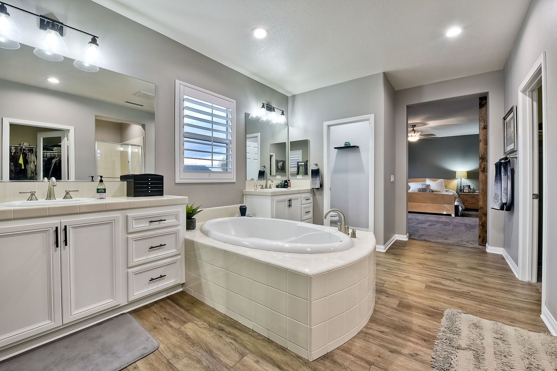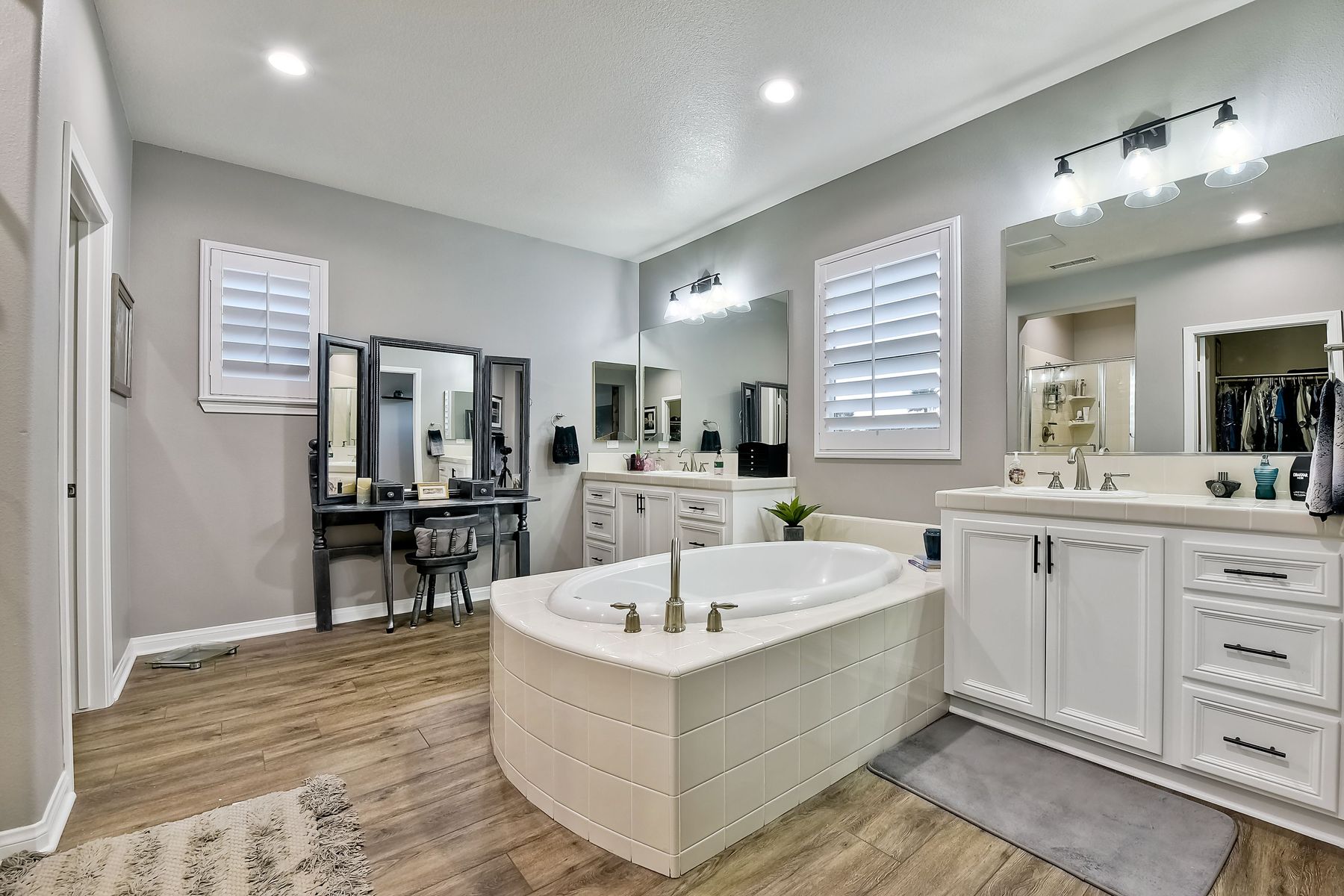 Bathtub, Shower in Tub, Closet in bathroom, Double sinks in bath(s), Double Sinks In Master Bath, Exhaust fan(s), Soaking Tub, Walk-in shower