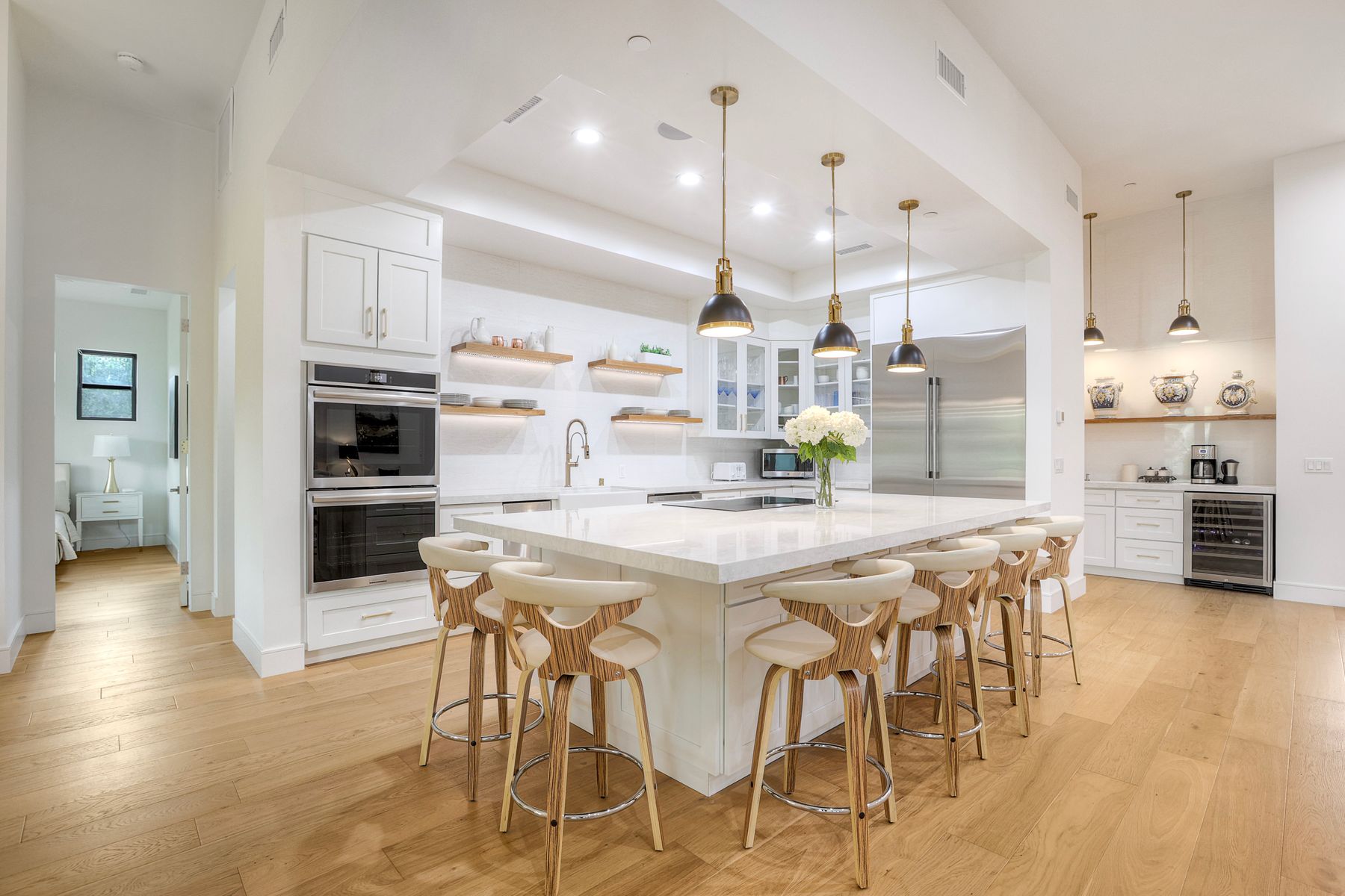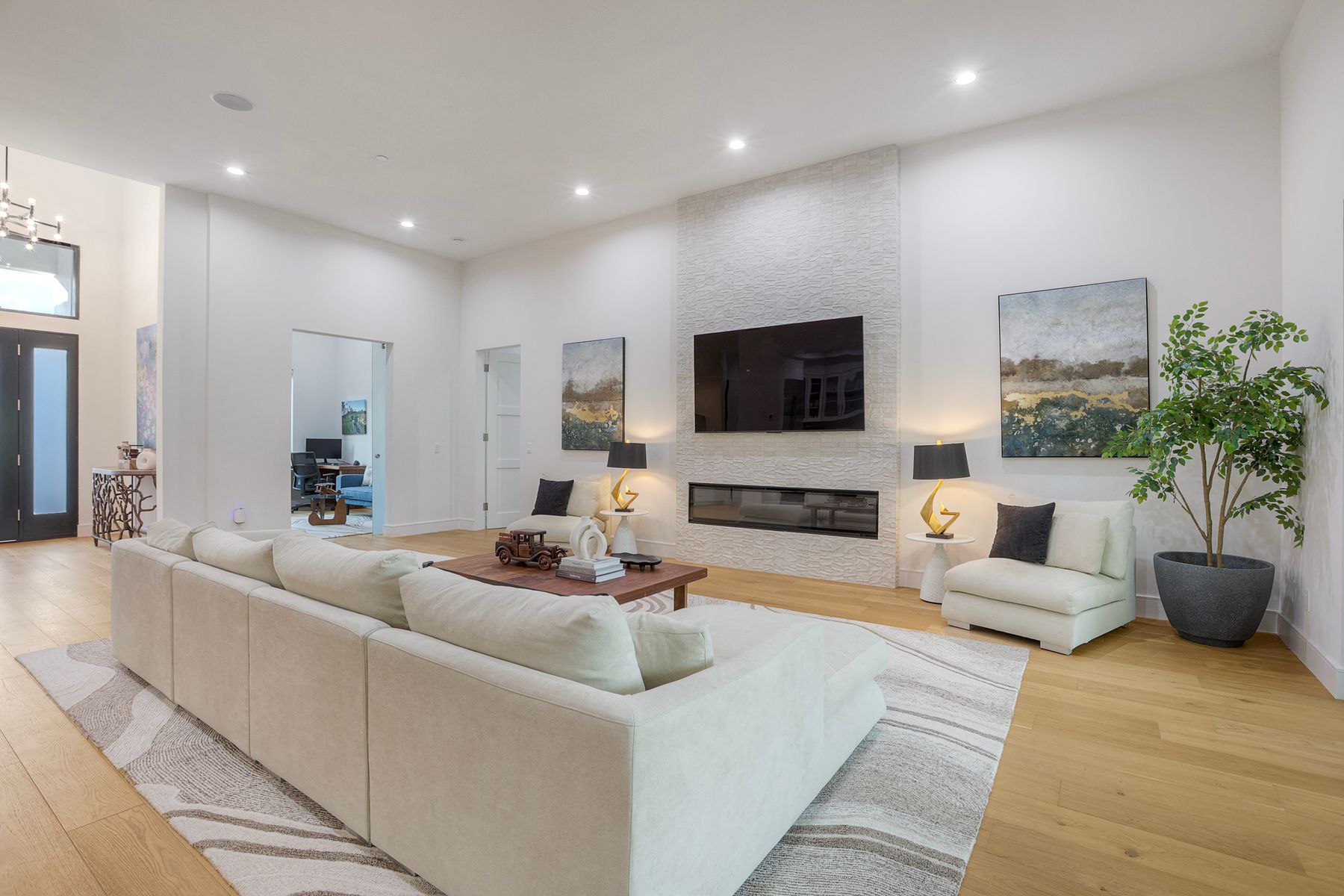 Step inside to discover elegant oak plank flooring throughout and a thoughtfully designed interior. The expansive master wing features a generously sized bedroom with golf course views, a luxurious bathroom, and a huge walk-in closet, all offering a private oasis on one side of the home. The state-of-the-art kitchen boasts a walk-in-pantry and opens up to a bright, airy living area complemented by designer finishes. There's also a private office and an oversized garage among the many thoughtful features.