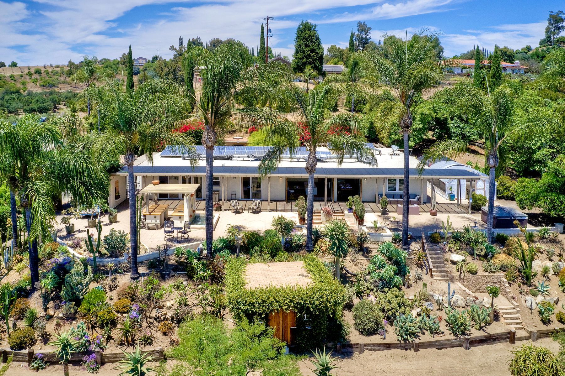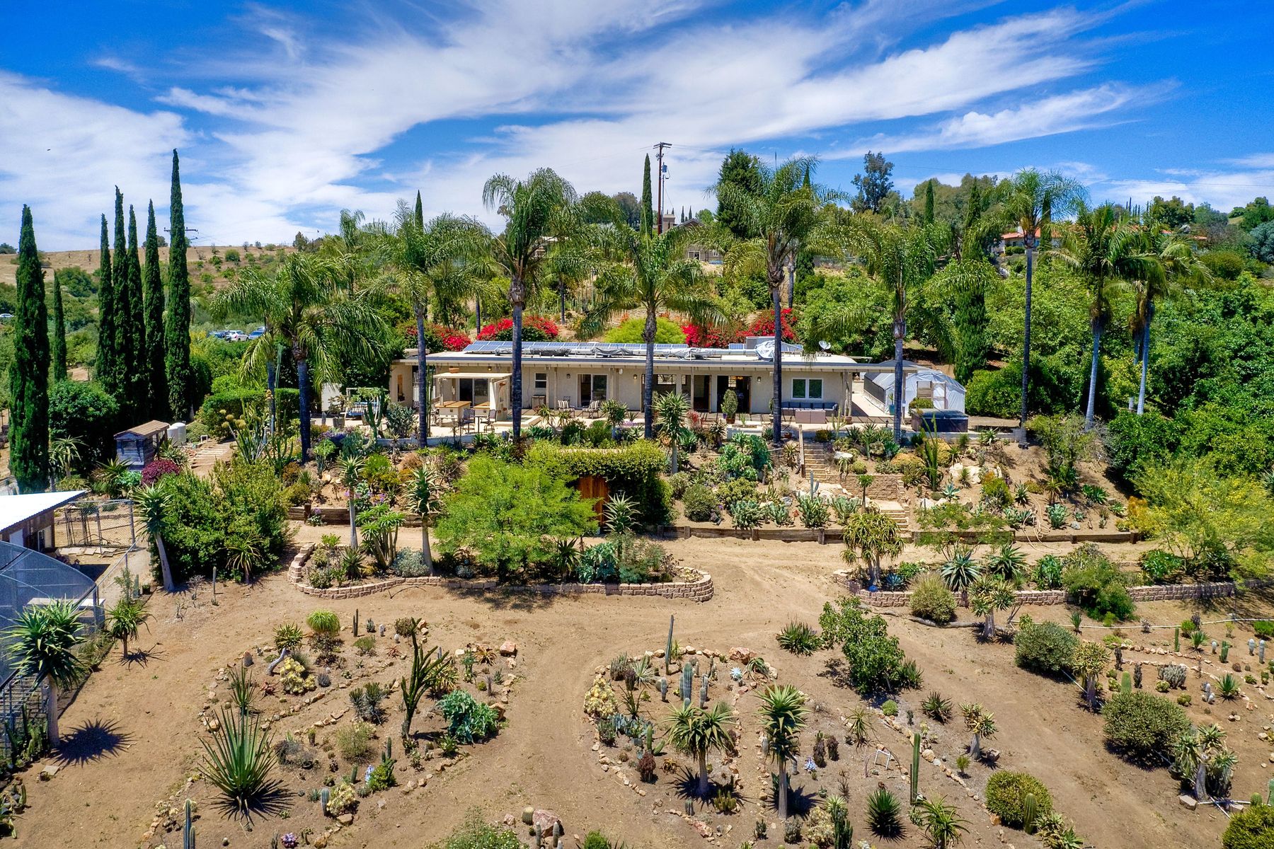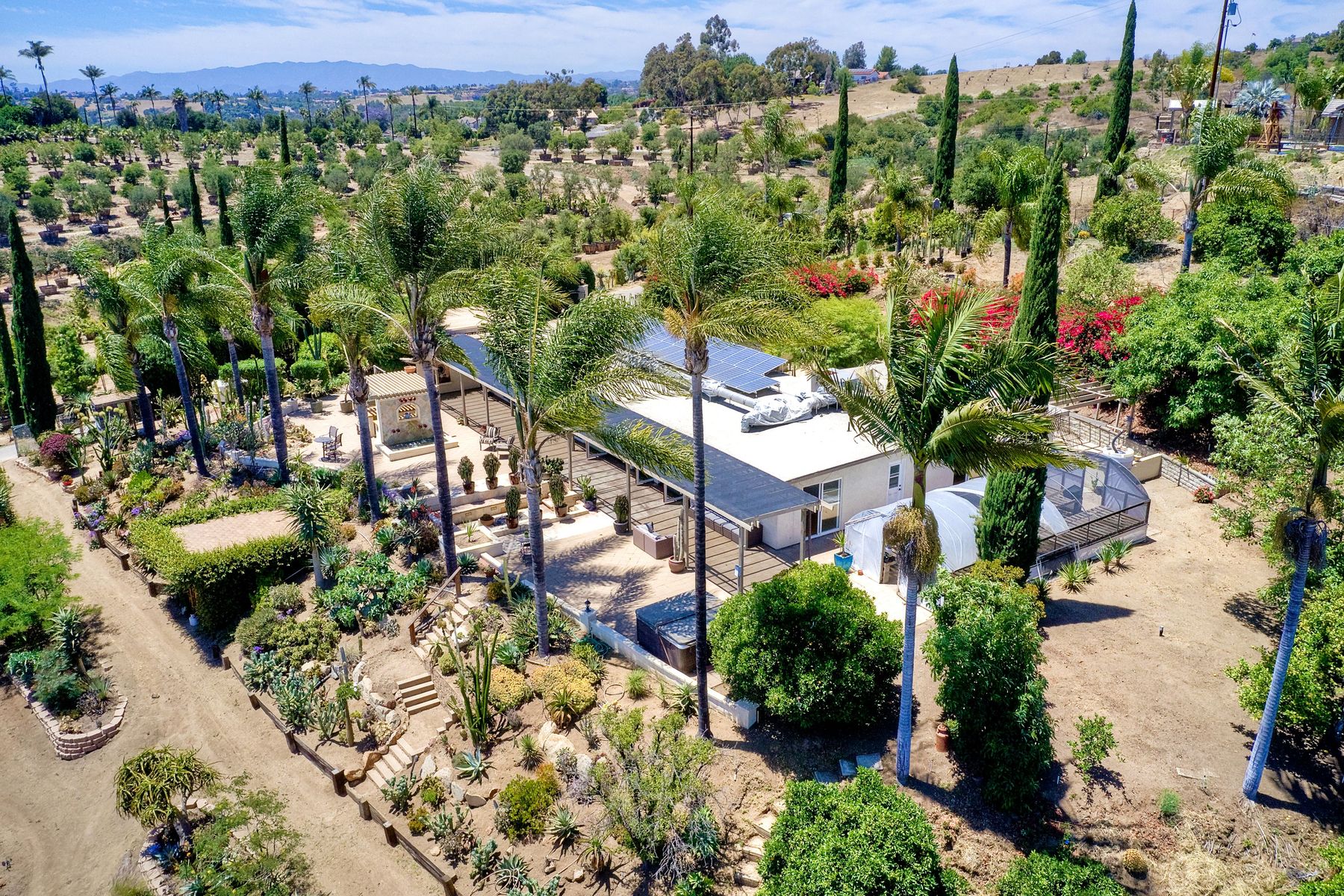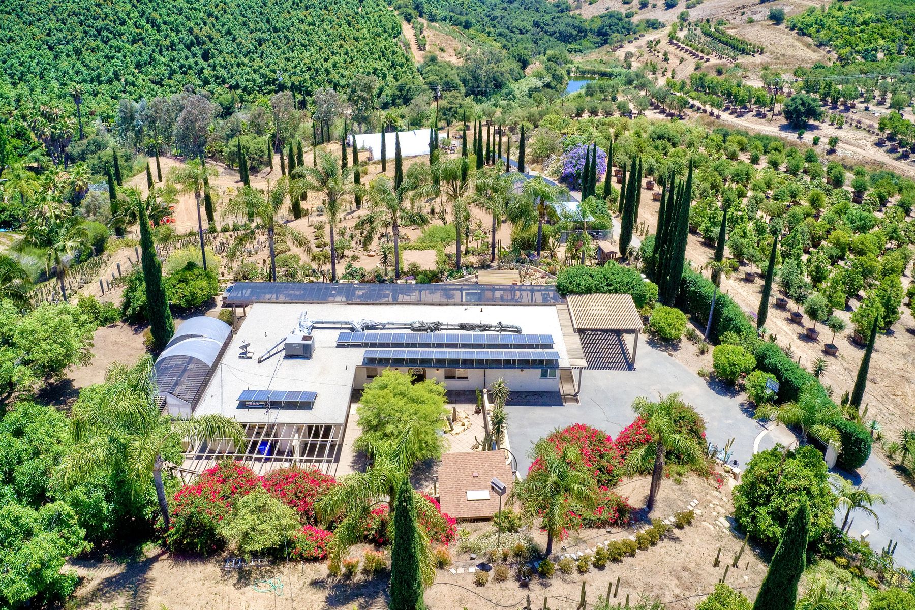 Nestled in the hills of Fallbrook is this beautiful mid-century modern home on a terraced 5 acre lot. Built in '56 w/ 4 beds & 3 full baths at 2580 square feet this place screams character. The home received an extensive remodel including a steel arched front door, colored concrete floors, Kitchen, baths and a set of La Cantina doors to bring in the breathtaking views. Take advantage of the paid for Solar & don't worry about water as you have a well w/ 3 Phase power. This property must be seen in person!! Don't let the Reche address fool you, this home sits way off the main road. This is a magical one of a kind property surrounded by groves with unreal privacy and views. Completely fenced & gated & filled w/ rare & exotic succulents (approx $35,000 worth), the grounds are amazing. 3 large greenhouses (20x100) all with tables & water supplies, a 15x20 combination greenhouse/storage house, a 20x20 shade house w/ water, one additional 60x100 greenhouse w/ tables & water. There is a great chicken coop for fresh eggs, a detached art studio (12x12 w/new roof), & other planting houses & Aviary. A 30hp Kubota Tractor and Kubota diesel utility vehicle are also available for purchase.. Neighborhoods: Reche Equipment: Dryer, Shed(s), Washer Other Fees: 0 Sewer: Septic Installed Topography: ,LL,RSLP,GSL,SSLP