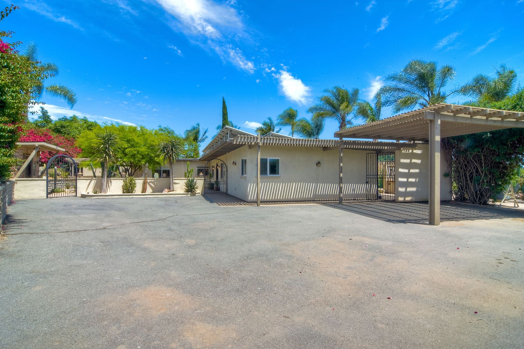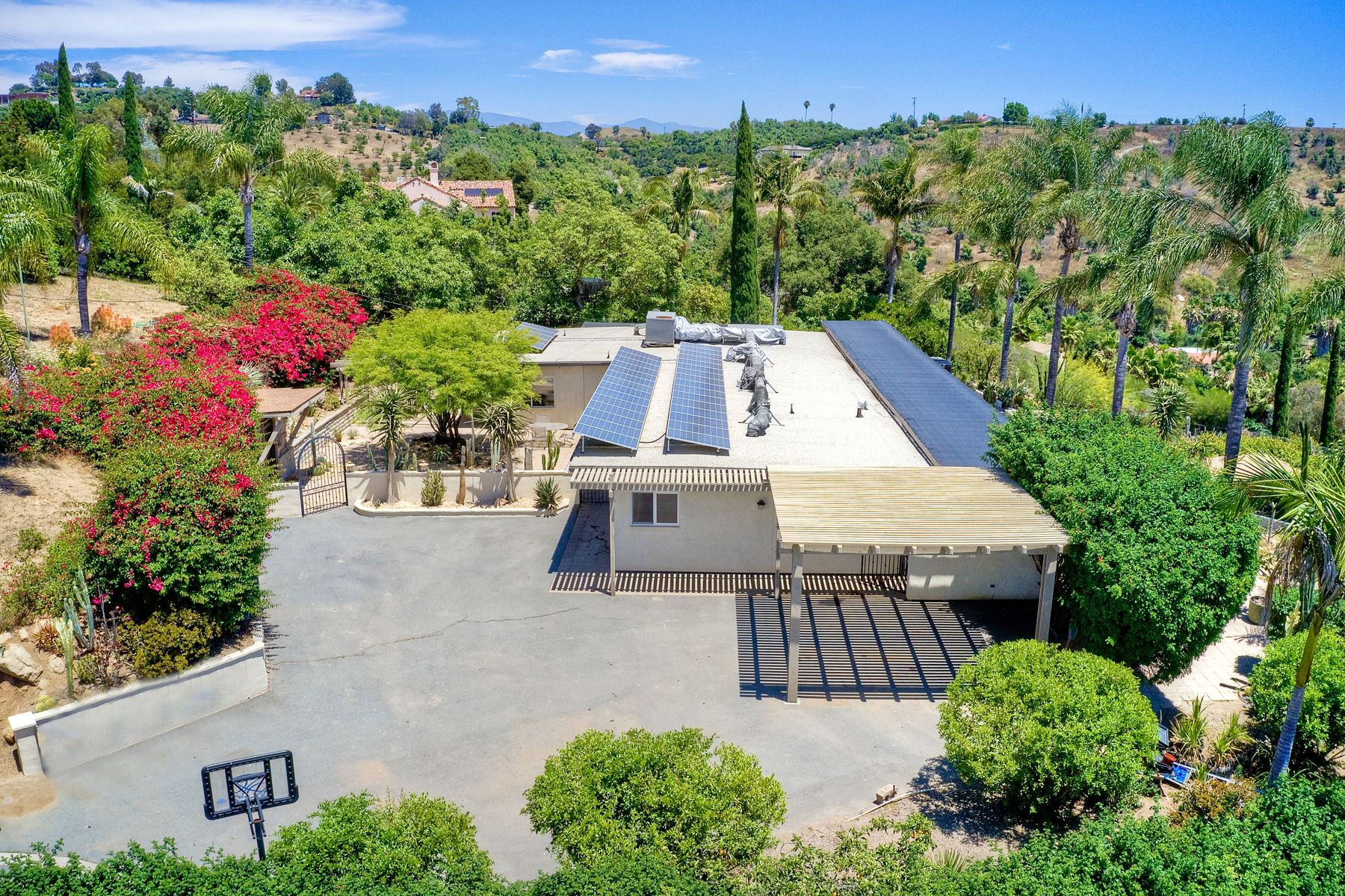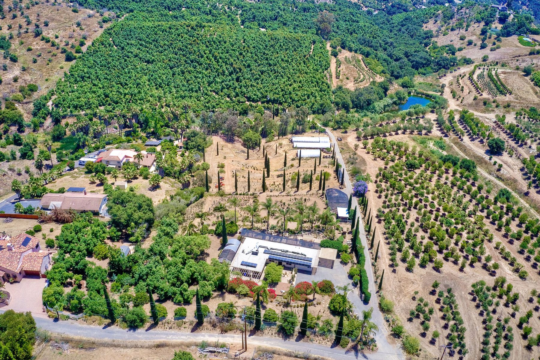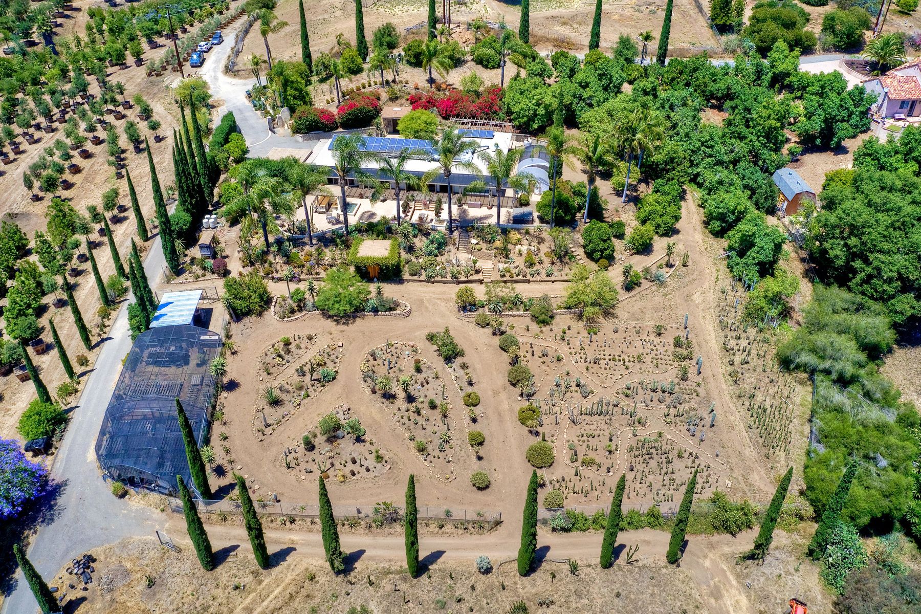 Nestled in the hills of Fallbrook is this beautiful mid-century modern home on a terraced 5 acre lot. Built in '56 w/ 4 beds & 3 full baths at 2580 square feet this place screams character. The home received an extensive remodel including a steel arched front door, colored concrete floors, Kitchen, baths and a set of La Cantina doors to bring in the breathtaking views. Take advantage of the paid for Solar & don't worry about water as you have a well w/ 3 Phase power. This property must be seen in person!! Don't let the Reche address fool you, this home sits way off the main road. This is a magical one of a kind property surrounded by groves with unreal privacy and views. Completely fenced & gated & filled w/ rare & exotic succulents (approx $35,000 worth), the grounds are amazing. 3 large greenhouses (20x100) all with tables & water supplies, a 15x20 combination greenhouse/storage house, a 20x20 shade house w/ water, one additional 60x100 greenhouse w/ tables & water. There is a great chicken coop for fresh eggs, a detached art studio (12x12 w/new roof), & other planting houses & Aviary. A 30hp Kubota Tractor and Kubota diesel utility vehicle are also available for purchase.. Neighborhoods: Reche Equipment: Dryer, Shed(s), Washer Other Fees: 0 Sewer: Septic Installed Topography: ,LL,RSLP,GSL,SSLP
