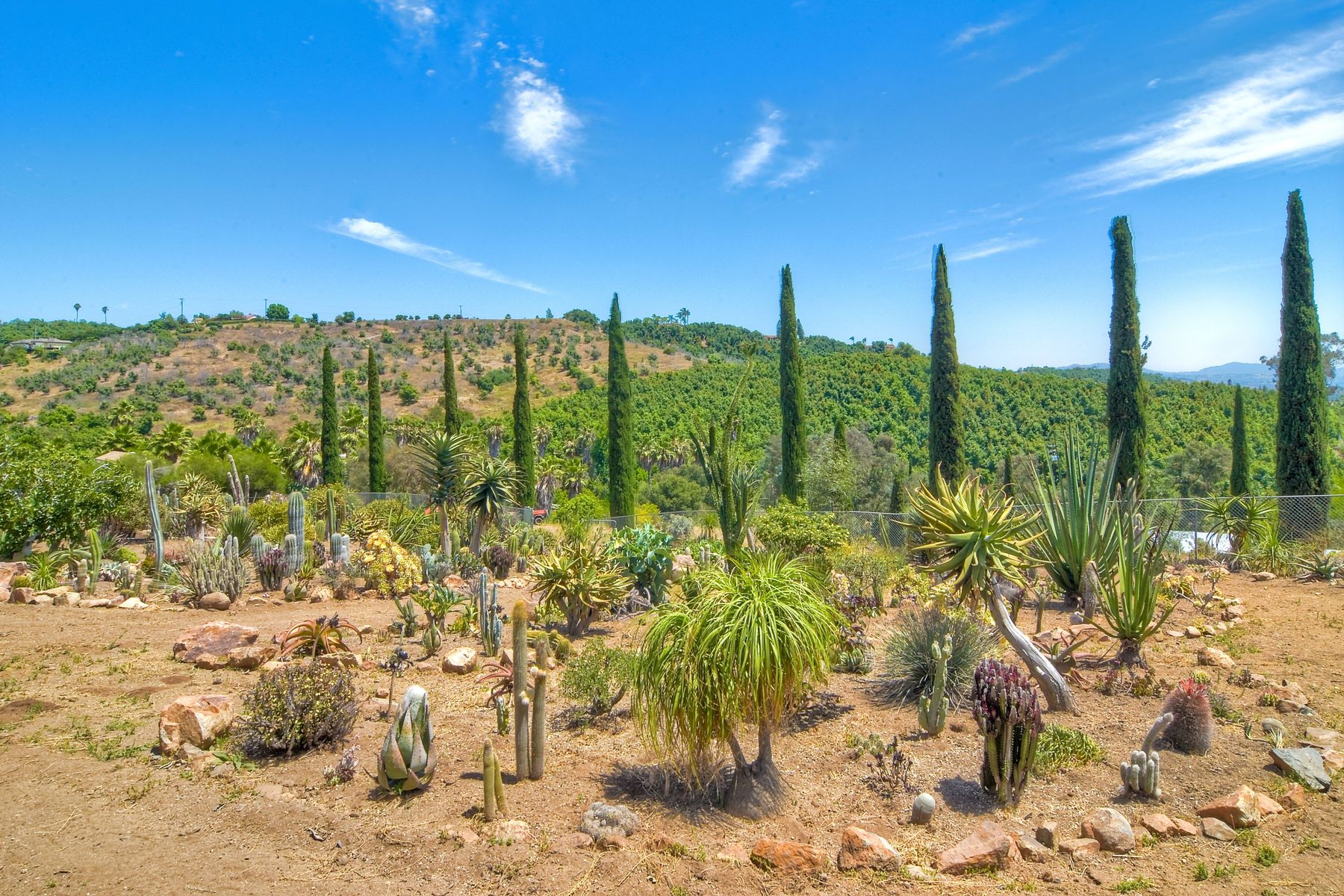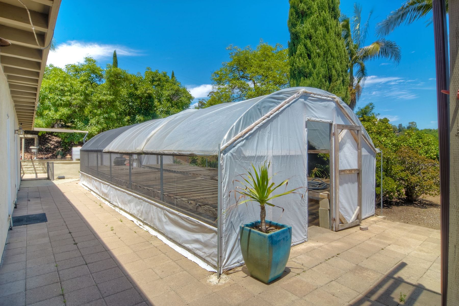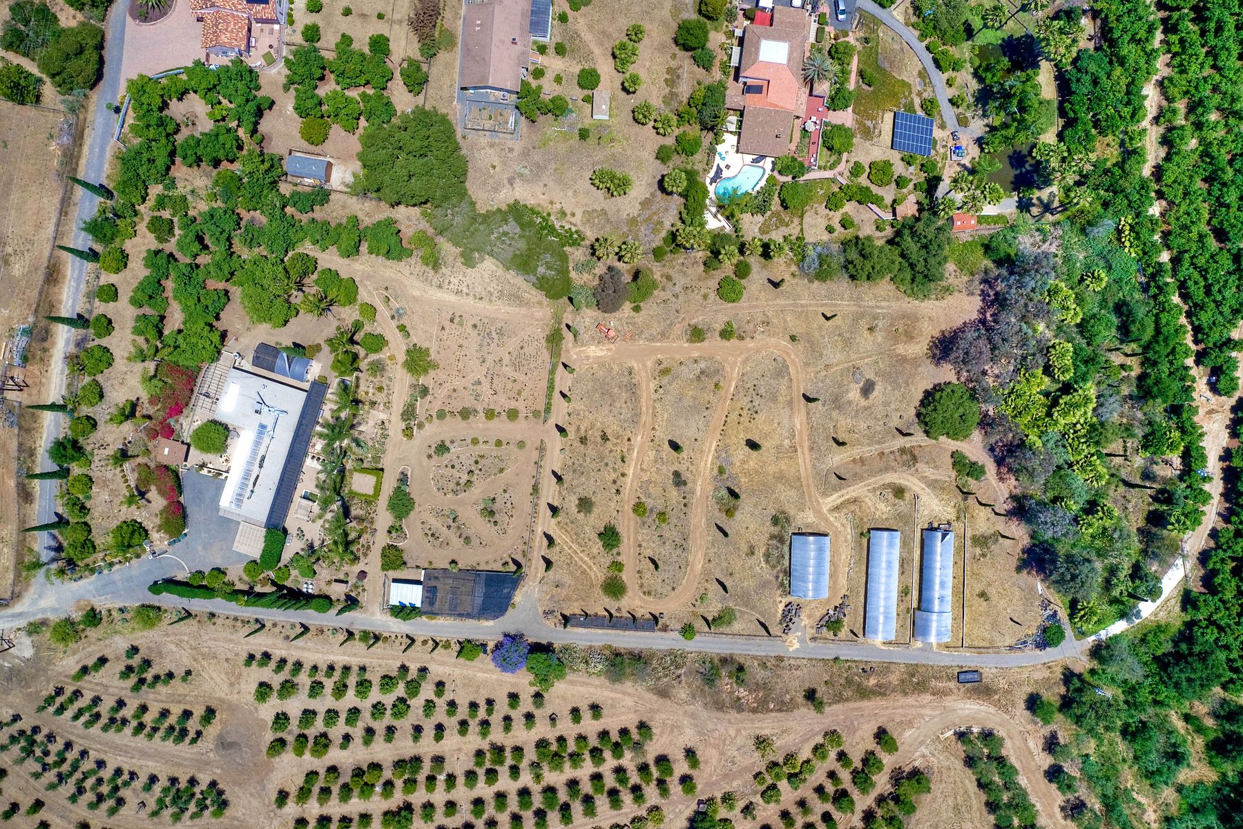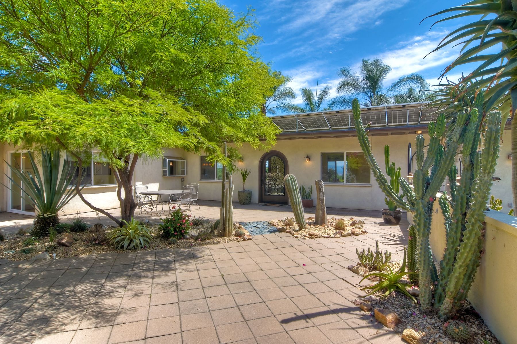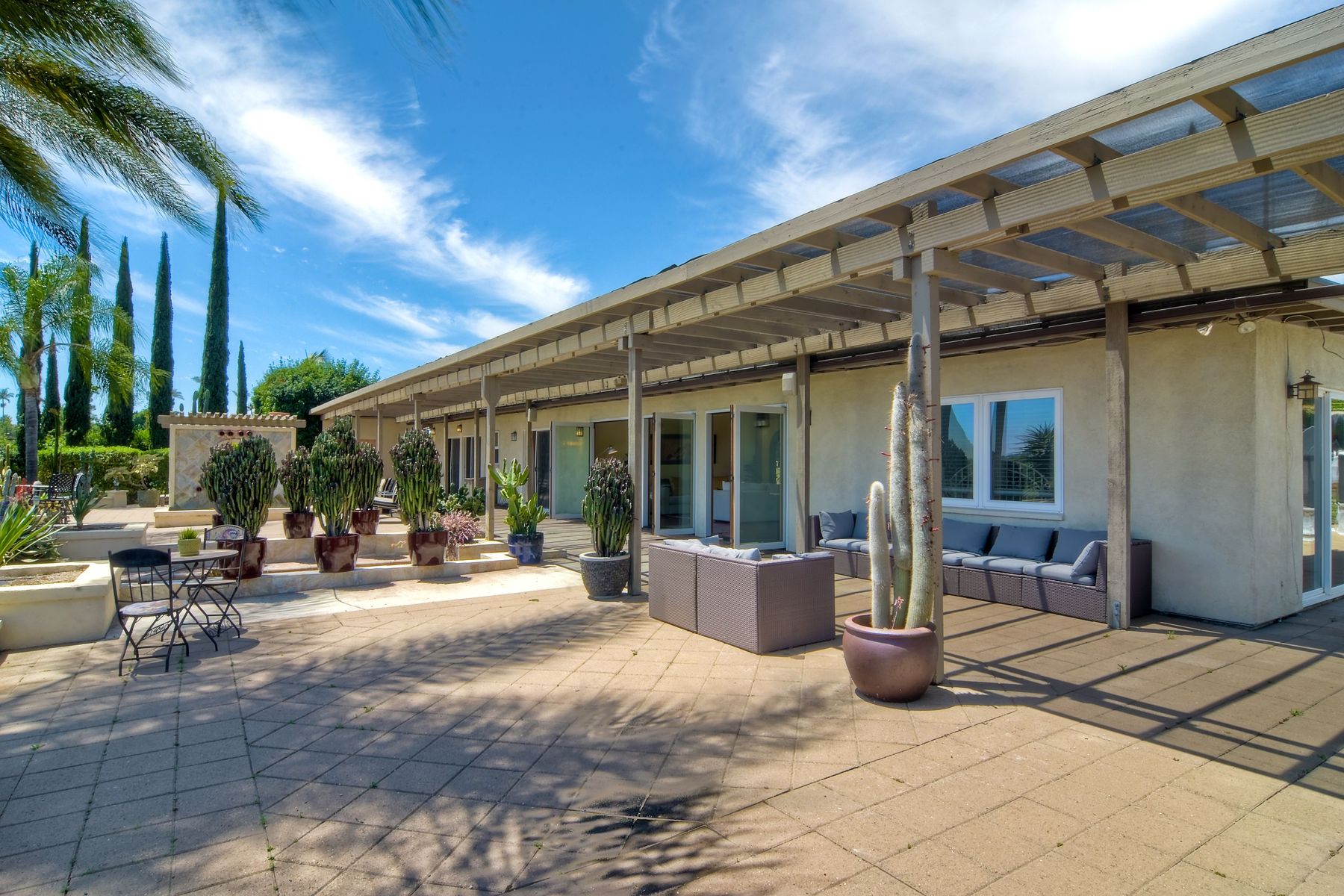 Nestled in the hills of Fallbrook is this beautiful mid-century modern home on a terraced 5 acre lot. Built in '56 w/ 4 beds & 3 full baths at 2580 square feet this place screams character. The home received an extensive remodel including a steel arched front door, colored concrete floors, Kitchen, baths and a set of La Cantina doors to bring in the breathtaking views. Take advantage of the paid for Solar & don't worry about water as you have a well w/ 3 Phase power. This property must be seen in person!! Don't let the Reche address fool you, this home sits way off the main road. This is a magical one of a kind property surrounded by groves with unreal privacy and views. Completely fenced & gated & filled w/ rare & exotic succulents (approx $35,000 worth), the grounds are amazing. 3 large greenhouses (20x100) all with tables & water supplies, a 15x20 combination greenhouse/storage house, a 20x20 shade house w/ water, one additional 60x100 greenhouse w/ tables & water. There is a great chicken coop for fresh eggs, a detached art studio (12x12 w/new roof), & other planting houses & Aviary. A 30hp Kubota Tractor and Kubota diesel utility vehicle are also available for purchase.. Neighborhoods: Reche Equipment: Dryer, Shed(s), Washer Other Fees: 0 Sewer: Septic Installed Topography: ,LL,RSLP,GSL,SSLP