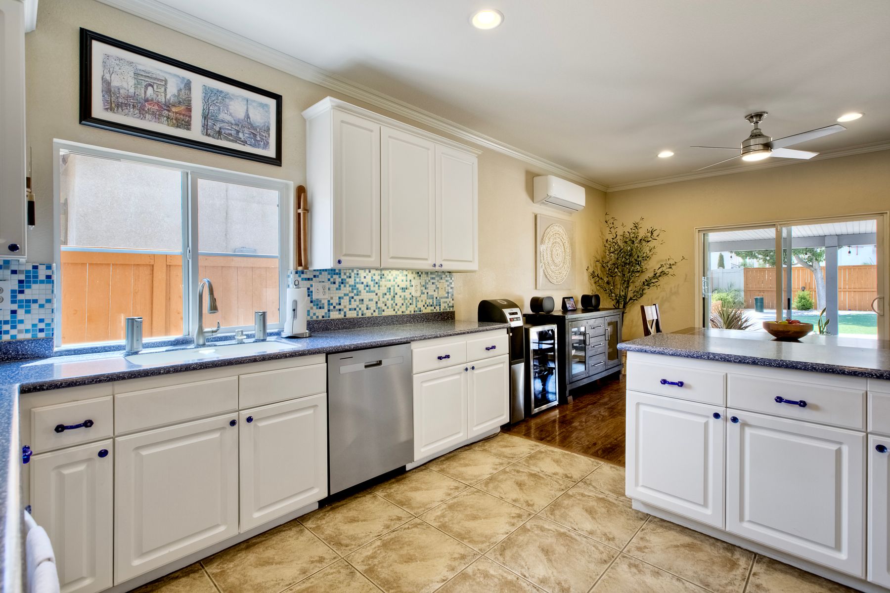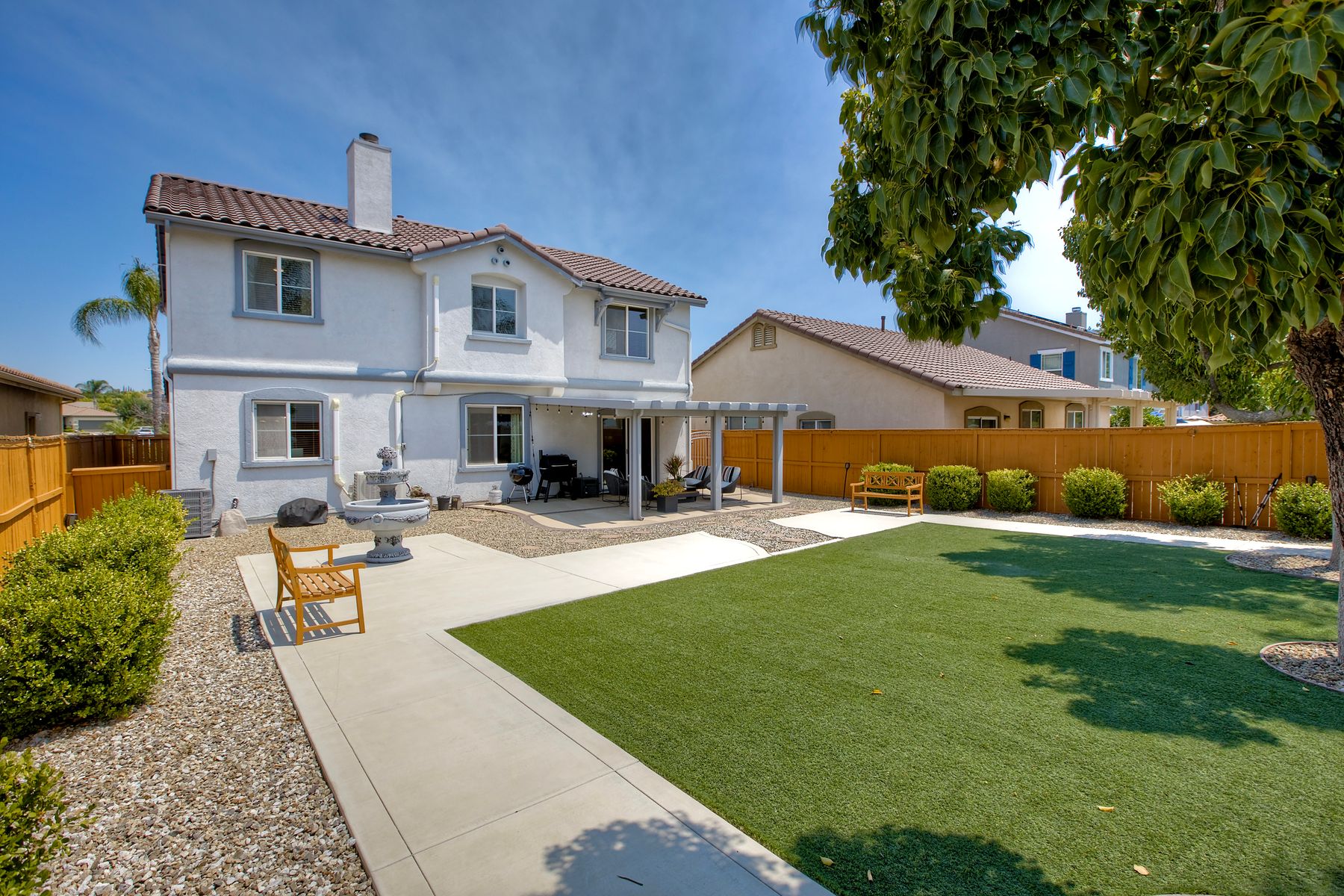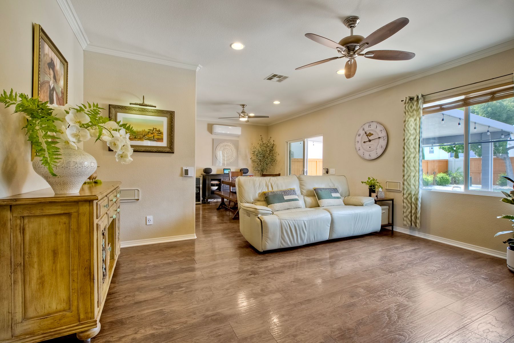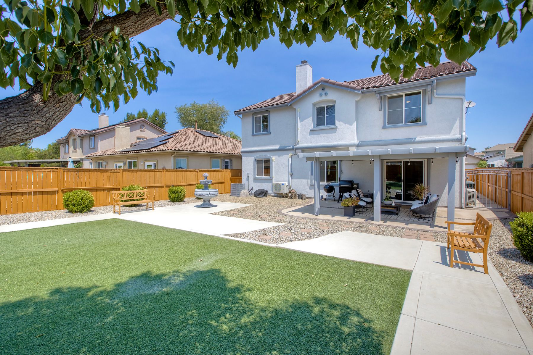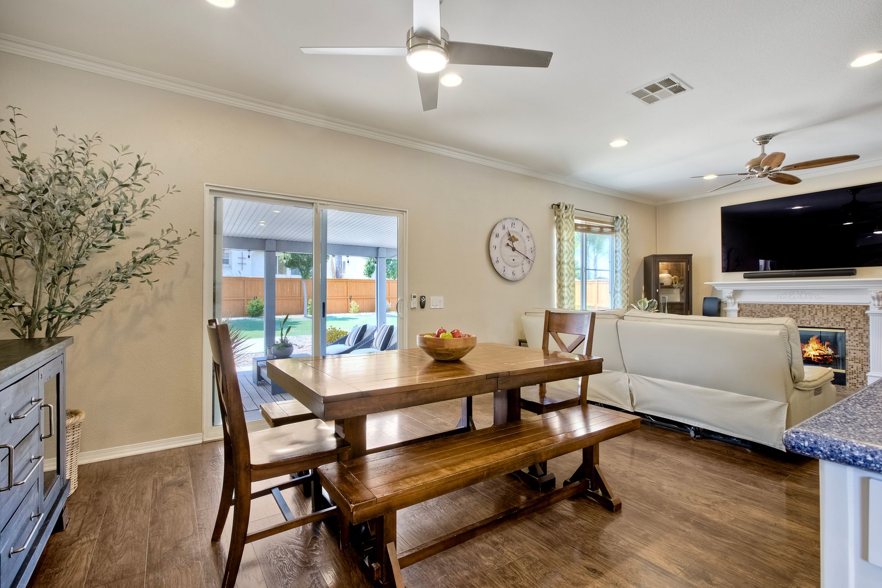 The family room opens into the dining area and a spacious kitchen equipped with corian countertops, stainless steel appliances and smart recessed lighting with direct access to the garage—ideal for effortless living and entertaining. Step outside to a beautifully landscaped, park-like backyard with low-maintenance and pet friendly turf. Whether you’re hosting gatherings, enjoying a quiet evening, or letting pets and kids roam free, this outdoor space is your private oasis.
