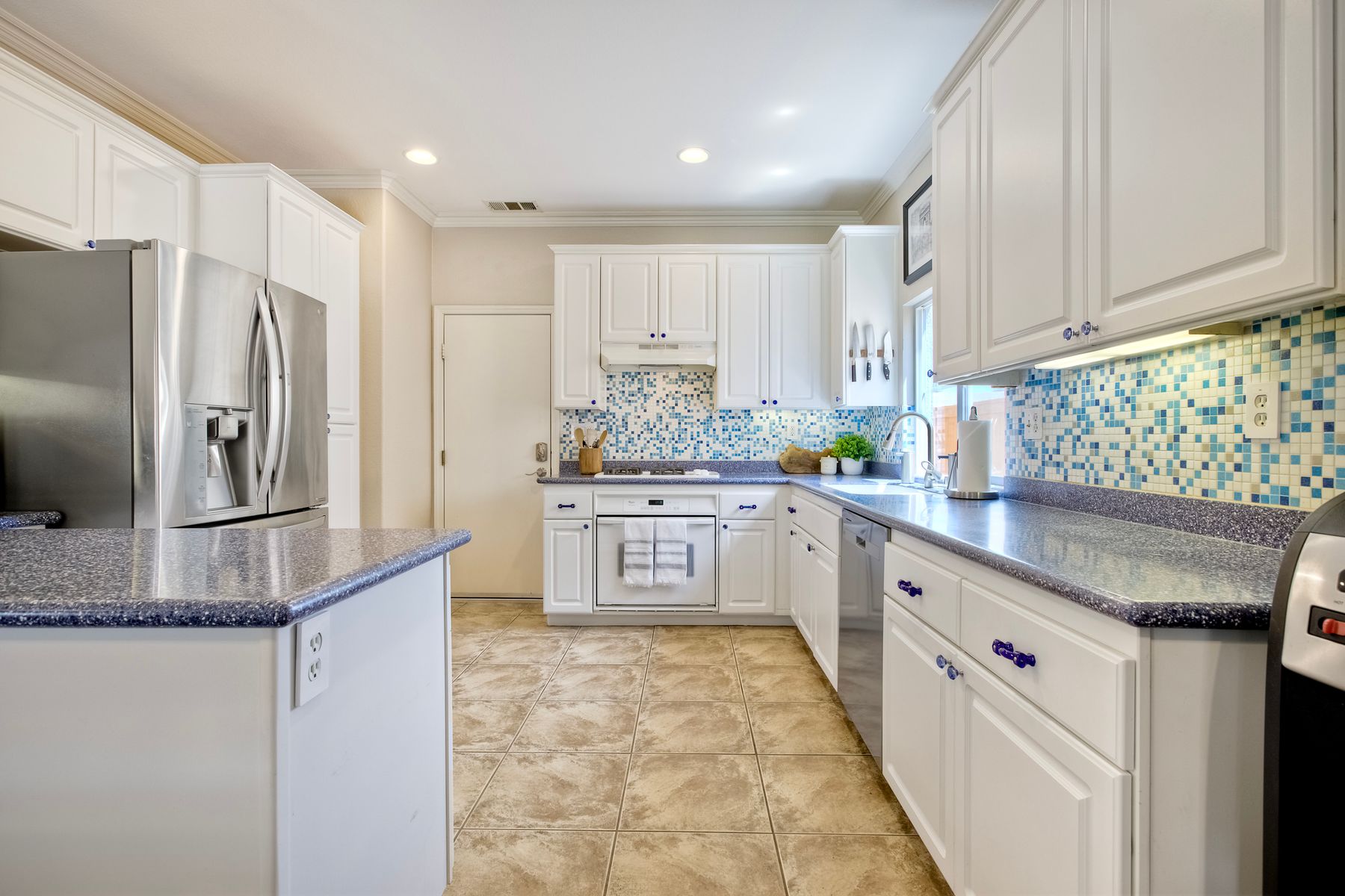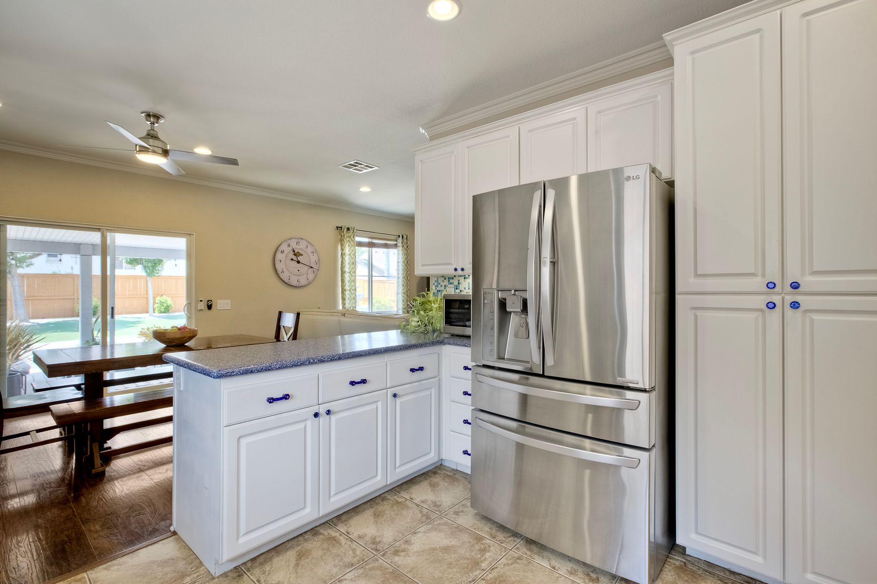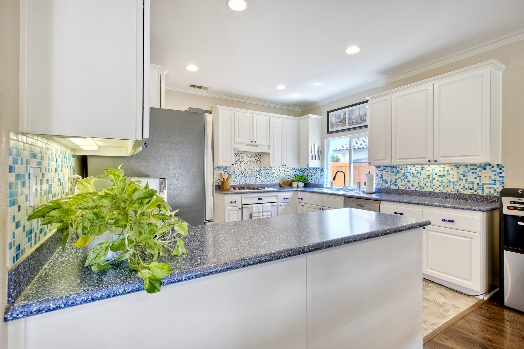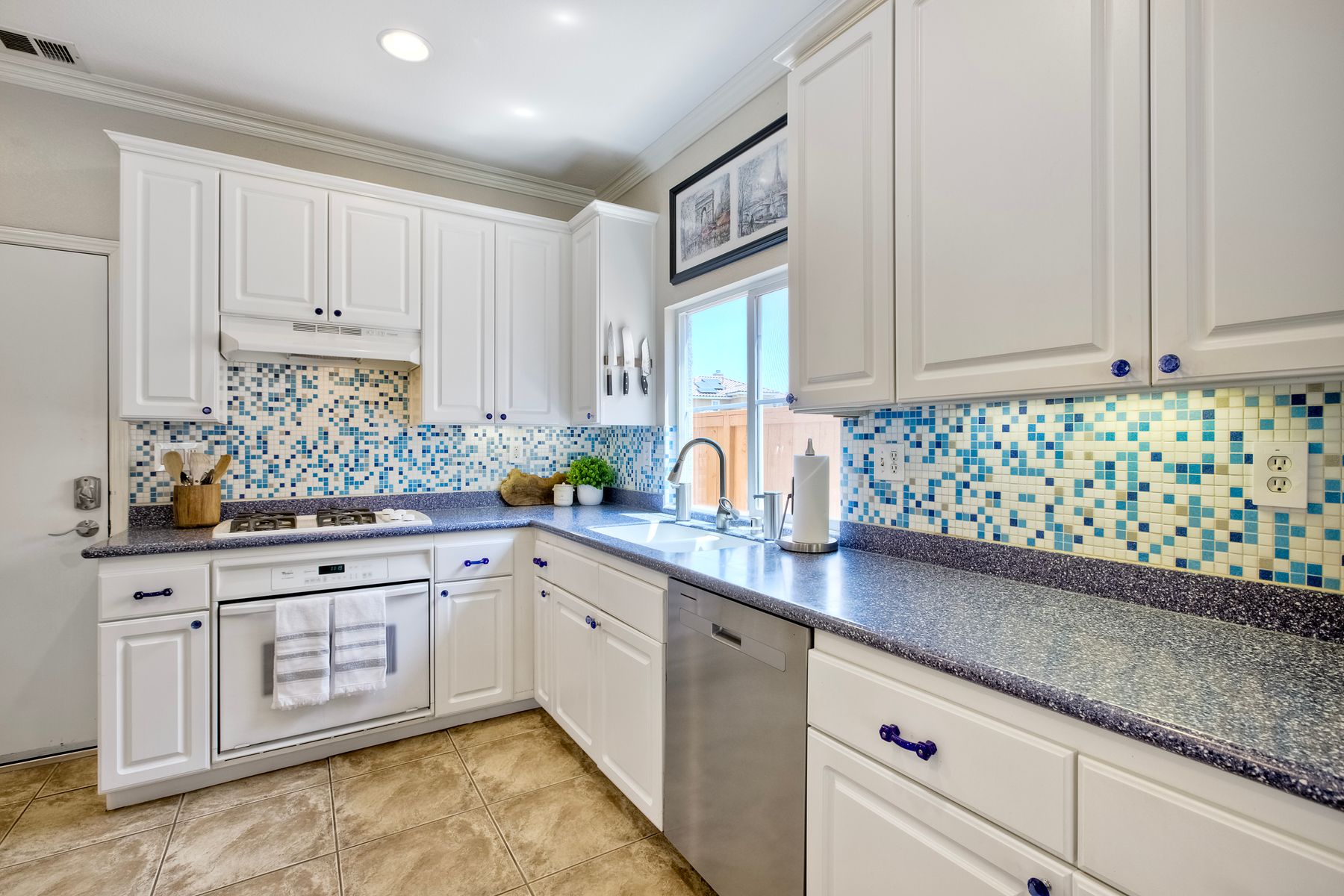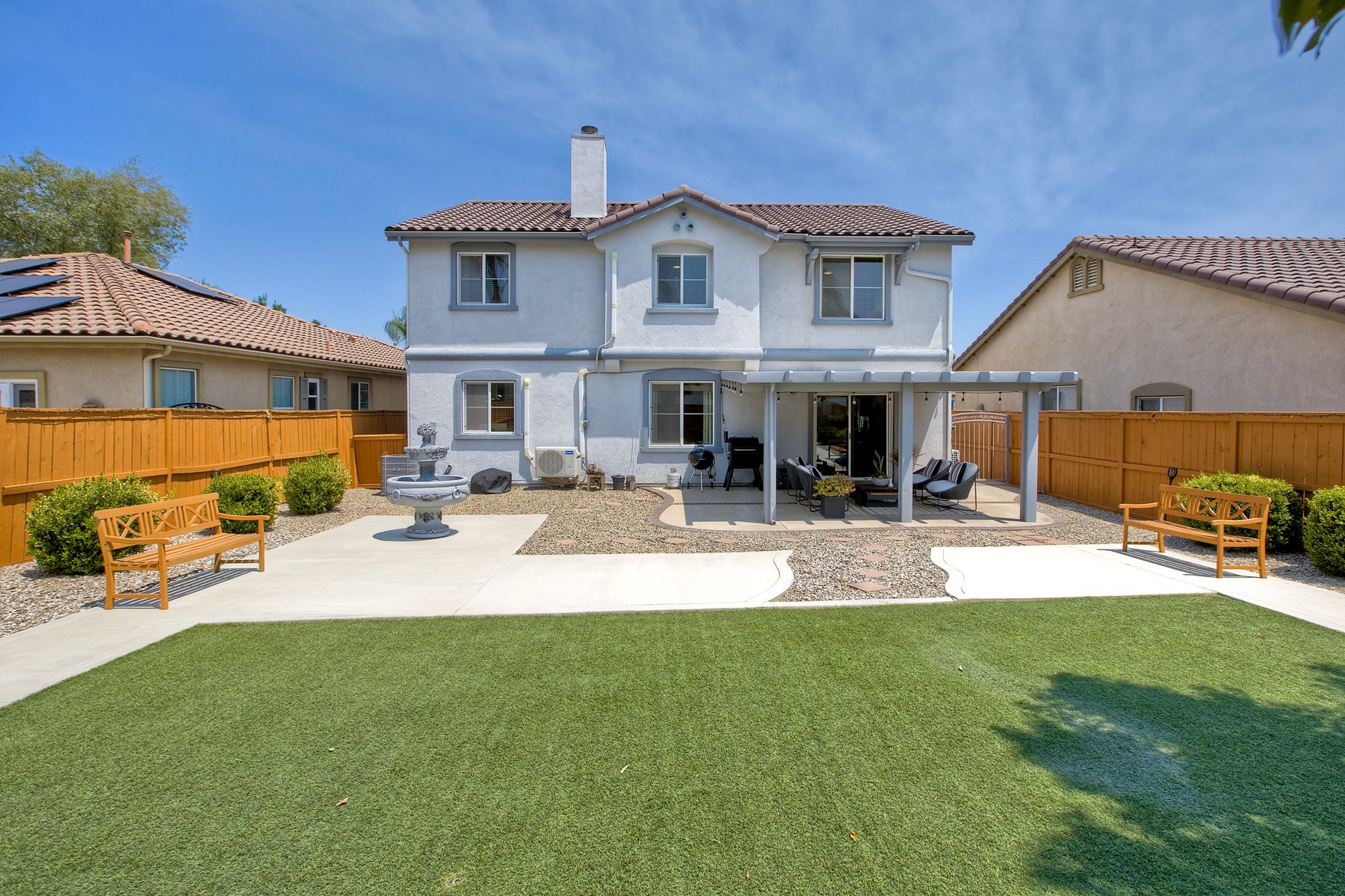 The family room opens into the dining area and a spacious kitchen equipped with corian countertops, stainless steel appliances and smart recessed lighting with direct access to the garage—ideal for effortless living and entertaining. Step outside to a beautifully landscaped, park-like backyard with low-maintenance and pet friendly turf. Whether you’re hosting gatherings, enjoying a quiet evening, or letting pets and kids roam free, this outdoor space is your private oasis.