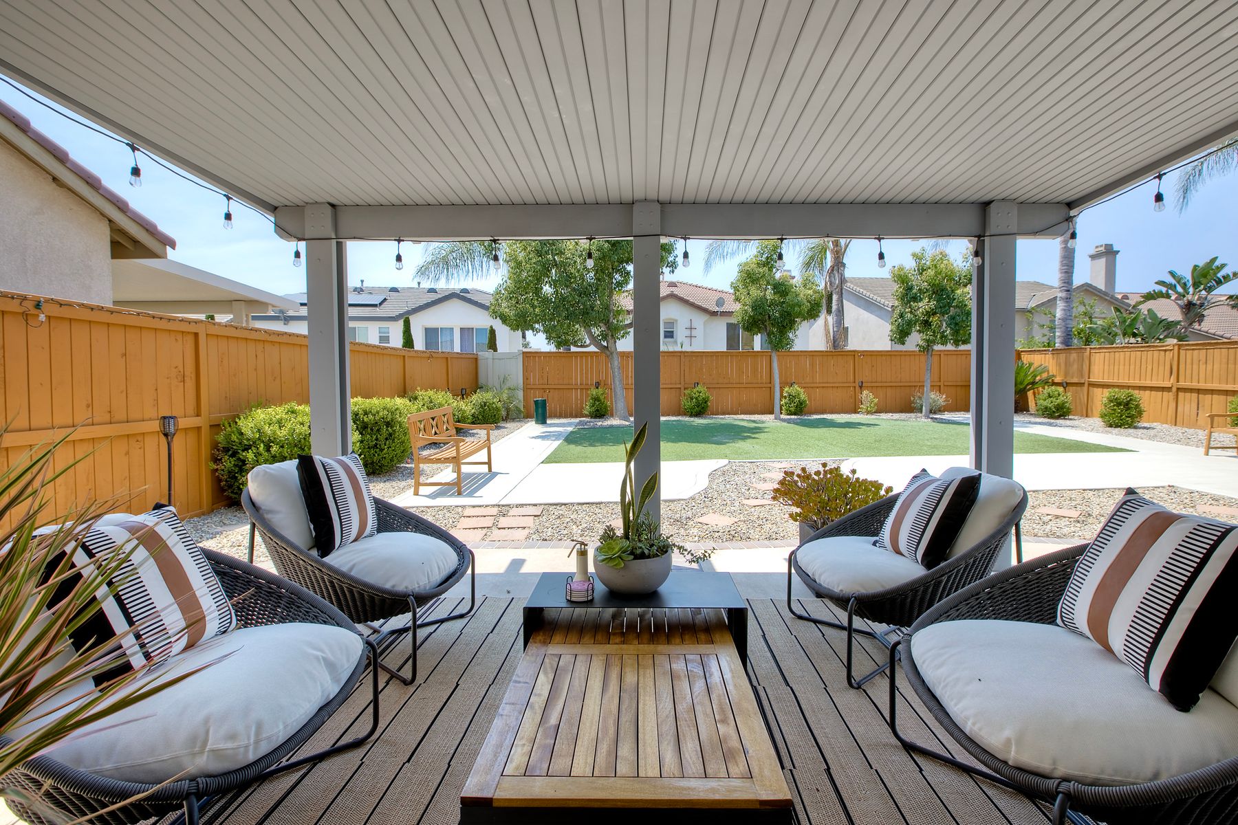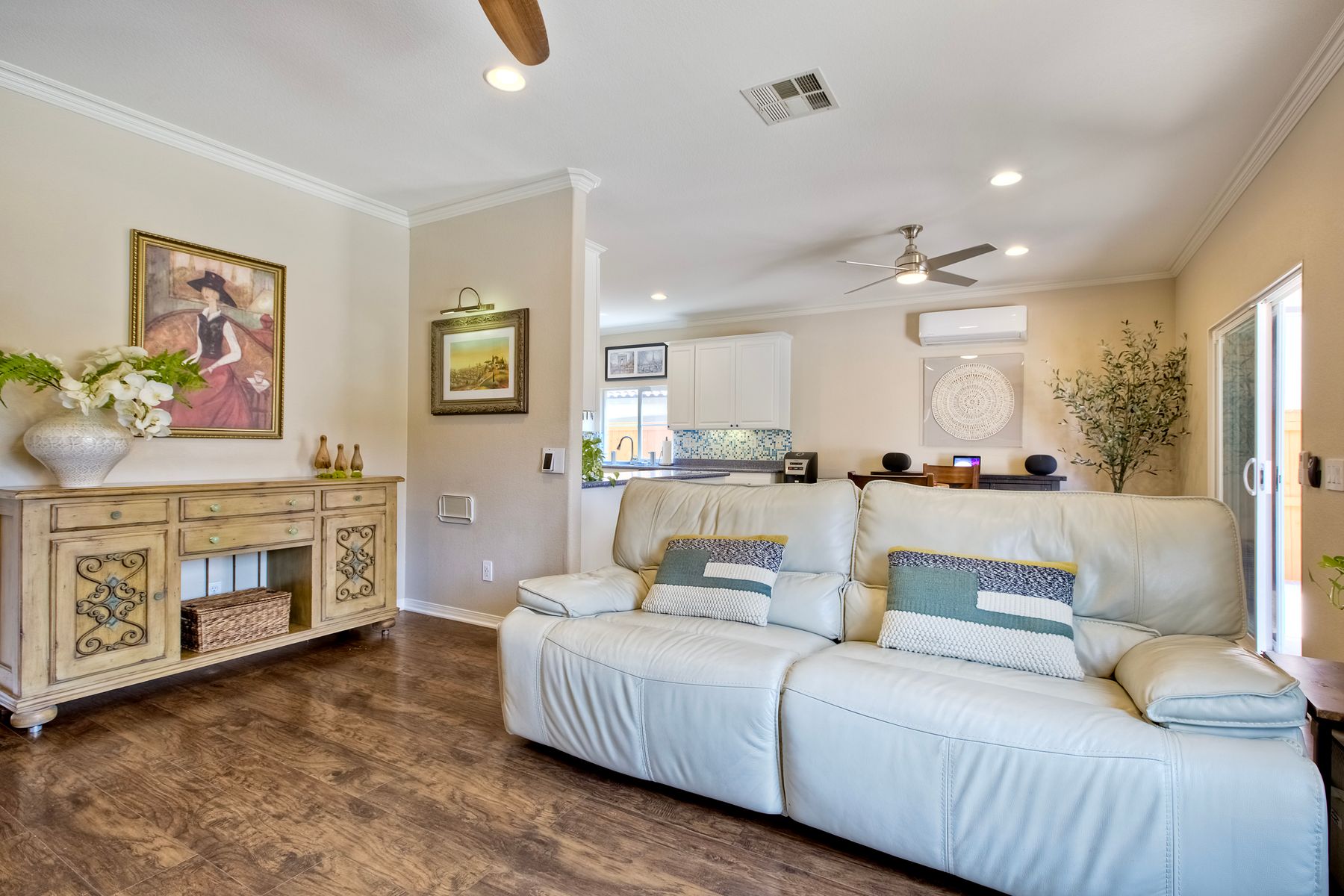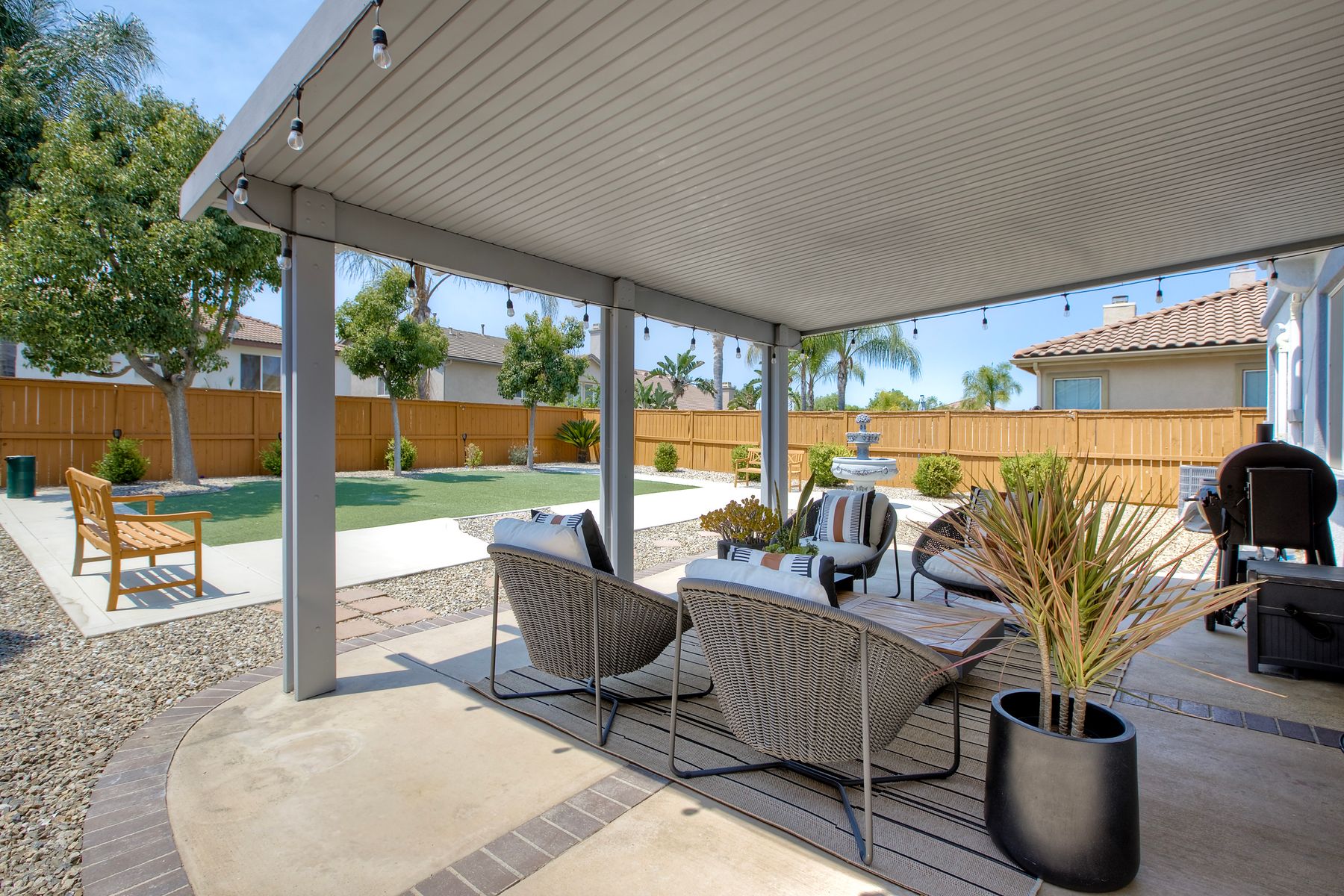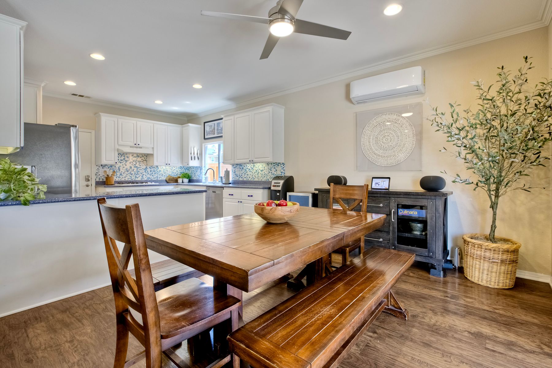 The family room opens into the dining area and a spacious kitchen equipped with corian countertops, stainless steel appliances and smart recessed lighting with direct access to the garage—ideal for effortless living and entertaining. Step outside to a beautifully landscaped, park-like backyard with low-maintenance and pet friendly turf. Whether you’re hosting gatherings, enjoying a quiet evening, or letting pets and kids roam free, this outdoor space is your private oasis.