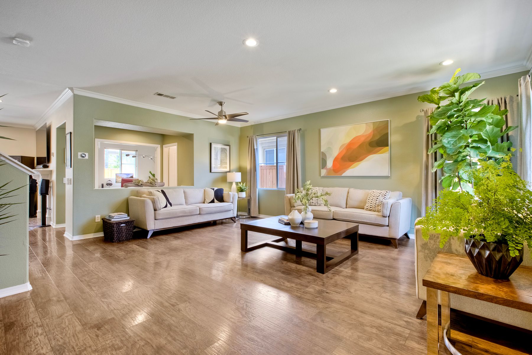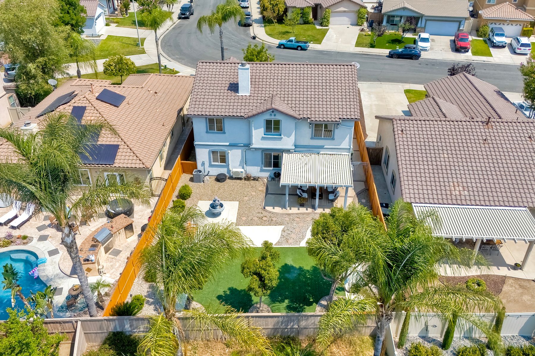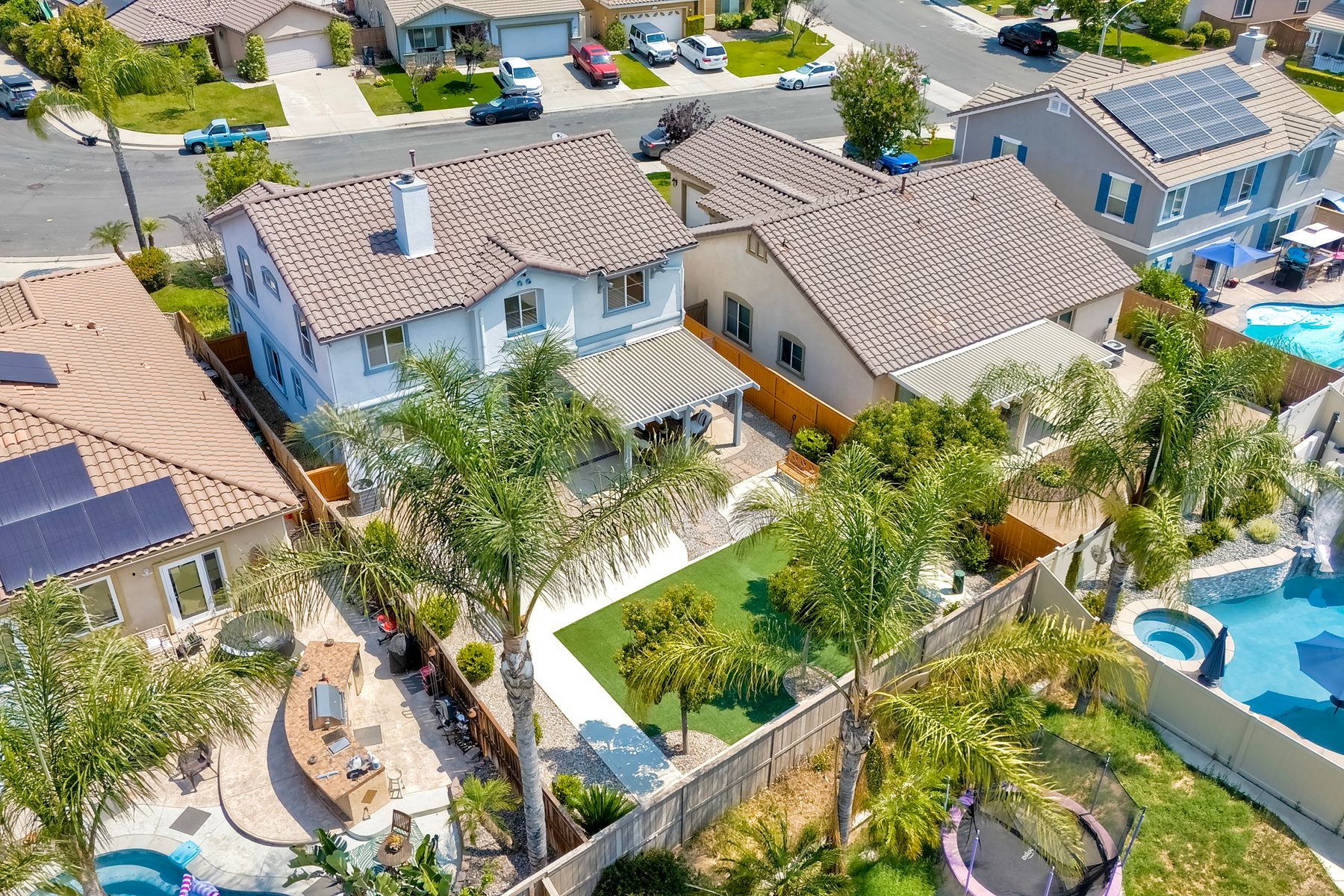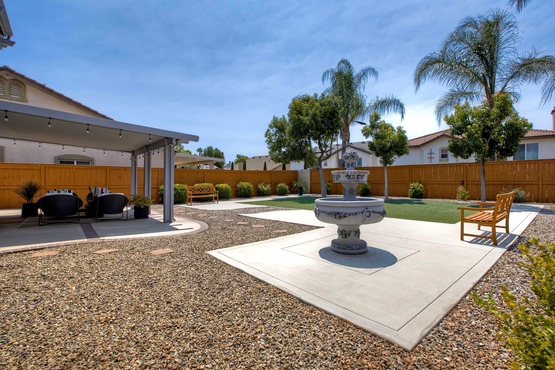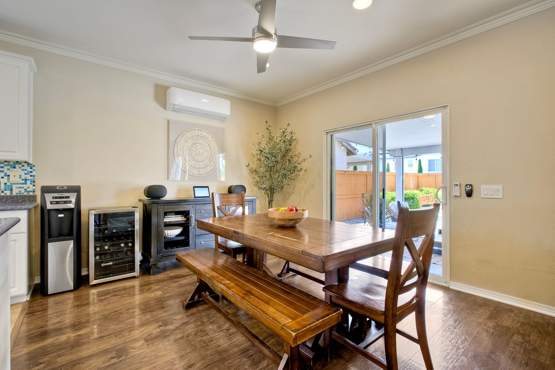The family room opens into the dining area and a spacious kitchen equipped with corian countertops, stainless steel appliances and smart recessed lighting with direct access to the garage—ideal for effortless living and entertaining. Step outside to a beautifully landscaped, park-like backyard with low-maintenance and pet friendly turf. Whether you’re hosting gatherings, enjoying a quiet evening, or letting pets and kids roam free, this outdoor space is your private oasis.