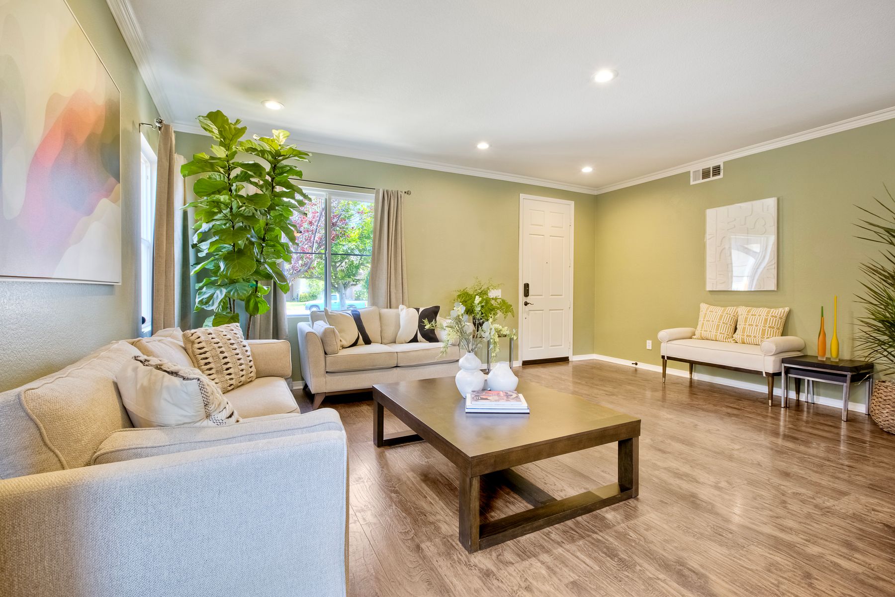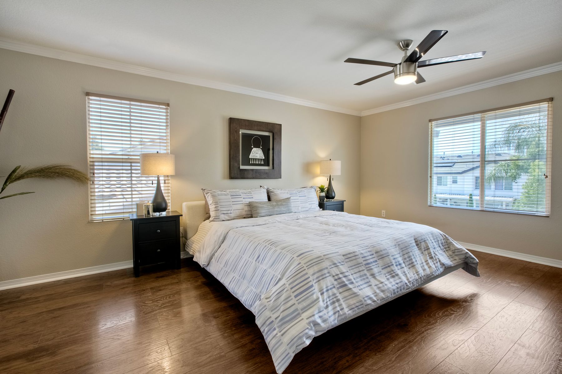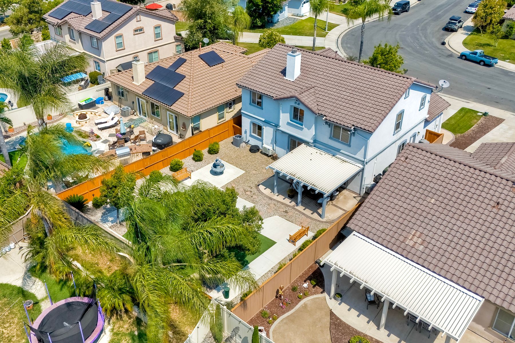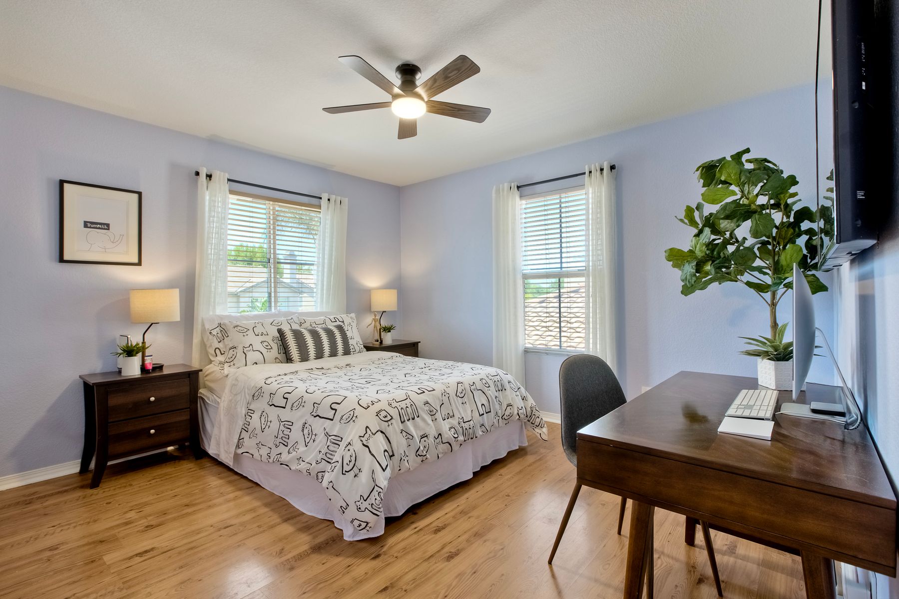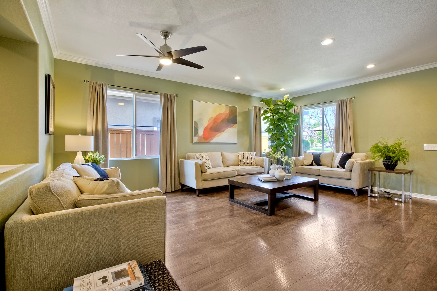 The family room opens into the dining area and a spacious kitchen equipped with corian countertops, stainless steel appliances and smart recessed lighting with direct access to the garage—ideal for effortless living and entertaining. Step outside to a beautifully landscaped, park-like backyard with low-maintenance and pet friendly turf. Whether you’re hosting gatherings, enjoying a quiet evening, or letting pets and kids roam free, this outdoor space is your private oasis.