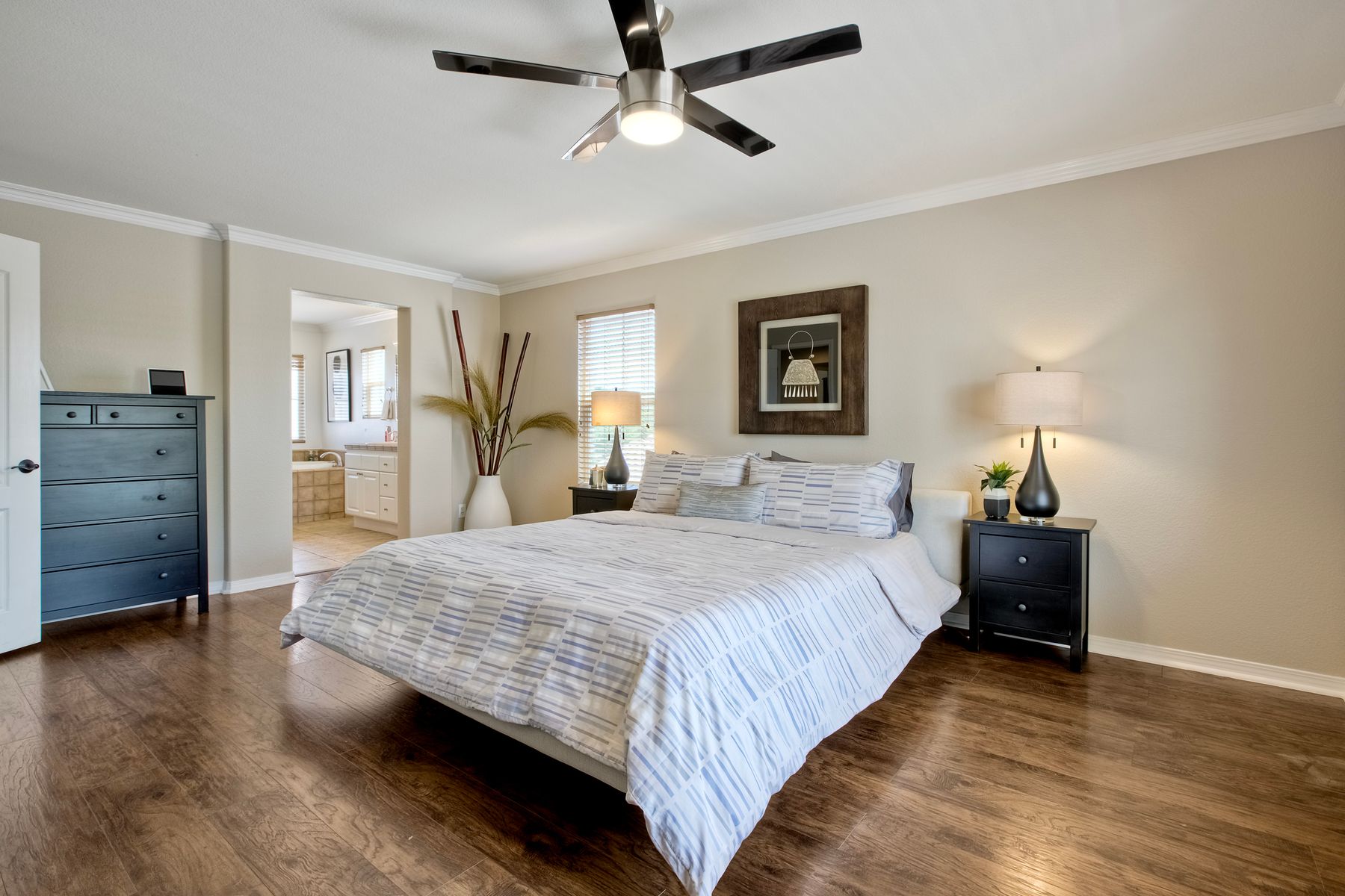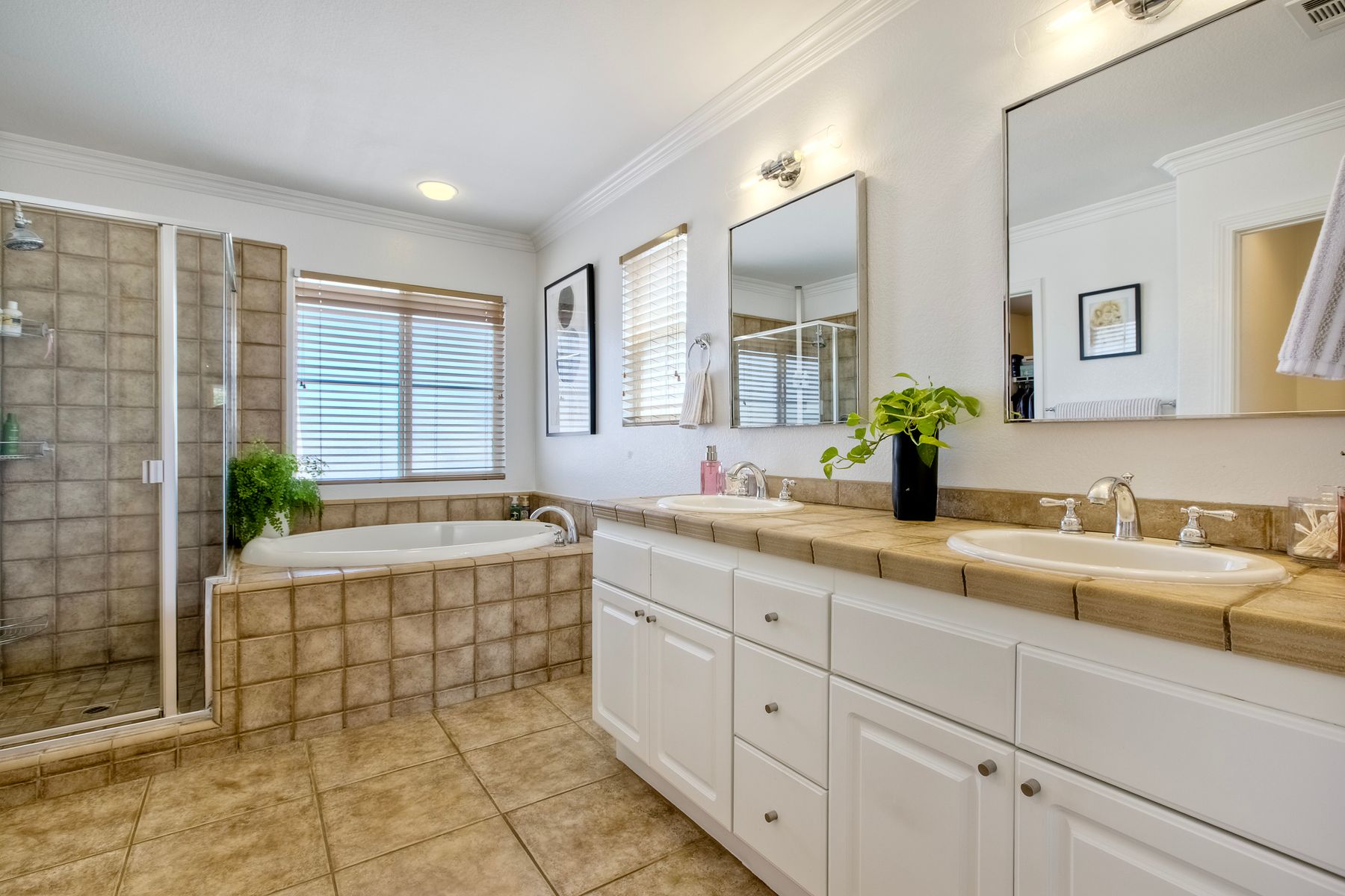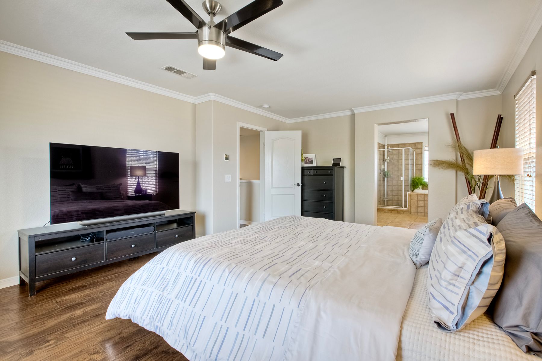 The generously sized primary suite features a walk-in closet, soaking tub, walk-in shower, dual-sink vanity, and private water closet.