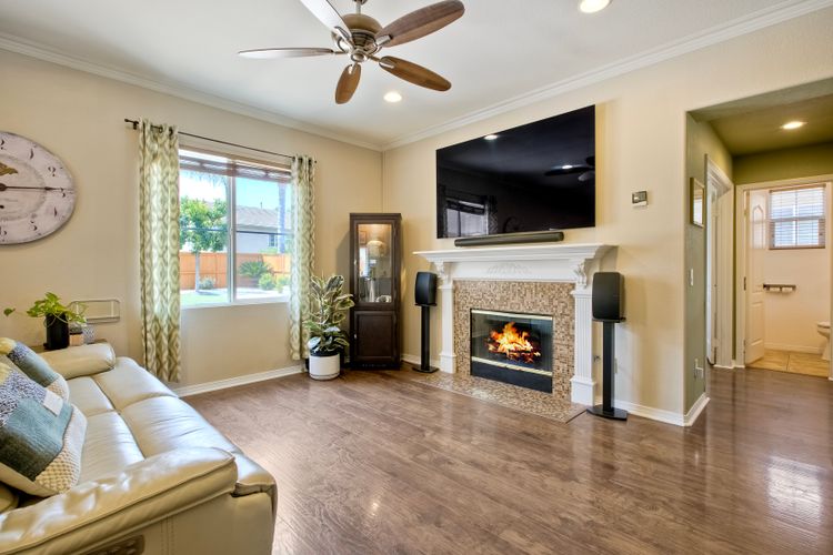 The family room opens into the dining area and a spacious kitchen equipped with corian countertops, stainless steel appliances and smart recessed lighting with direct access to the garage—ideal for effortless living and entertaining. Step outside to a beautifully landscaped, park-like backyard with low-maintenance and pet friendly turf. Whether you’re hosting gatherings, enjoying a quiet evening, or letting pets and kids roam free, this outdoor space is your private oasis.