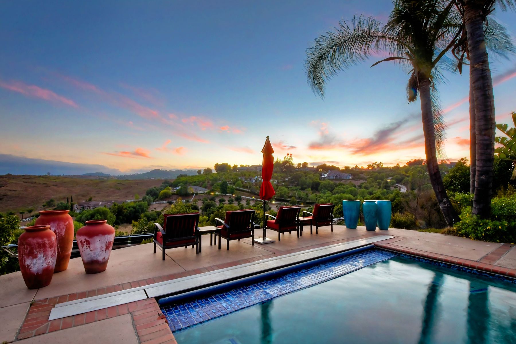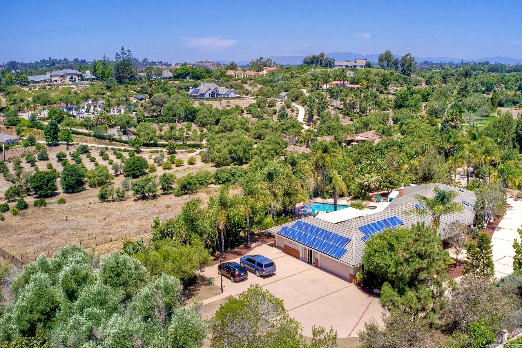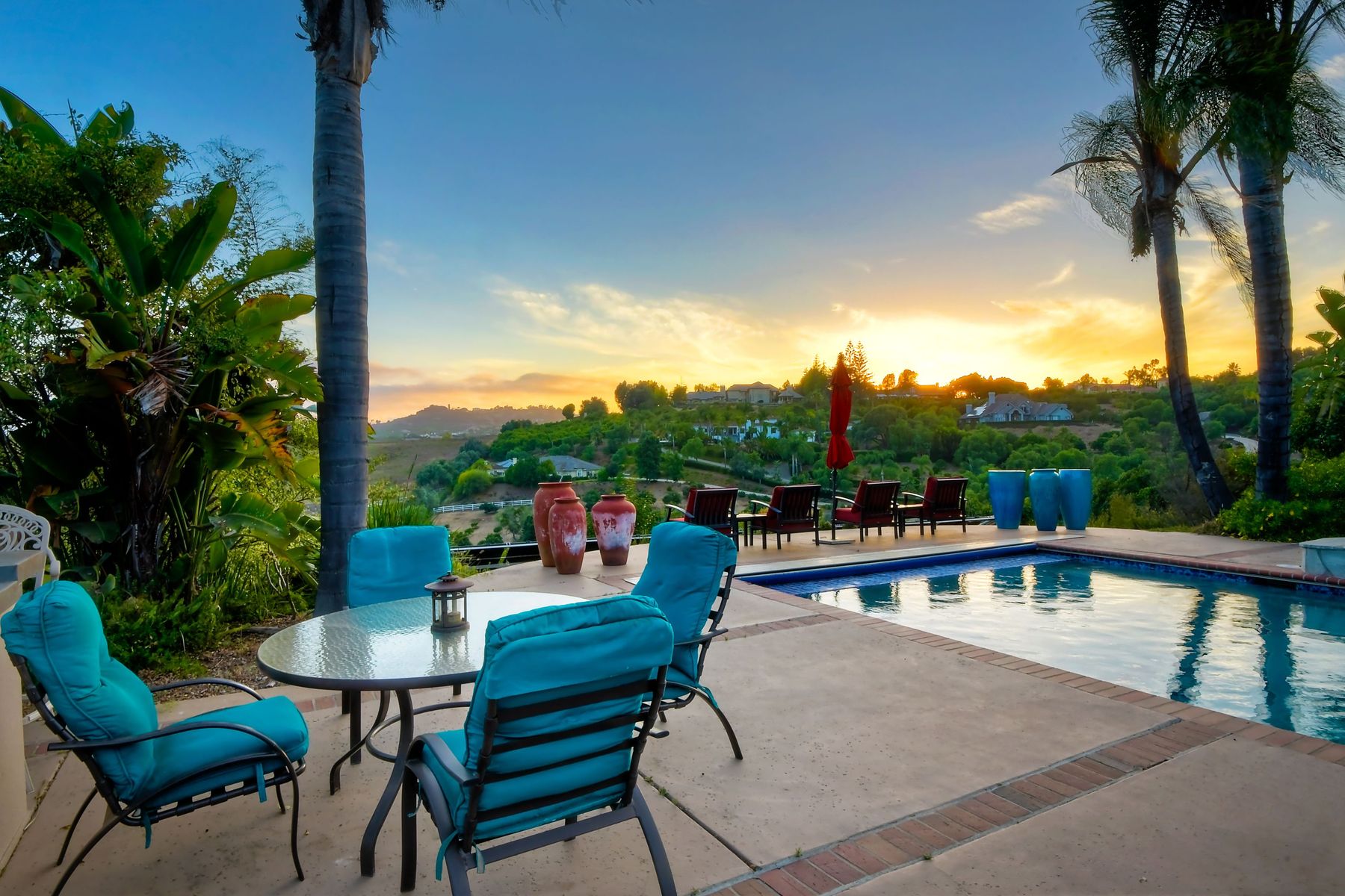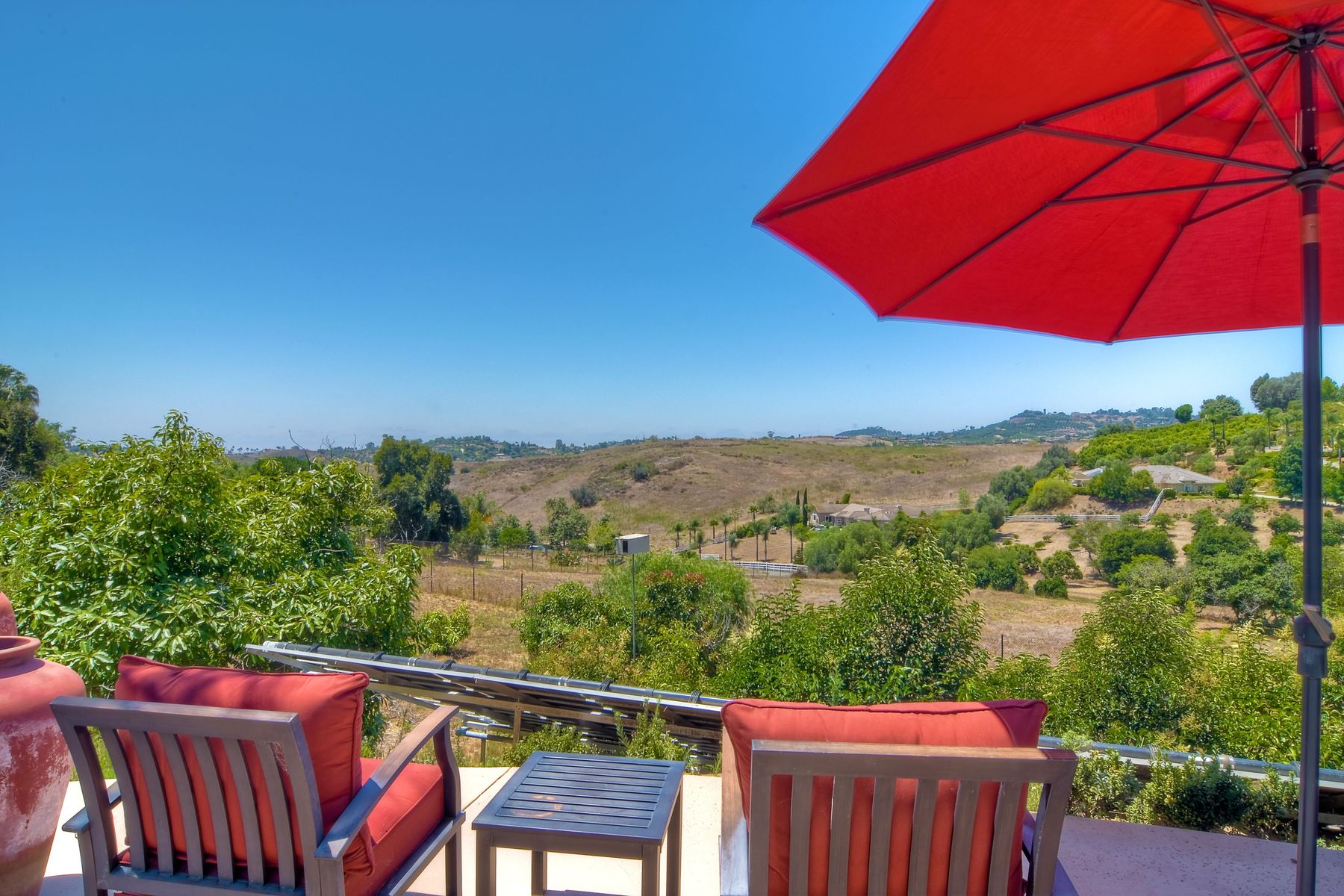 Single story panoramic view property on 2.79 in Rolling Hills Estates, Fallbrook's only 24/7 gate guarded community. Modern upgraded kitchen with sizable granite island, 5 burner gas range, chiseled travertine stone flooring, distressed alder wood cabinets and doors. All baths remodeled! Resort living w/ocean breezes/sunset views from your private patios and solar heated pool and spa. Paid solar, low maintenance landscaping = easy living! Downstairs wine cellar with storage! Extra long,private driveway. Rolling Hills features 3 lighted tennis courts, groomed walking trails throughout the neighborhood, wide streets, 24/7 gate guarded security and a clubhouse with lakes and waterfalls. RV Parking available in the neighborhood. *Large family room with fireplace *Kitchen with skylight for natural light, double ovens, double dishwashers, warming drawer, microwave and large island for entertaining. *Office/additional guest room *Master retreat area off master bedroom area *Multiple french doors and casement windows *All bathrooms remodeled with travertine stone finishes *Walk down wine cellar with refrigerated storage. *Guest Suite with full bath and separate entrance on one end of home *Extensive driveway parking spaces. Neighborhoods: Rolling Hills Architectural Style: Custom Built View: Custom Built Equipment: Pool/Spa/Equipment, Shed(s) Other Fees: 0 Sewer: Septic Installed Topography: ,LL,RSLP,GSL