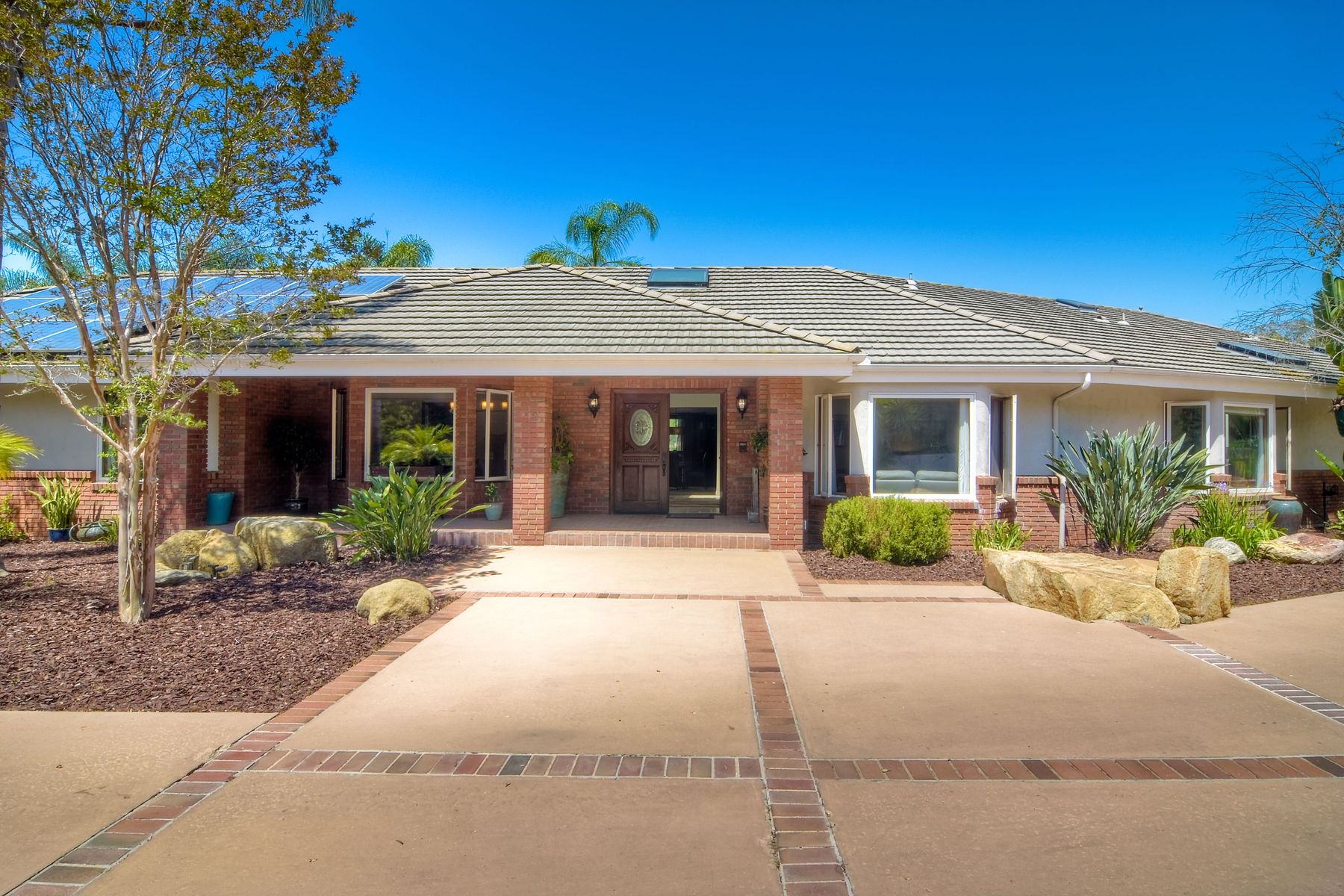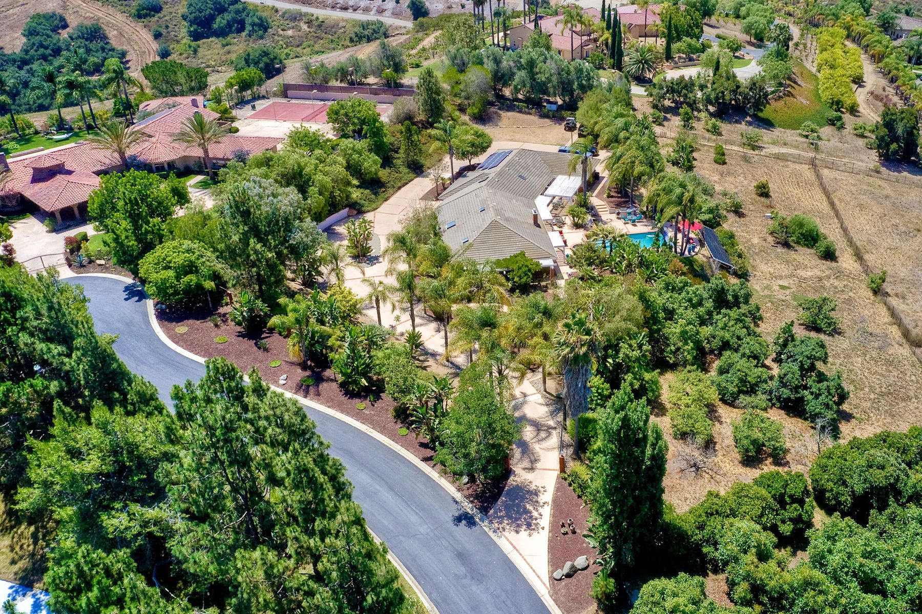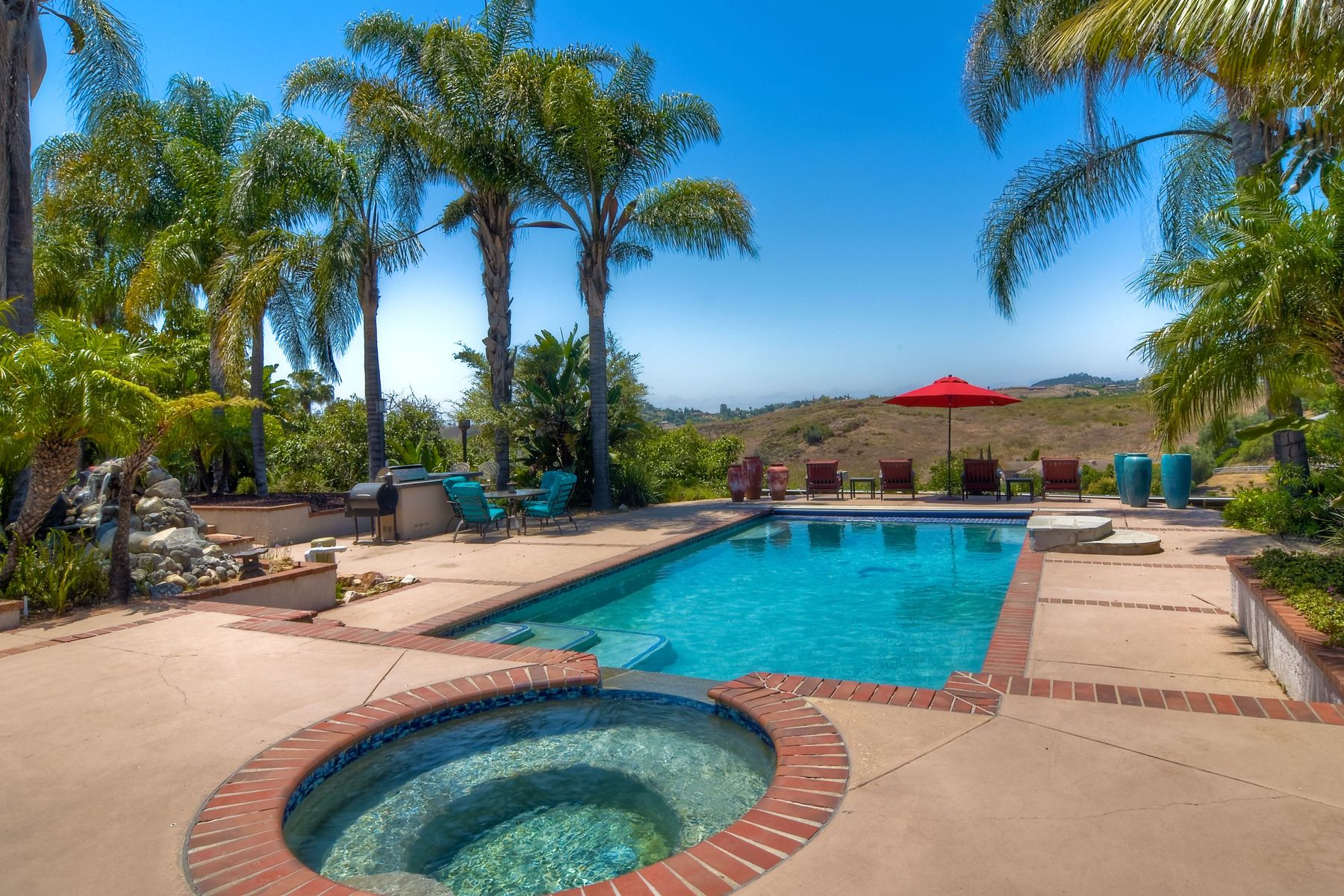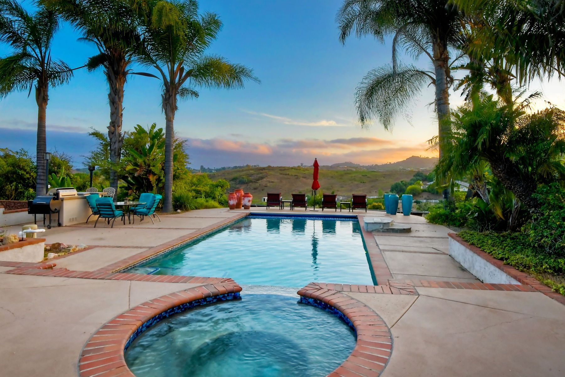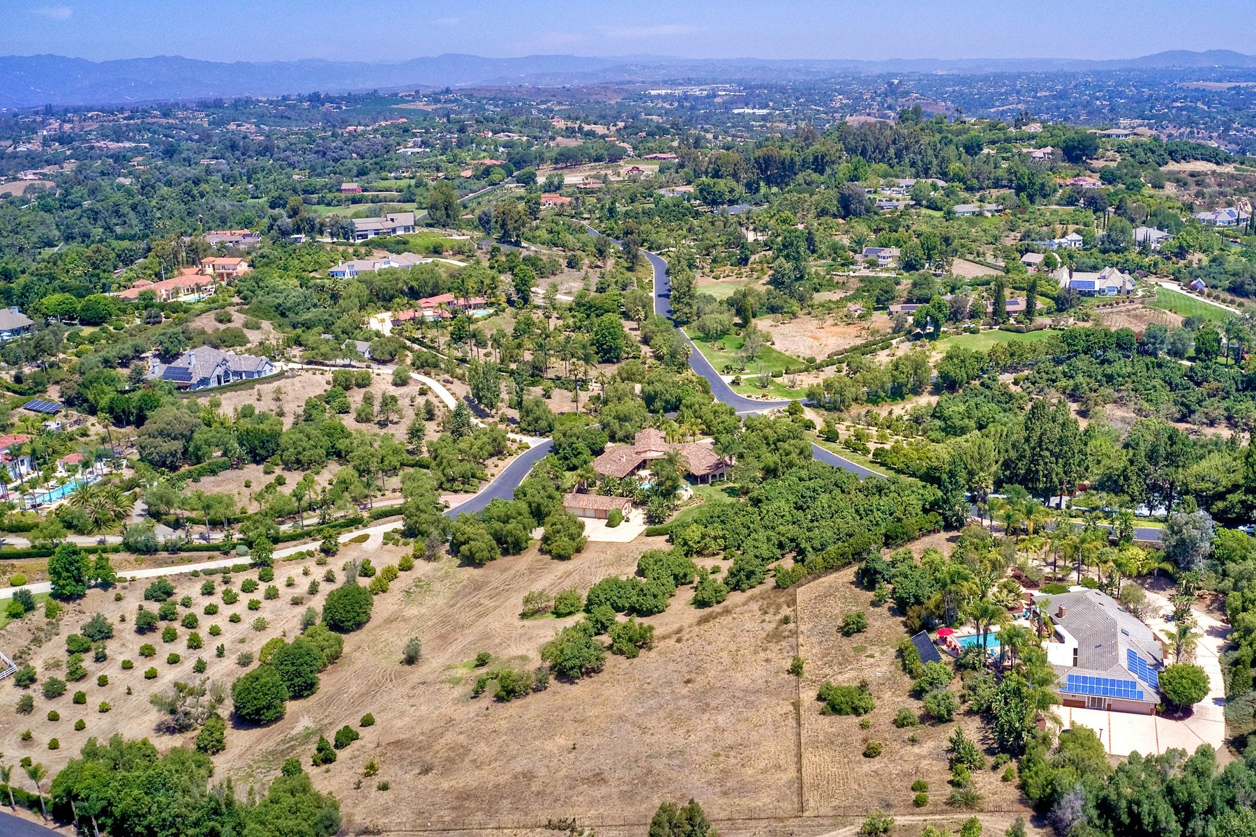 Single story panoramic view property on 2.79 in Rolling Hills Estates, Fallbrook's only 24/7 gate guarded community. Modern upgraded kitchen with sizable granite island, 5 burner gas range, chiseled travertine stone flooring, distressed alder wood cabinets and doors. All baths remodeled! Resort living w/ocean breezes/sunset views from your private patios and solar heated pool and spa. Paid solar, low maintenance landscaping = easy living! Downstairs wine cellar with storage! Extra long,private driveway. Rolling Hills features 3 lighted tennis courts, groomed walking trails throughout the neighborhood, wide streets, 24/7 gate guarded security and a clubhouse with lakes and waterfalls. RV Parking available in the neighborhood. *Large family room with fireplace *Kitchen with skylight for natural light, double ovens, double dishwashers, warming drawer, microwave and large island for entertaining. *Office/additional guest room *Master retreat area off master bedroom area *Multiple french doors and casement windows *All bathrooms remodeled with travertine stone finishes *Walk down wine cellar with refrigerated storage. *Guest Suite with full bath and separate entrance on one end of home *Extensive driveway parking spaces. Neighborhoods: Rolling Hills Architectural Style: Custom Built View: Custom Built Equipment: Pool/Spa/Equipment, Shed(s) Other Fees: 0 Sewer: Septic Installed Topography: ,LL,RSLP,GSL
