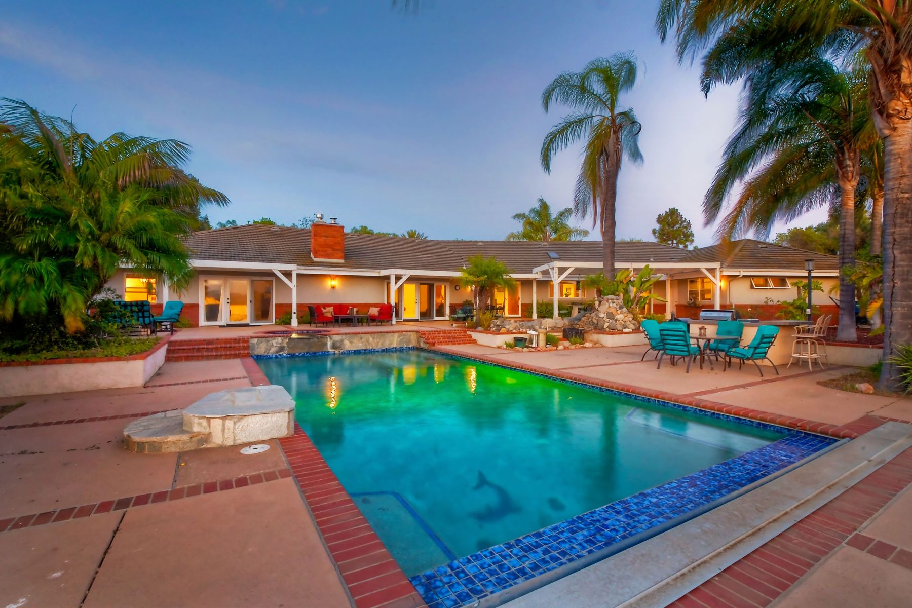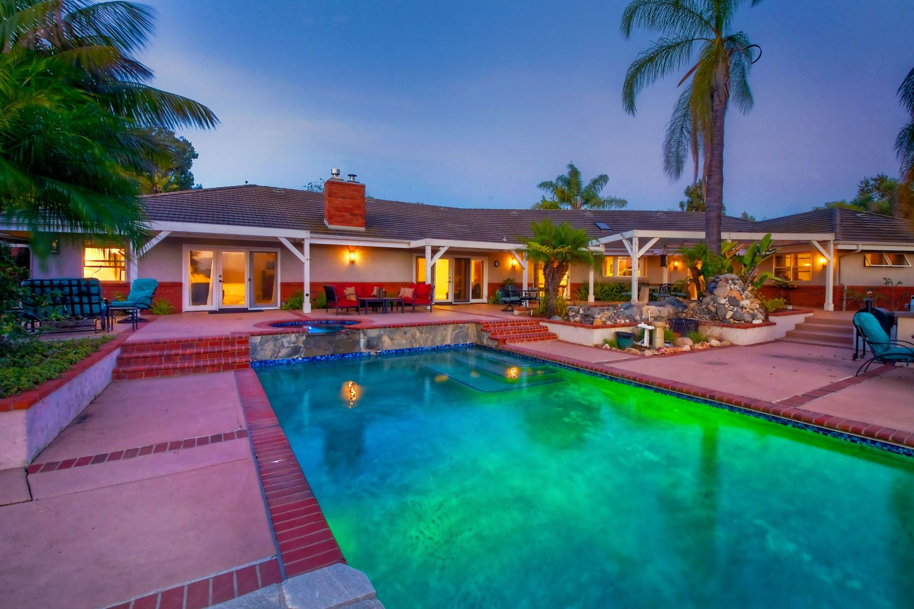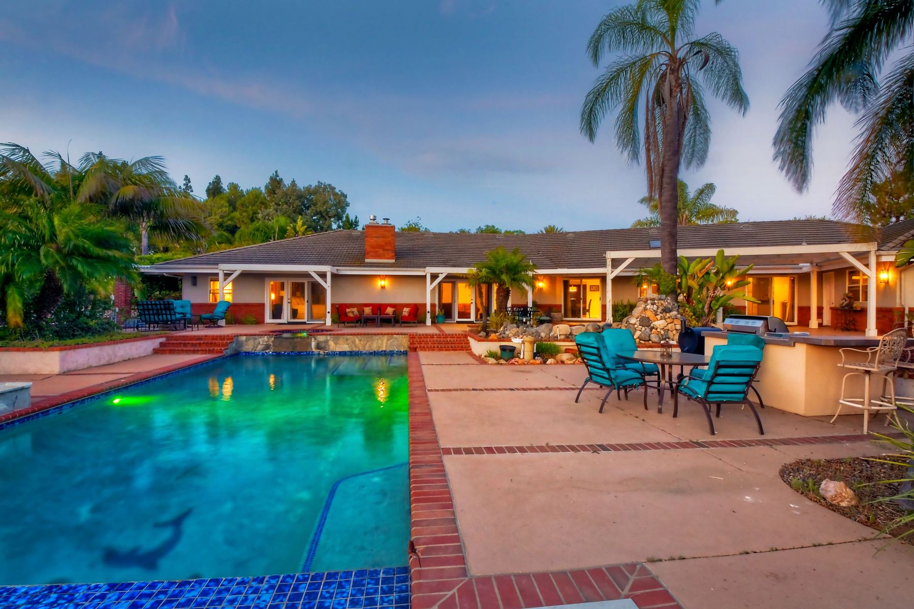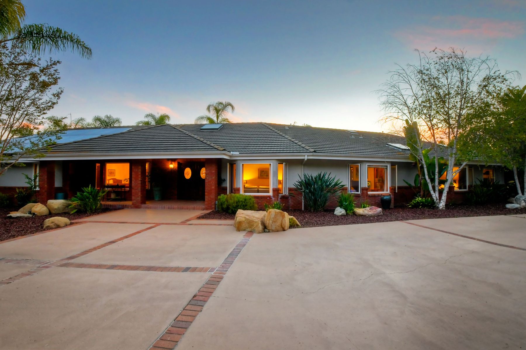 Single story panoramic view property on 2.79 in Rolling Hills Estates, Fallbrook's only 24/7 gate guarded community. Modern upgraded kitchen with sizable granite island, 5 burner gas range, chiseled travertine stone flooring, distressed alder wood cabinets and doors. All baths remodeled! Resort living w/ocean breezes/sunset views from your private patios and solar heated pool and spa. Paid solar, low maintenance landscaping = easy living! Downstairs wine cellar with storage! Extra long,private driveway. Rolling Hills features 3 lighted tennis courts, groomed walking trails throughout the neighborhood, wide streets, 24/7 gate guarded security and a clubhouse with lakes and waterfalls. RV Parking available in the neighborhood. *Large family room with fireplace *Kitchen with skylight for natural light, double ovens, double dishwashers, warming drawer, microwave and large island for entertaining. *Office/additional guest room *Master retreat area off master bedroom area *Multiple french doors and casement windows *All bathrooms remodeled with travertine stone finishes *Walk down wine cellar with refrigerated storage. *Guest Suite with full bath and separate entrance on one end of home *Extensive driveway parking spaces. Neighborhoods: Rolling Hills Architectural Style: Custom Built View: Custom Built Equipment: Pool/Spa/Equipment, Shed(s) Other Fees: 0 Sewer: Septic Installed Topography: ,LL,RSLP,GSL