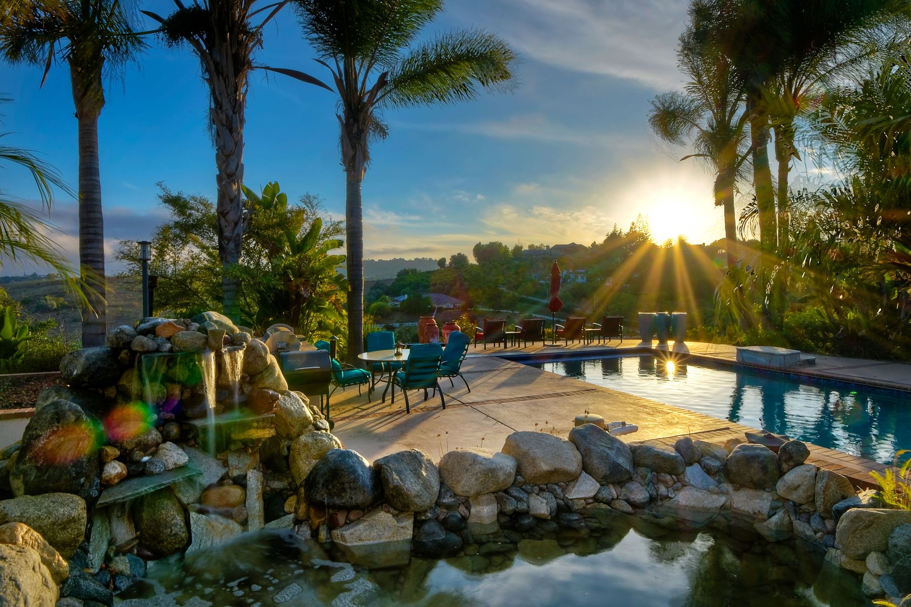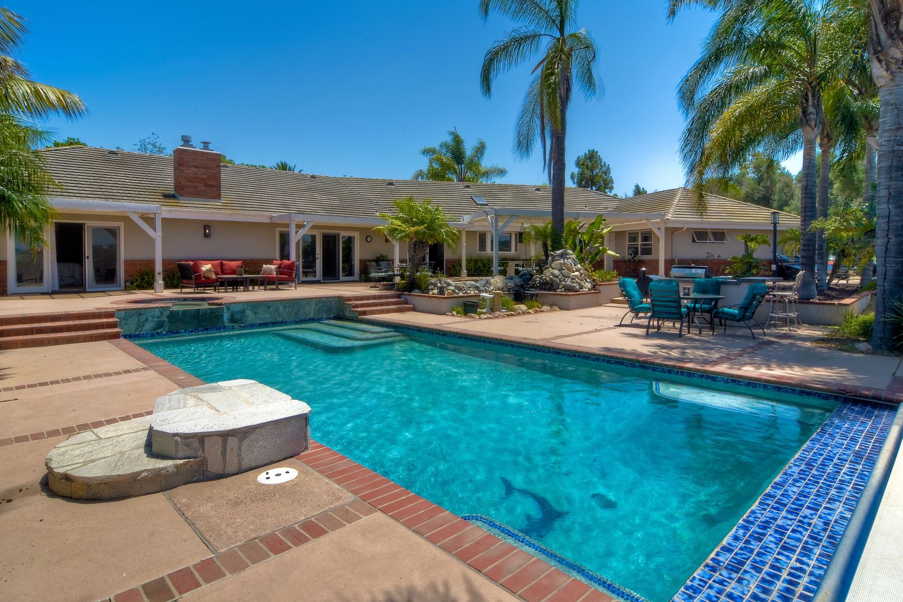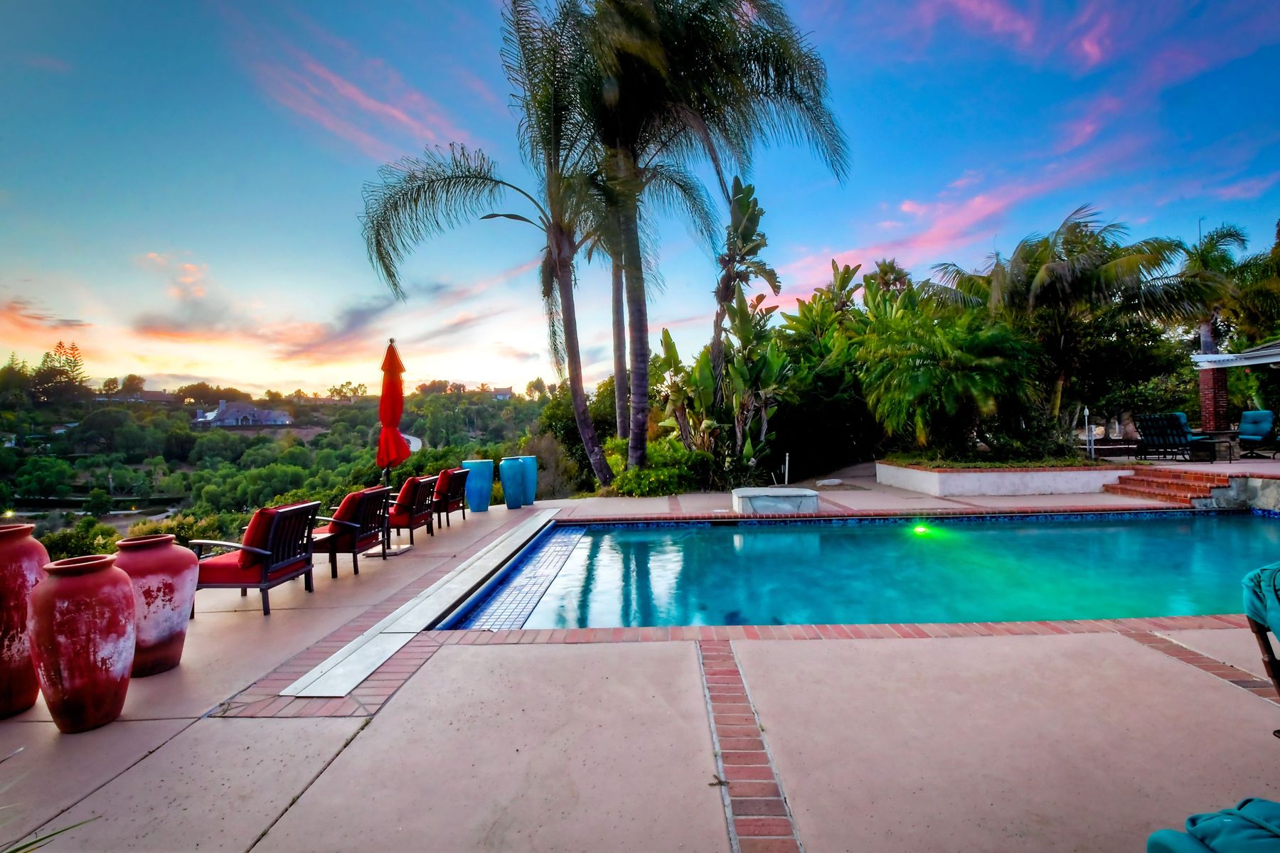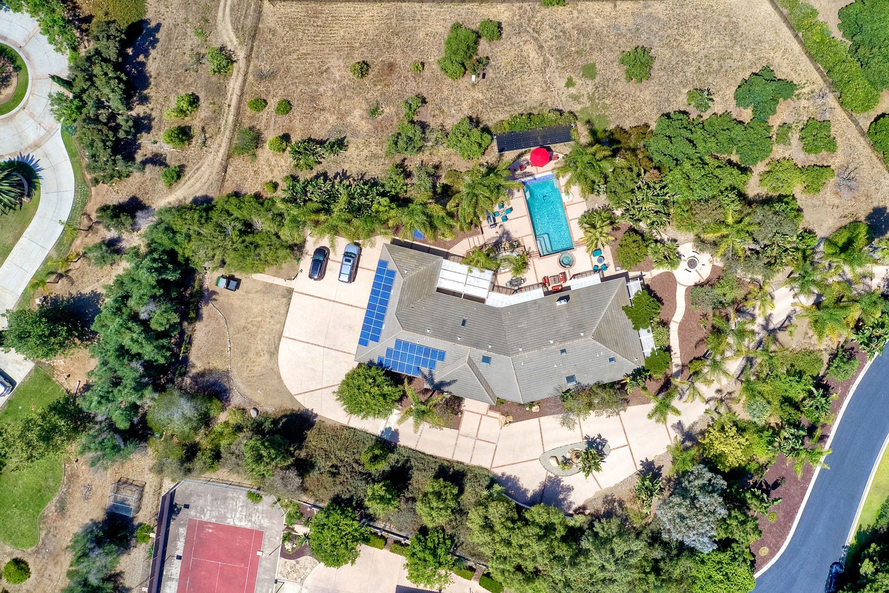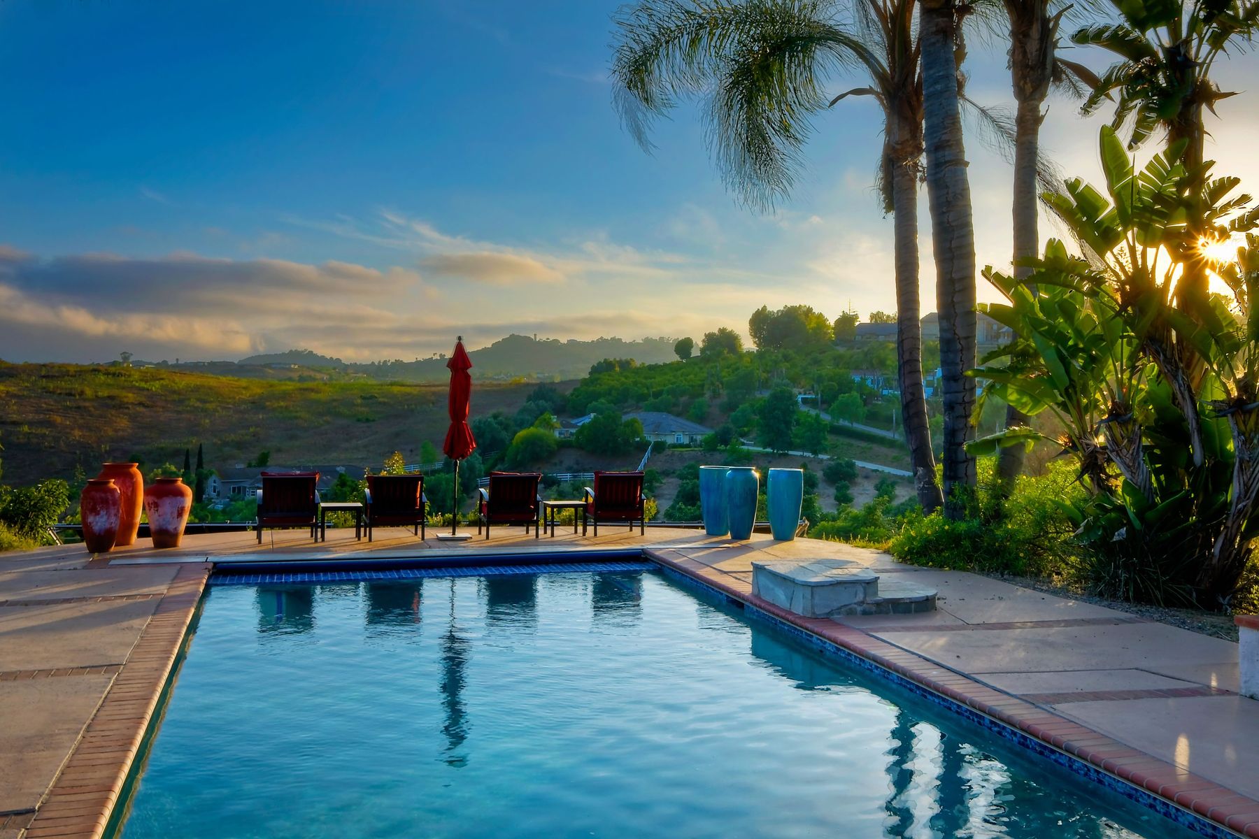 Single story panoramic view property on 2.79 in Rolling Hills Estates, Fallbrook's only 24/7 gate guarded community. Modern upgraded kitchen with sizable granite island, 5 burner gas range, chiseled travertine stone flooring, distressed alder wood cabinets and doors. All baths remodeled! Resort living w/ocean breezes/sunset views from your private patios and solar heated pool and spa. Paid solar, low maintenance landscaping = easy living! Downstairs wine cellar with storage! Extra long,private driveway. Rolling Hills features 3 lighted tennis courts, groomed walking trails throughout the neighborhood, wide streets, 24/7 gate guarded security and a clubhouse with lakes and waterfalls. RV Parking available in the neighborhood. *Large family room with fireplace *Kitchen with skylight for natural light, double ovens, double dishwashers, warming drawer, microwave and large island for entertaining. *Office/additional guest room *Master retreat area off master bedroom area *Multiple french doors and casement windows *All bathrooms remodeled with travertine stone finishes *Walk down wine cellar with refrigerated storage. *Guest Suite with full bath and separate entrance on one end of home *Extensive driveway parking spaces. Neighborhoods: Rolling Hills Architectural Style: Custom Built View: Custom Built Equipment: Pool/Spa/Equipment, Shed(s) Other Fees: 0 Sewer: Septic Installed Topography: ,LL,RSLP,GSL