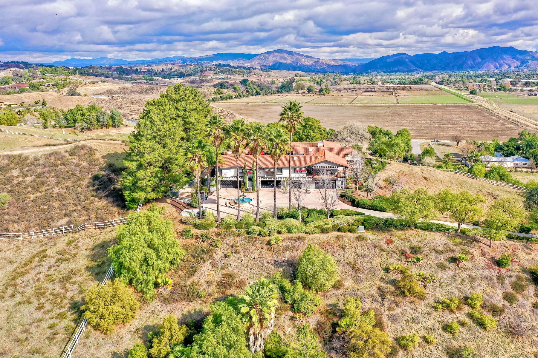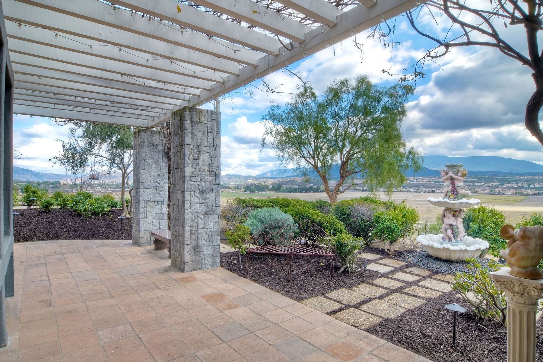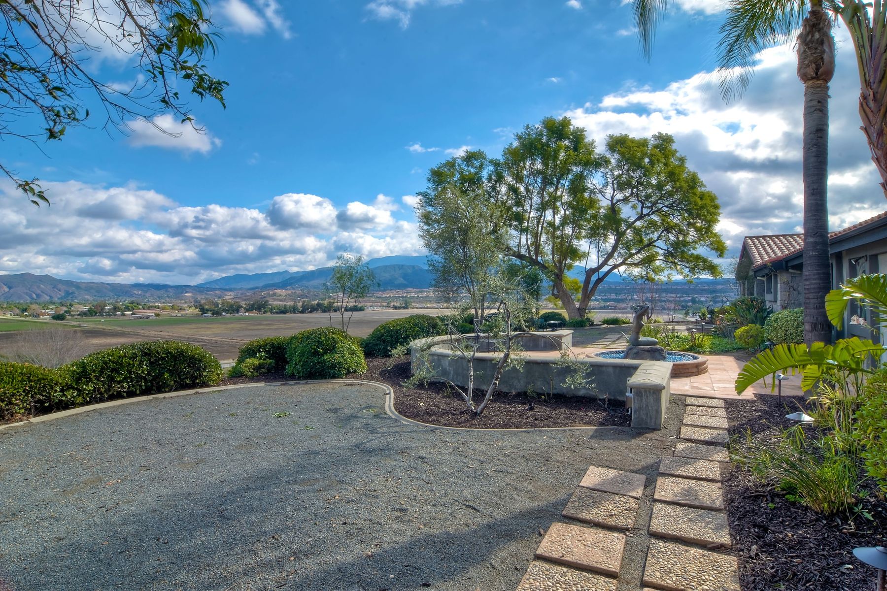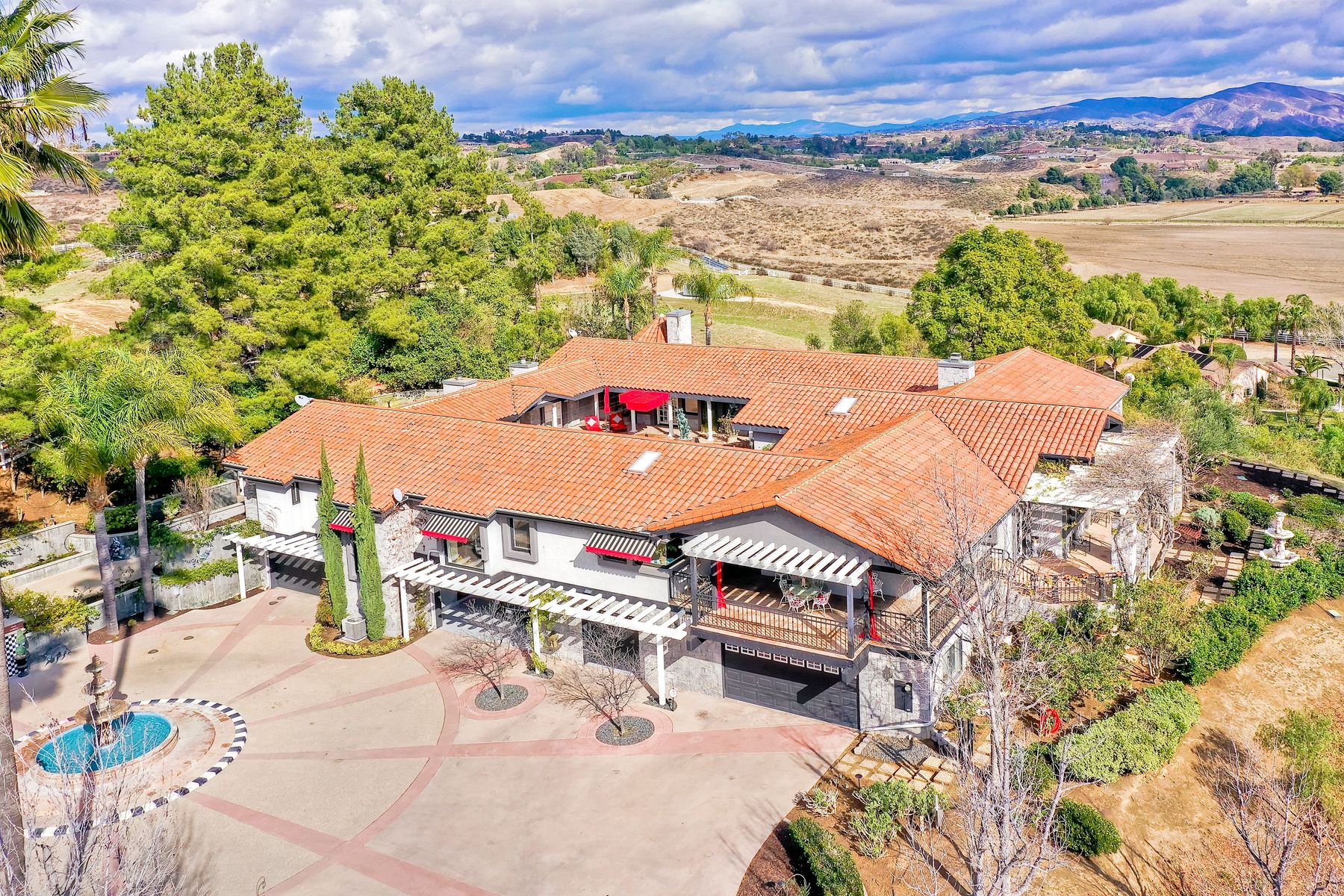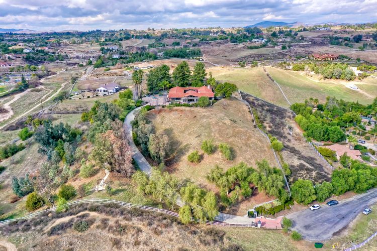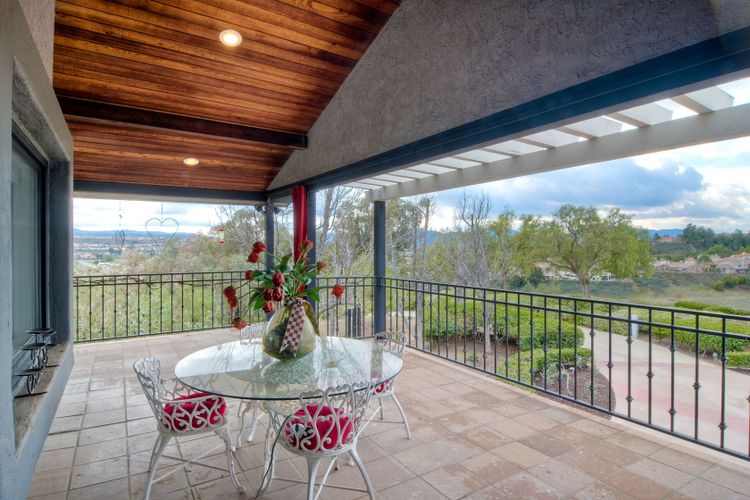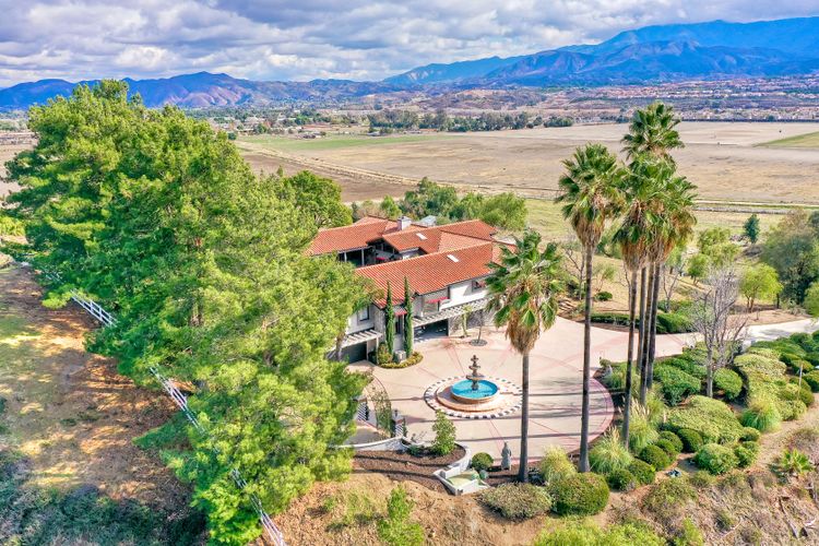 Step into another era with a side of Hollywood glam! Gated, tree-lined drive w/turnabout leads to a beautiful, Mediterranean, custom built, FULLY FENCED, 5 acre, 5,122sf, 1-level, hilltop estate in Temecula Wine Country. Located on a private cul-de-sac in Country Road Estates, this property was designed after ‘The Getty Villa’ and is FENG SHUI (including grounds) w/3 beautifully sculpted fountains & 4+ verandas to experience PANORMIC VIEWS. Perfect for LUXURY VACATION RENTAL. Lower 1+/- acre flat, useable area w/room for guest home/barn/vineyard. Natural light accentuates custom architectural features throughout. Double leaded glass doors open to Entry, Living Room w/fireplace, 18’ ceilings & Dining Room. Hallways w/French doors lead to unique Master Suite, Office w/fireplace, Studio & secondary Bedrooms surrounding courtyard SALTWATER, PEBBLE TEC POOL/SPA. Large Chef’s Kitchen w/granite island, NEW Subzero, 6-person counter seating & open to Family Room. Elevator & private back staircase to OVERSIZED 7-CAR GARAGE & Wine Room. Garage has Kitchenette, full Bath & epoxy floors. Pool/Spa accessible from almost every room. Enjoy breathtaking sunrises & sunsets in the many picturesque gardens & hilltop gazebo. Temecula Wine Country known as Napa Valley of Southern California, 40+ award-winning wineries & Top 10 wine travel destinations according to Conde Nast Traveler magazine. REALTORS – PLEASE SHARE MLS SUPPLEMENTS W/CLIENTS