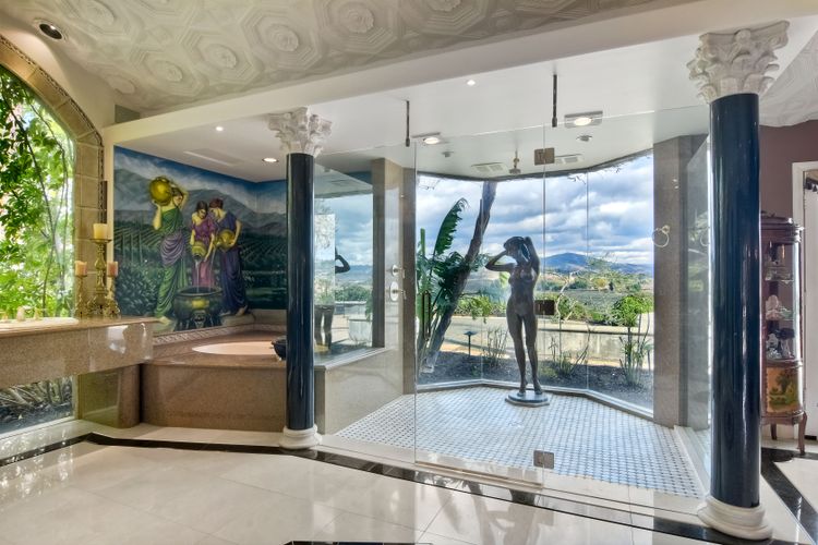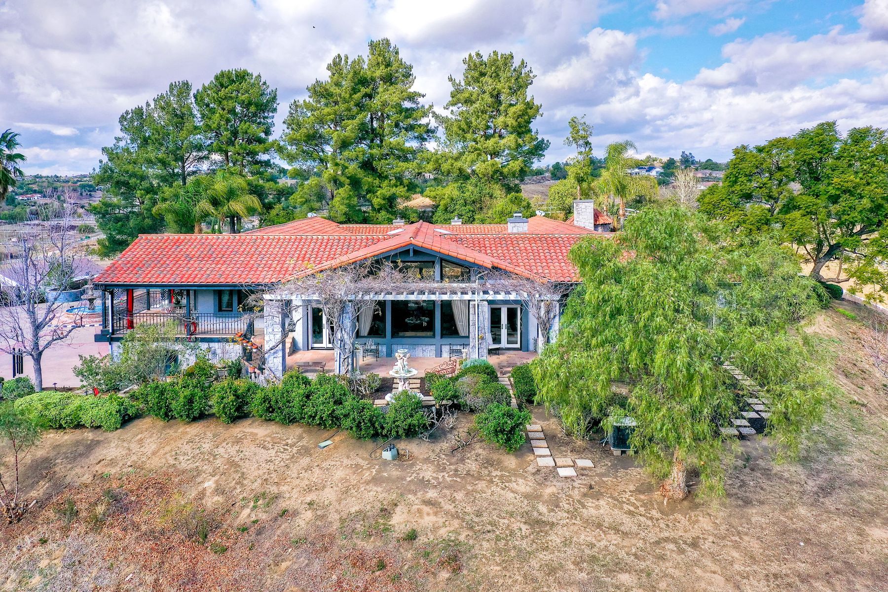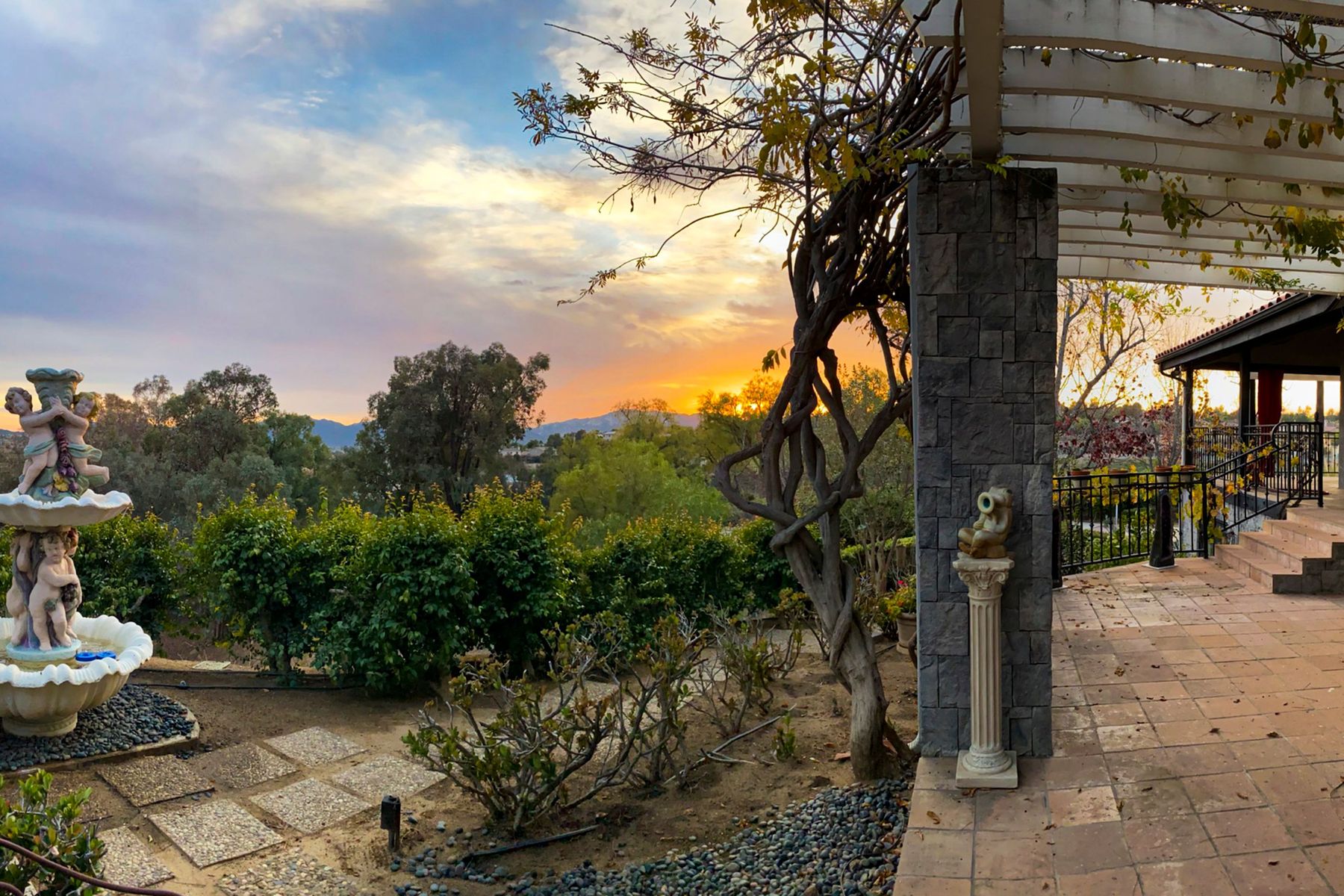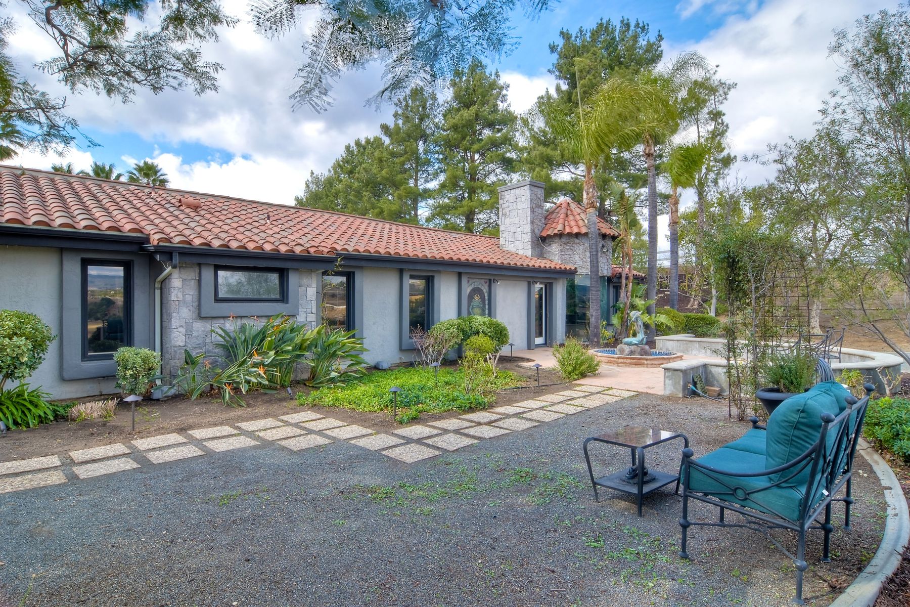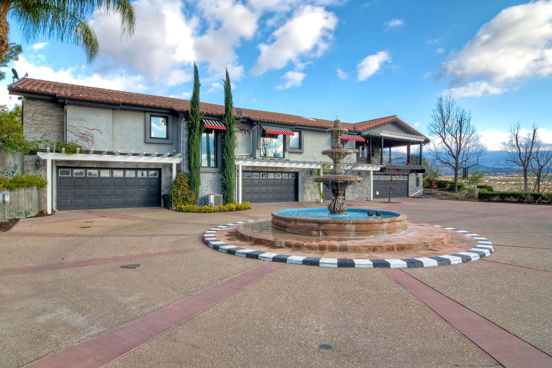 Step into another era with a side of Hollywood glam! Gated, tree-lined drive w/turnabout leads to a beautiful, Mediterranean, custom built, FULLY FENCED, 5 acre, 5,122sf, 1-level, hilltop estate in Temecula Wine Country. Located on a private cul-de-sac in Country Road Estates, this property was designed after ‘The Getty Villa’ and is FENG SHUI (including grounds) w/3 beautifully sculpted fountains & 4+ verandas to experience PANORMIC VIEWS. Perfect for LUXURY VACATION RENTAL. Lower 1+/- acre flat, useable area w/room for guest home/barn/vineyard. Natural light accentuates custom architectural features throughout. Double leaded glass doors open to Entry, Living Room w/fireplace, 18’ ceilings & Dining Room. Hallways w/French doors lead to unique Master Suite, Office w/fireplace, Studio & secondary Bedrooms surrounding courtyard SALTWATER, PEBBLE TEC POOL/SPA. Large Chef’s Kitchen w/granite island, NEW Subzero, 6-person counter seating & open to Family Room. Elevator & private back staircase to OVERSIZED 7-CAR GARAGE & Wine Room. Garage has Kitchenette, full Bath & epoxy floors. Pool/Spa accessible from almost every room. Enjoy breathtaking sunrises & sunsets in the many picturesque gardens & hilltop gazebo. Temecula Wine Country known as Napa Valley of Southern California, 40+ award-winning wineries & Top 10 wine travel destinations according to Conde Nast Traveler magazine. REALTORS – PLEASE SHARE MLS SUPPLEMENTS W/CLIENTS