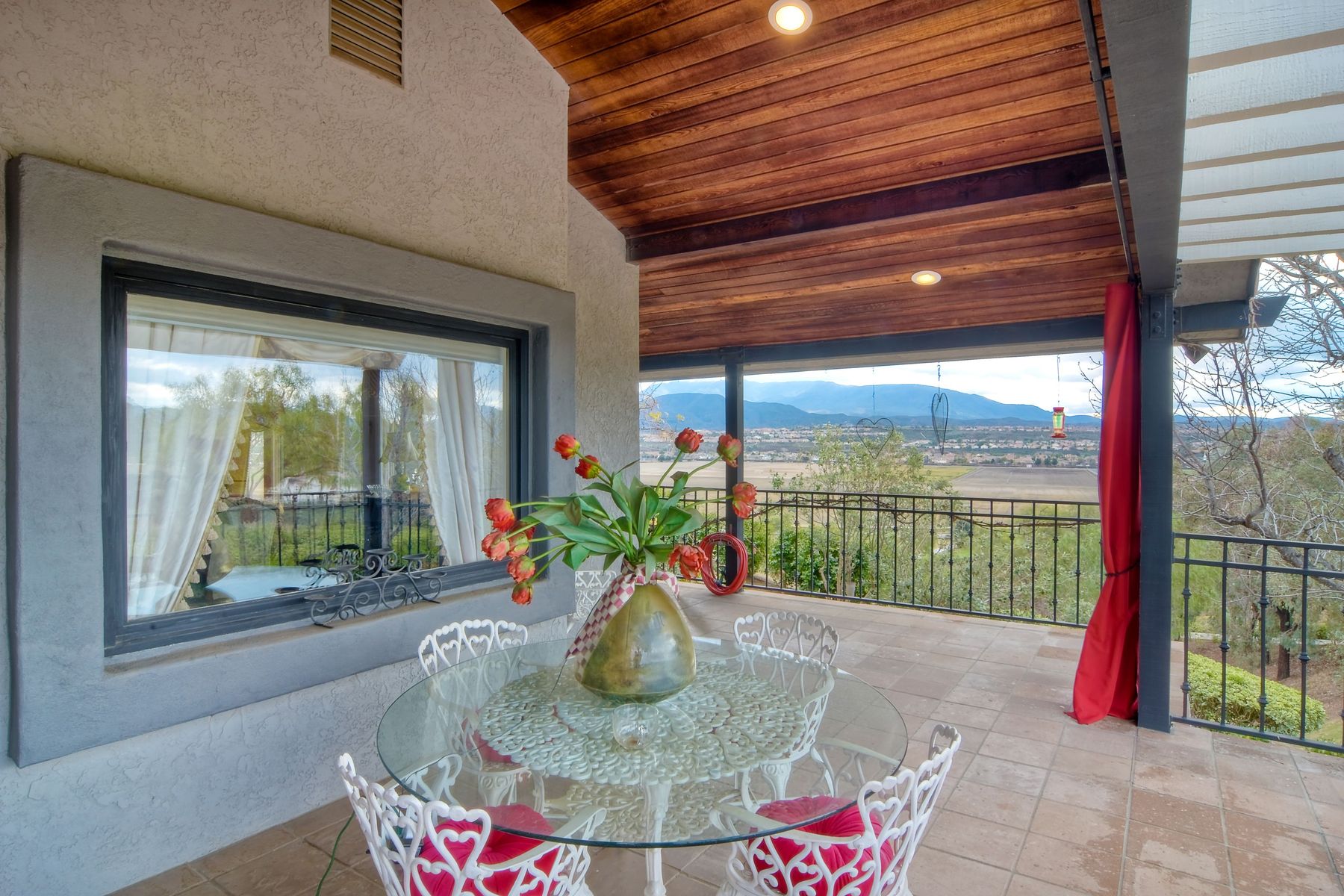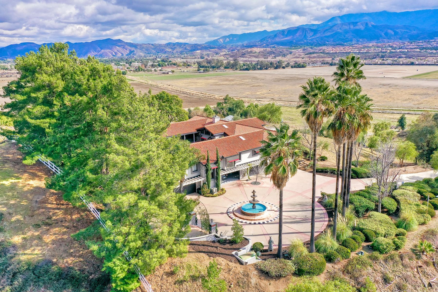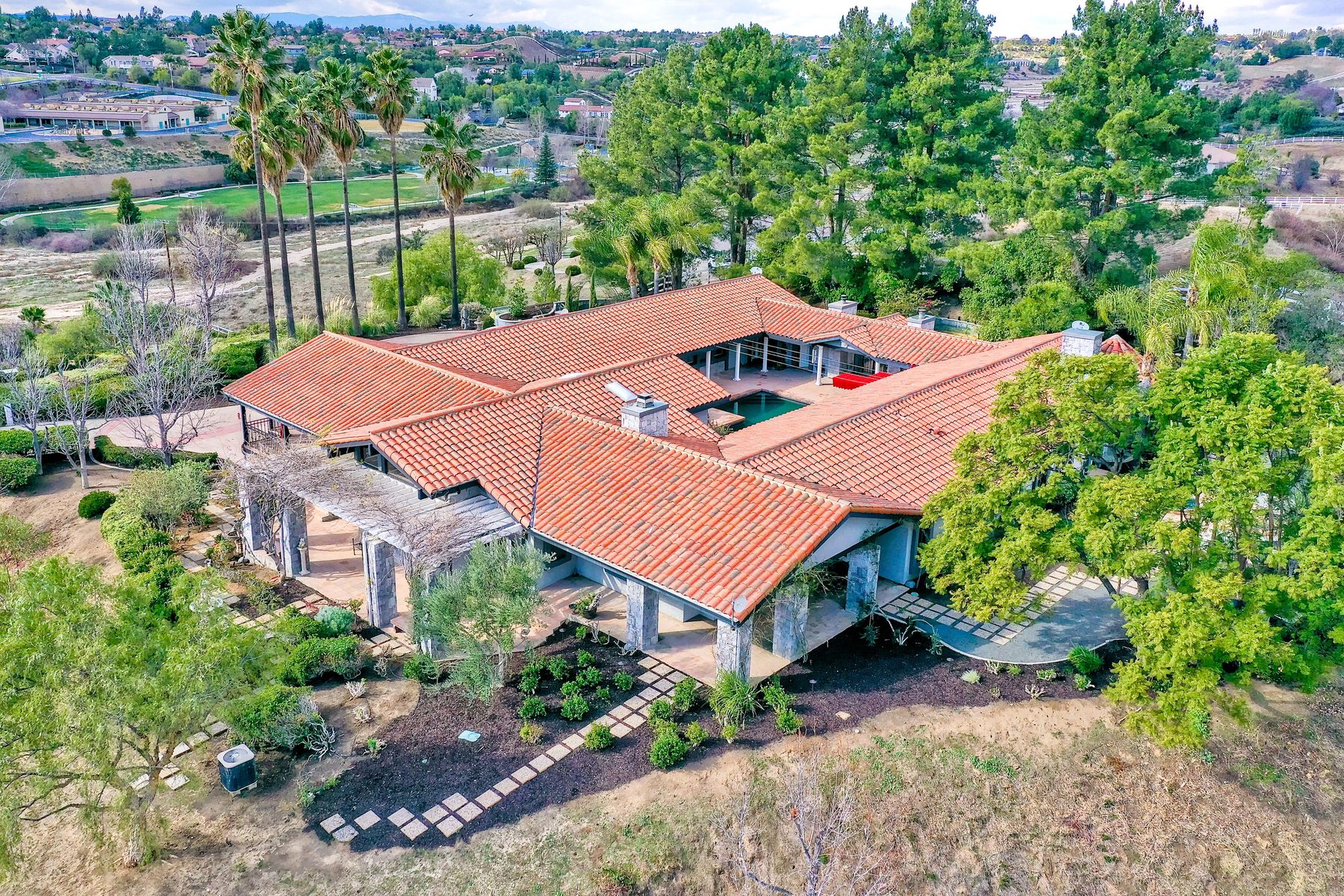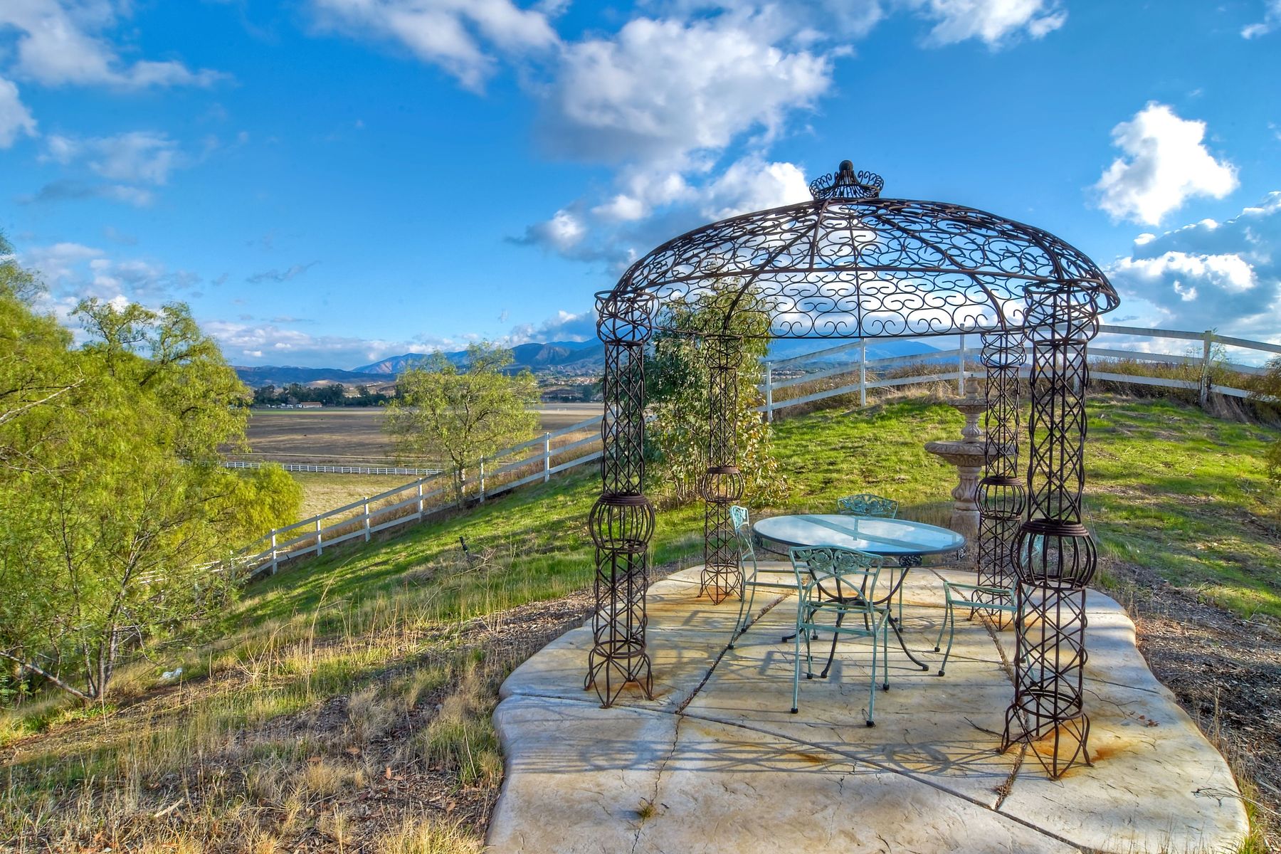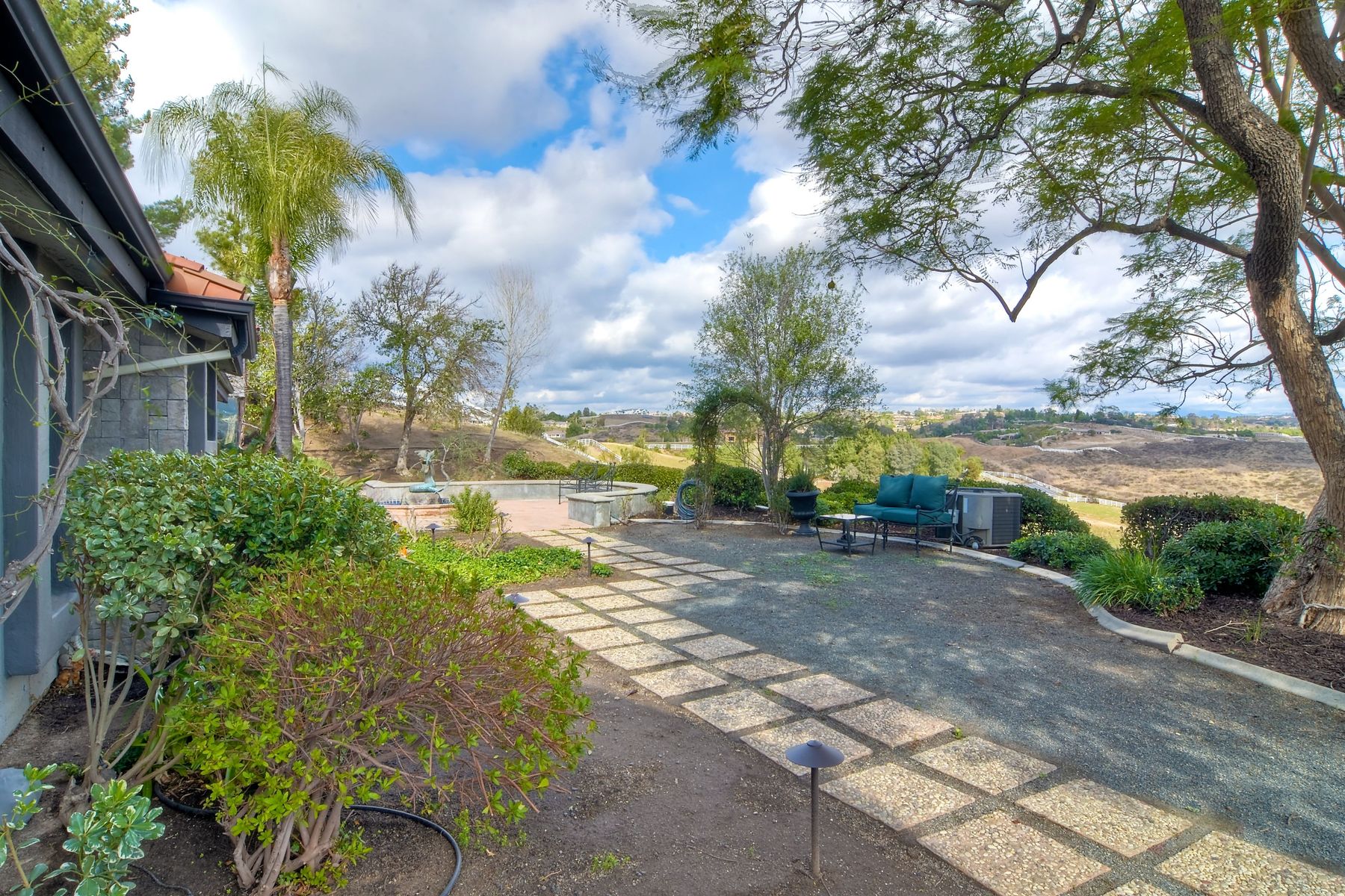 Step into another era with a side of Hollywood glam! Gated, tree-lined drive w/turnabout leads to a beautiful, Mediterranean, custom built, FULLY FENCED, 5 acre, 5,122sf, 1-level, hilltop estate in Temecula Wine Country. Located on a private cul-de-sac in Country Road Estates, this property was designed after ‘The Getty Villa’ and is FENG SHUI (including grounds) w/3 beautifully sculpted fountains & 4+ verandas to experience PANORMIC VIEWS. Perfect for LUXURY VACATION RENTAL. Lower 1+/- acre flat, useable area w/room for guest home/barn/vineyard. Natural light accentuates custom architectural features throughout. Double leaded glass doors open to Entry, Living Room w/fireplace, 18’ ceilings & Dining Room. Hallways w/French doors lead to unique Master Suite, Office w/fireplace, Studio & secondary Bedrooms surrounding courtyard SALTWATER, PEBBLE TEC POOL/SPA. Large Chef’s Kitchen w/granite island, NEW Subzero, 6-person counter seating & open to Family Room. Elevator & private back staircase to OVERSIZED 7-CAR GARAGE & Wine Room. Garage has Kitchenette, full Bath & epoxy floors. Pool/Spa accessible from almost every room. Enjoy breathtaking sunrises & sunsets in the many picturesque gardens & hilltop gazebo. Temecula Wine Country known as Napa Valley of Southern California, 40+ award-winning wineries & Top 10 wine travel destinations according to Conde Nast Traveler magazine. REALTORS – PLEASE SHARE MLS SUPPLEMENTS W/CLIENTS