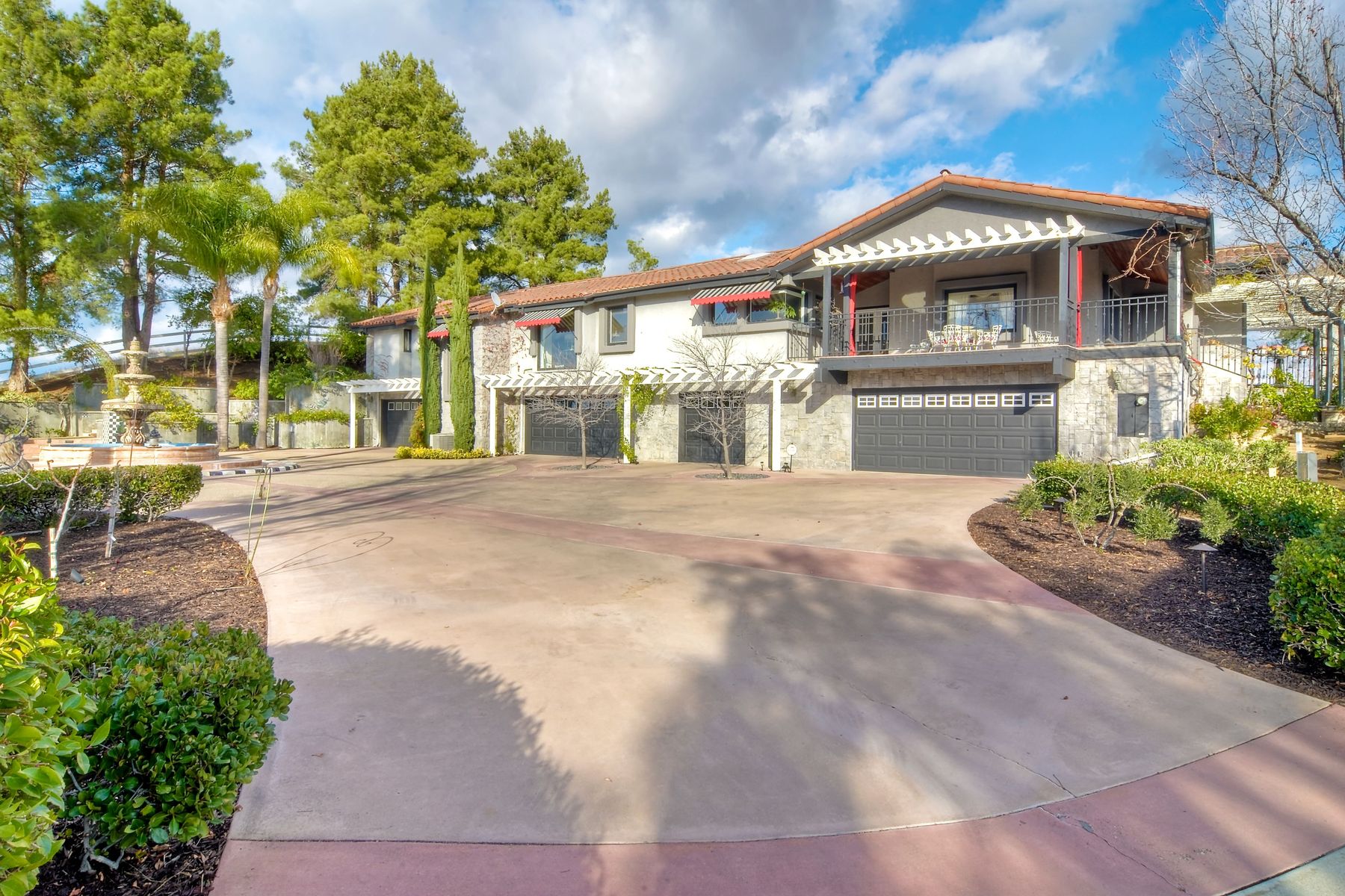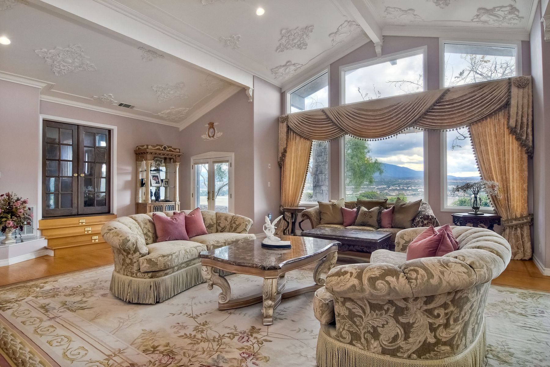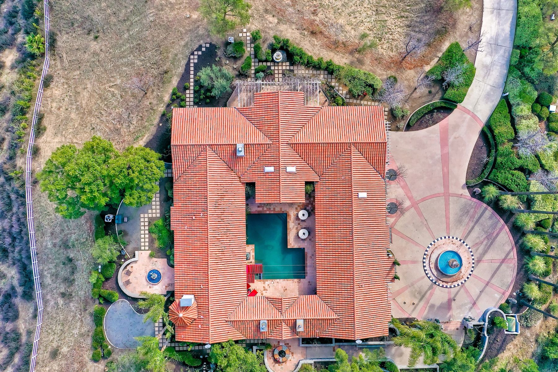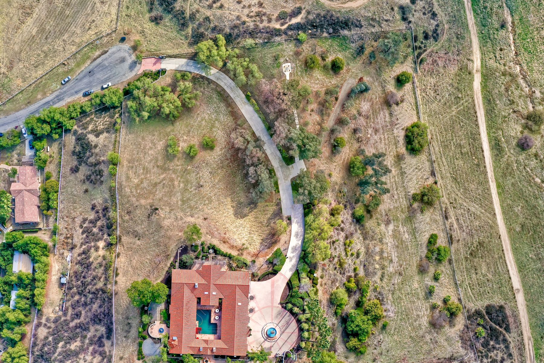 Step into another era with a side of Hollywood glam! Gated, tree-lined drive w/turnabout leads to a beautiful, Mediterranean, custom built, FULLY FENCED, 5 acre, 5,122sf, 1-level, hilltop estate in Temecula Wine Country. Located on a private cul-de-sac in Country Road Estates, this property was designed after ‘The Getty Villa’ and is FENG SHUI (including grounds) w/3 beautifully sculpted fountains & 4+ verandas to experience PANORMIC VIEWS. Perfect for LUXURY VACATION RENTAL. Lower 1+/- acre flat, useable area w/room for guest home/barn/vineyard. Natural light accentuates custom architectural features throughout. Double leaded glass doors open to Entry, Living Room w/fireplace, 18’ ceilings & Dining Room. Hallways w/French doors lead to unique Master Suite, Office w/fireplace, Studio & secondary Bedrooms surrounding courtyard SALTWATER, PEBBLE TEC POOL/SPA. Large Chef’s Kitchen w/granite island, NEW Subzero, 6-person counter seating & open to Family Room. Elevator & private back staircase to OVERSIZED 7-CAR GARAGE & Wine Room. Garage has Kitchenette, full Bath & epoxy floors. Pool/Spa accessible from almost every room. Enjoy breathtaking sunrises & sunsets in the many picturesque gardens & hilltop gazebo. Temecula Wine Country known as Napa Valley of Southern California, 40+ award-winning wineries & Top 10 wine travel destinations according to Conde Nast Traveler magazine. REALTORS – PLEASE SHARE MLS SUPPLEMENTS W/CLIENTS