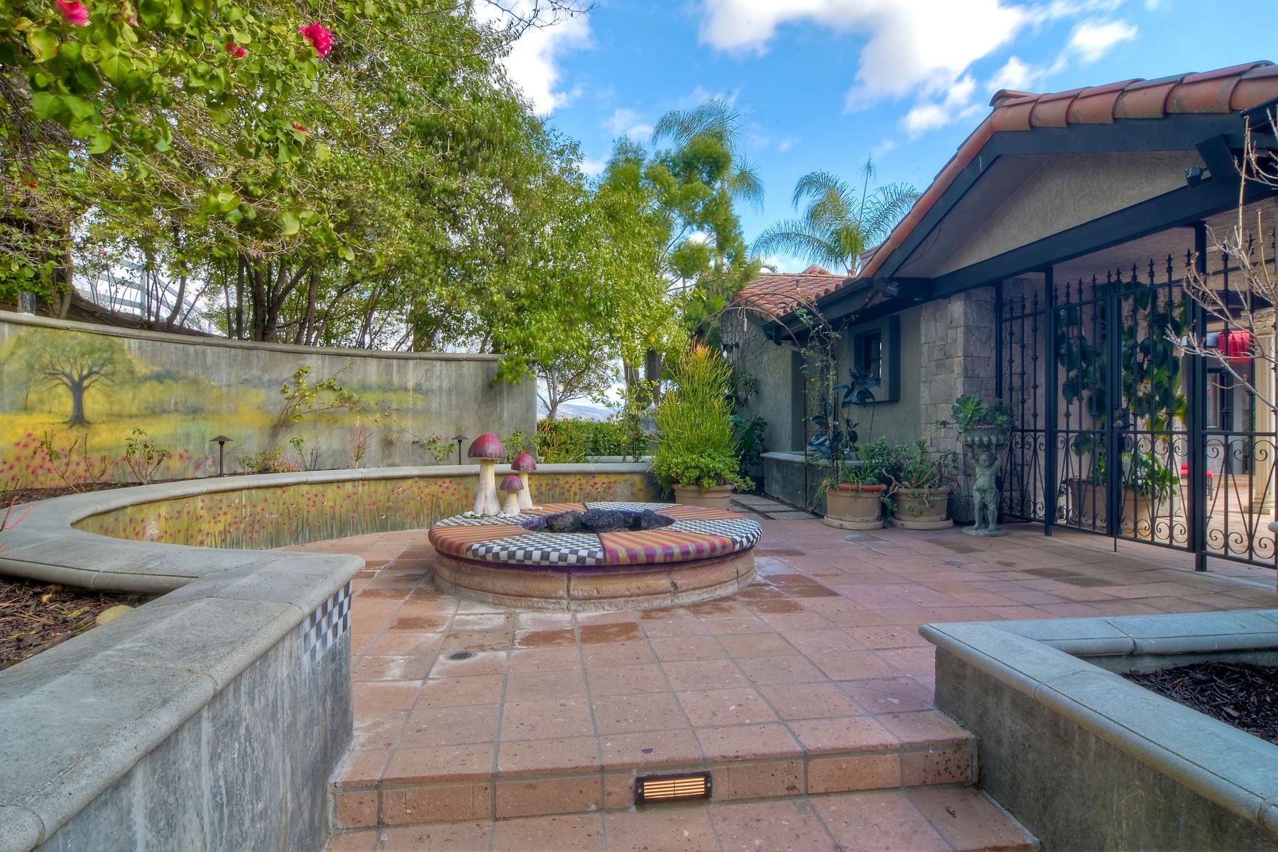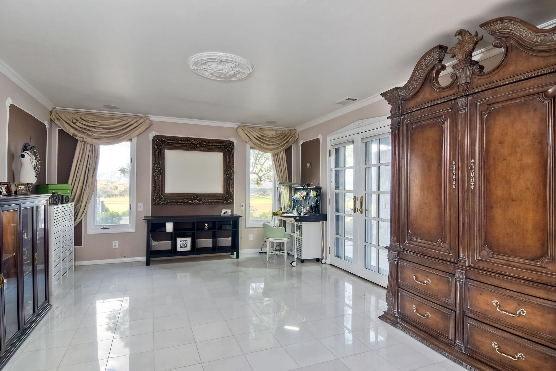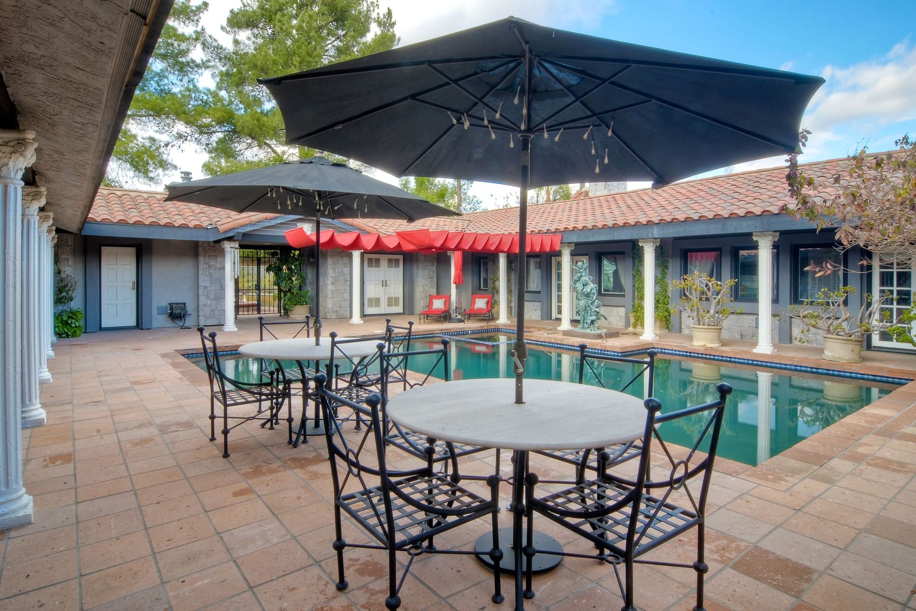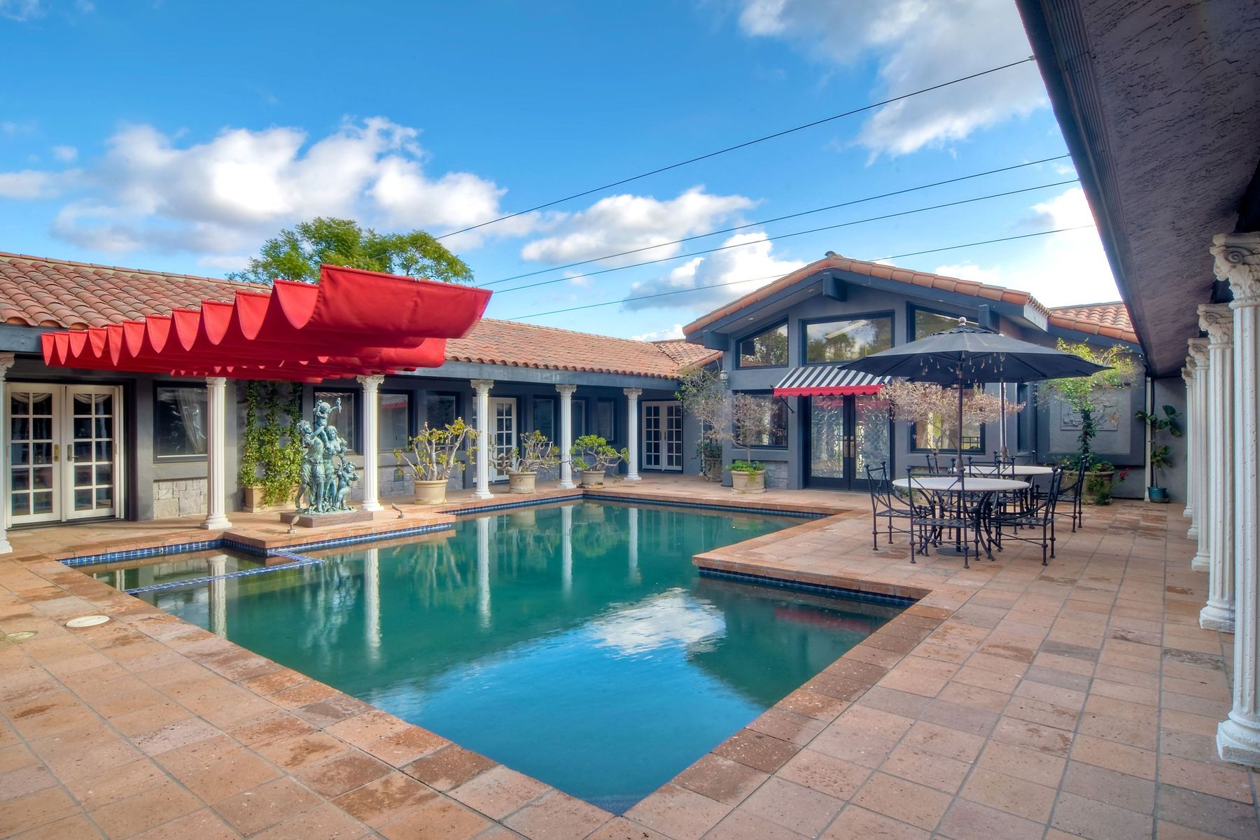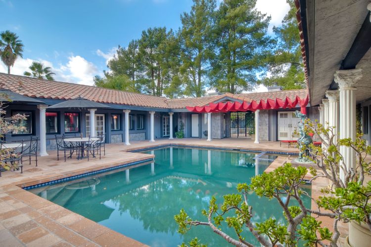 Step into another era with a side of Hollywood glam! Gated, tree-lined drive w/turnabout leads to a beautiful, Mediterranean, custom built, FULLY FENCED, 5 acre, 5,122sf, 1-level, hilltop estate in Temecula Wine Country. Located on a private cul-de-sac in Country Road Estates, this property was designed after ‘The Getty Villa’ and is FENG SHUI (including grounds) w/3 beautifully sculpted fountains & 4+ verandas to experience PANORMIC VIEWS. Perfect for LUXURY VACATION RENTAL. Lower 1+/- acre flat, useable area w/room for guest home/barn/vineyard. Natural light accentuates custom architectural features throughout. Double leaded glass doors open to Entry, Living Room w/fireplace, 18’ ceilings & Dining Room. Hallways w/French doors lead to unique Master Suite, Office w/fireplace, Studio & secondary Bedrooms surrounding courtyard SALTWATER, PEBBLE TEC POOL/SPA. Large Chef’s Kitchen w/granite island, NEW Subzero, 6-person counter seating & open to Family Room. Elevator & private back staircase to OVERSIZED 7-CAR GARAGE & Wine Room. Garage has Kitchenette, full Bath & epoxy floors. Pool/Spa accessible from almost every room. Enjoy breathtaking sunrises & sunsets in the many picturesque gardens & hilltop gazebo. Temecula Wine Country known as Napa Valley of Southern California, 40+ award-winning wineries & Top 10 wine travel destinations according to Conde Nast Traveler magazine. REALTORS – PLEASE SHARE MLS SUPPLEMENTS W/CLIENTS
