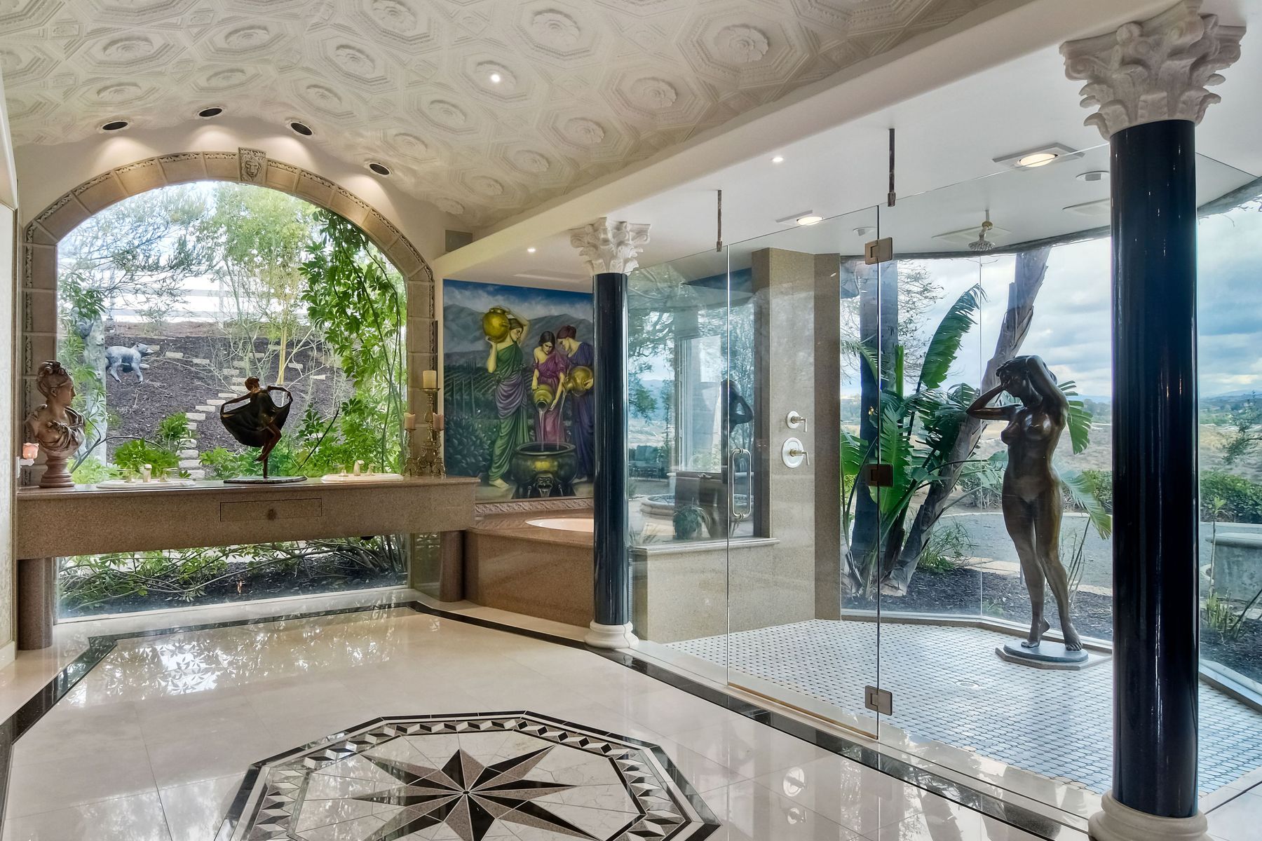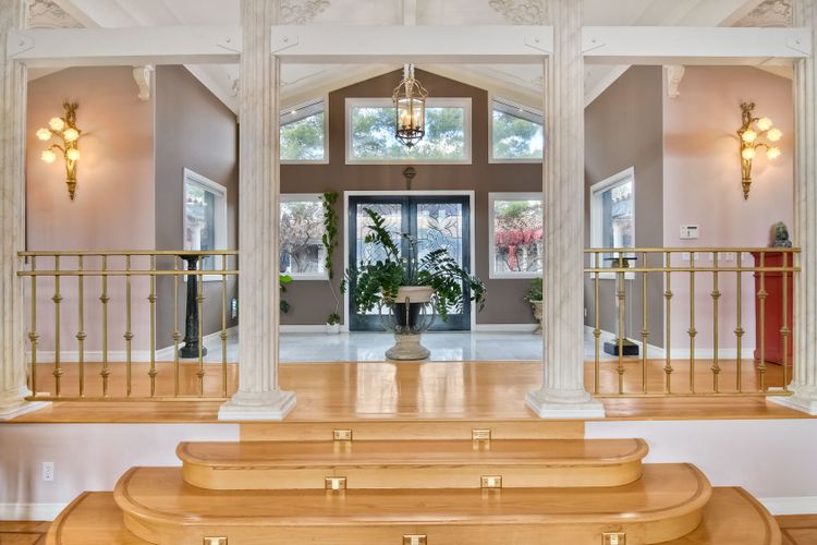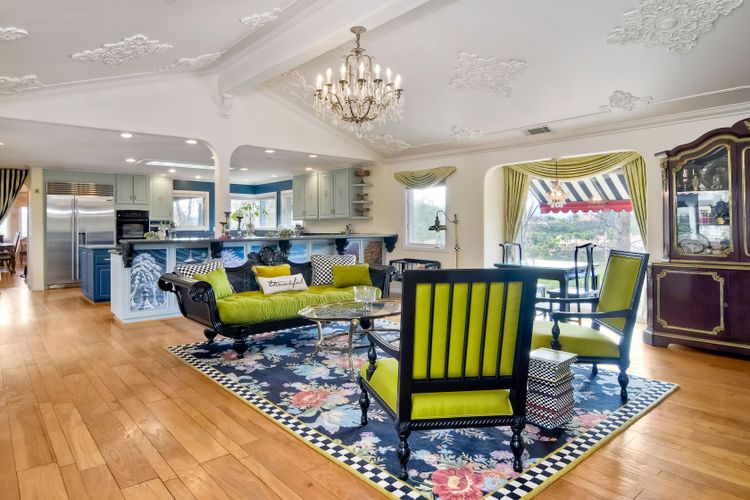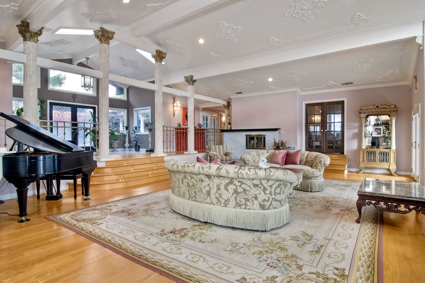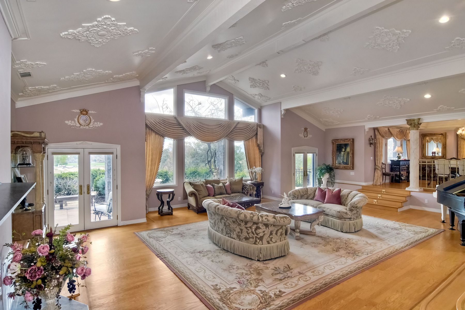 Beamed Ceilings, Built-in Features, Cathedral Ceiling(s), Ceiling Fan(s), Coffered Ceiling(s), Crown Molding, Elevator, Granite Counters, High Ceilings, Open Floorplan, Recessed Lighting, Storage, Wainscoting, Wired for Sound